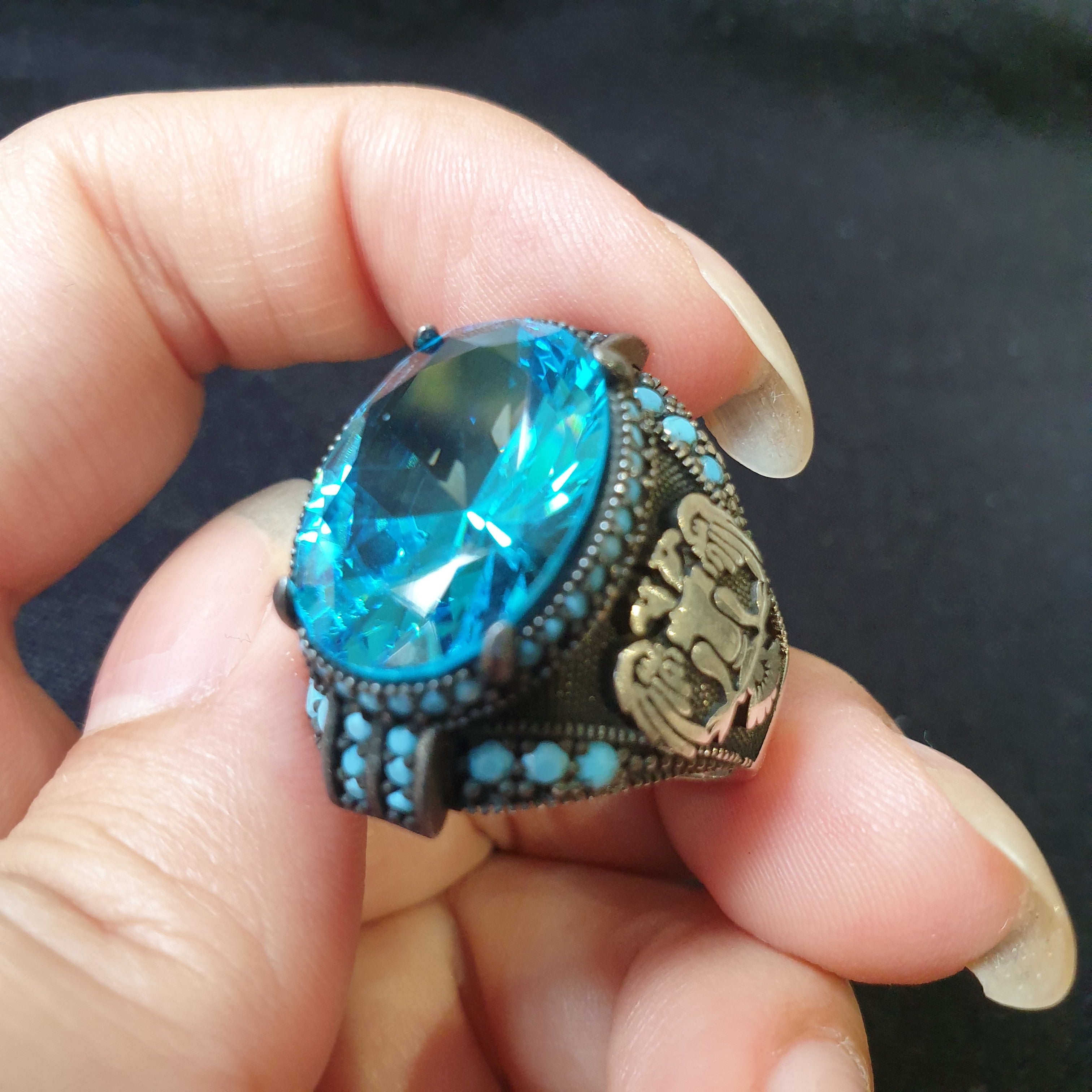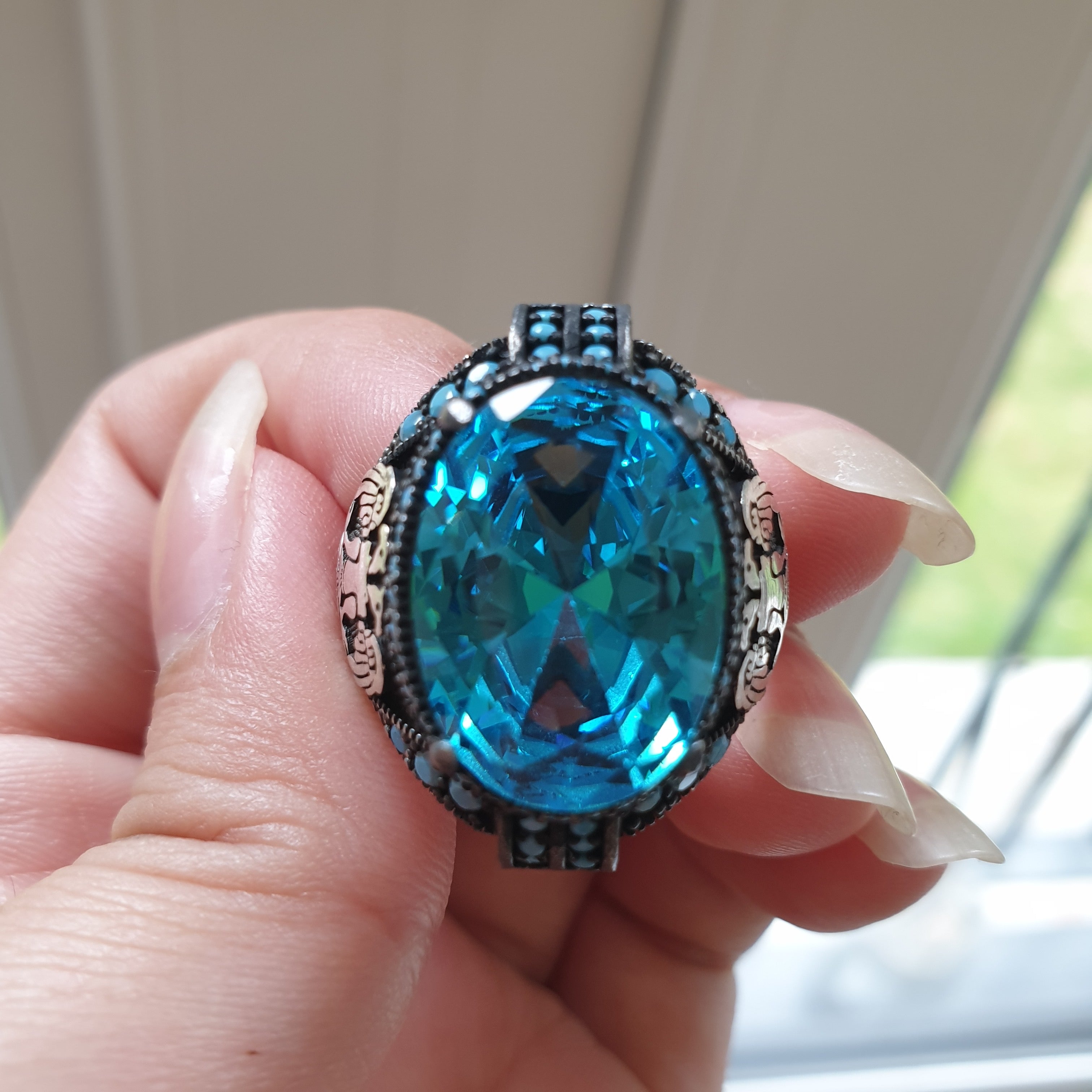 Elevate your style with our exquisite Turkish Aquamarine Silver Ring, a masterpiece of traditional craftsmanship and modern elegance. Handcrafted by skilled artisans in Turkey, this ring features a stunning aquamarine gemstone, known for its captivating blue hues reminiscent of the serene Mediterranean Sea. Set in premium 925 sterling silver, the ring showcases intricate Ottoman-inspired filigree work, adding a touch of historical charm and sophistication. Perfect for any occasion, this ring is not only a statement piece but also a symbol of refined taste and cultural heritage. Gift yourself or a loved one the timeless beauty of our Turkish aquamarine silver ring and experience the blend of tradition and luxury.