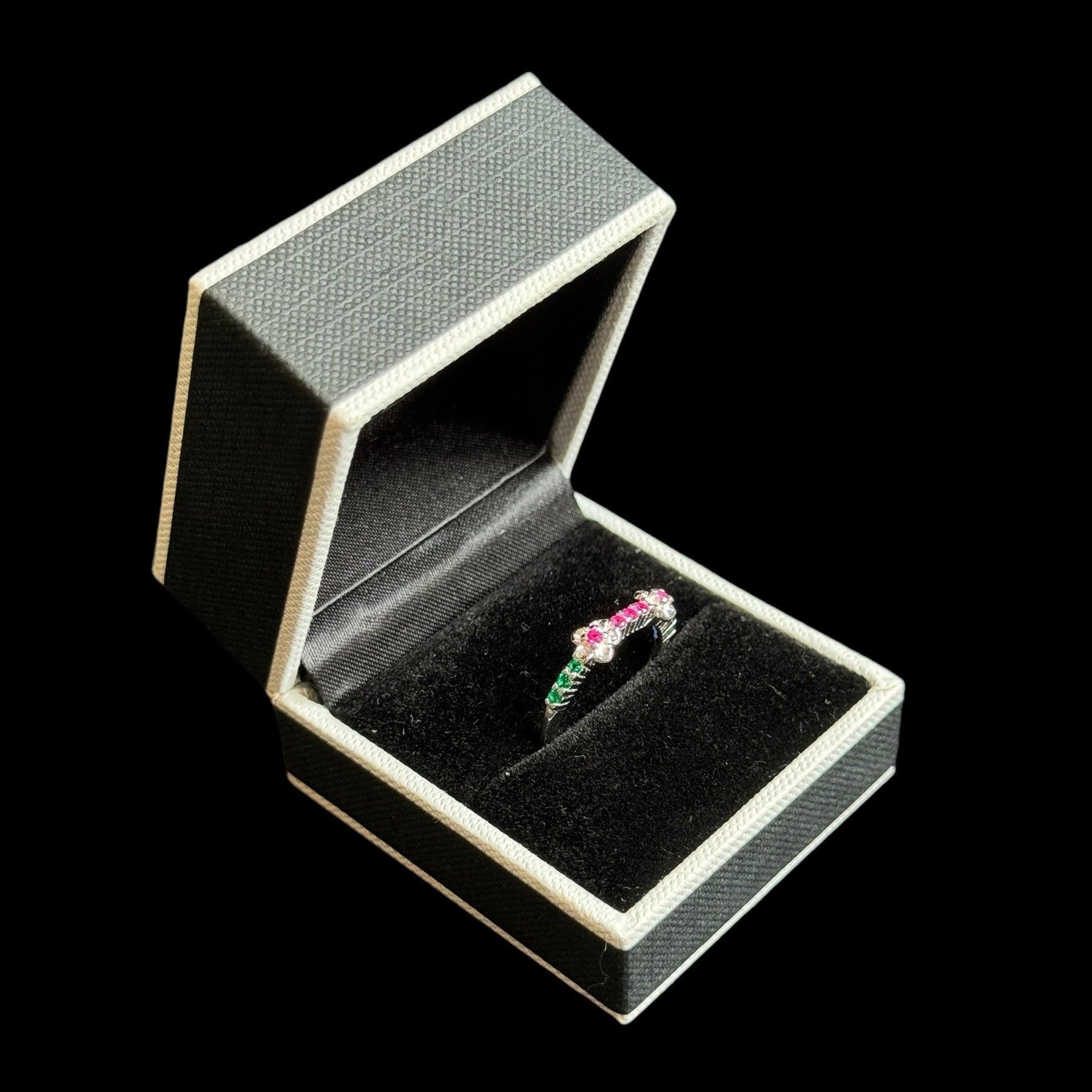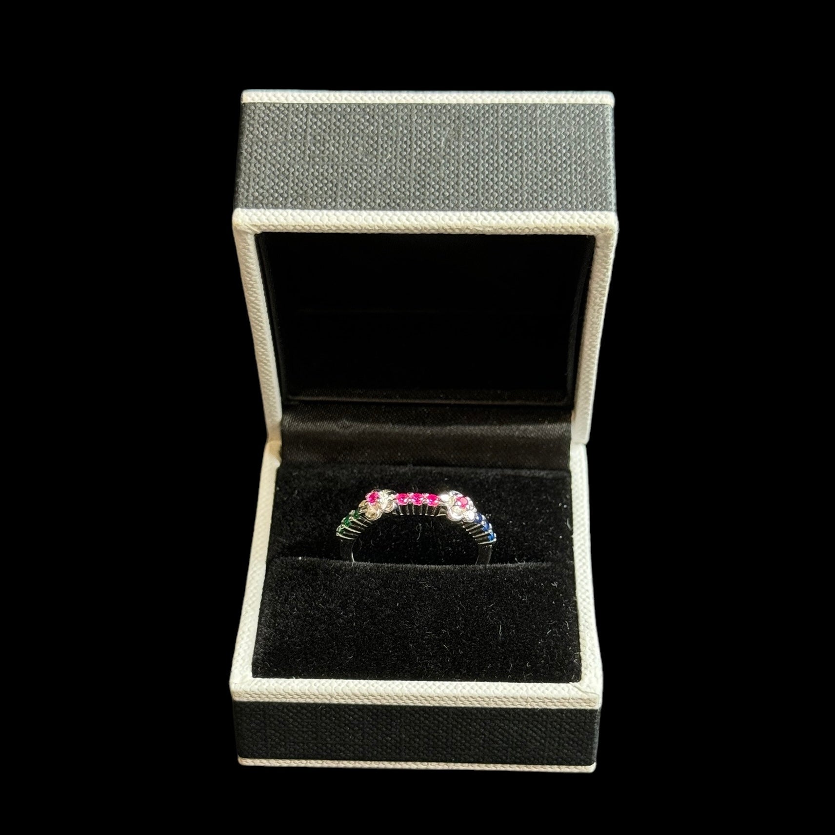 This stunning lab-made multi-gemstone ring, set in 925 sterling silver, is a masterpiece of vibrant color and refined craftsmanship. The band, crafted from high-quality sterling silver, provides a strong and lustrous base that highlights an array of dazzling, ethically sourced lab-grown gemstones. Each gemstone is precision-cut to showcase its individual brilliance, with shades ranging from deep amethyst purple to rich garnet red, citrine yellow, and peridot green. The expertly arranged stones are set in secure prongs or bezels, allowing light to pass through and reflect off every facet, creating an eye-catching, radiant sparkle.