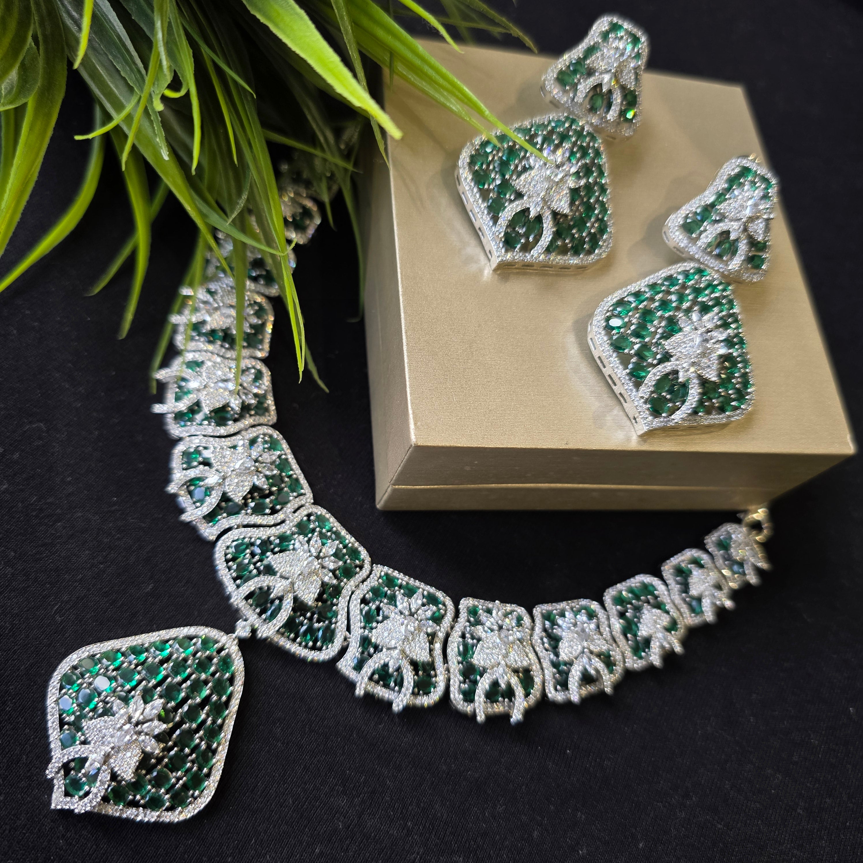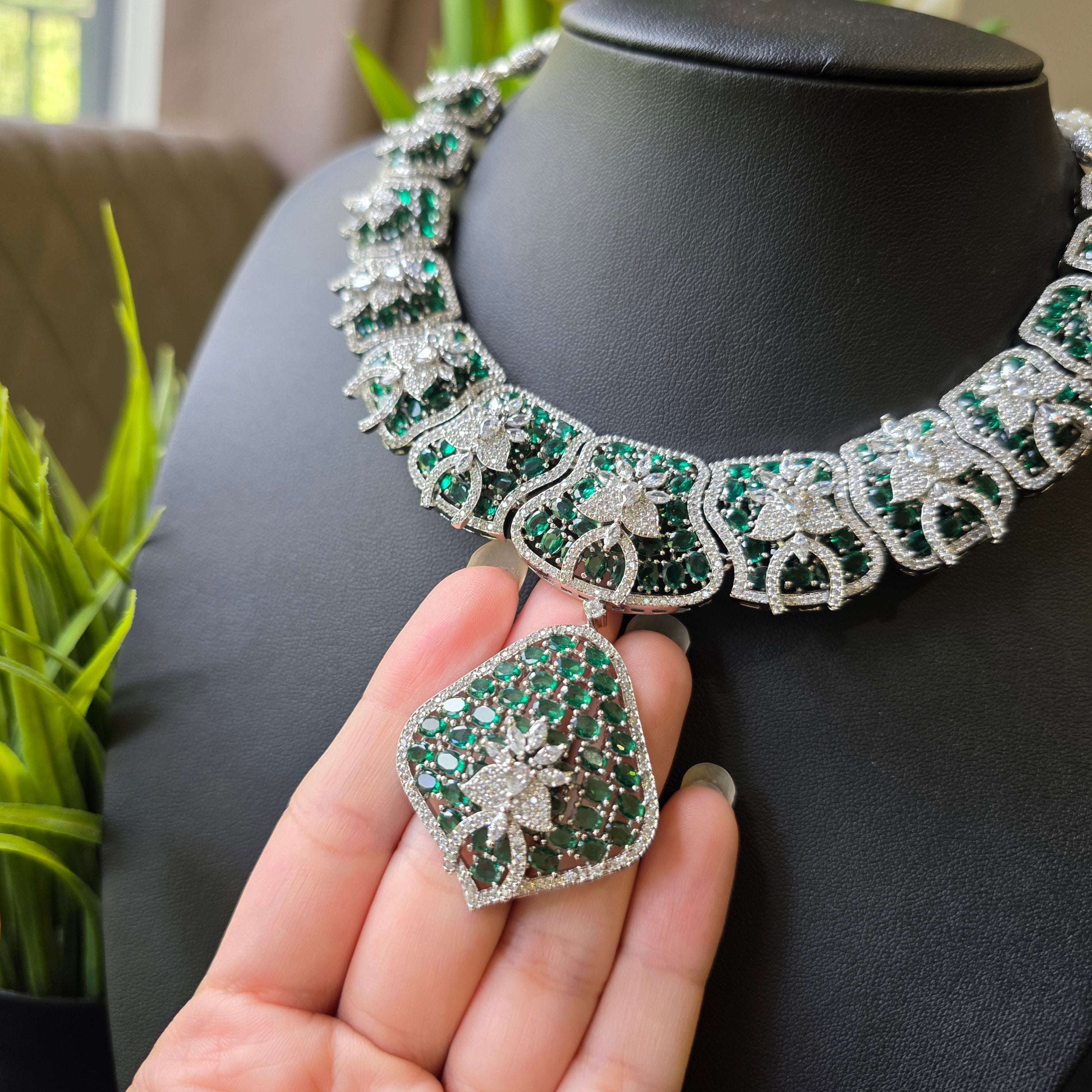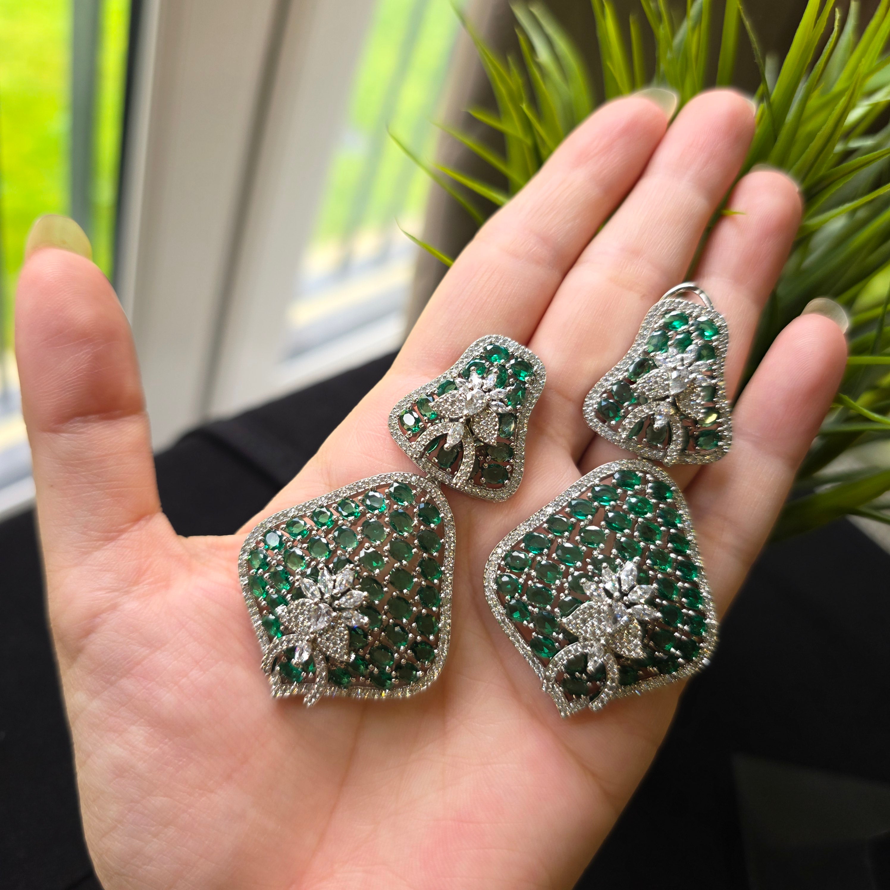 Introducing this Bold Statement one of a kind piece featuring Emeralds (lab-made) and high quality CZ, complemented by matching Earrings. Add a touch of elegance and sparkle to your look.