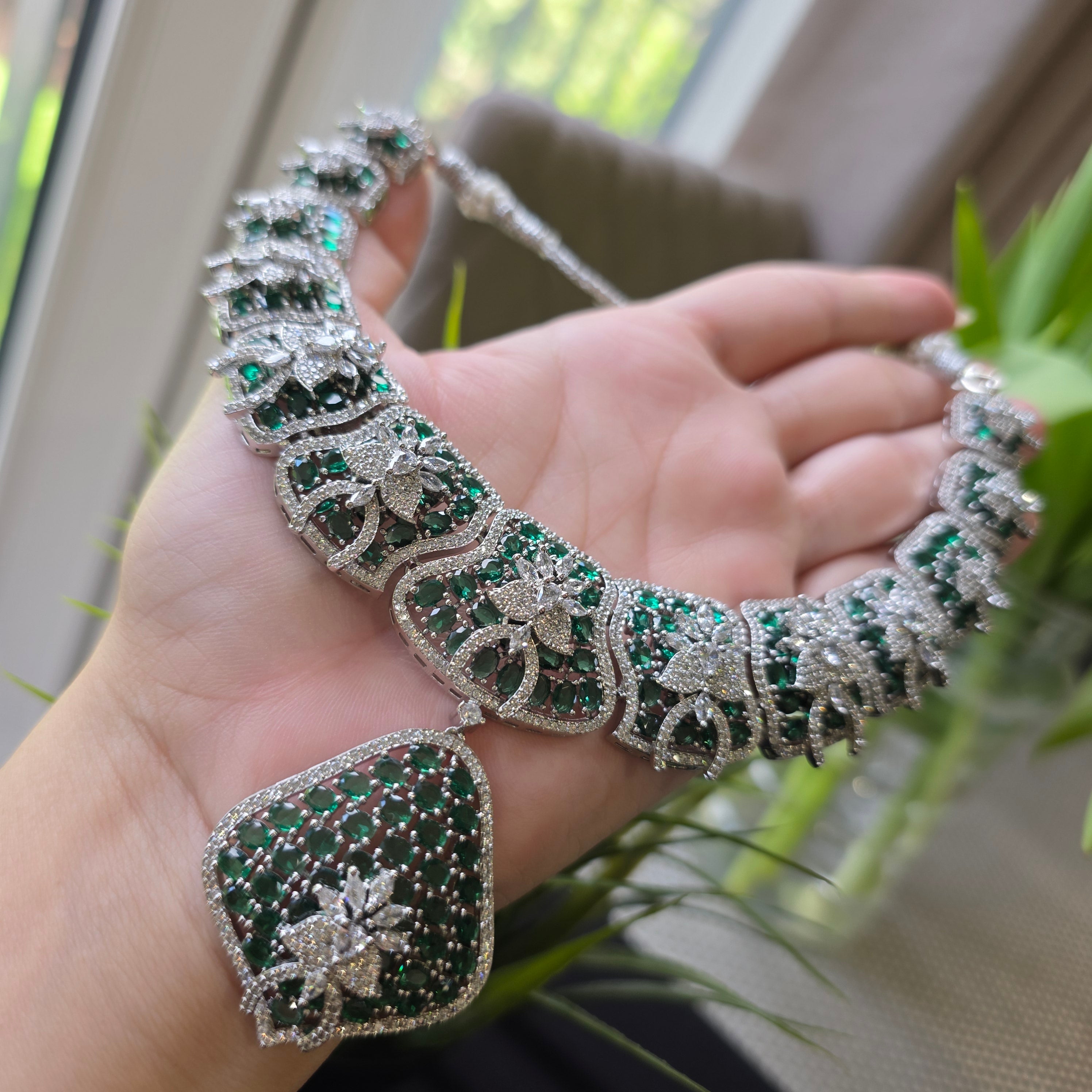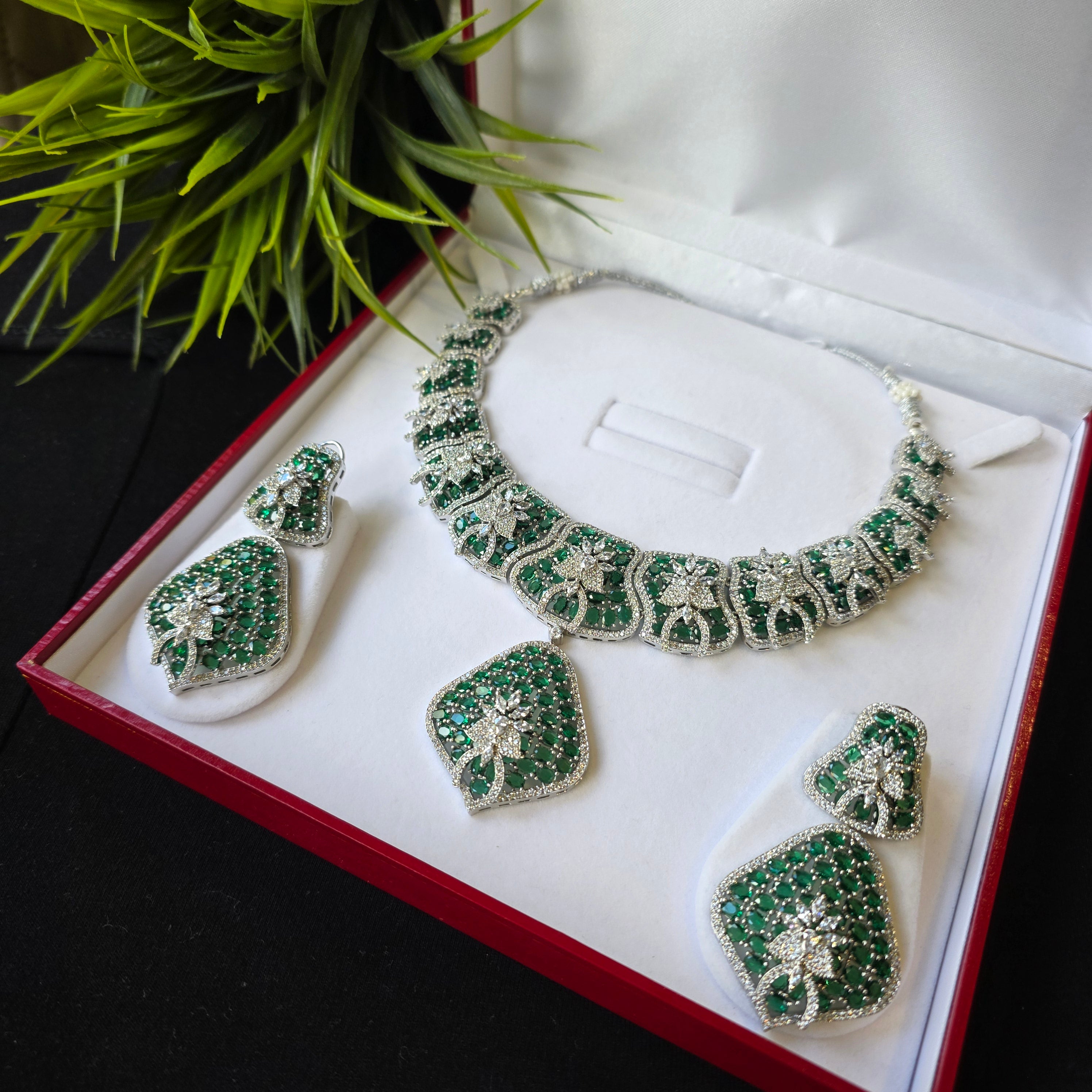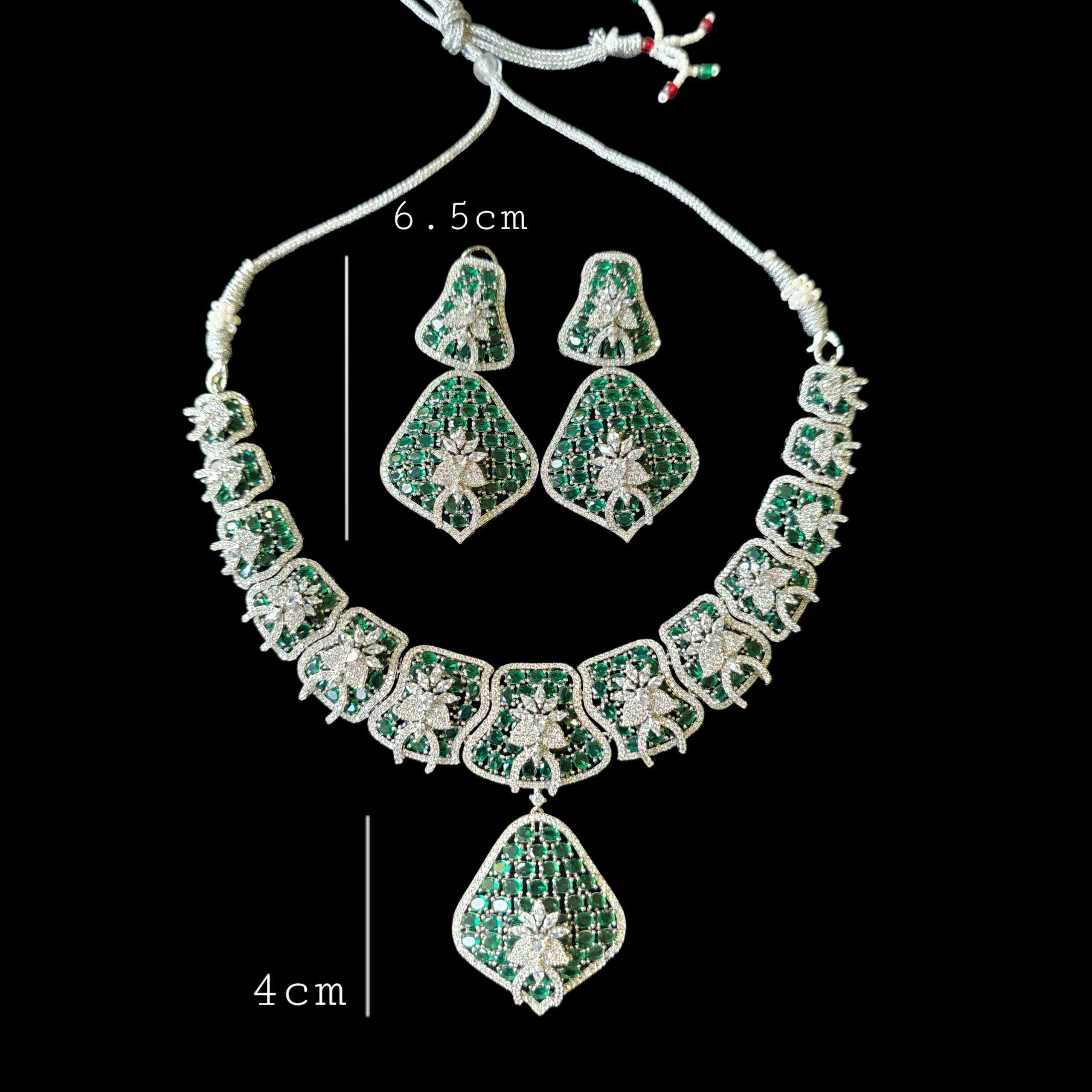 Introducing this Bold Statement one of a kind piece featuring Emeralds (lab-made) and high quality CZ, complemented by matching Earrings. Add a touch of elegance and sparkle to your look.