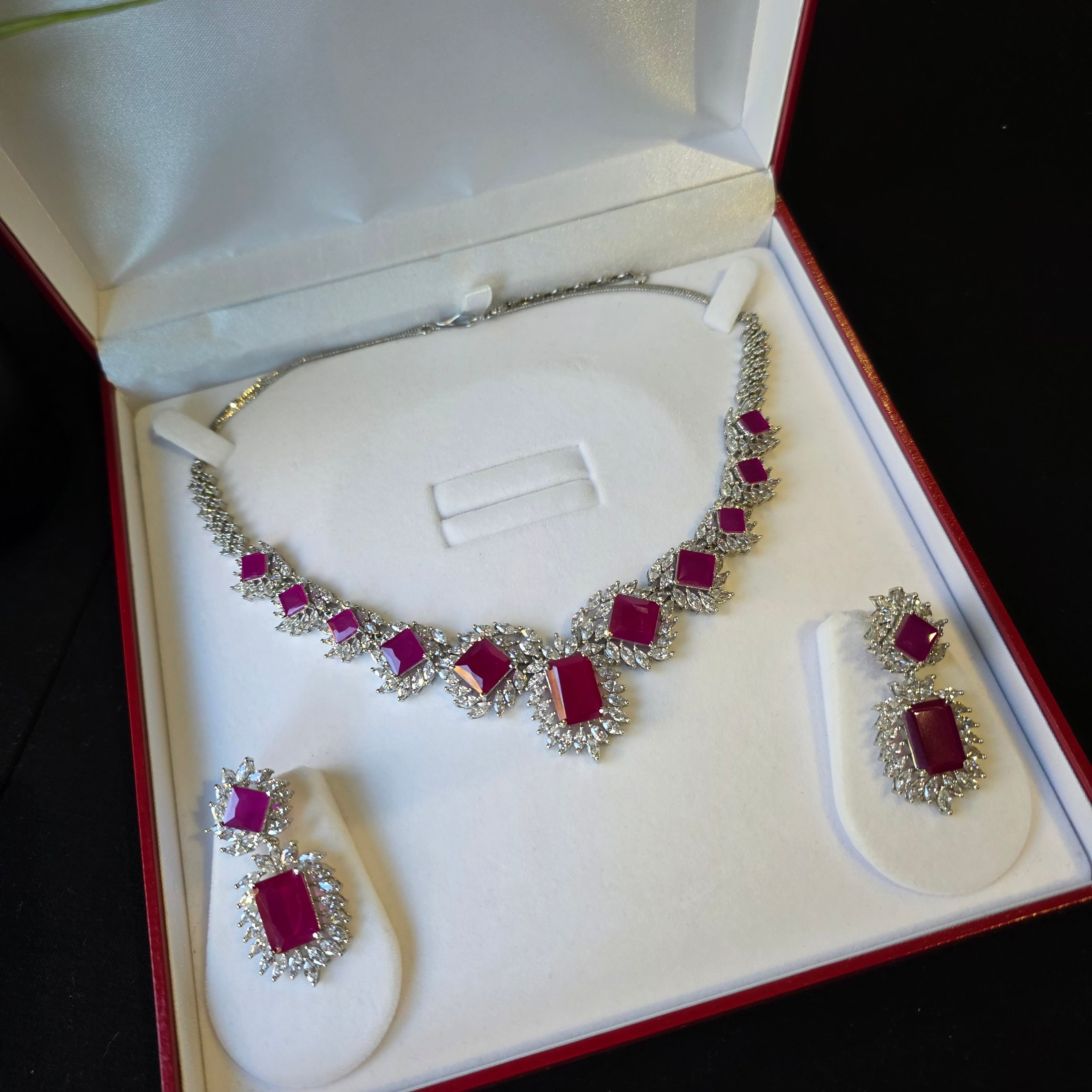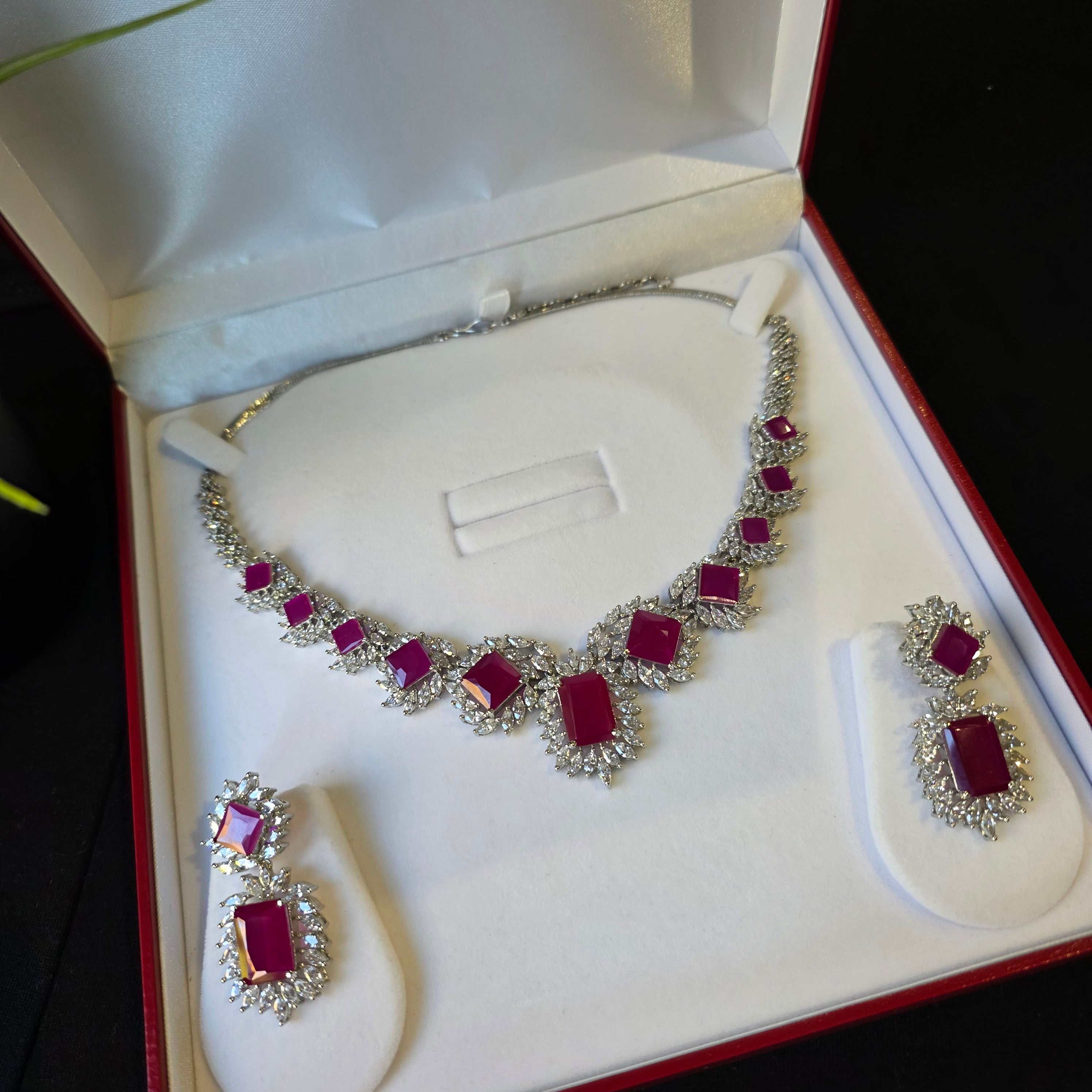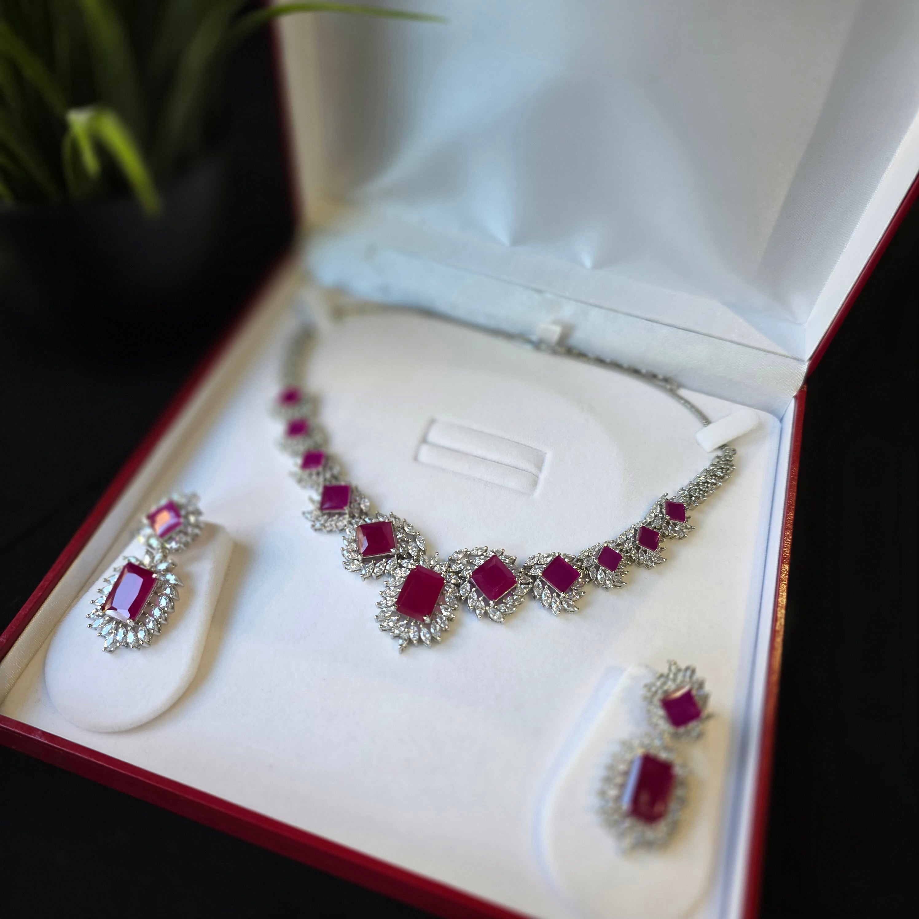 This exquisite piece features Deep Pink Rubies (lab-made) and Cubic Zirconia studded Necklace paired with matching Earrings.
