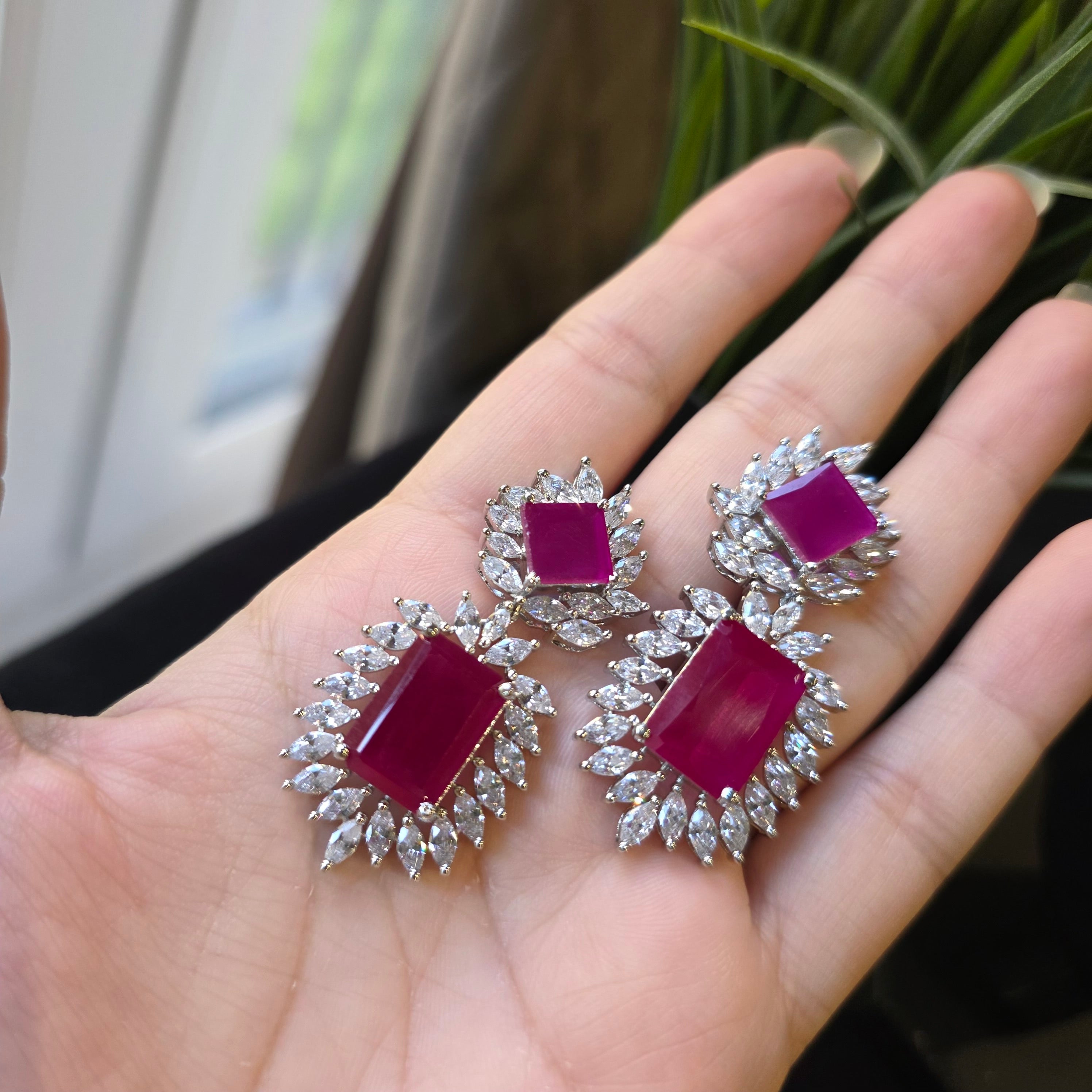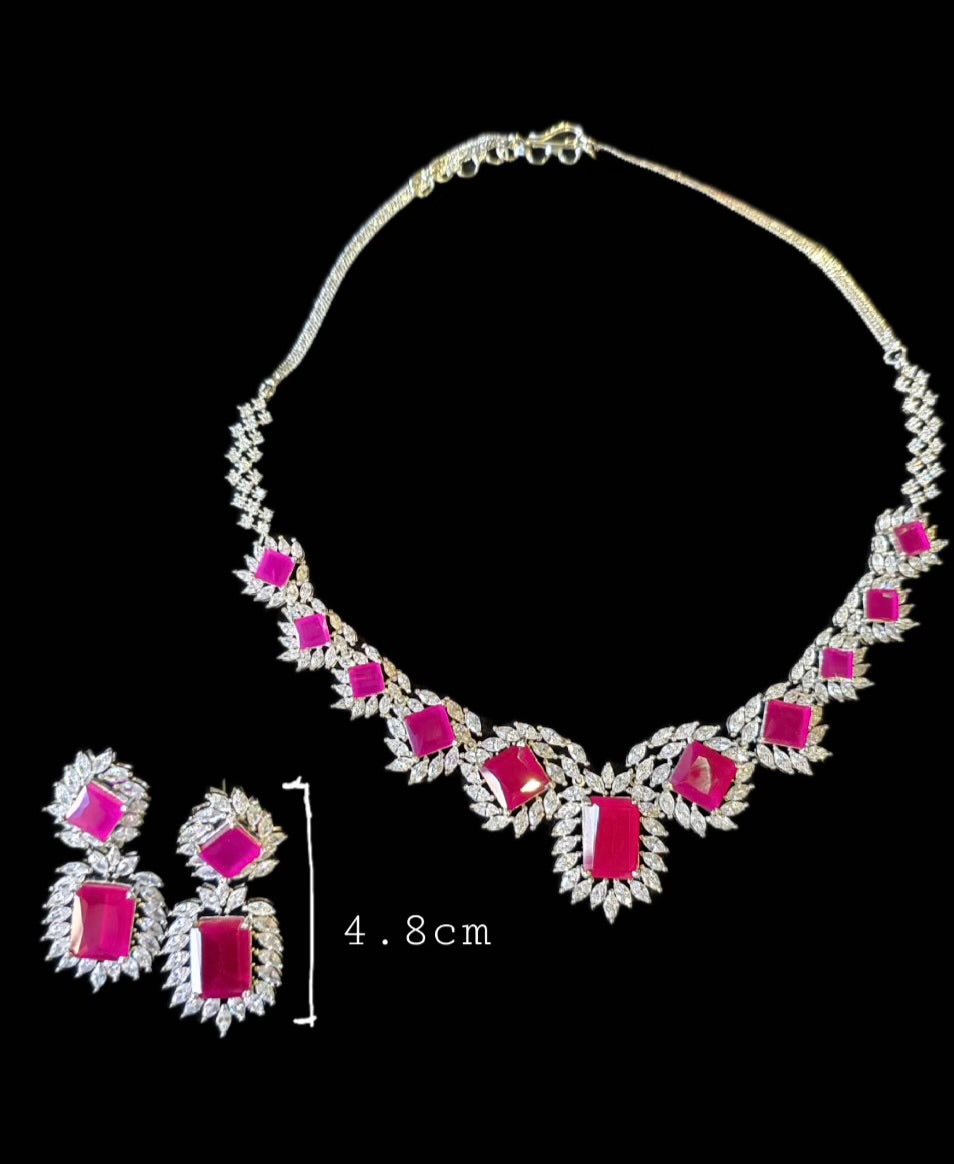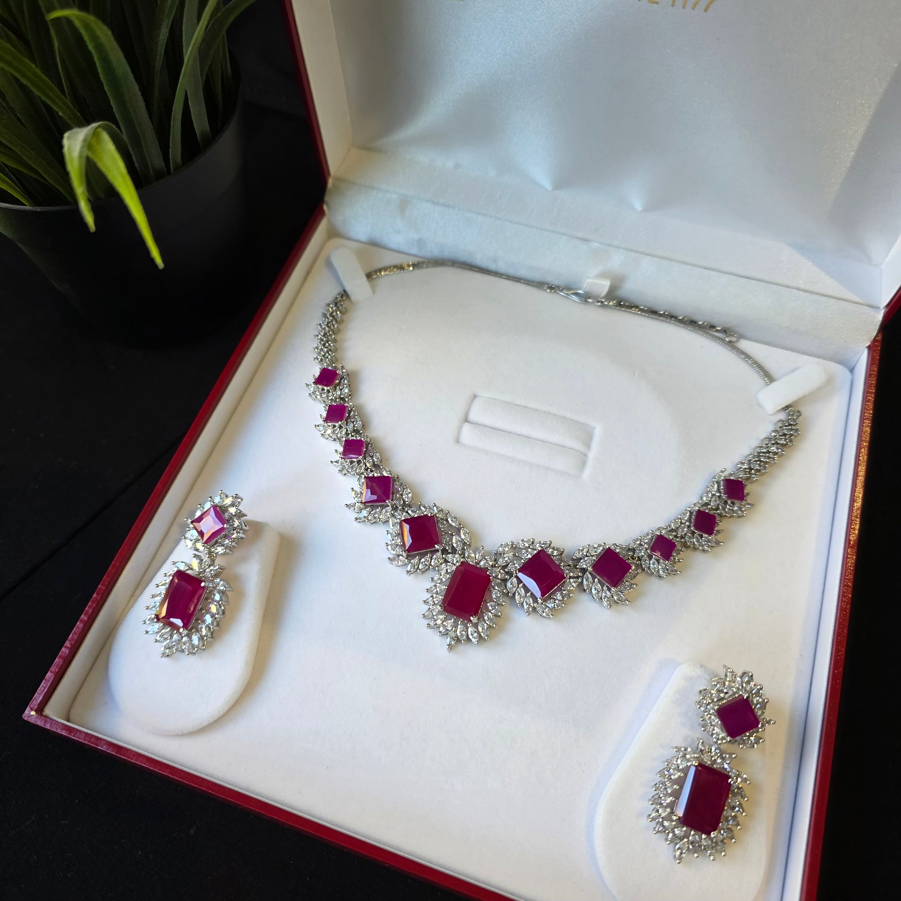 This exquisite piece features Deep Pink Rubies (lab-made) and Cubic Zirconia studded Necklace paired with matching Earrings.