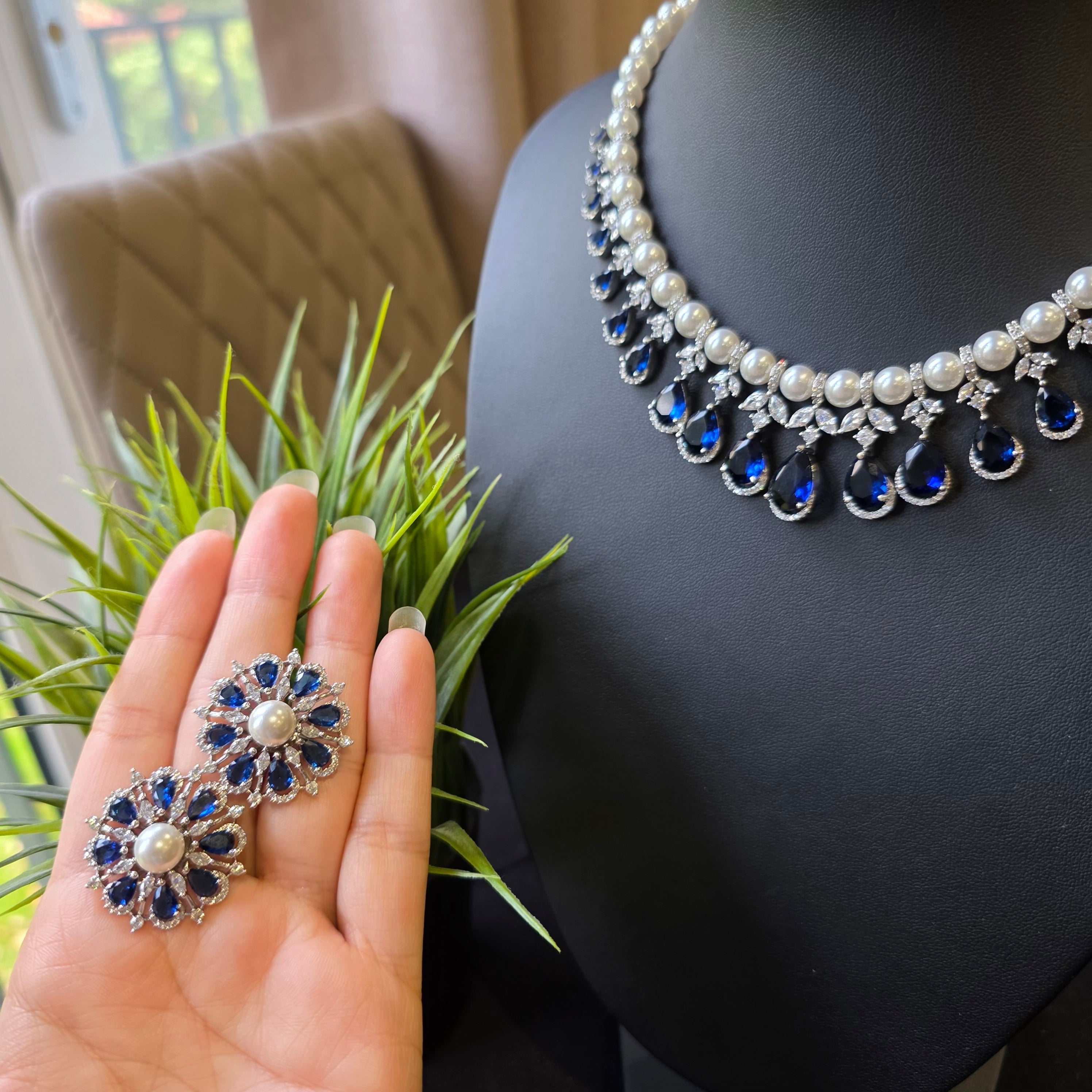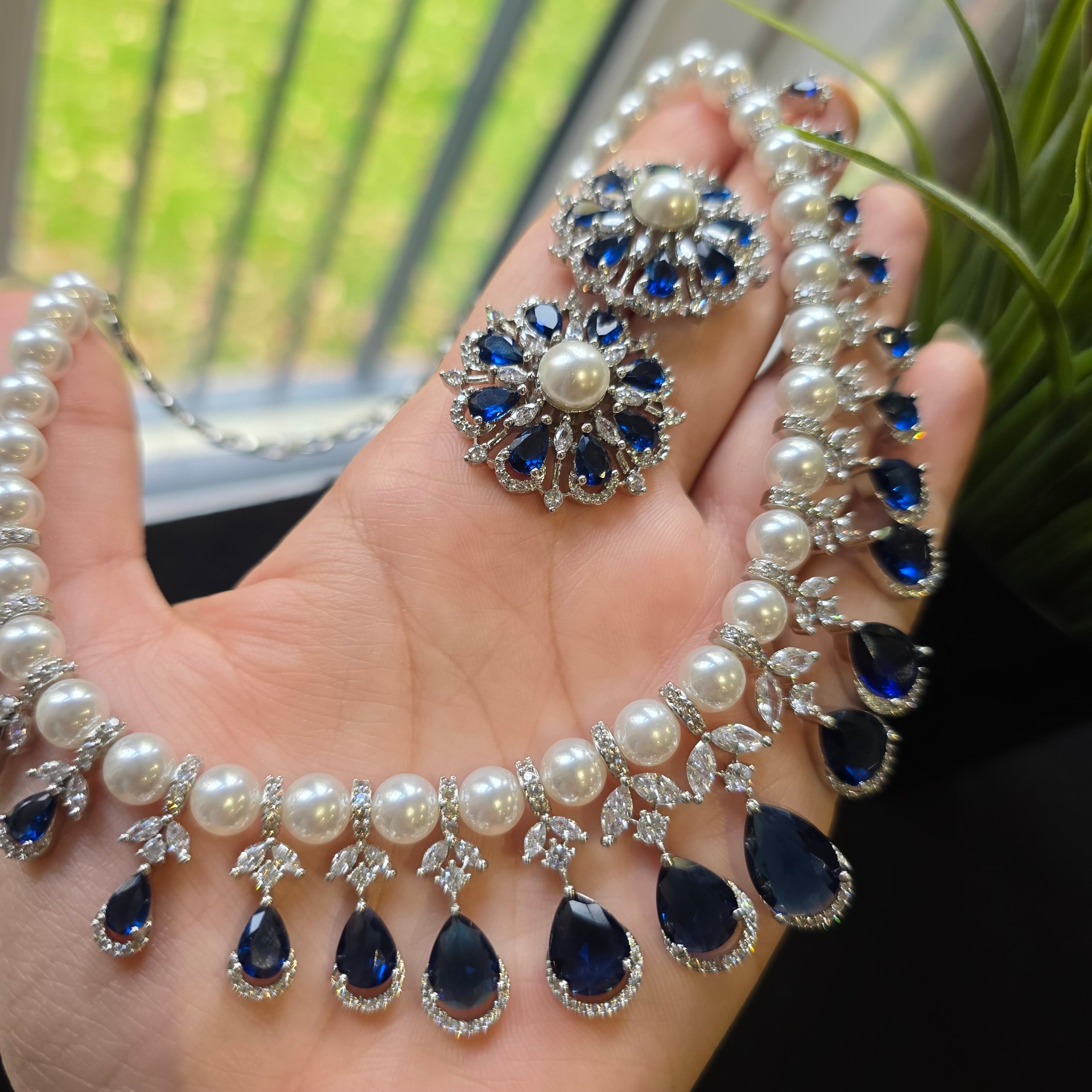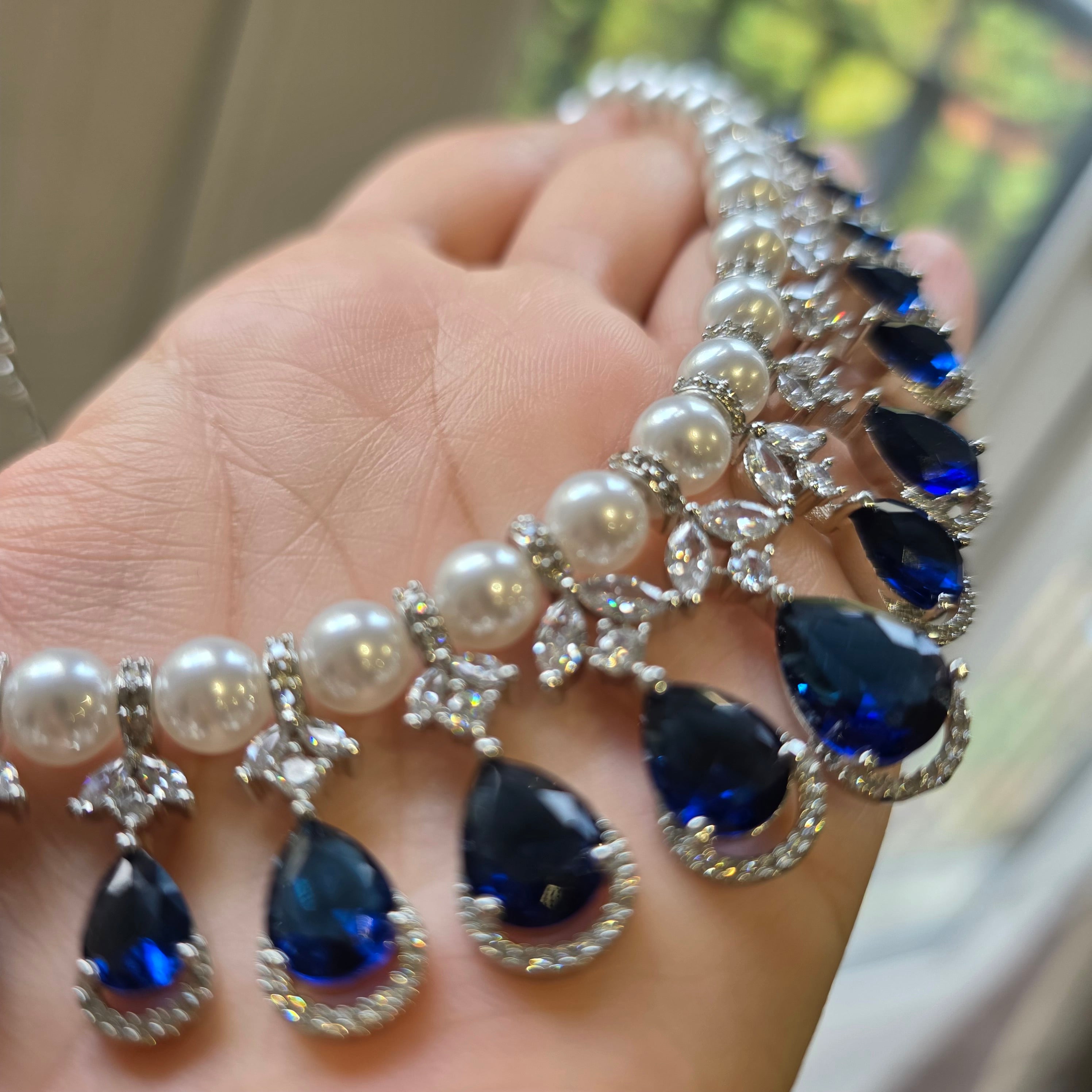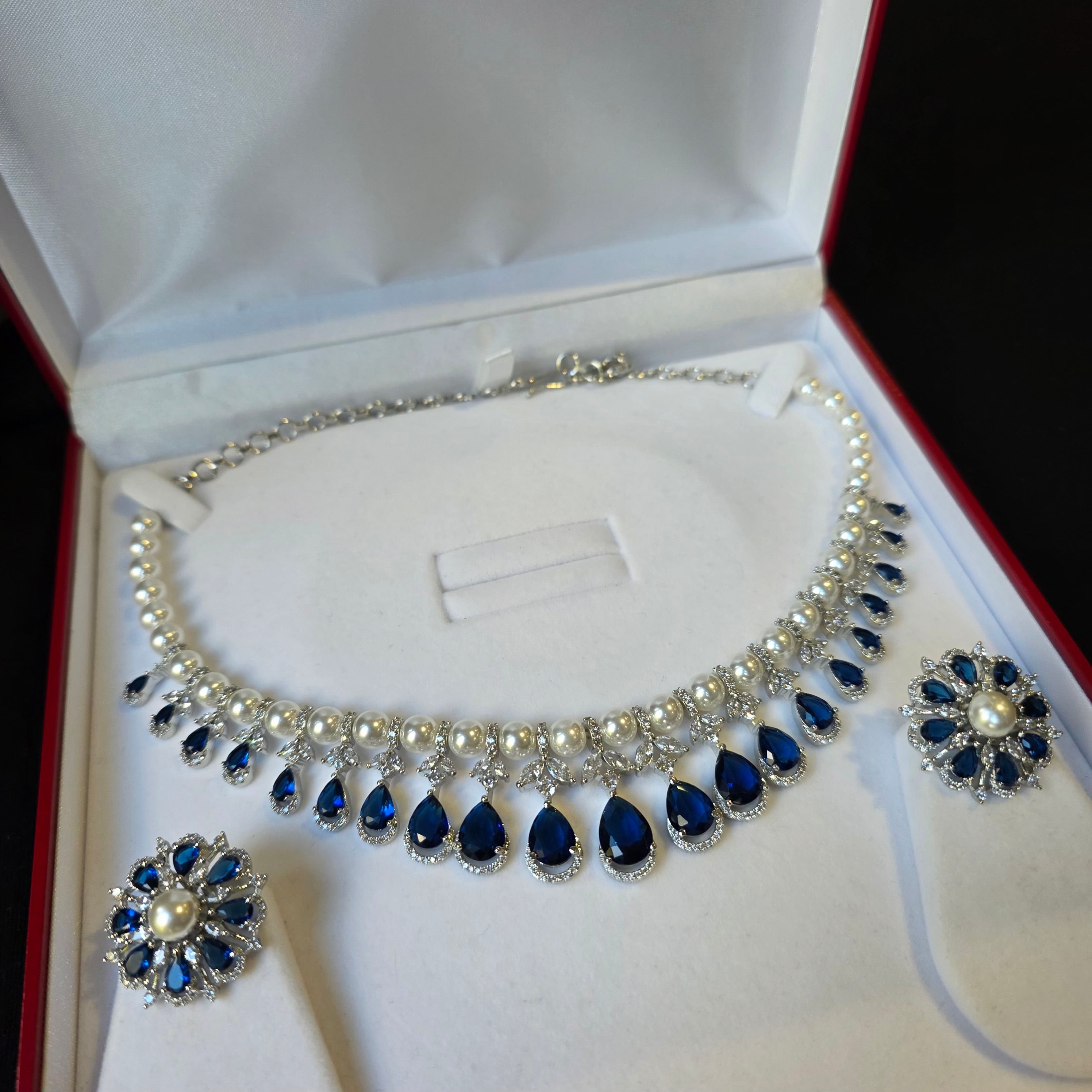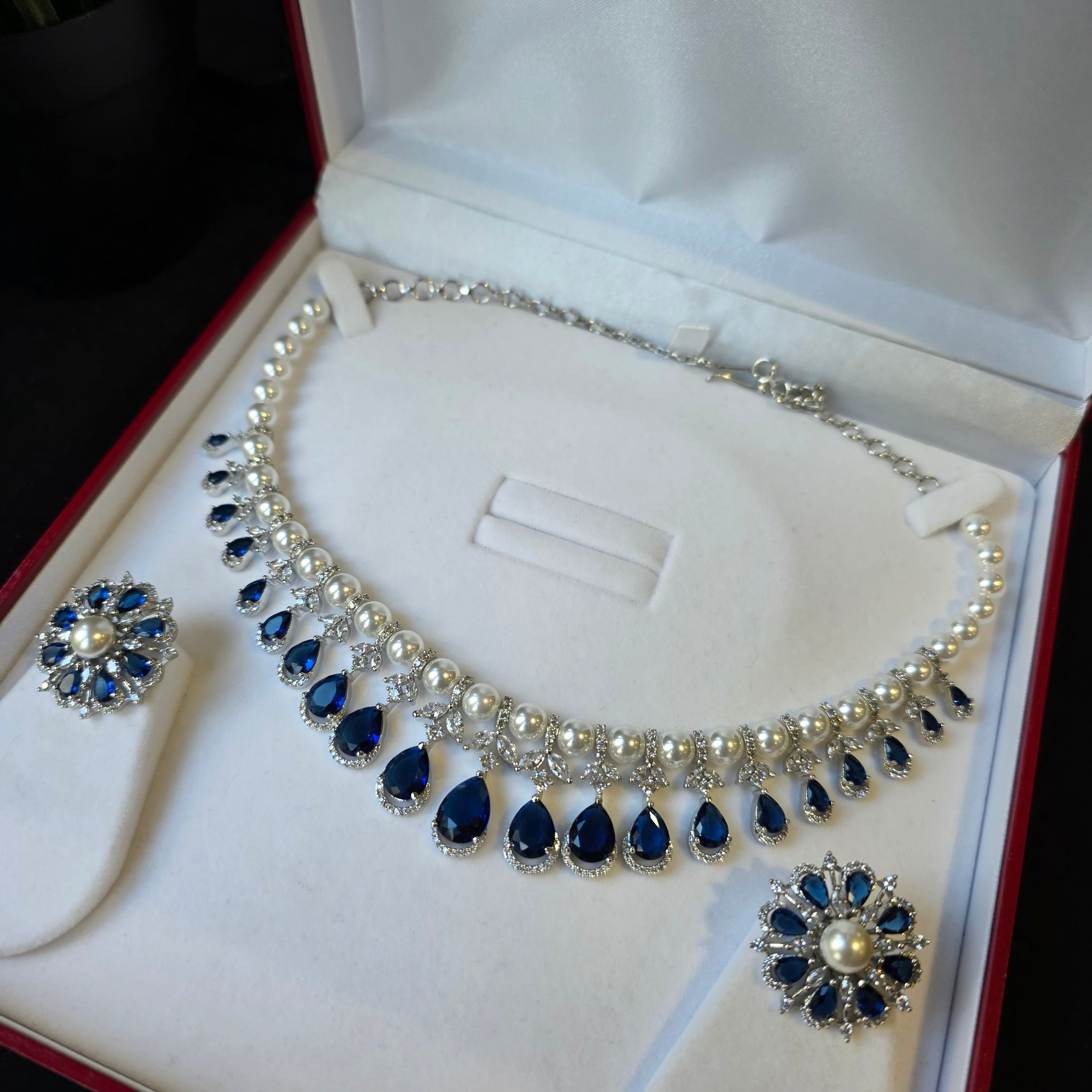 Introducing Timeless piece featuring stunning Blue Sapphires (lab-made) and luxurious Pearls studded Necklace paired with matching Earrings (Studs).