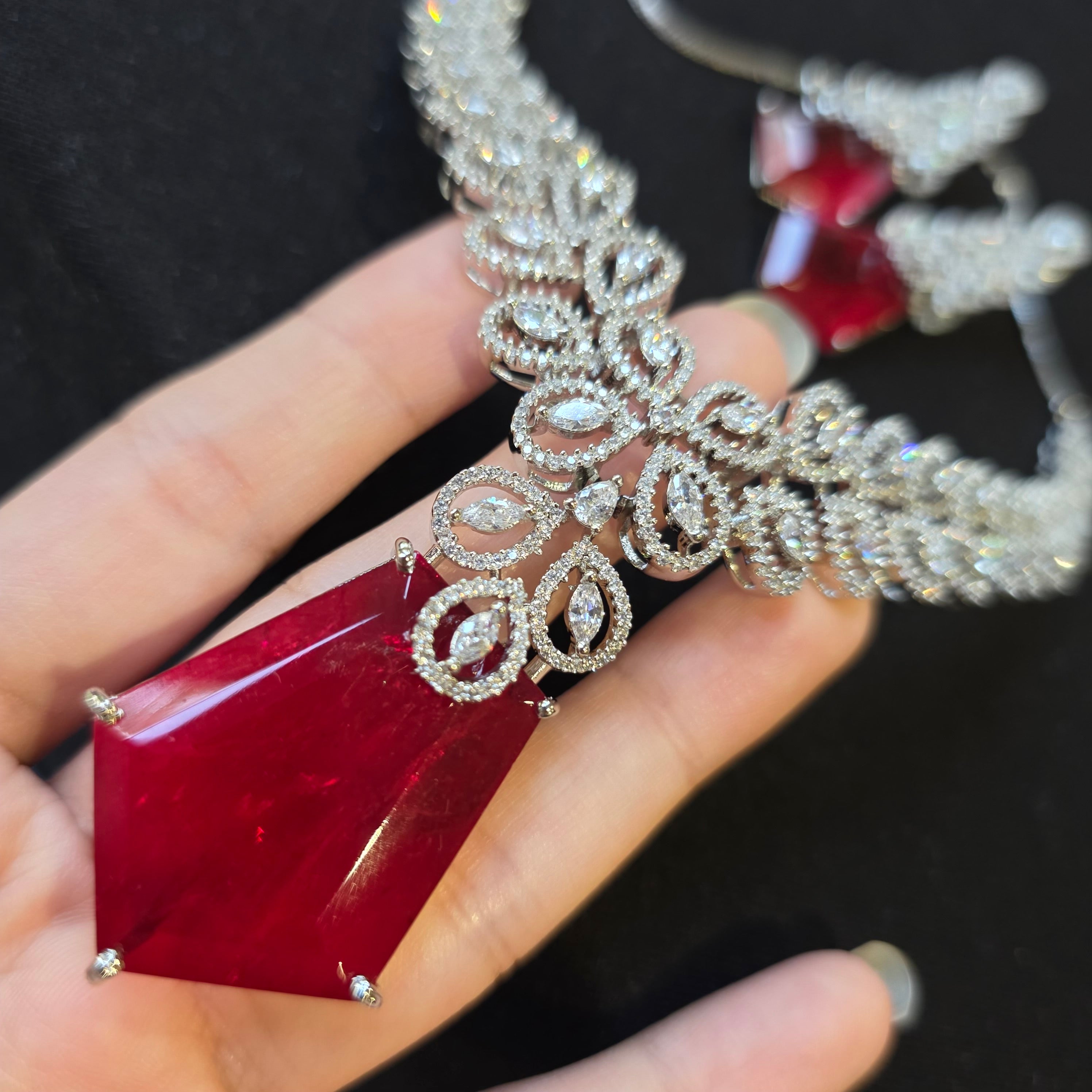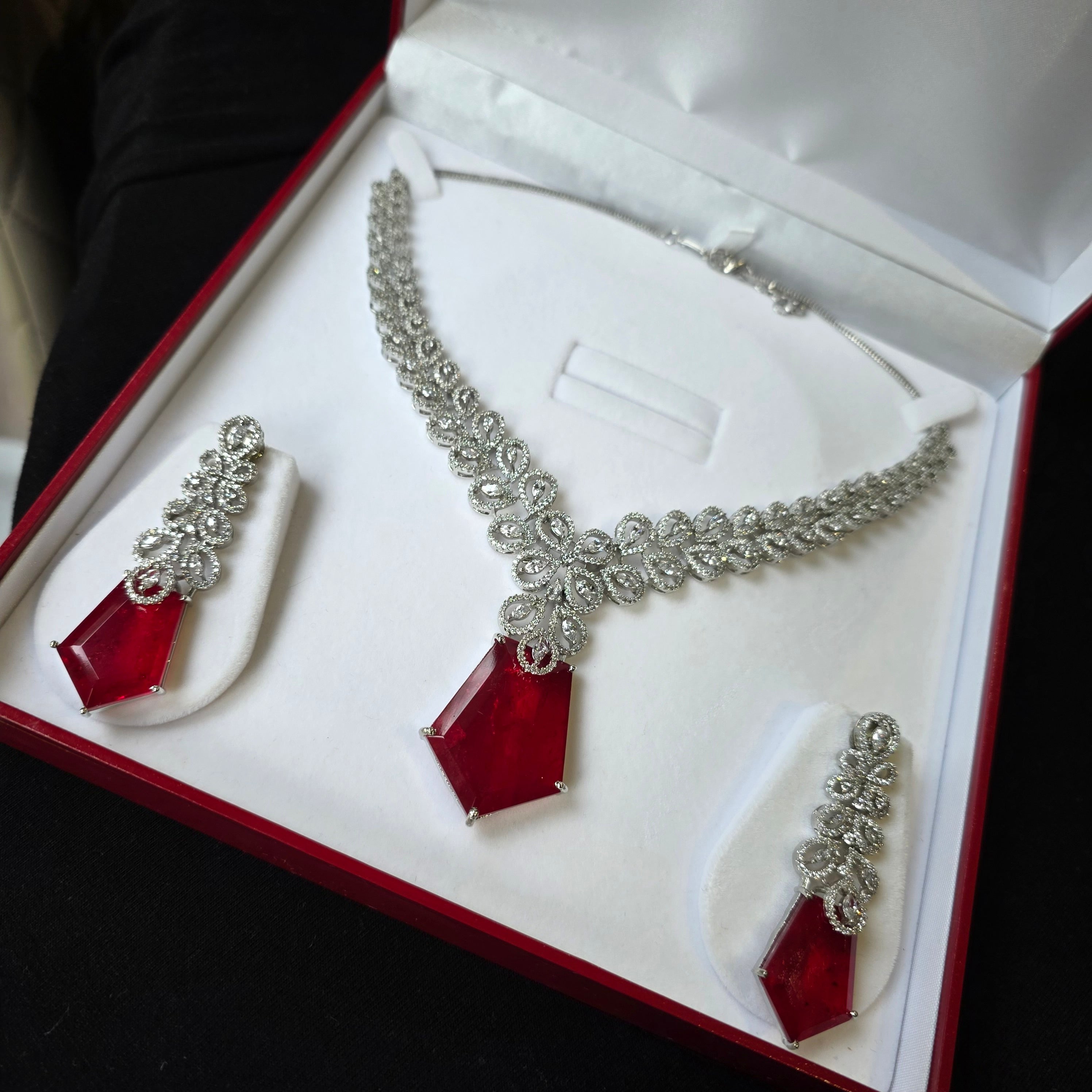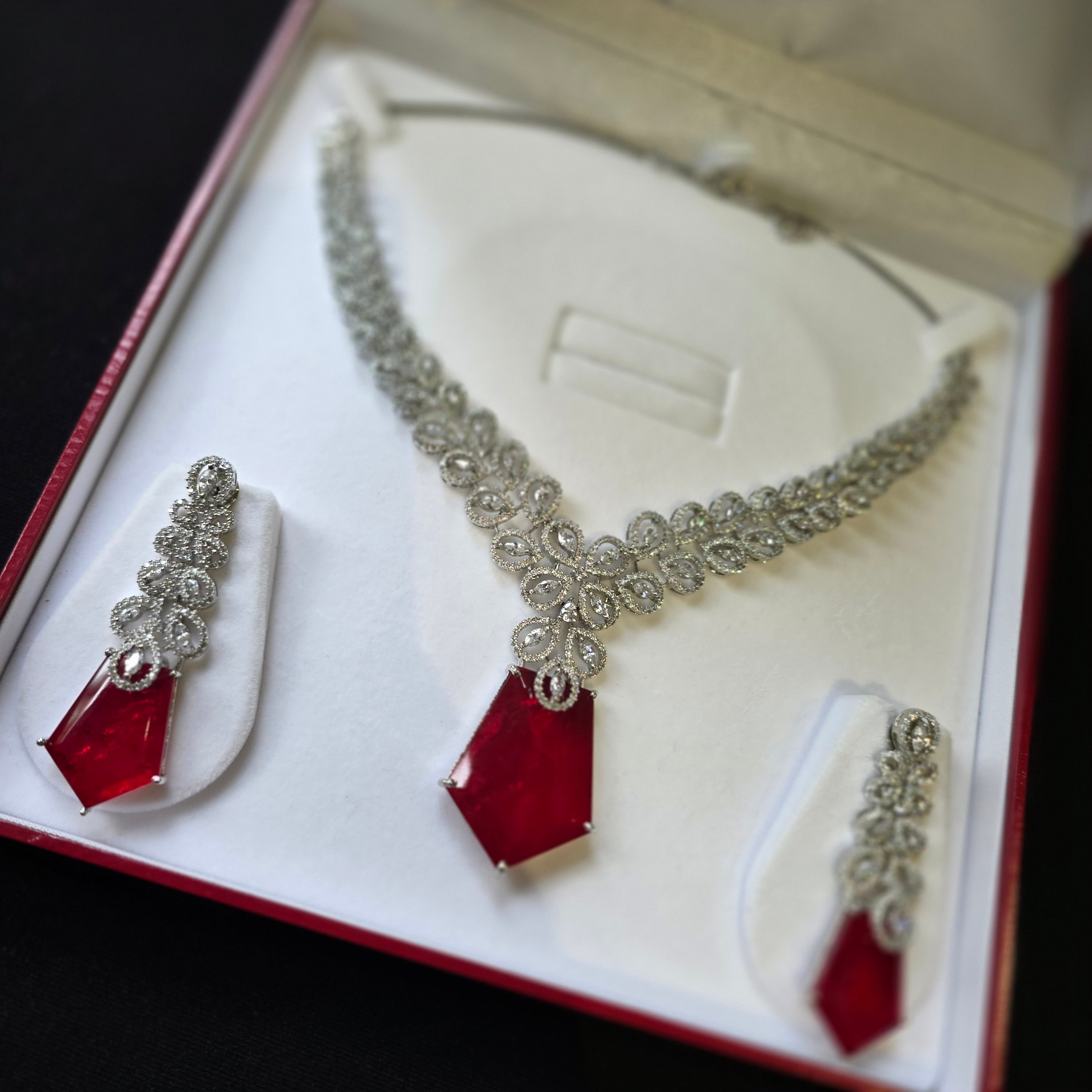 Bespoke piece featuring a fierce Red Ruby (lab-made) and Cubic Zirconia studded Necklace paired with matching Earrings.
