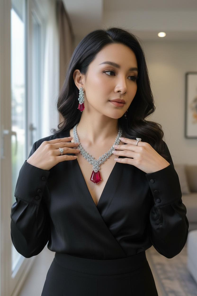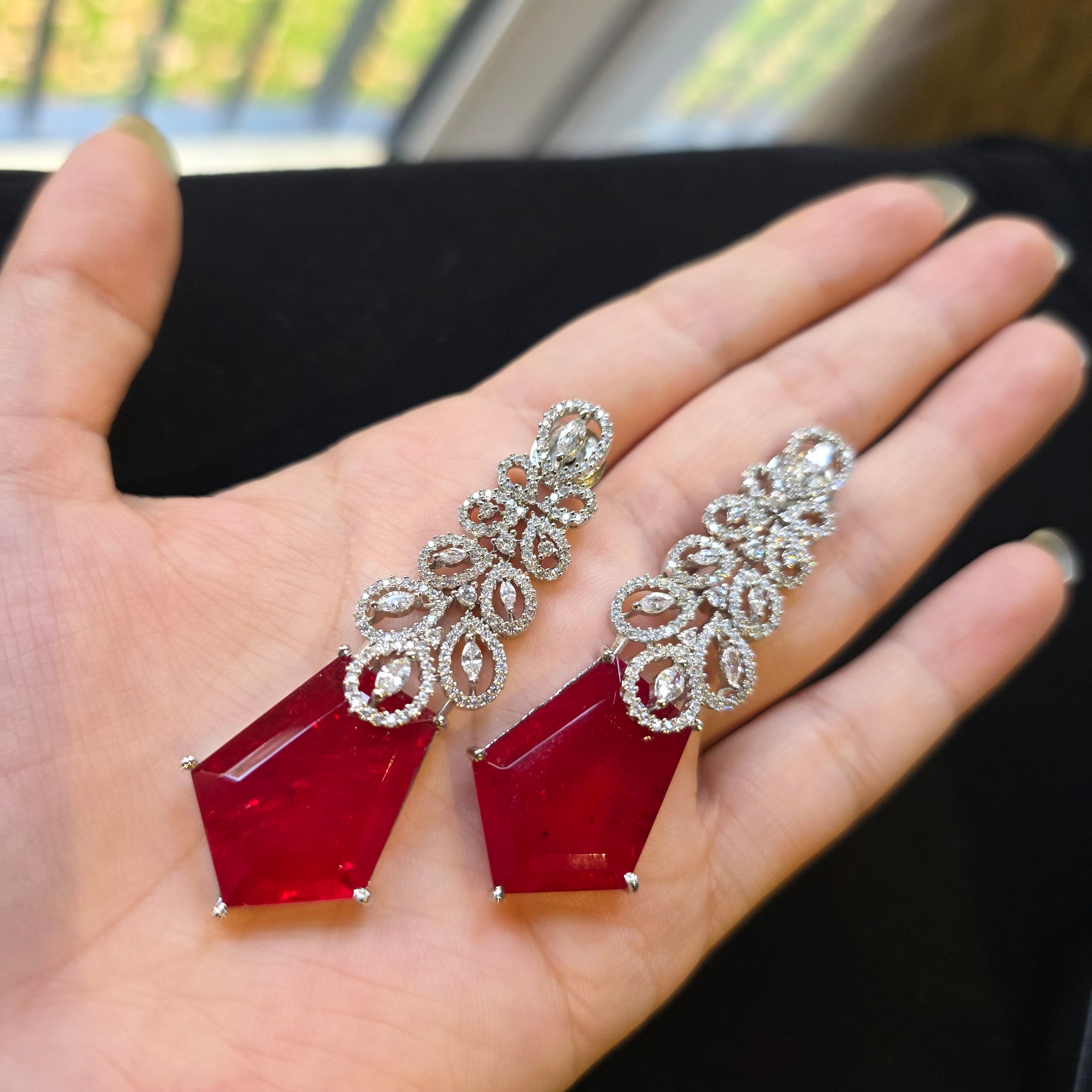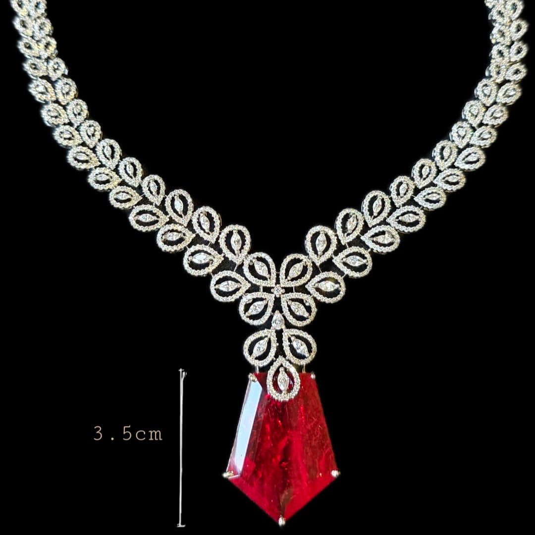 Bespoke piece featuring a fierce Red Ruby (lab-made) and Cubic Zirconia studded Necklace paired with matching Earrings.