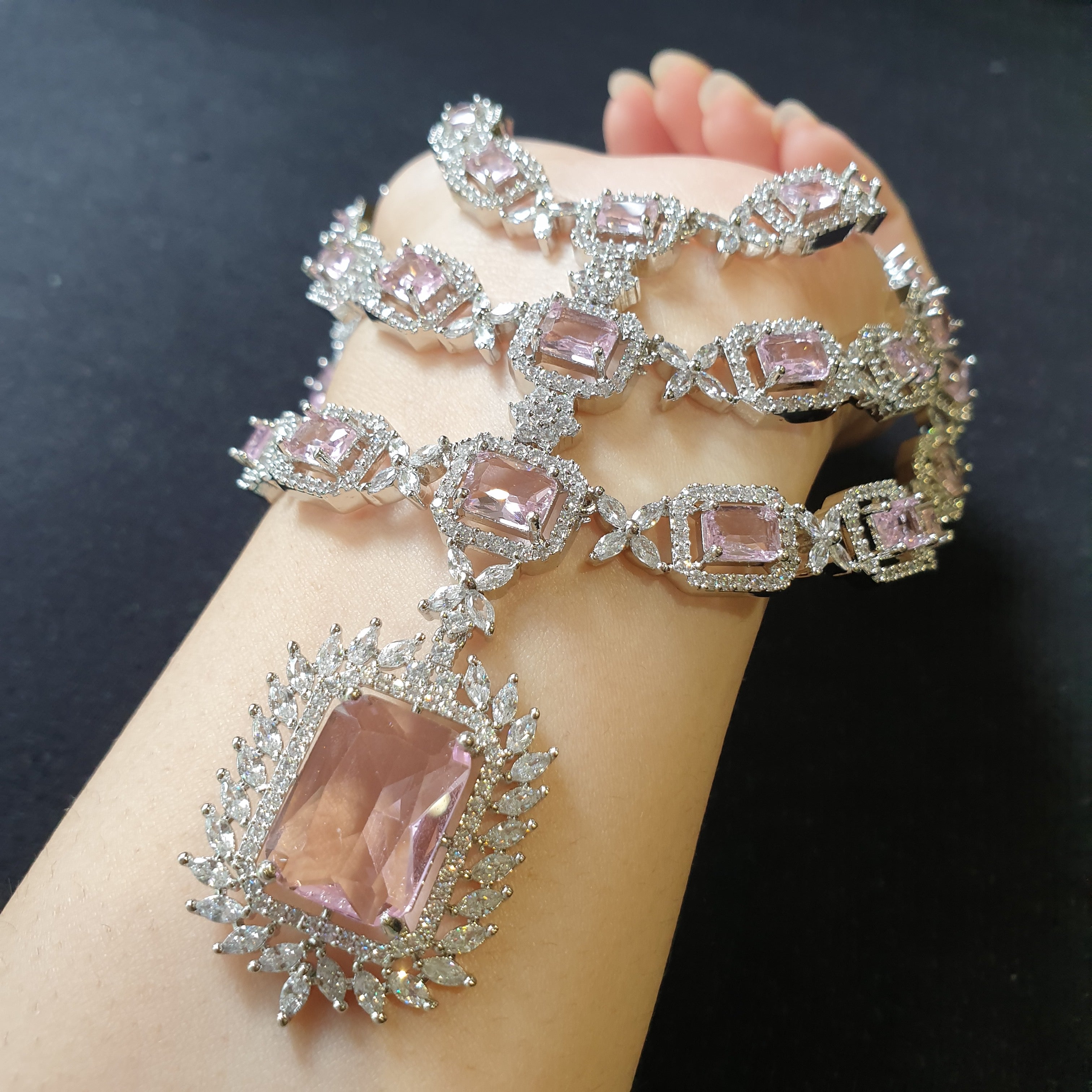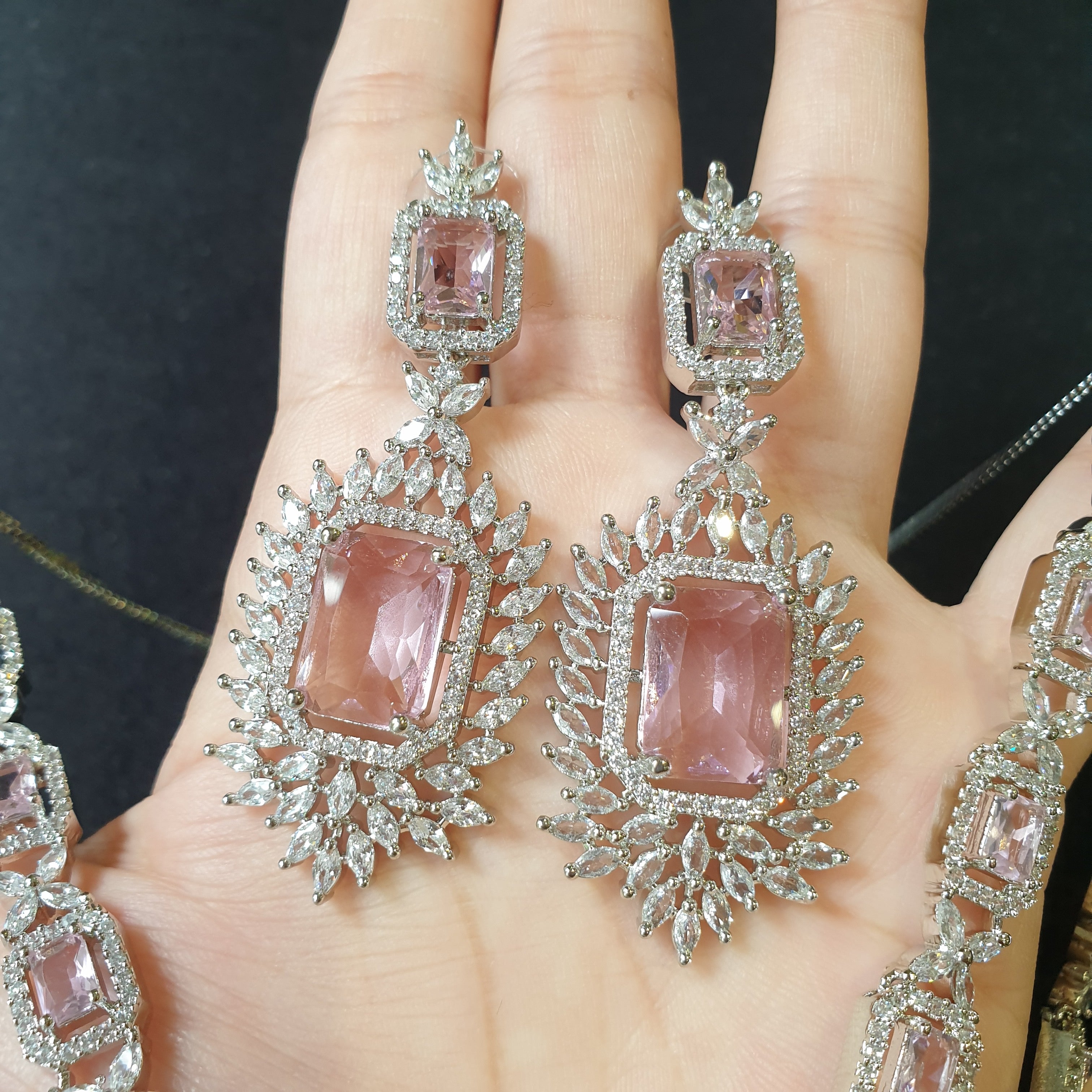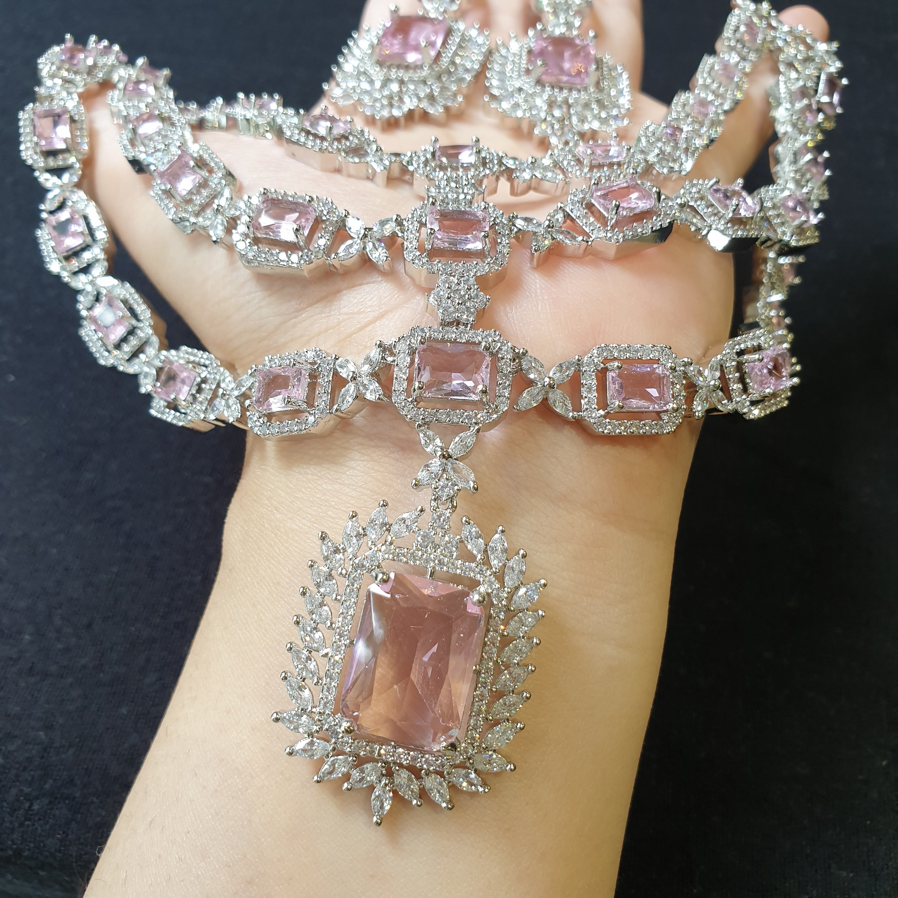 Delicate and elegant, this baby pink quartz necklace and earrings set exudes grace and femininity, beautifully complemented by sparkling cubic zirconia and a white gold-plated finish.