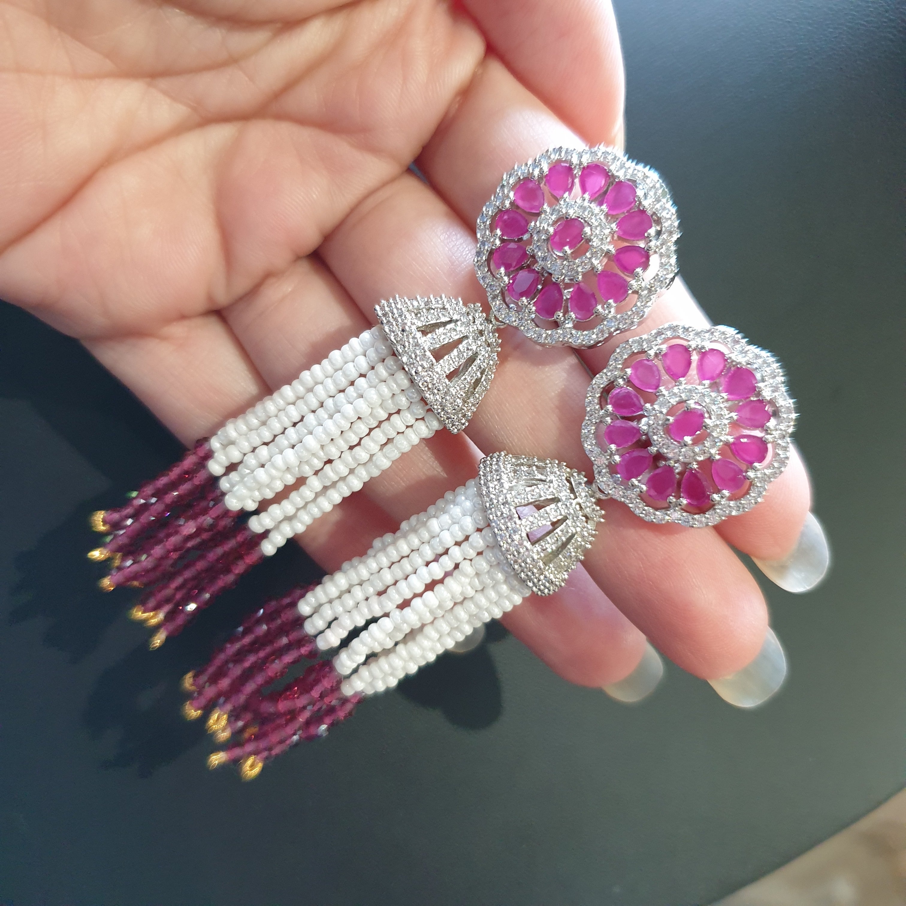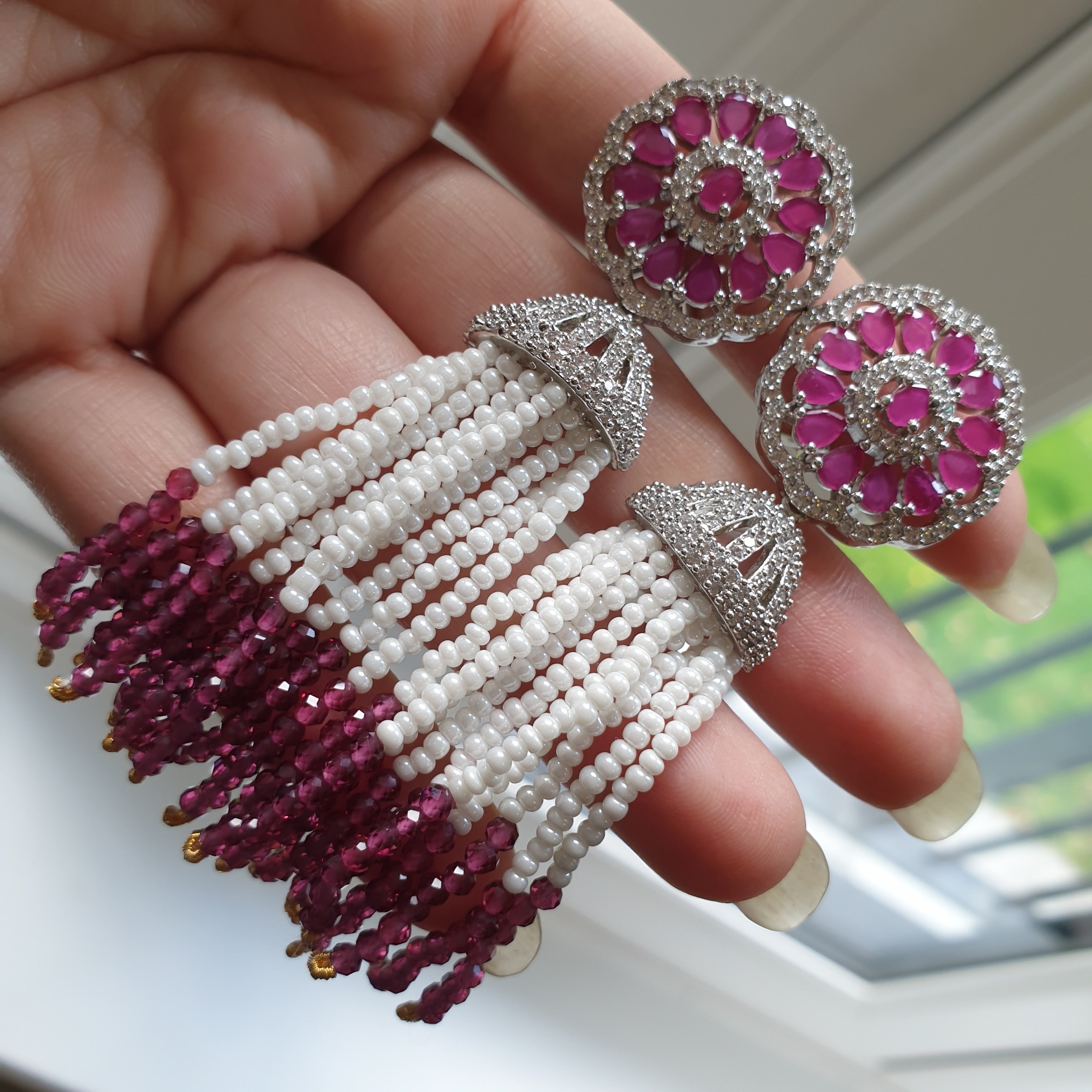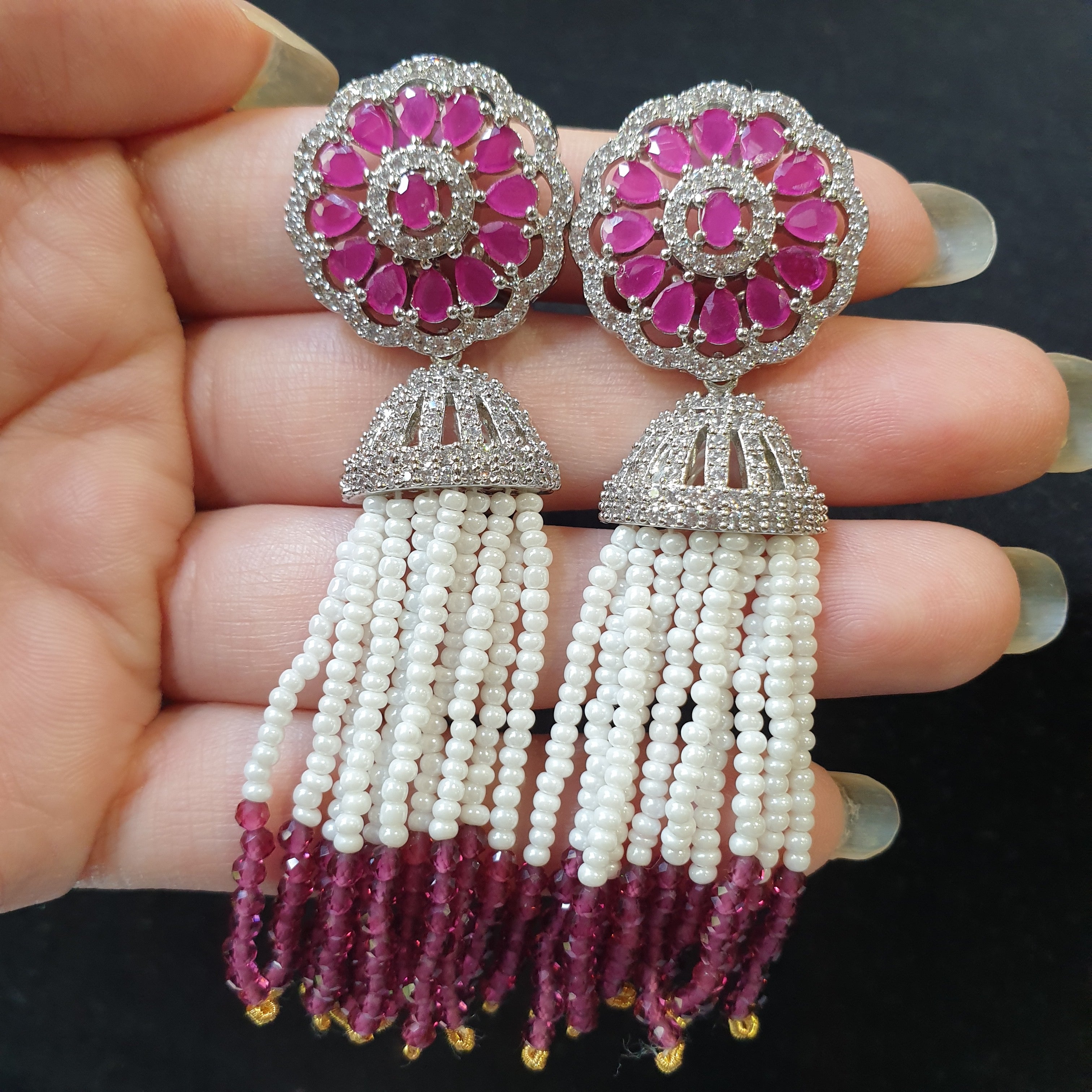These stunning jhumka earrings feature lab-made ruby pearls, radiating a deep, rich red hue that adds a bold touch of luxury to the traditional design. The vibrant ruby pearls are beautifully paired with shimmering cubic zirconia accents, creating a dazzling contrast that enhances the elegance of the jhumkas. Intricately crafted, the earrings showcase a classic bell-shaped design adorned with sparkling cubic zirconia stones, adding a modern twist to this timeless accessory. Perfect for weddings, festive occasions, or special events, these earrings are a striking combination of tradition, opulence, and contemporary sparkle.