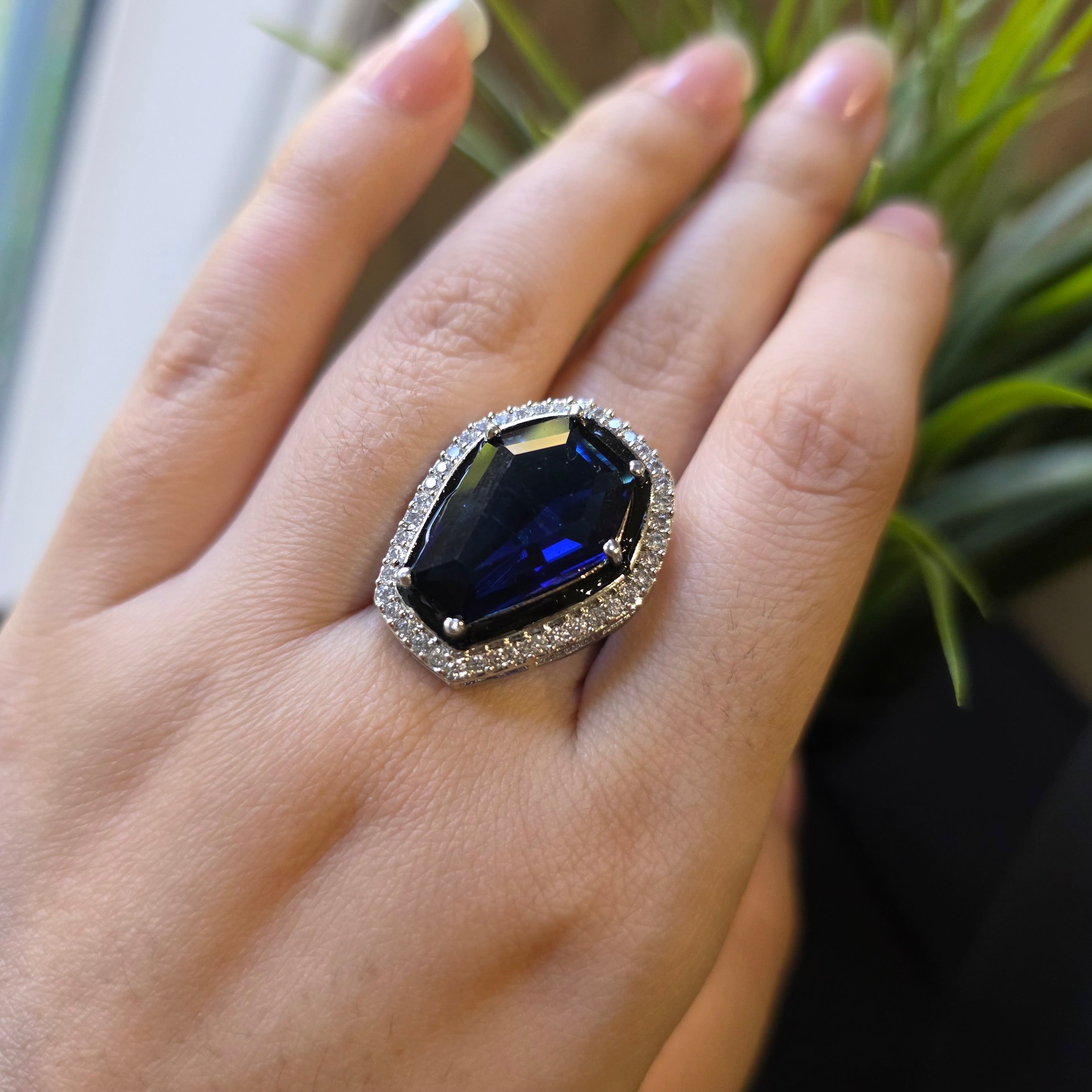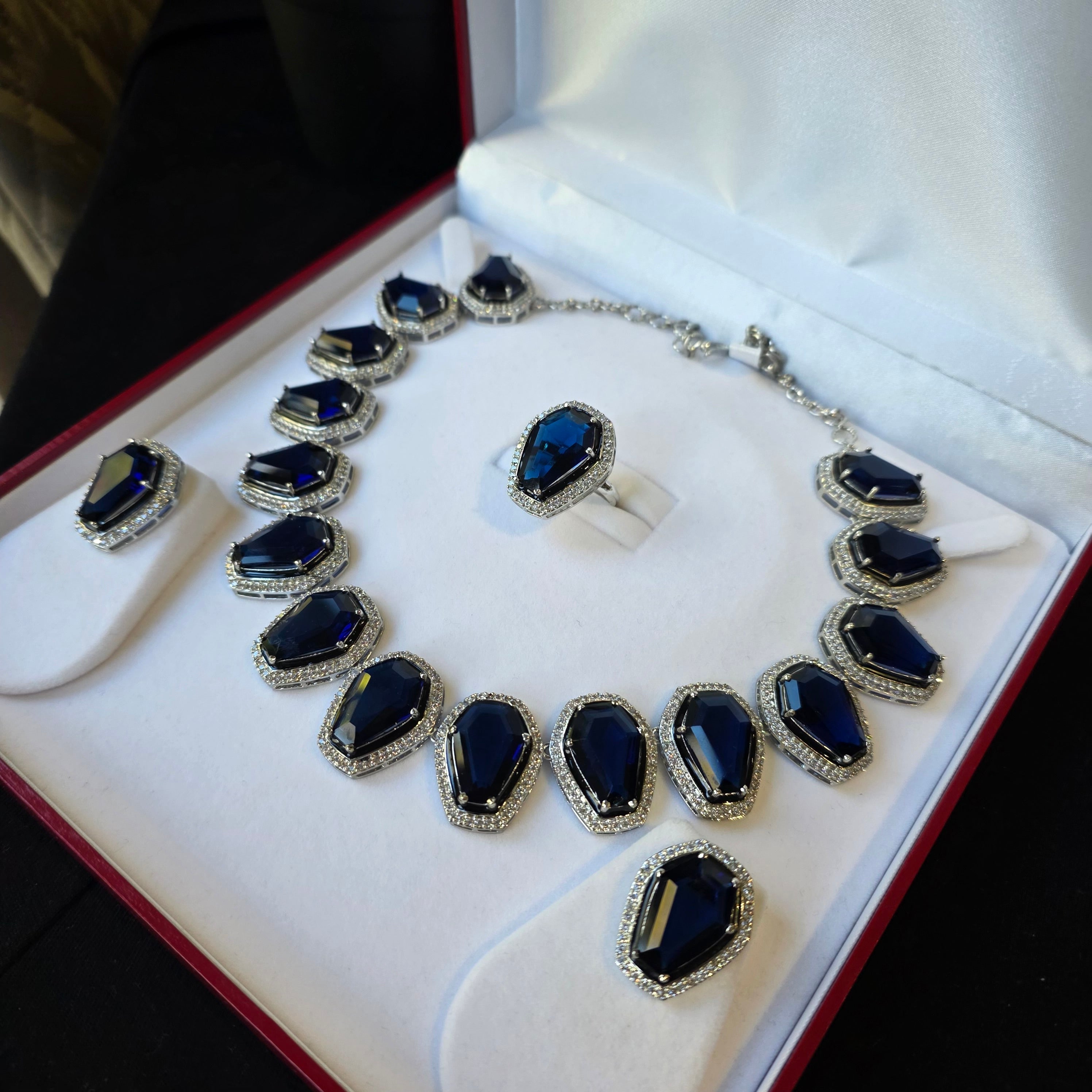 Introducing this Statement piece that boasts stunning Blue Sapphires (lab-made), complemented by matching Earrings and size adjustable Ring. Add a touch of elegance and sparkle to your look, perfect accessory to elevate any outfit! Unique make by fine artisans.