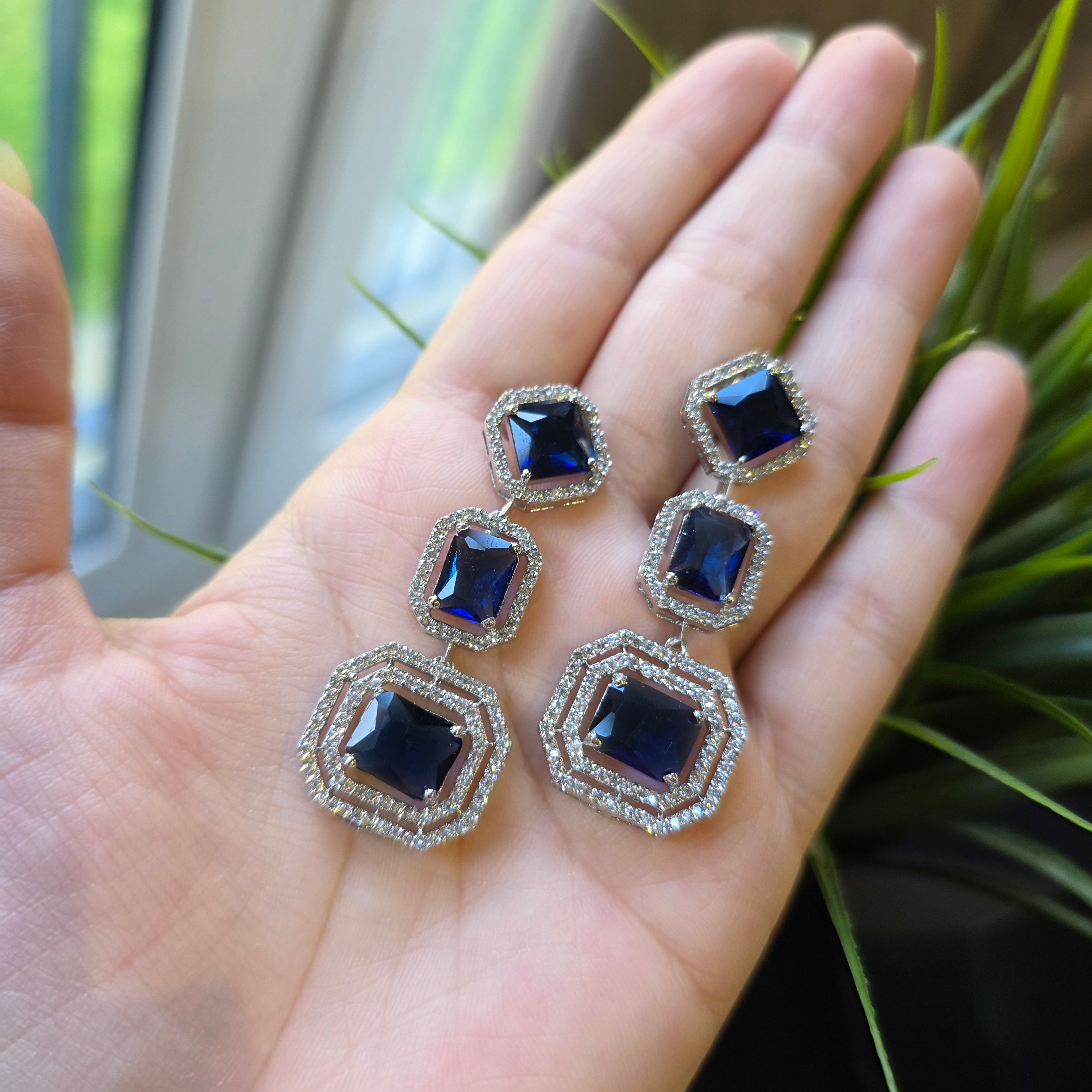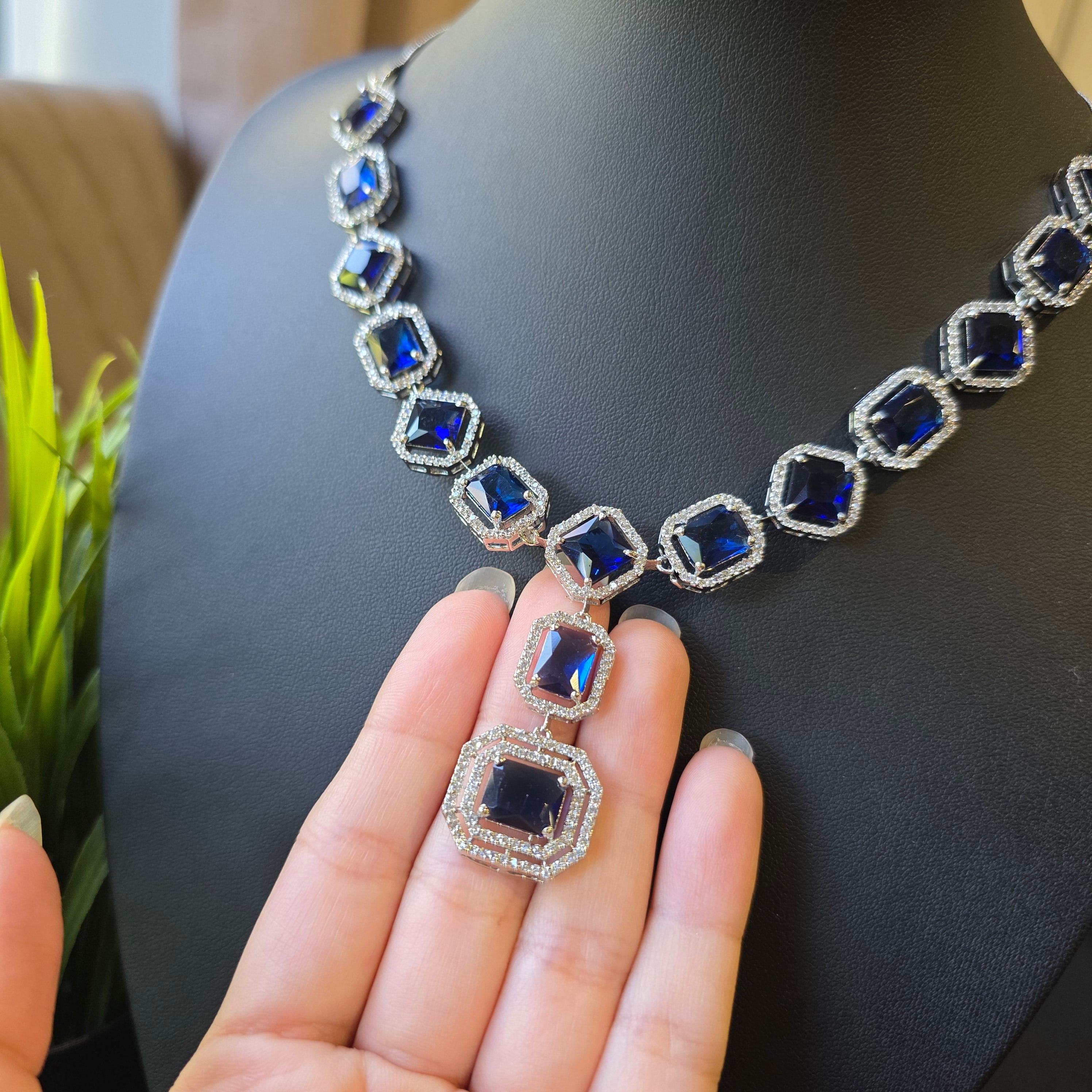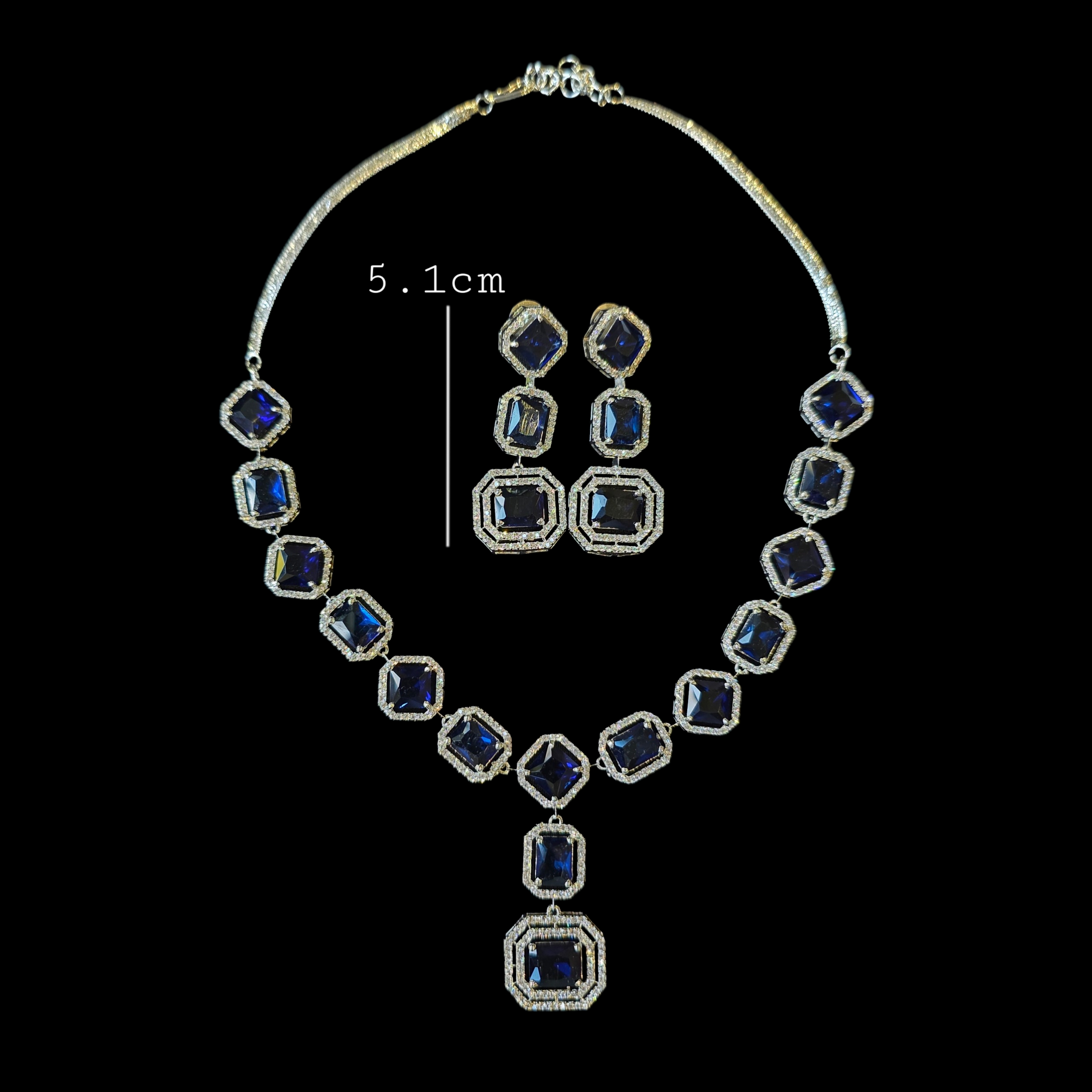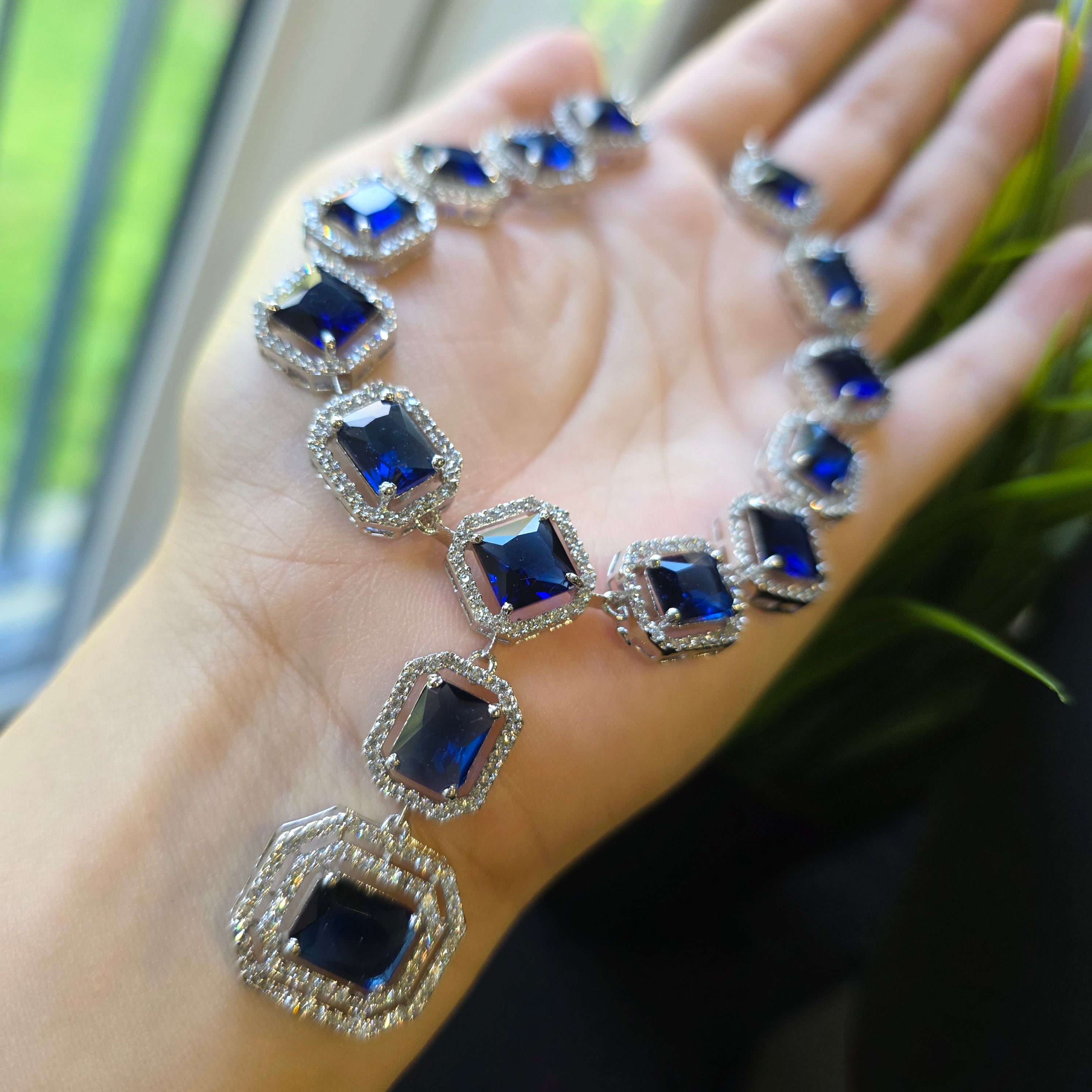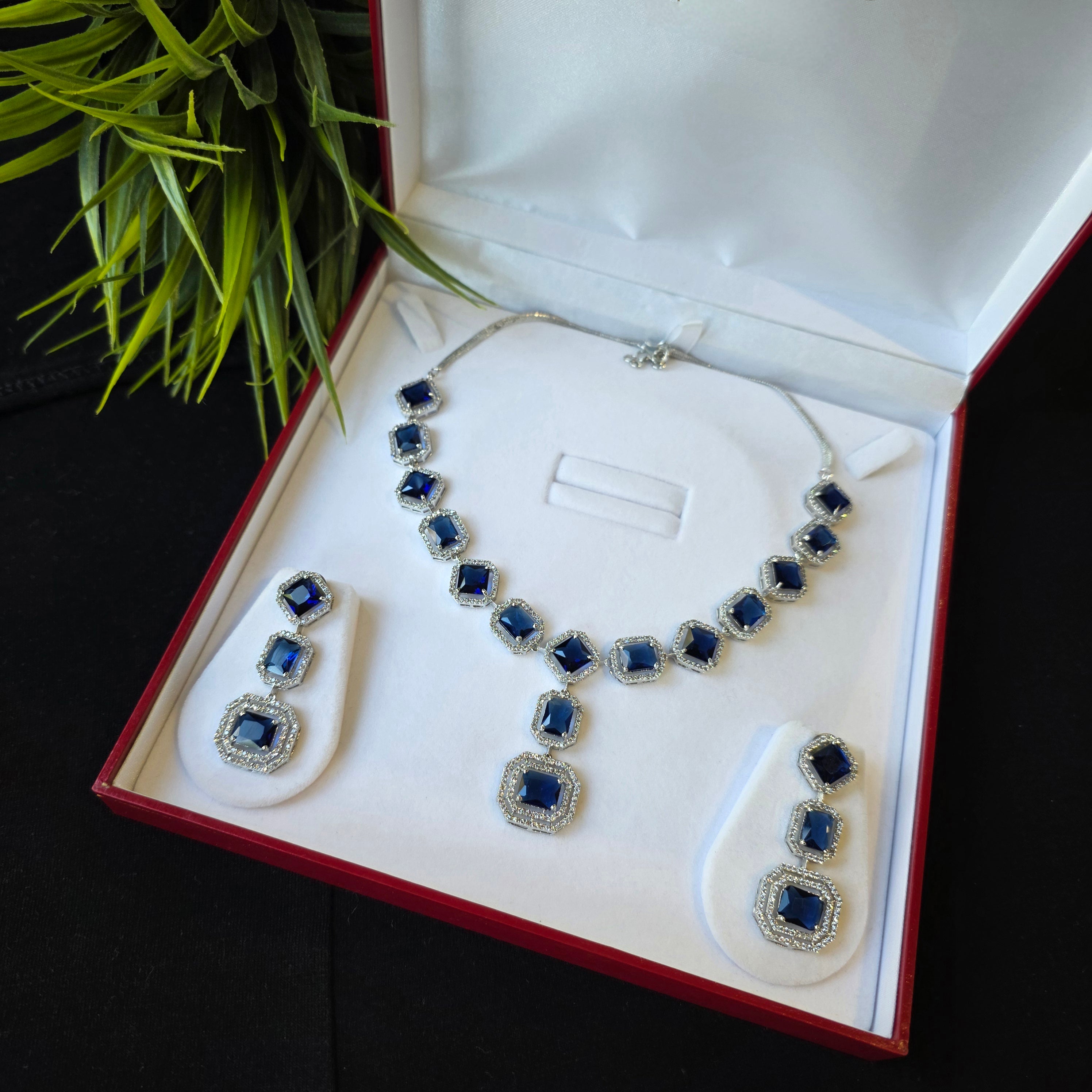 Introducing this exquisite piece that boasts stunning Blue Sapphires (lab-made) and Cubic Zirconia complemented by matching Earrings. Add a touch of elegance and sparkle to your look, perfect accessory to elevate any outfit!