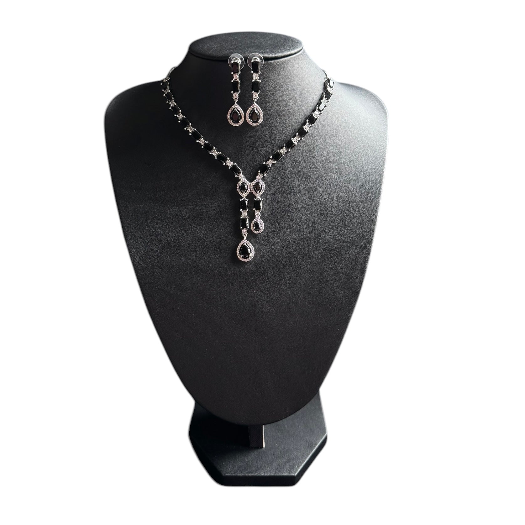 This striking lab-made black quartz necklace set features a bold black quartz gemstone, expertly crafted for a sleek, modern appearance. The dark stone is beautifully complemented by sparkling cubic zirconia accents, enhancing its elegance and brilliance. Plated in white gold, the set offers a luxurious finish with durability and a timeless shine. Perfect for adding a sophisticated edge to both formal and casual outfits, this set embodies contemporary style and refined charm.