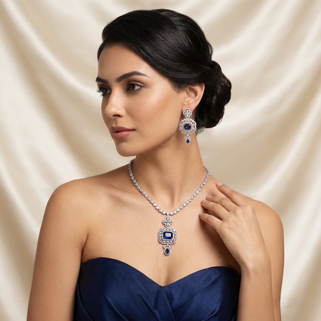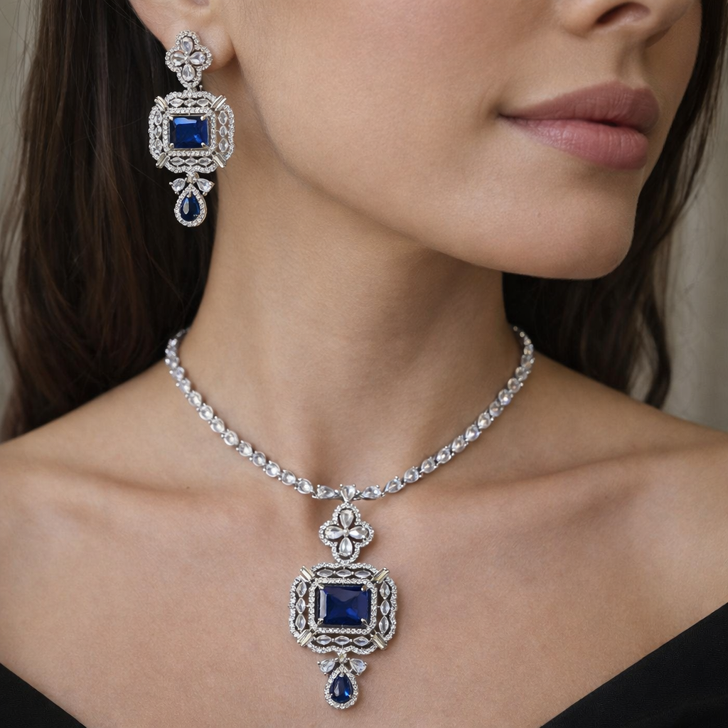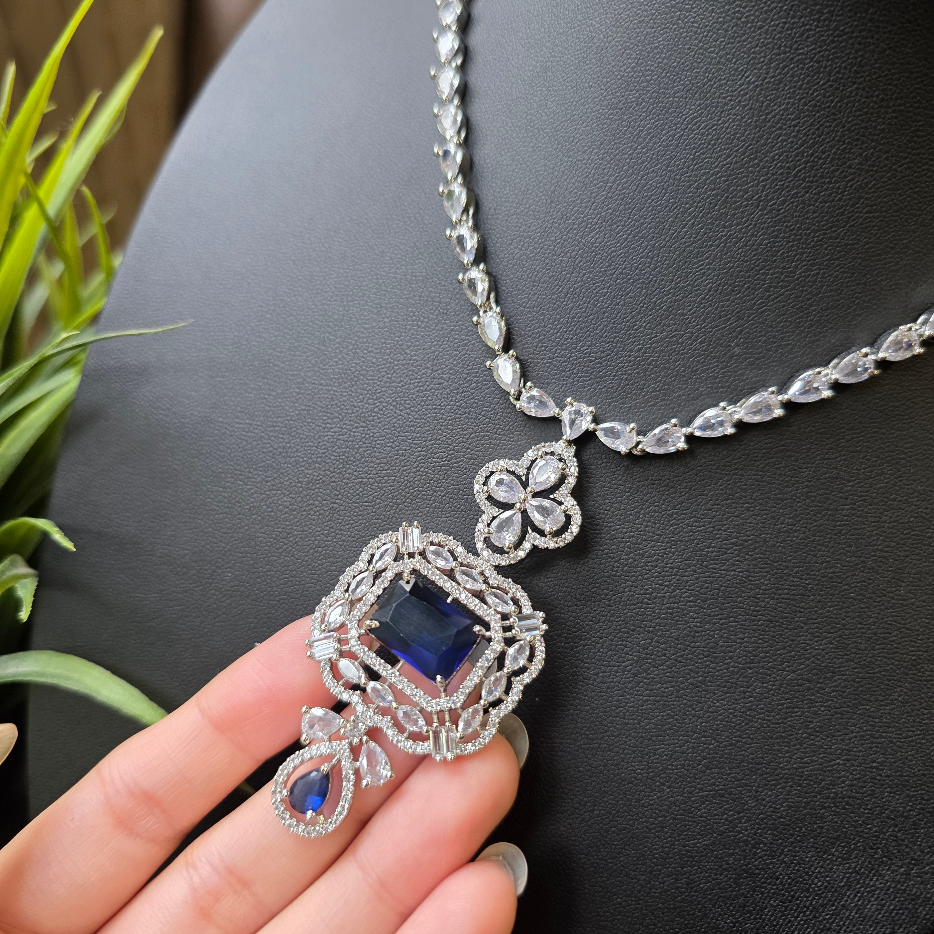• Design: A sophisticated necklace featuring a central blue sapphire pendant encased in cubic zirconia, with intricate detailing for a luxurious look.