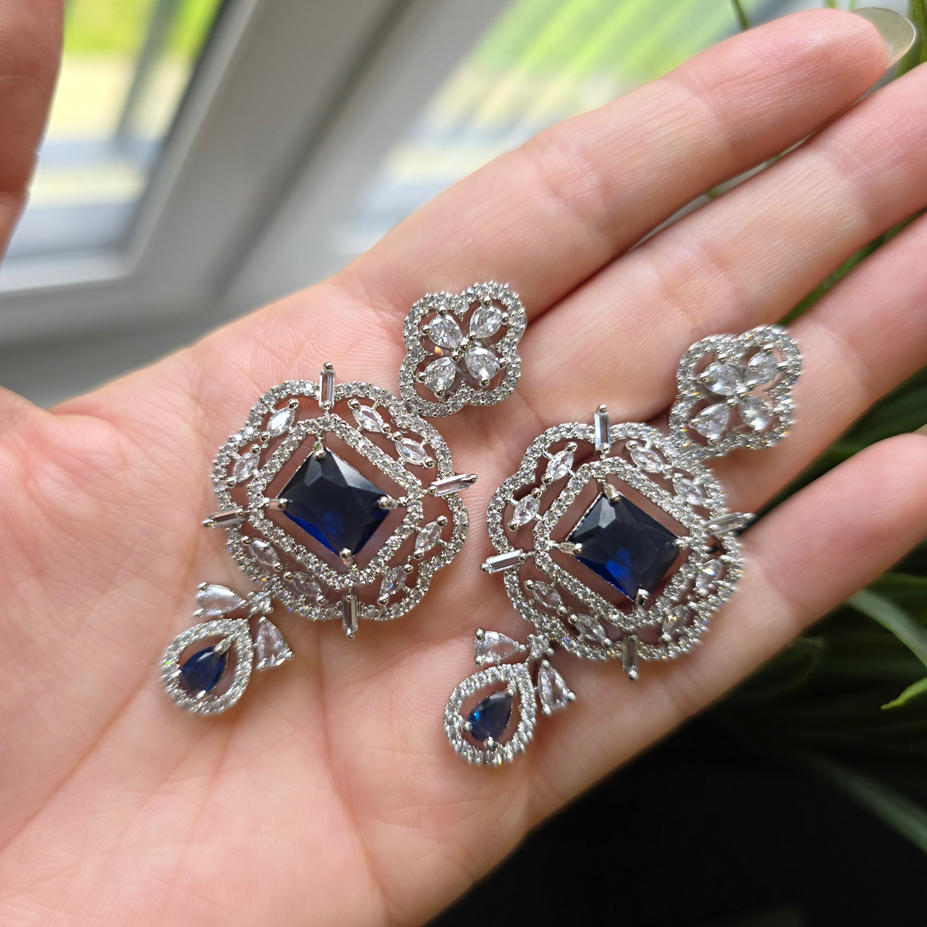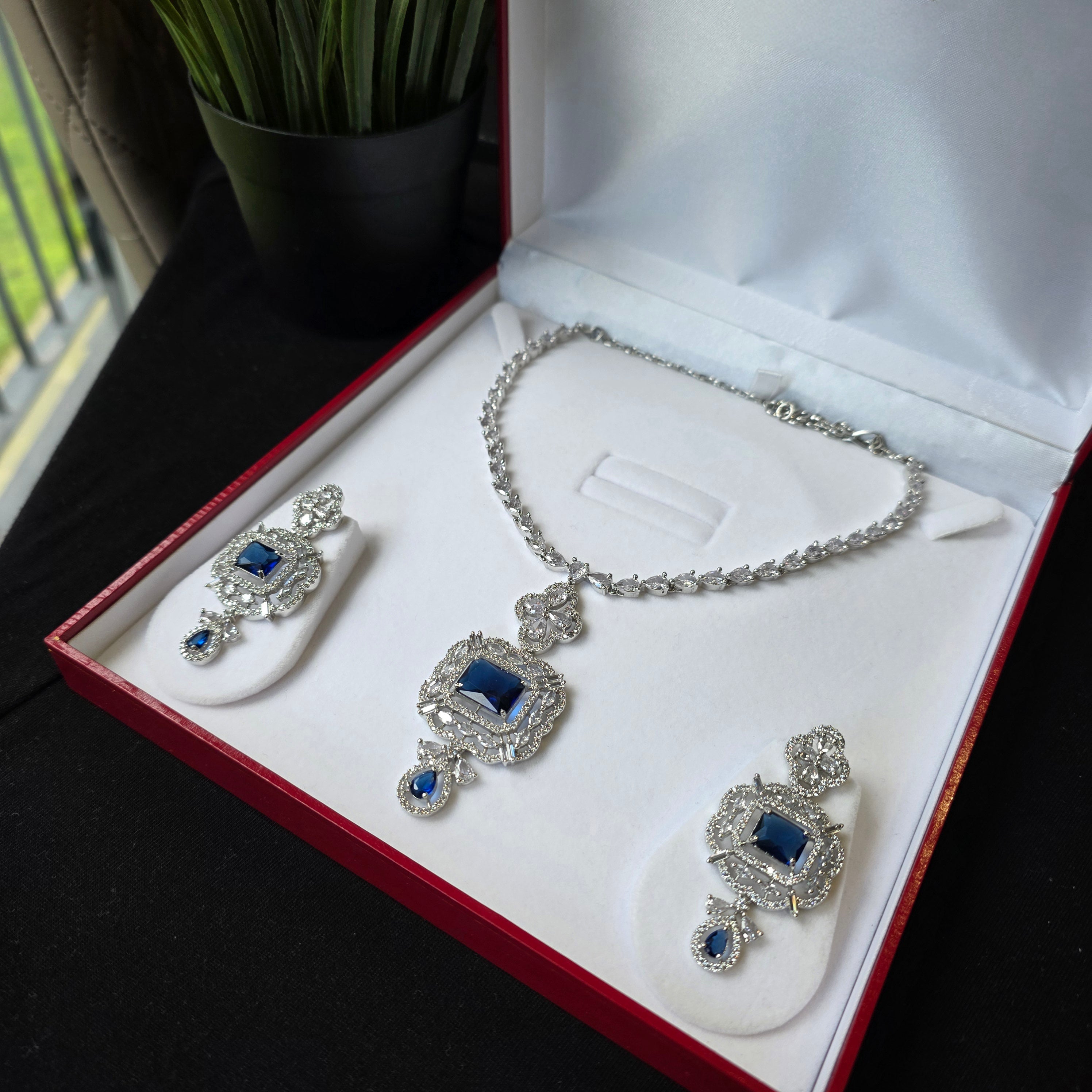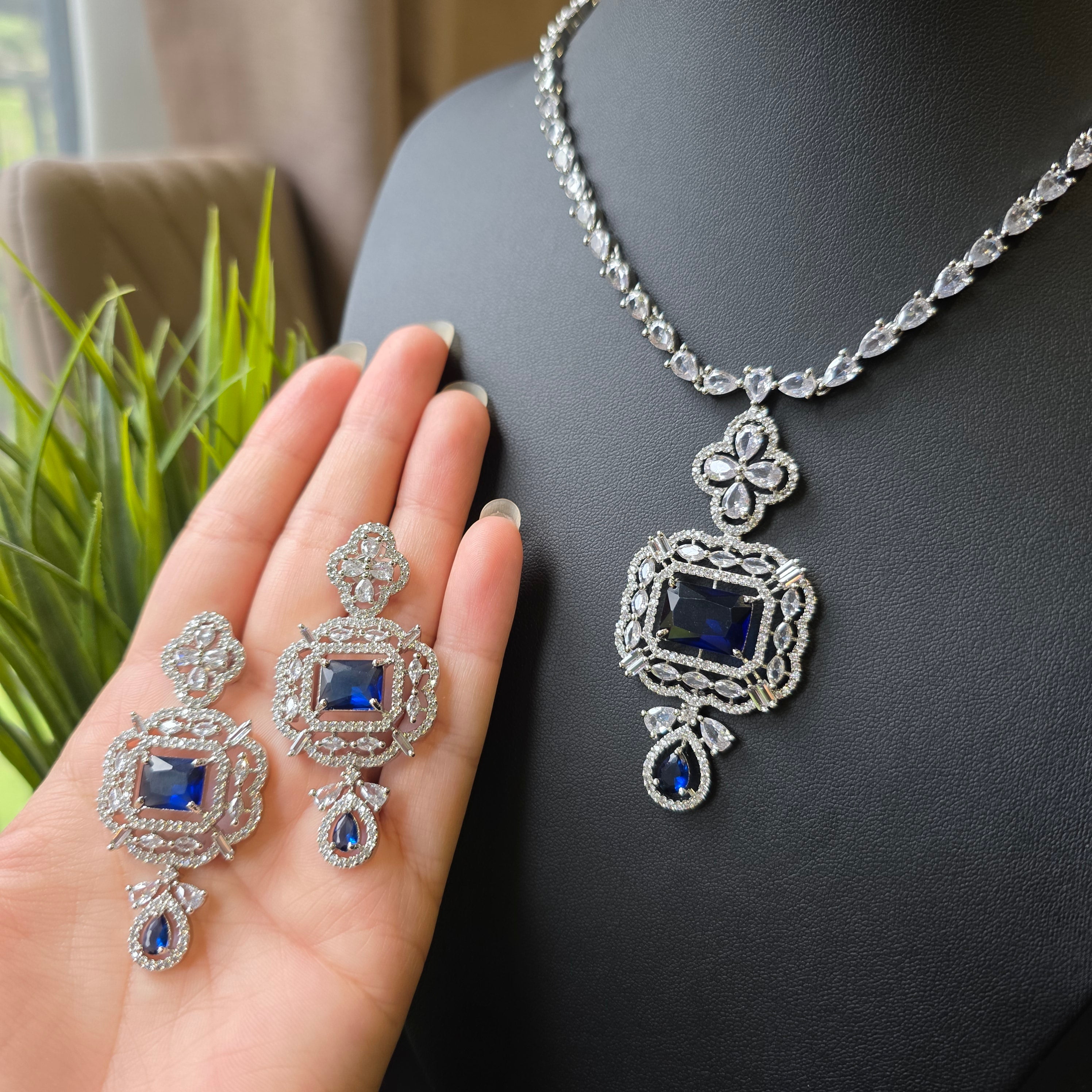 • Design: A sophisticated necklace featuring a central blue sapphire pendant encased in cubic zirconia, with intricate detailing for a luxurious look.