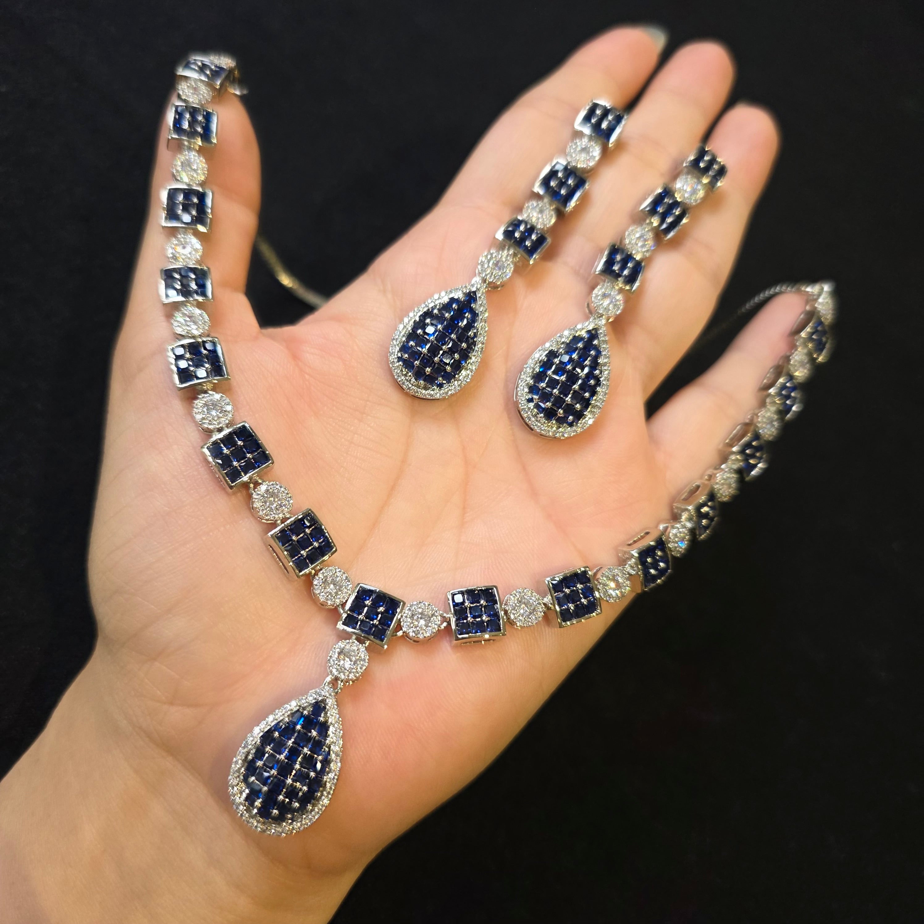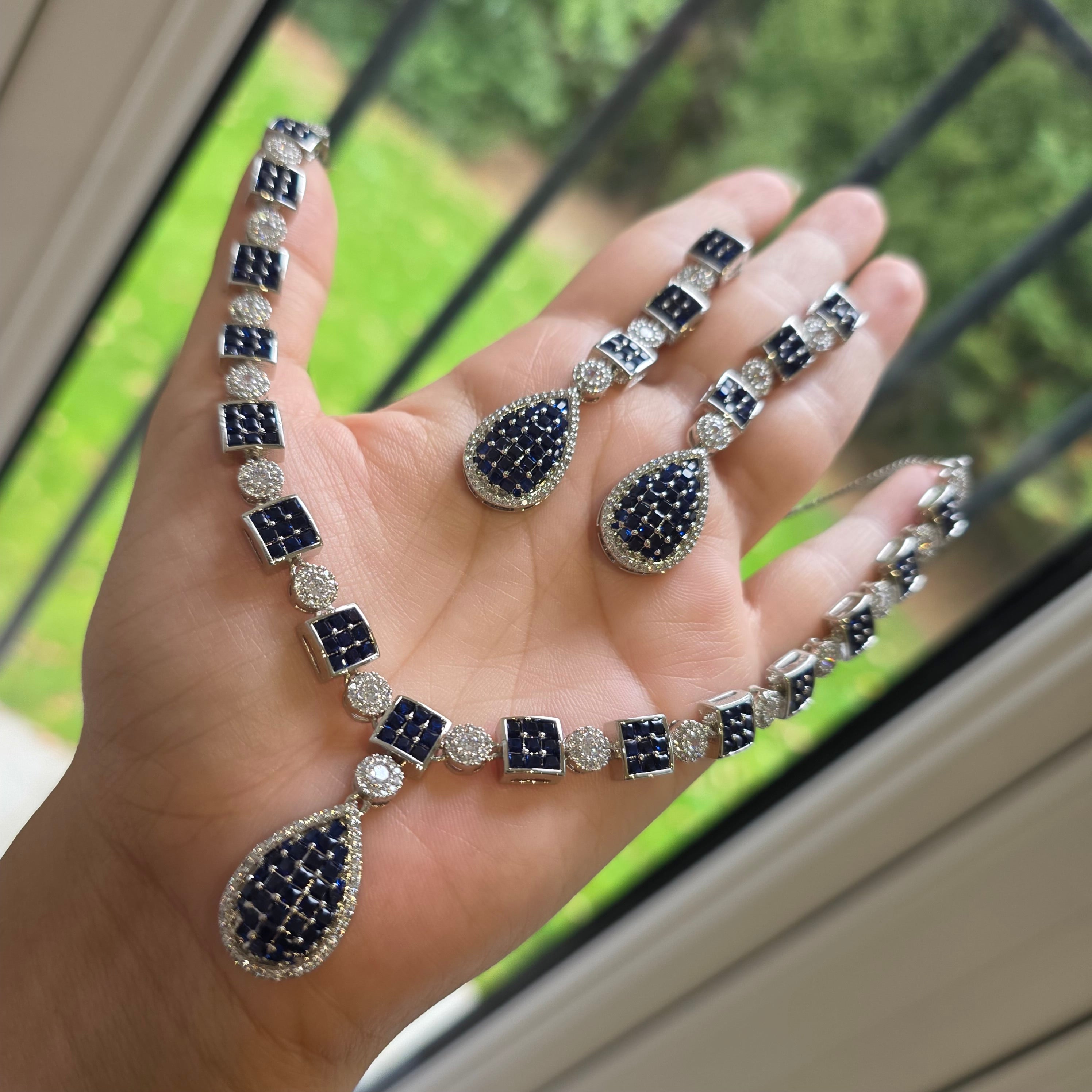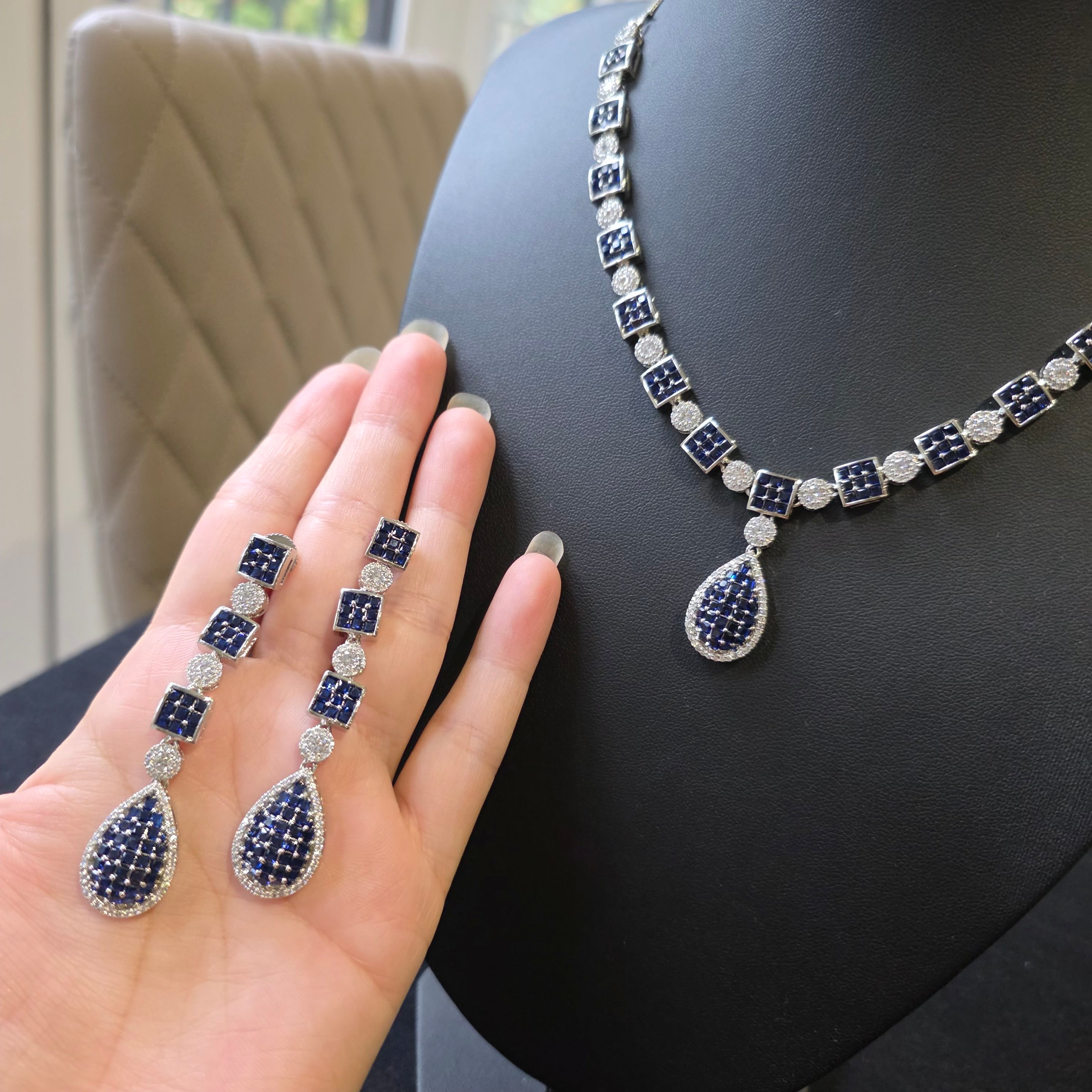 Embrace timeless elegance with this stunning blue sapphire necklace and earring set. Featuring deep, royal blue sapphires , each piece is accented with sparkling cubic zirconia that adds brilliance and contrast. Set in sleek white gold plating, the design offers a sophisticated, polished finish perfect for both special occasions and everyday glamour.
