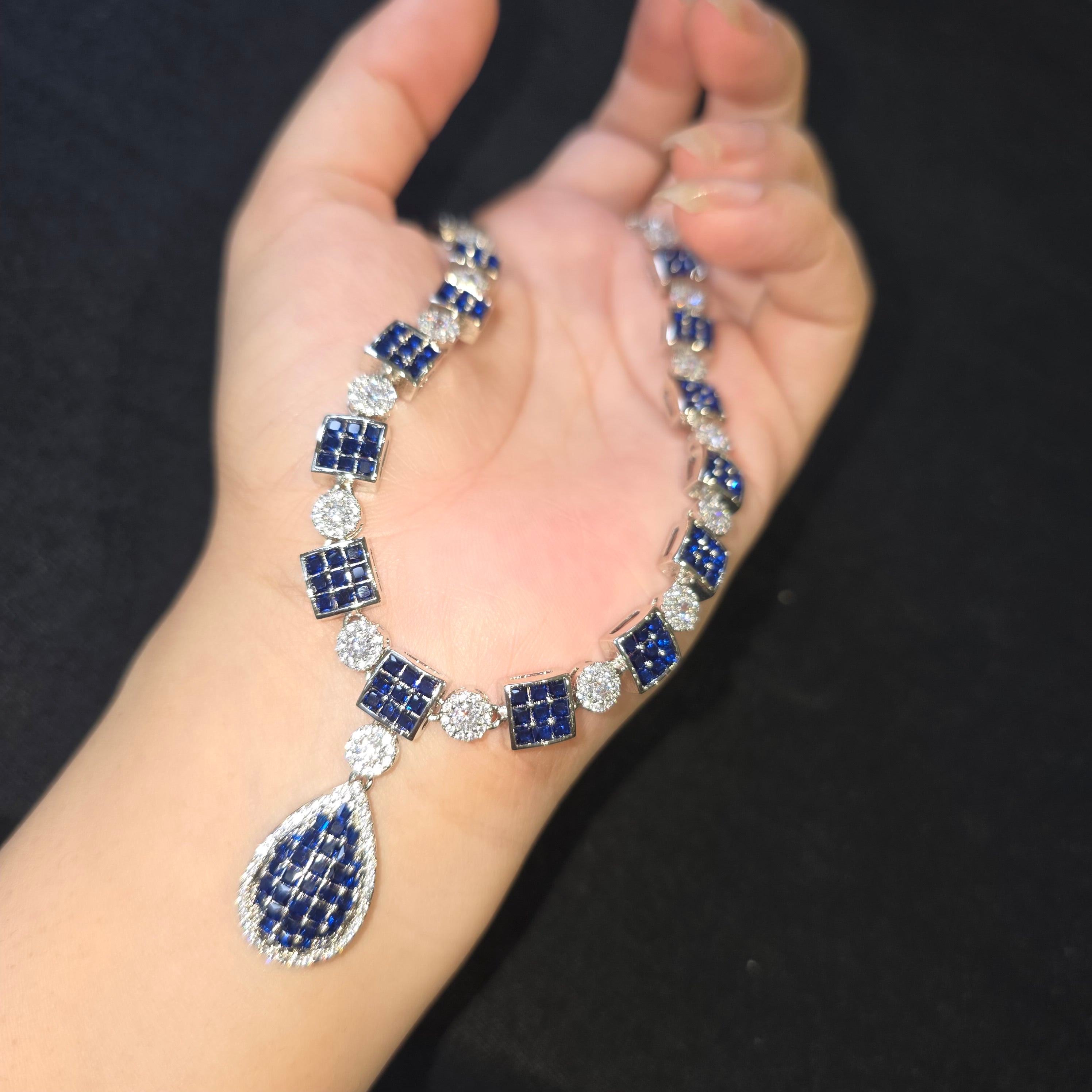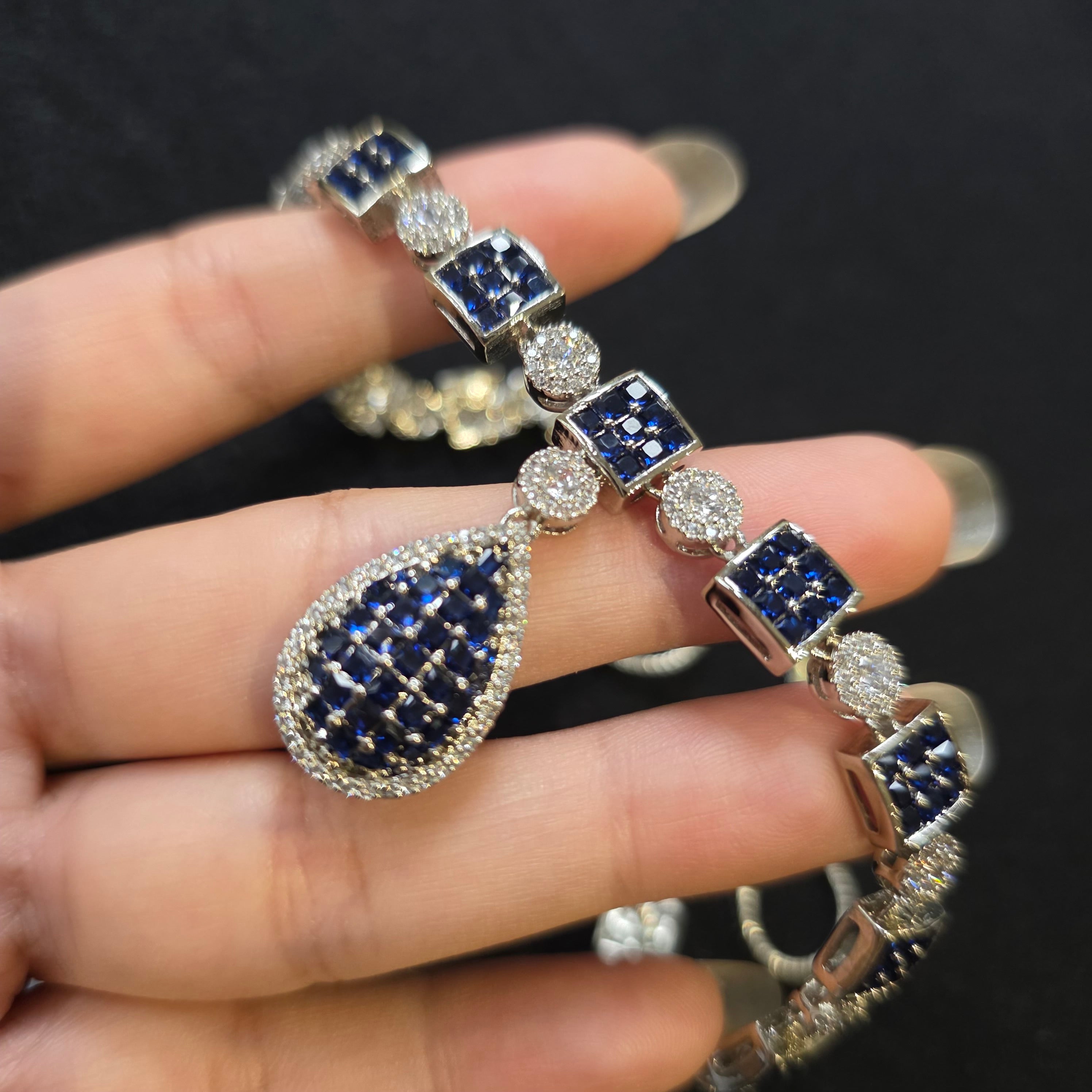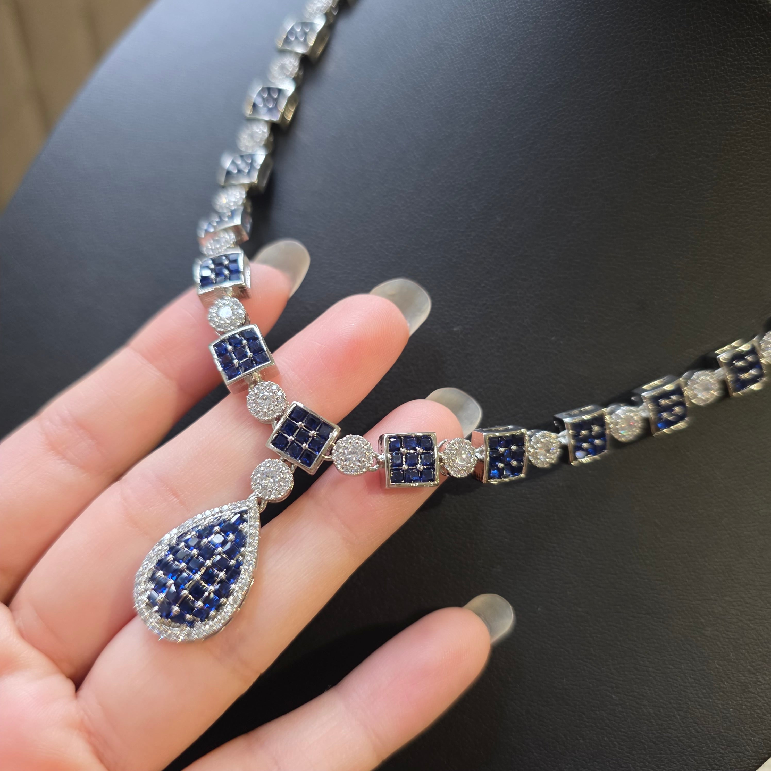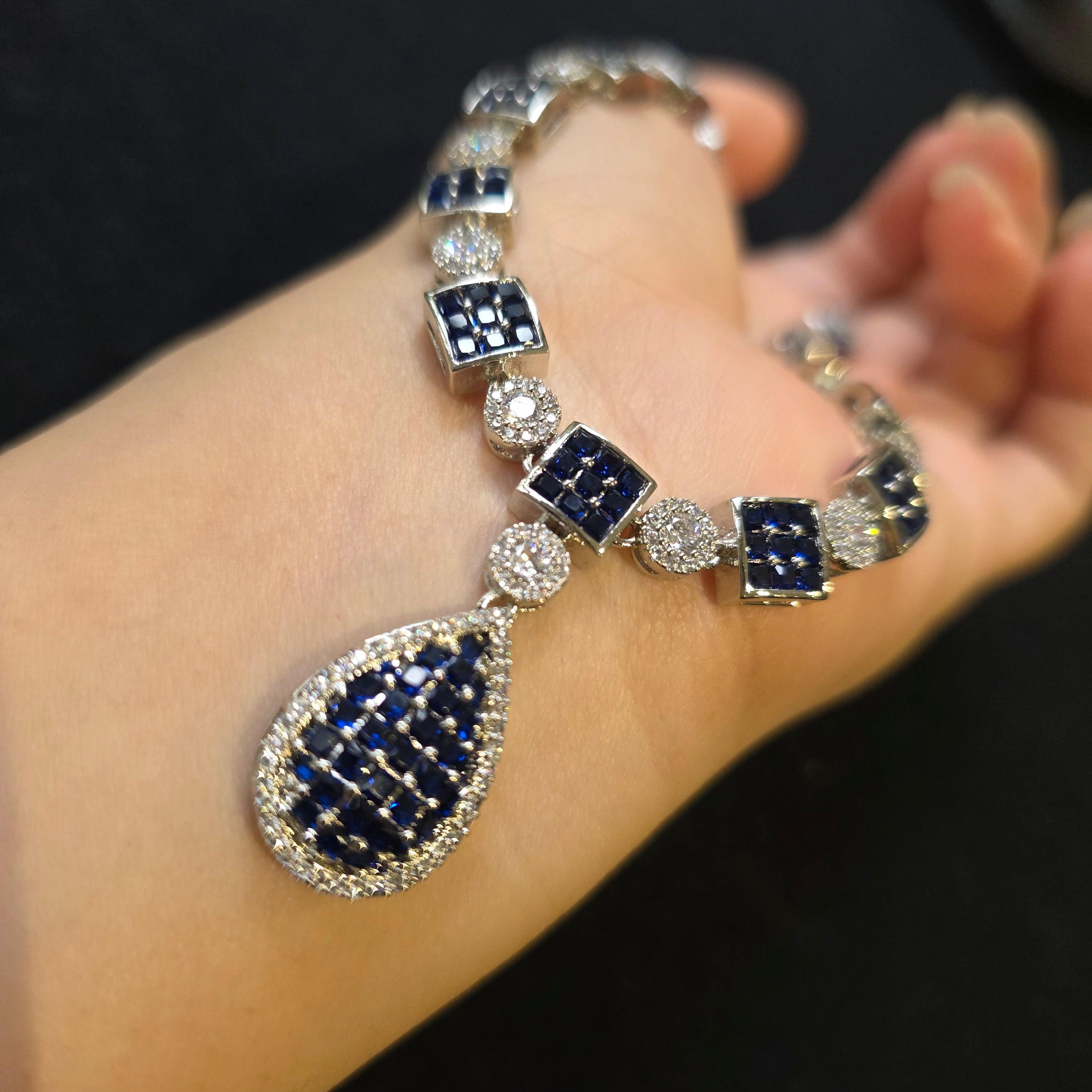 Embrace timeless elegance with this stunning blue sapphire necklace and earring set. Featuring deep, royal blue sapphires , each piece is accented with sparkling cubic zirconia that adds brilliance and contrast. Set in sleek white gold plating, the design offers a sophisticated, polished finish perfect for both special occasions and everyday glamour.