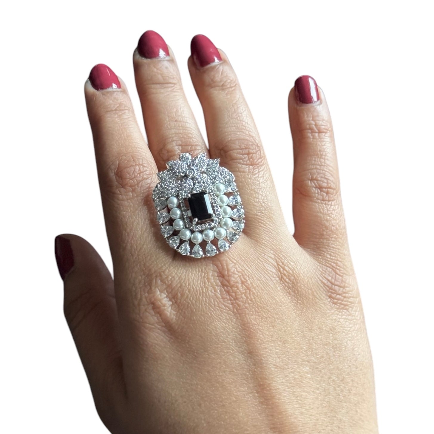 Graceful and versatile, this adjustable ring features a lab-grown blue sapphire at its center—radiating rich, royal charm. Sparkling cubic zirconia accents and luminous pearls beautifully complement the design, adding layers of elegance and sophistication. Finished in white gold plating, this ring offers both luxury and comfort with its adjustable band, ensuring a perfect fit for any finger. A refined statement piece that blends modern craftsmanship with timeless beauty.