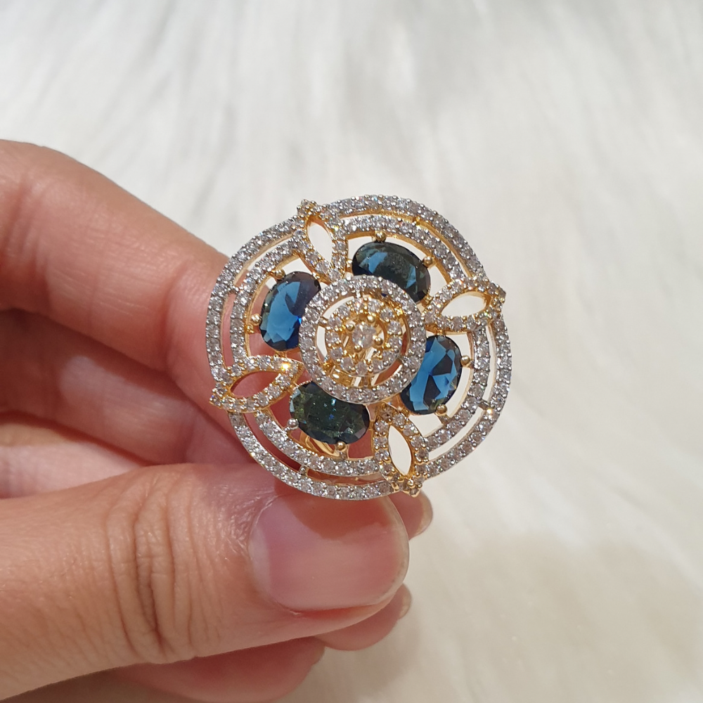 Yellow Gold and Rhodium Plated Size Adjustable Ring with Blue Sapphires and Cubic Zirconia.