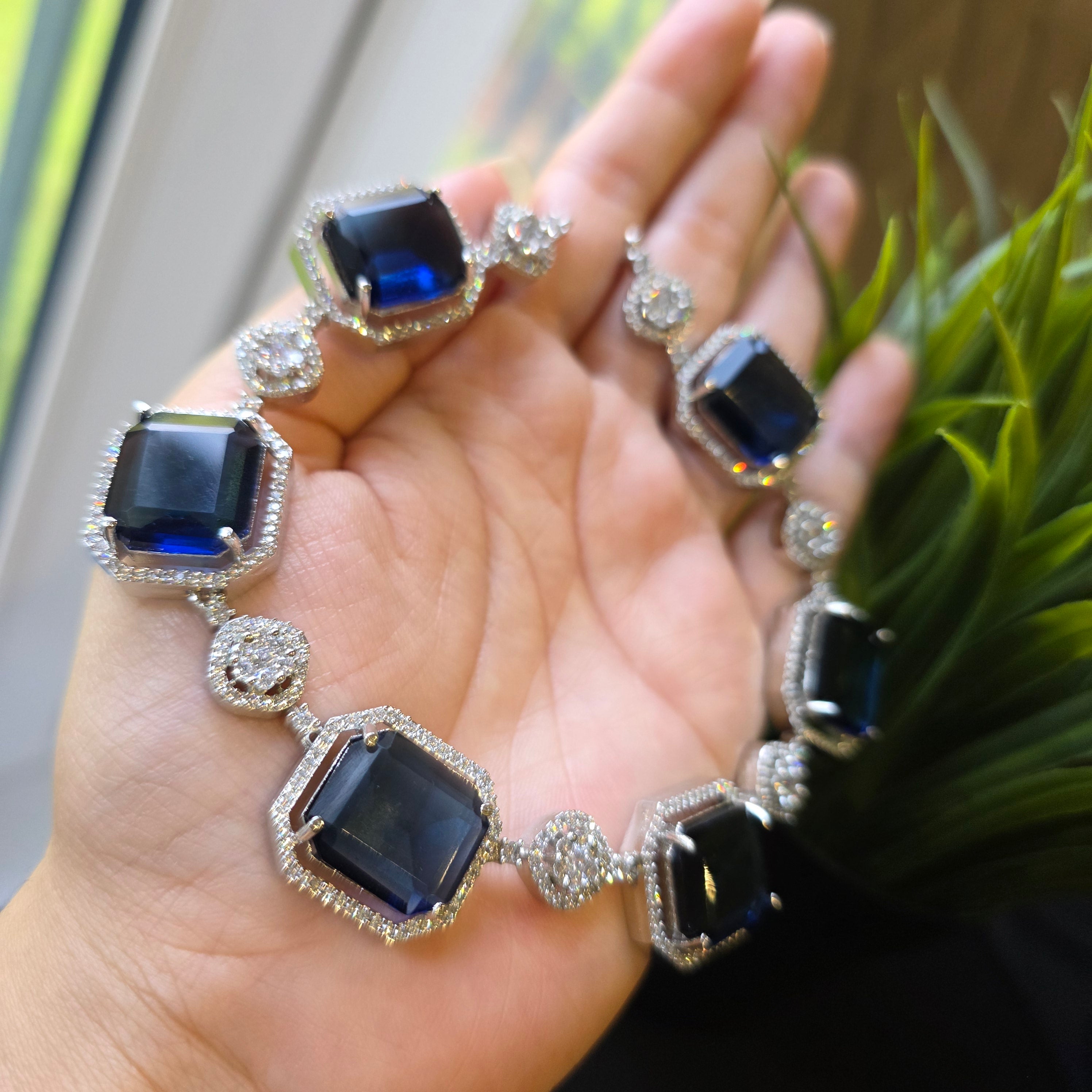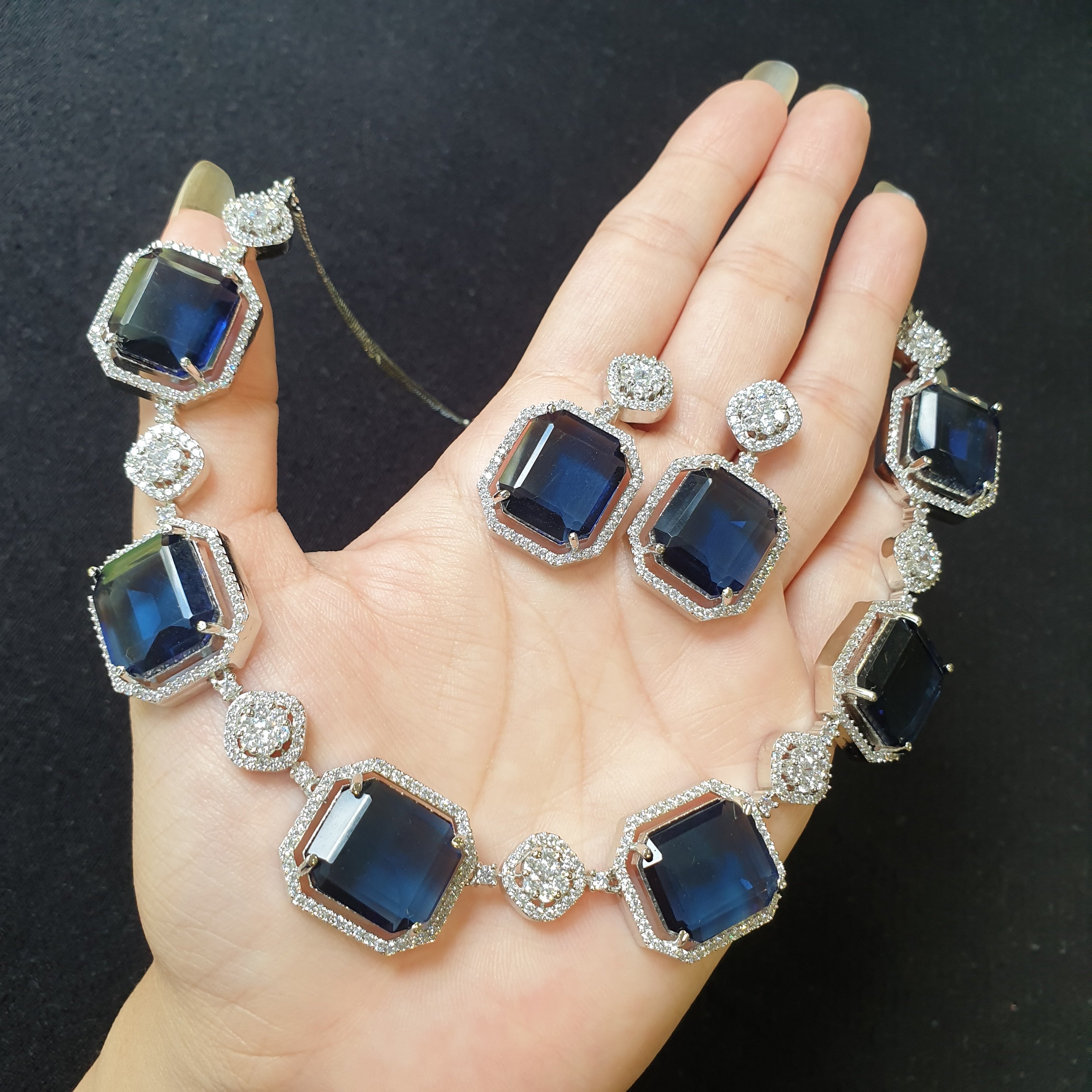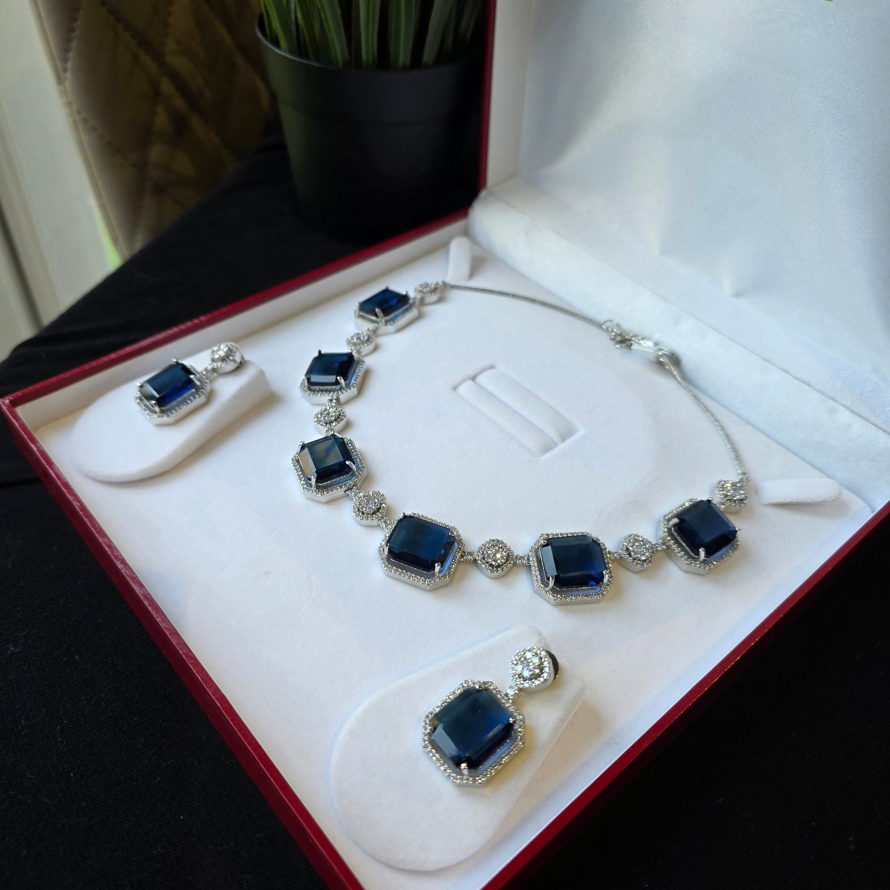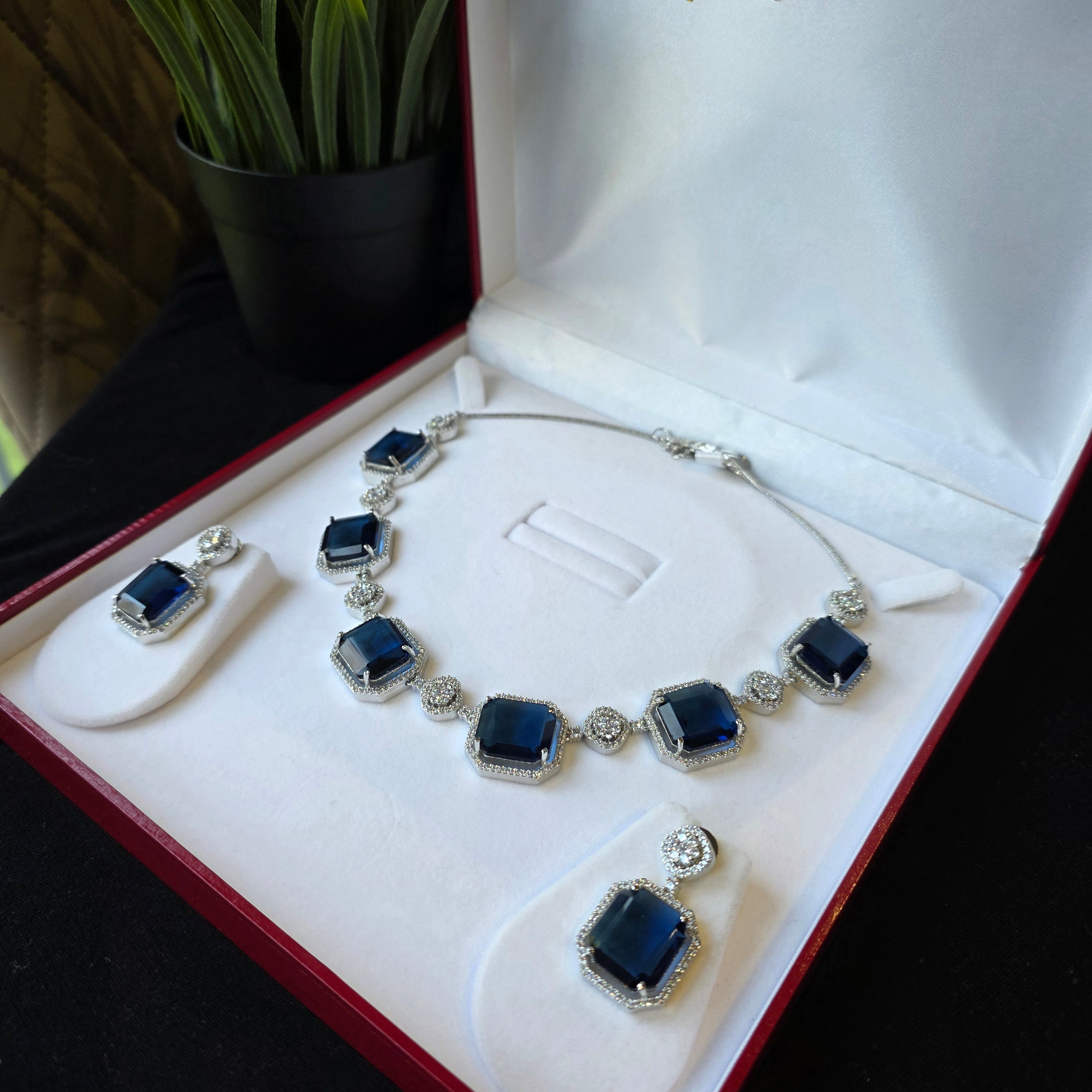 Add a touch of regal elegance with this exquisite necklace set, designed with an array of lab-grown blue sapphires that shimmer with a rich, velvety hue. Each sapphire is beautifully complemented by sparkling cubic zirconia accents, creating a harmonious balance of color and brilliance.