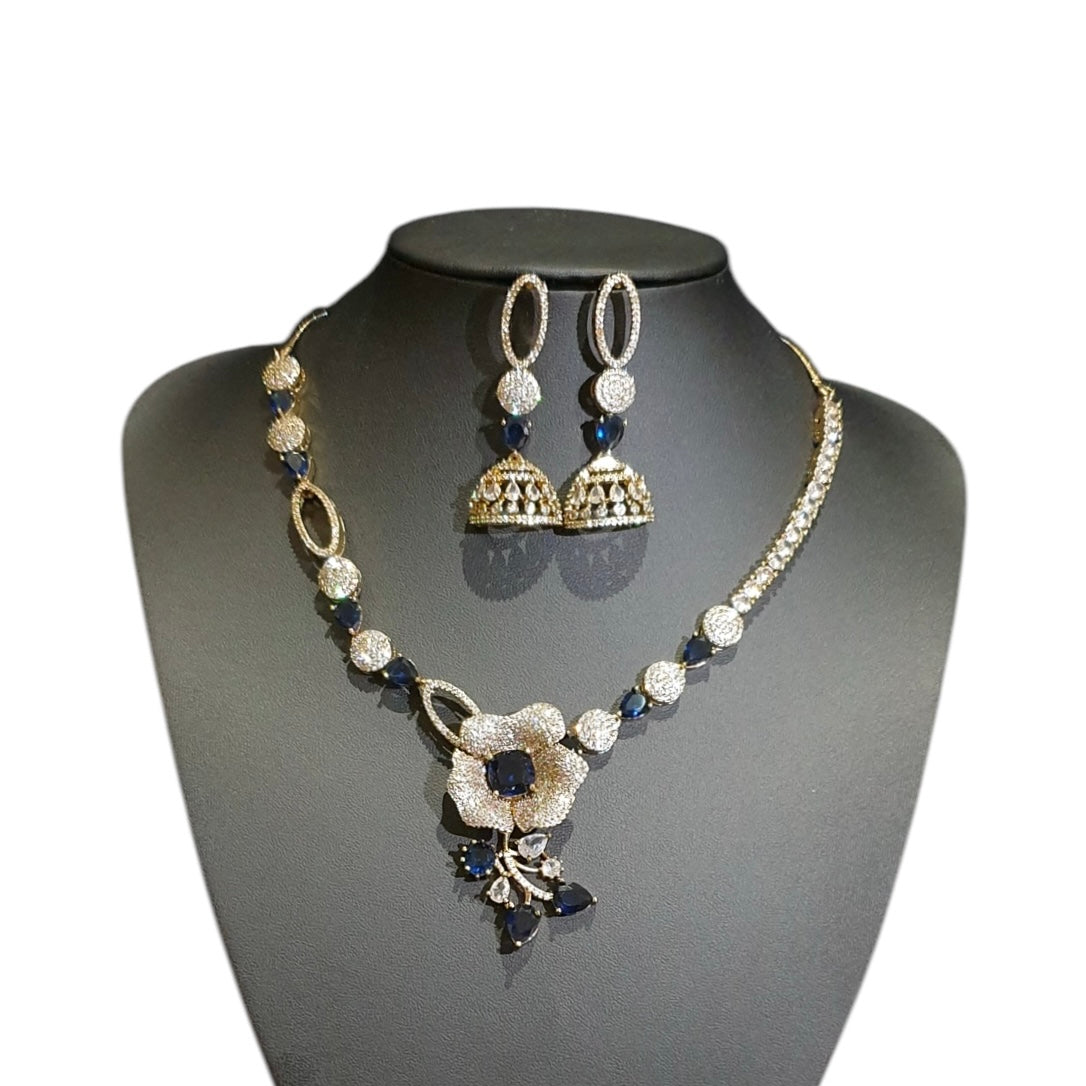 This elegant necklace set features stunning lab-grown blue sapphires, carefully set in a beautiful two-tone gold-plated design. The rich, deep blue hue of the lab-grown sapphires exudes sophistication, while the two-tone gold plating adds a modern and luxurious touch. The intricate design enhances the natural brilliance of the gemstones, making it perfect for both everyday wear and special occasions. Timeless and elegant, this necklace set offers a refined, versatile piece that will complement any jewelry collection.