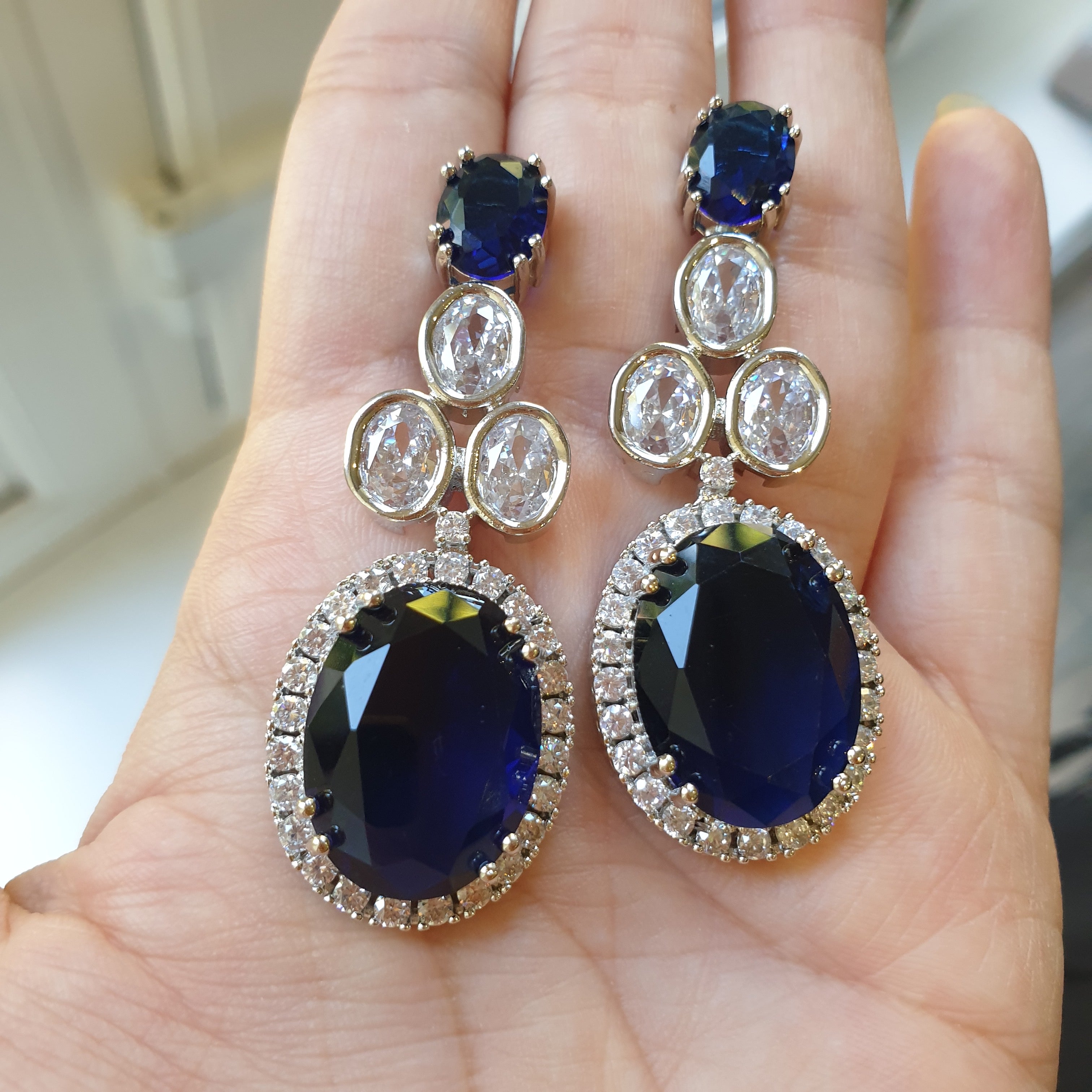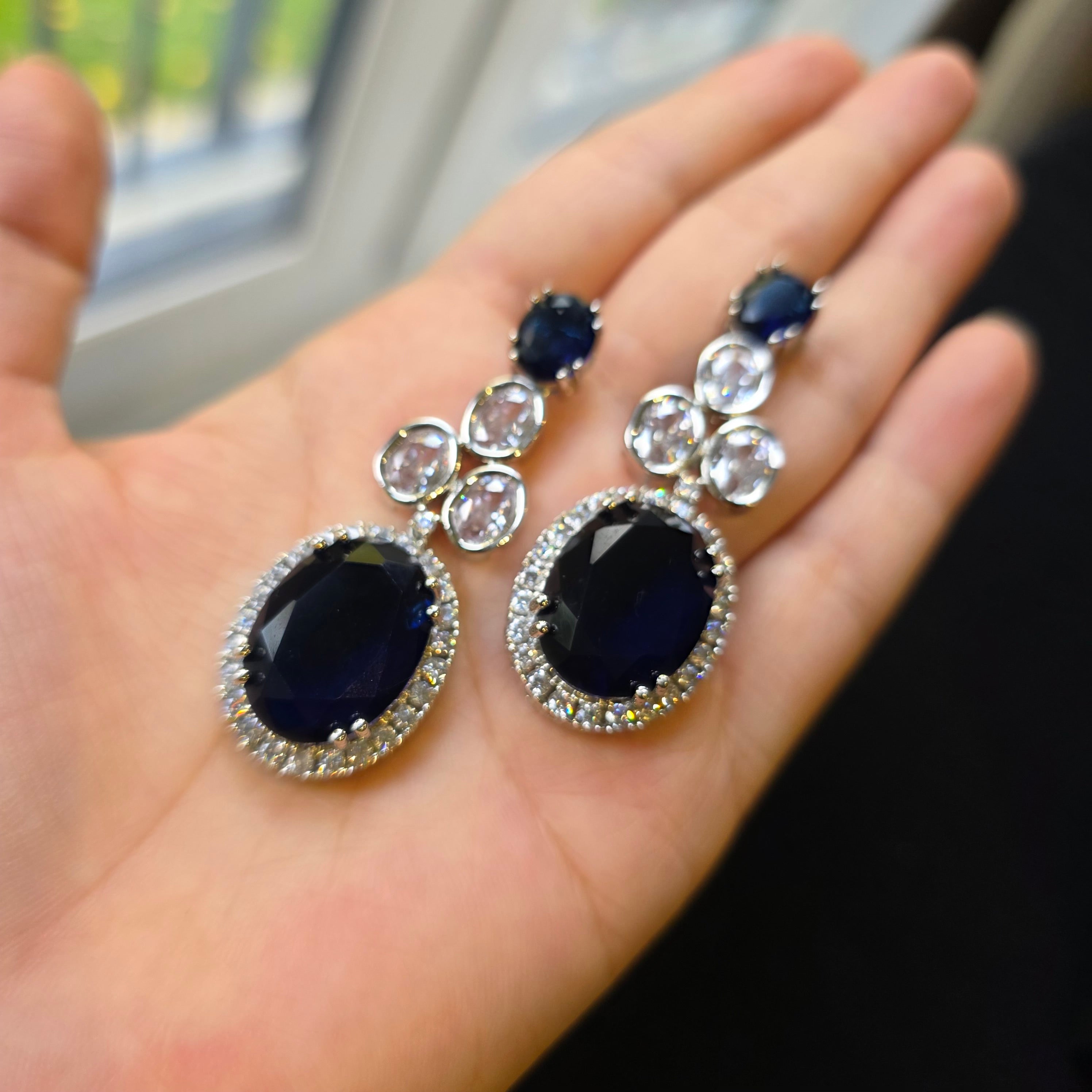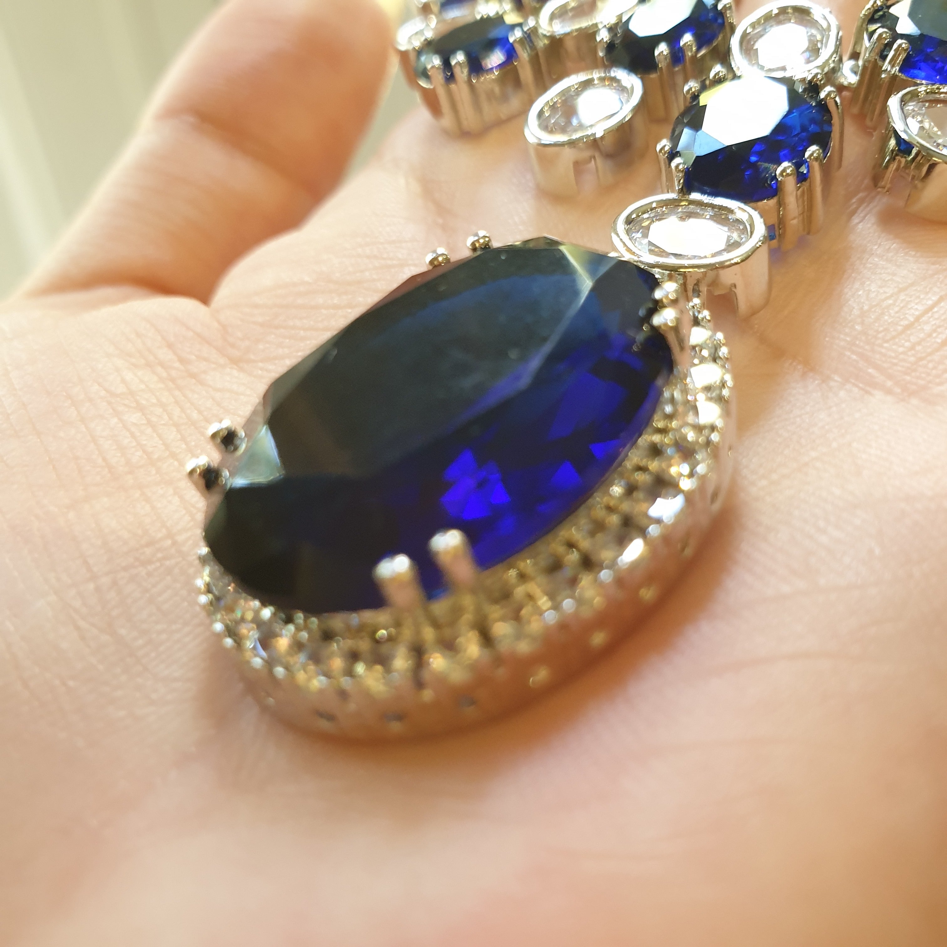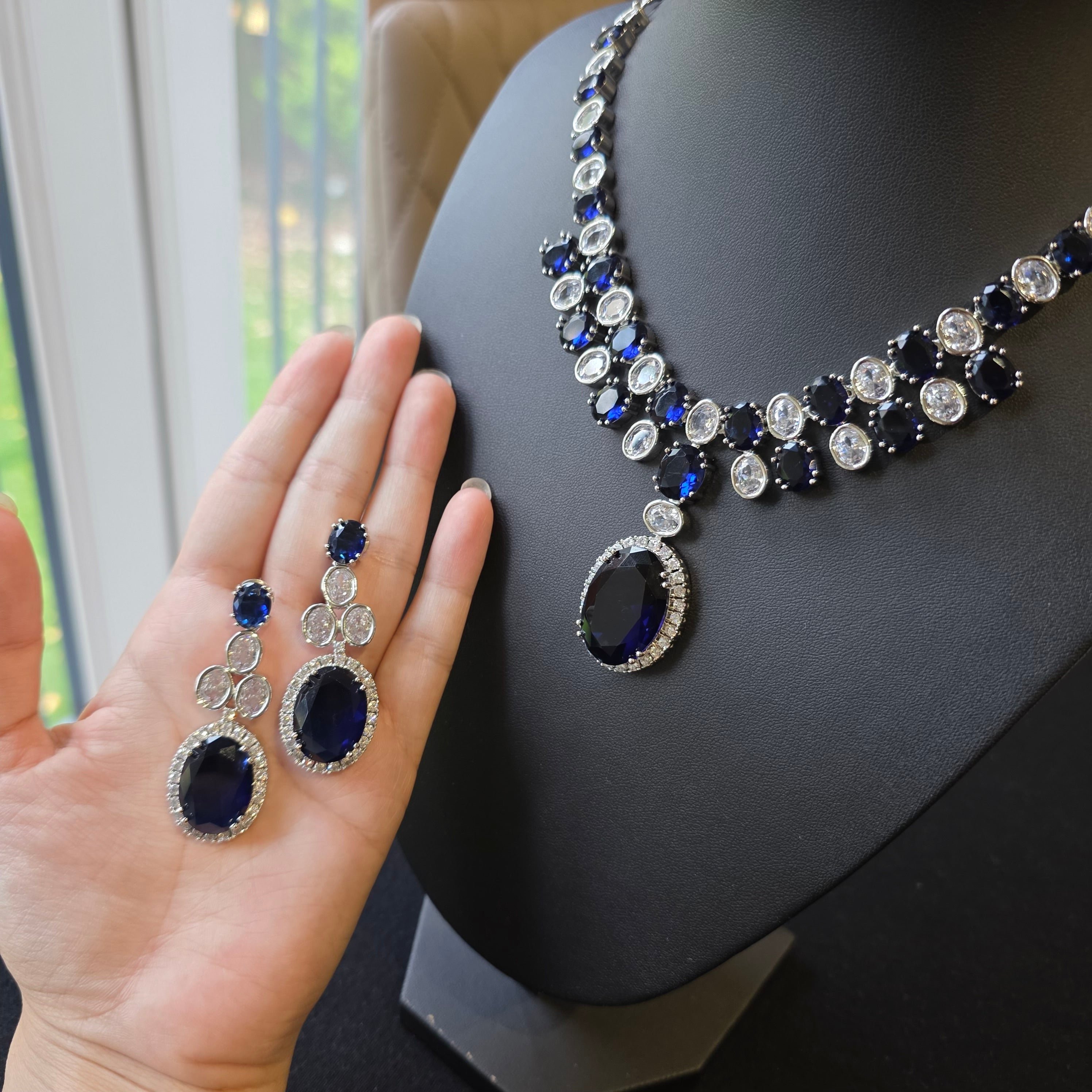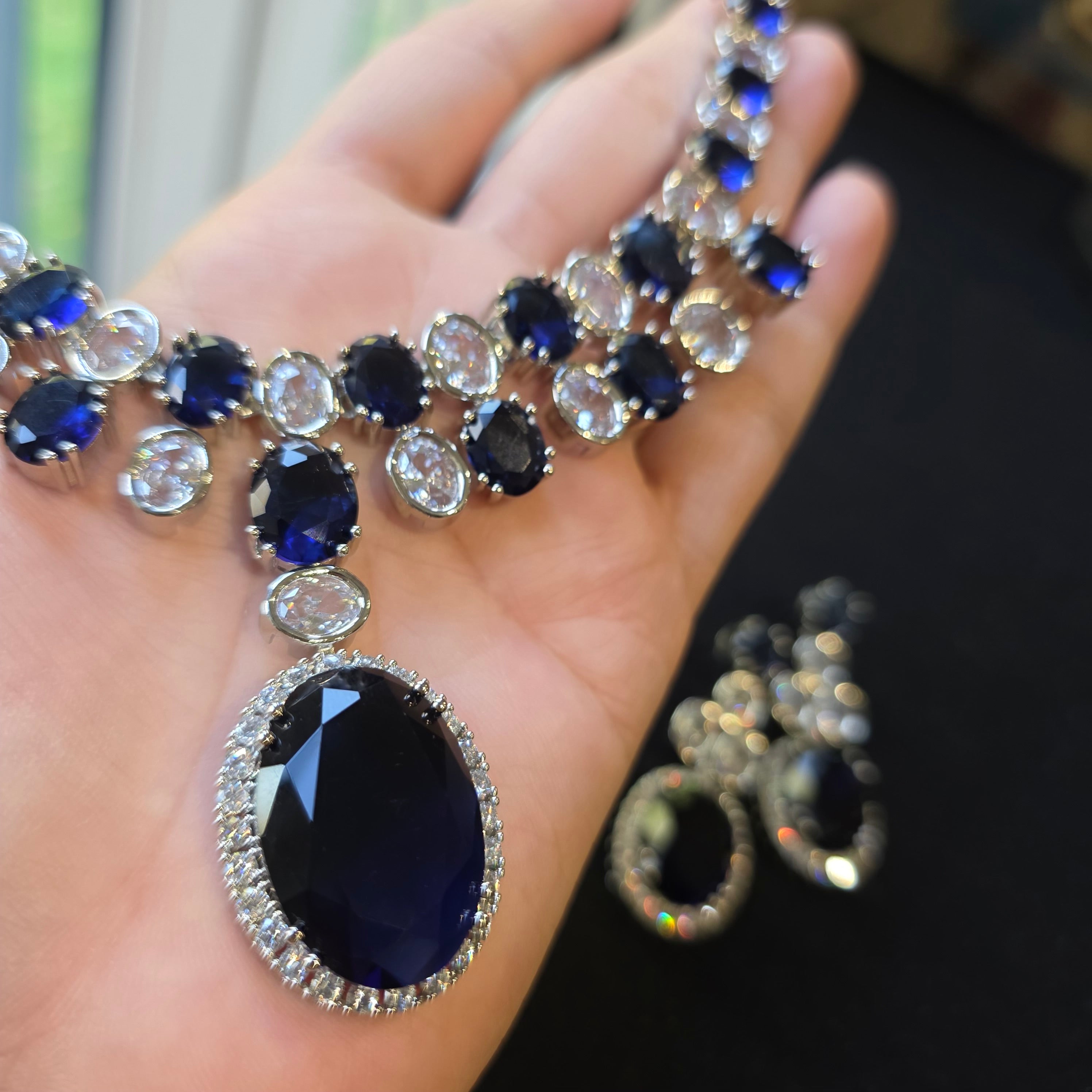 This breathtaking necklace set showcases lab-made blue sapphires, known for their deep, mesmerizing blue hues that symbolize elegance and sophistication. The sapphires are beautifully complemented by brilliant cubic zirconia stones, adding a touch of sparkle and refinement. Finished with a white gold-plated setting, the design exudes timeless charm and luxury.