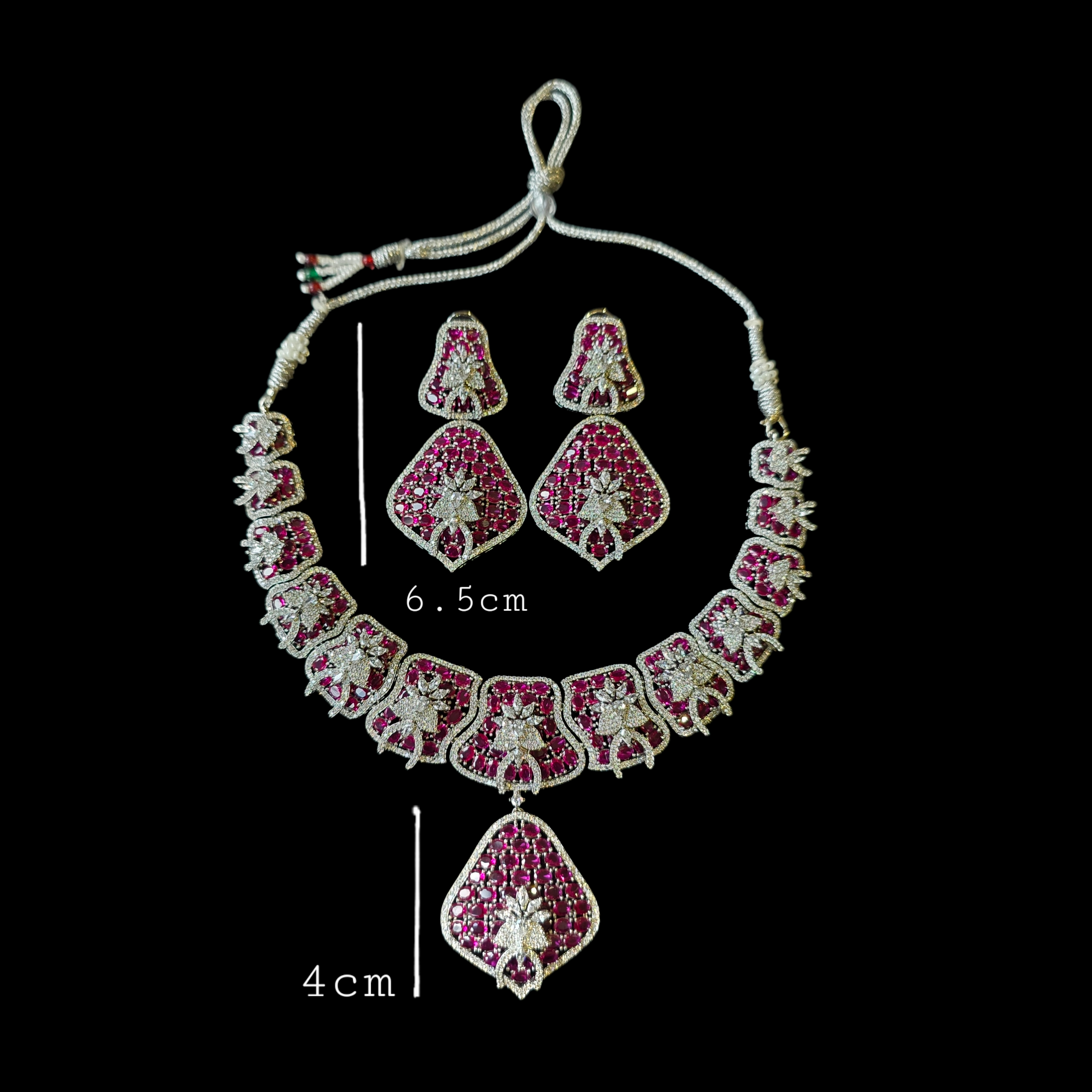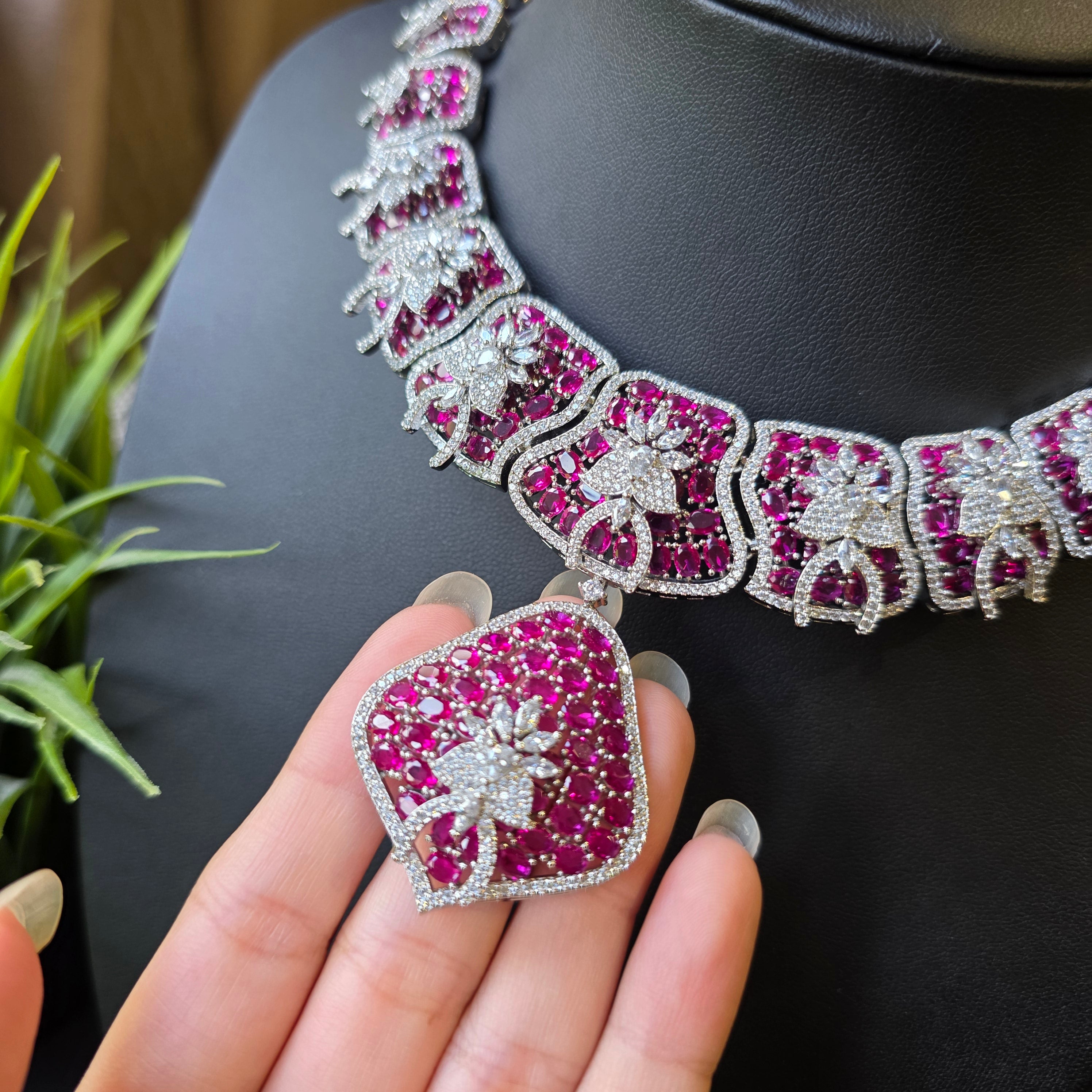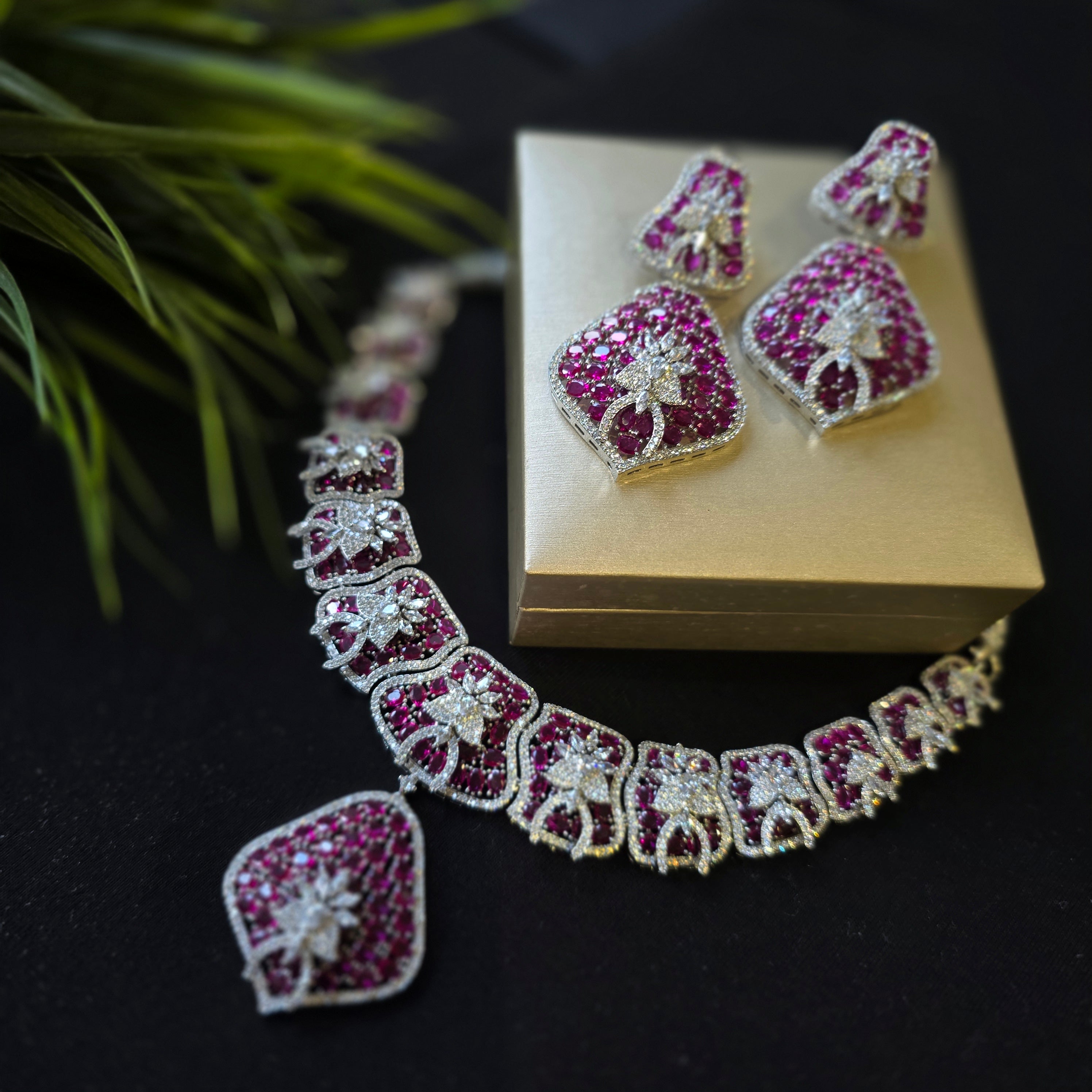 Introducing this Bold Statement one of a kind piece featuring Hot Pink Rubies (lab-made) and high quality CZ, complemented by matching Earrings. Add a touch of elegance and sparkle to your look.