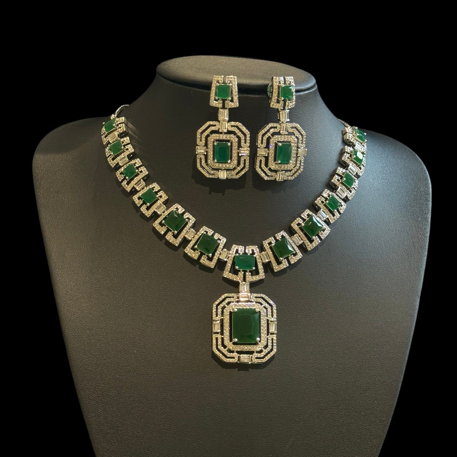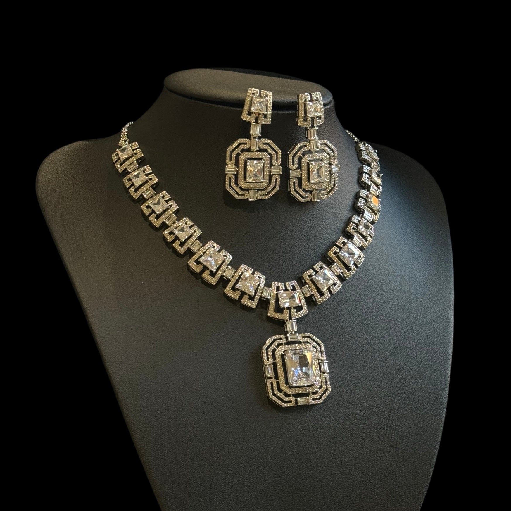 This elegant cubic zirconia necklace set features a stunning array of meticulously crafted stones that capture the light with brilliance, mimicking the sparkle of real diamonds. The necklace showcases a series of perfectly cut cubic zirconia gems arranged in a classic, yet modern design, offering timeless beauty and sophistication. Accompanying the necklace is a pair of matching earrings, each adorned with a single, radiant stone. The entire set is plated with a high-quality metal finish, ensuring durability and a luxurious appearance. Perfect for special occasions or adding a touch of glamour to everyday wear.