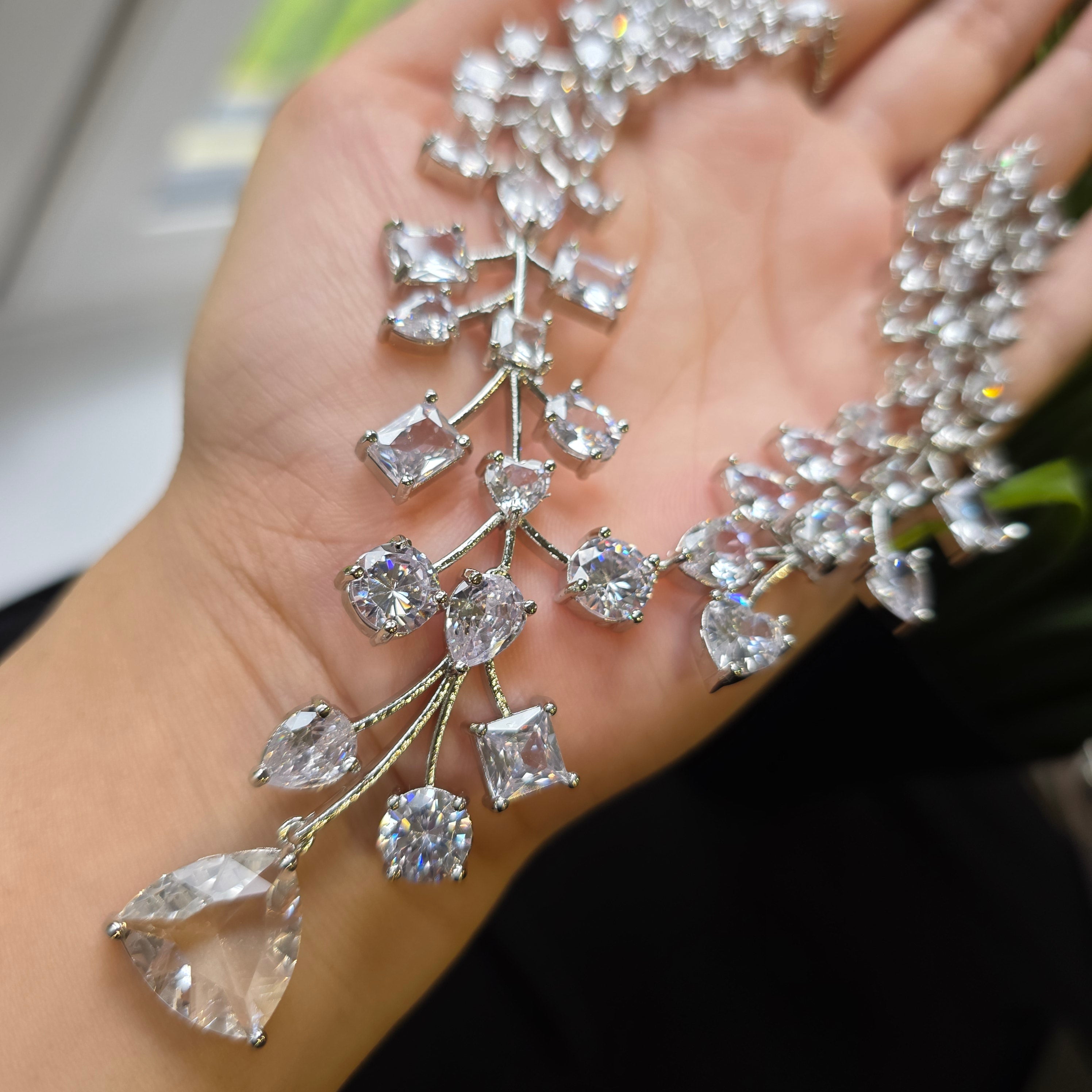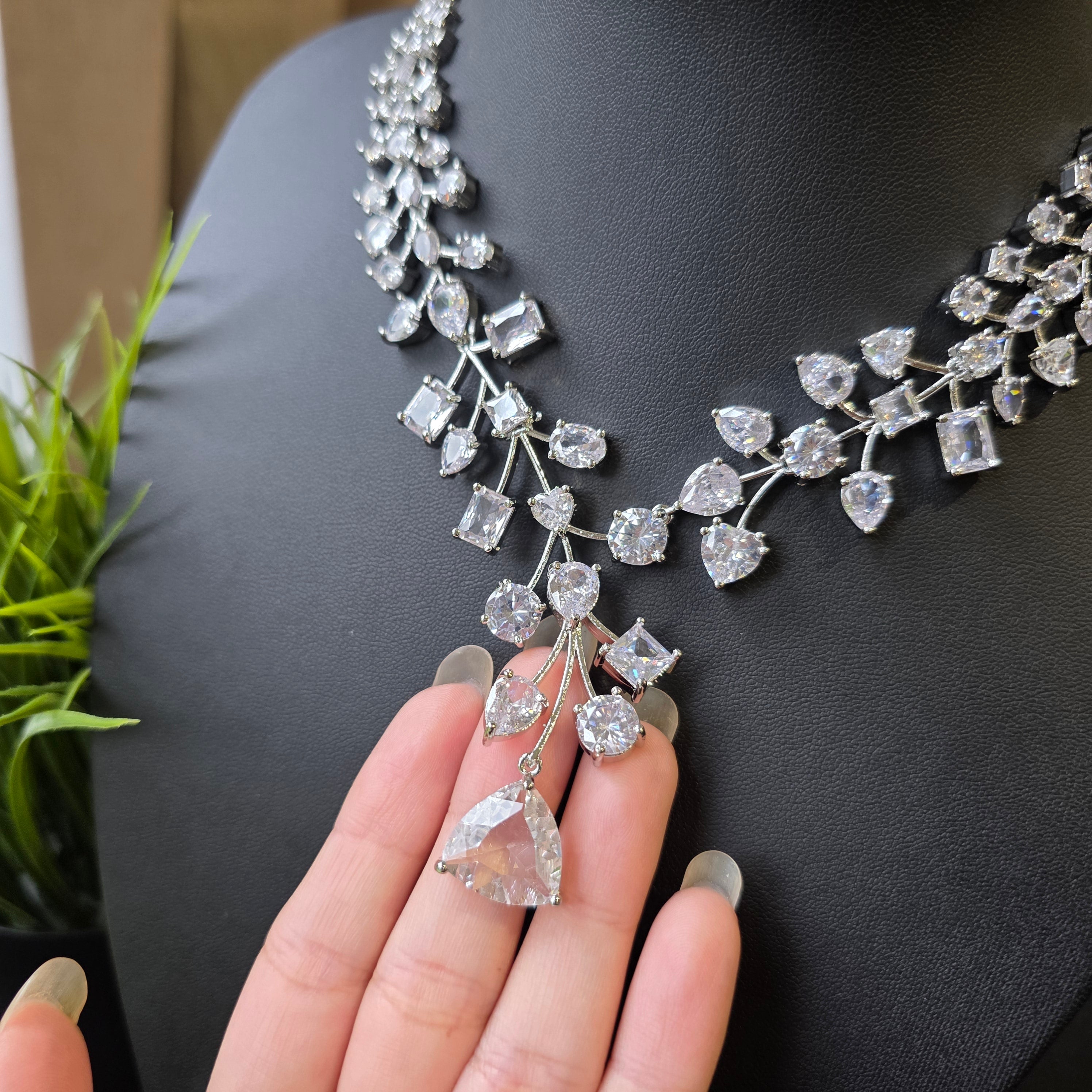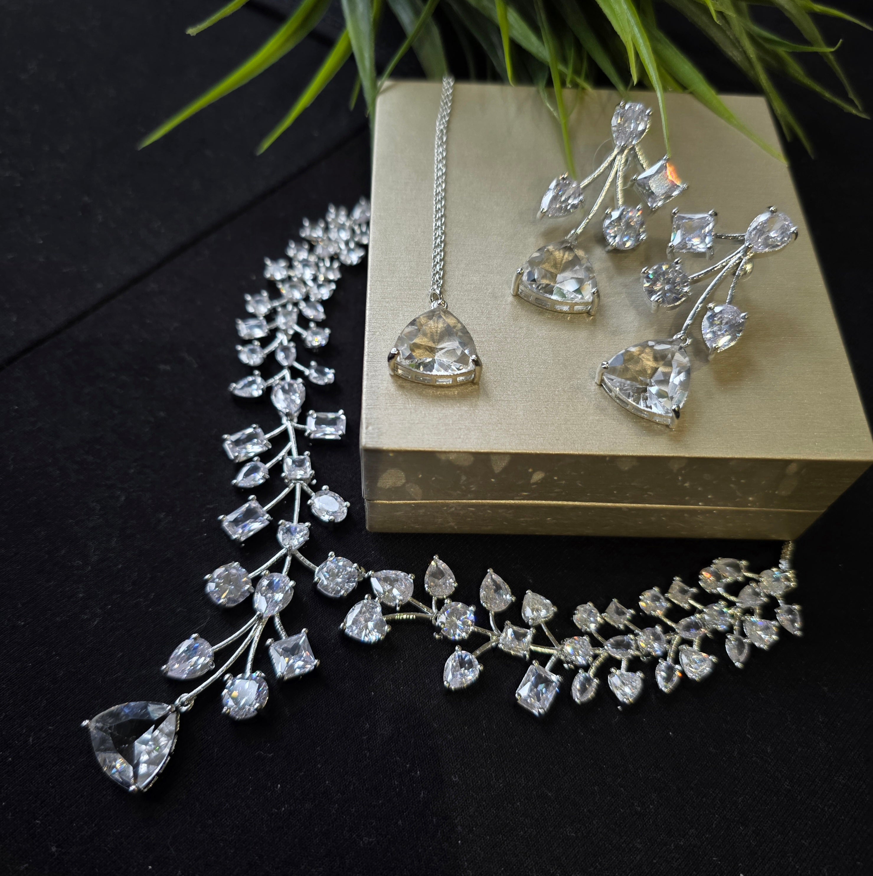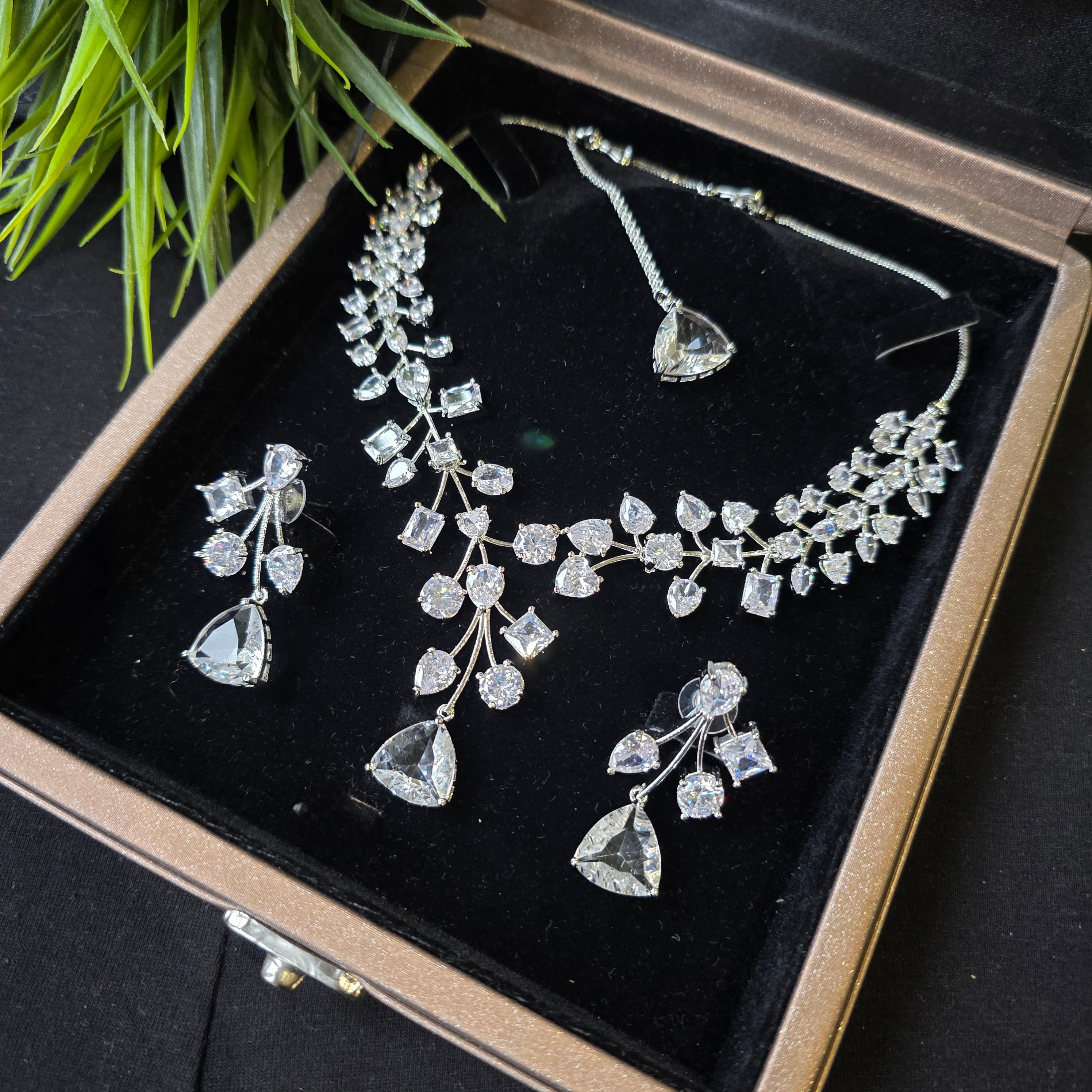 Introducing Dazzling piece featuring Finest Cubic Zirconia studded Necklace paired with matching Earrings & Tika.