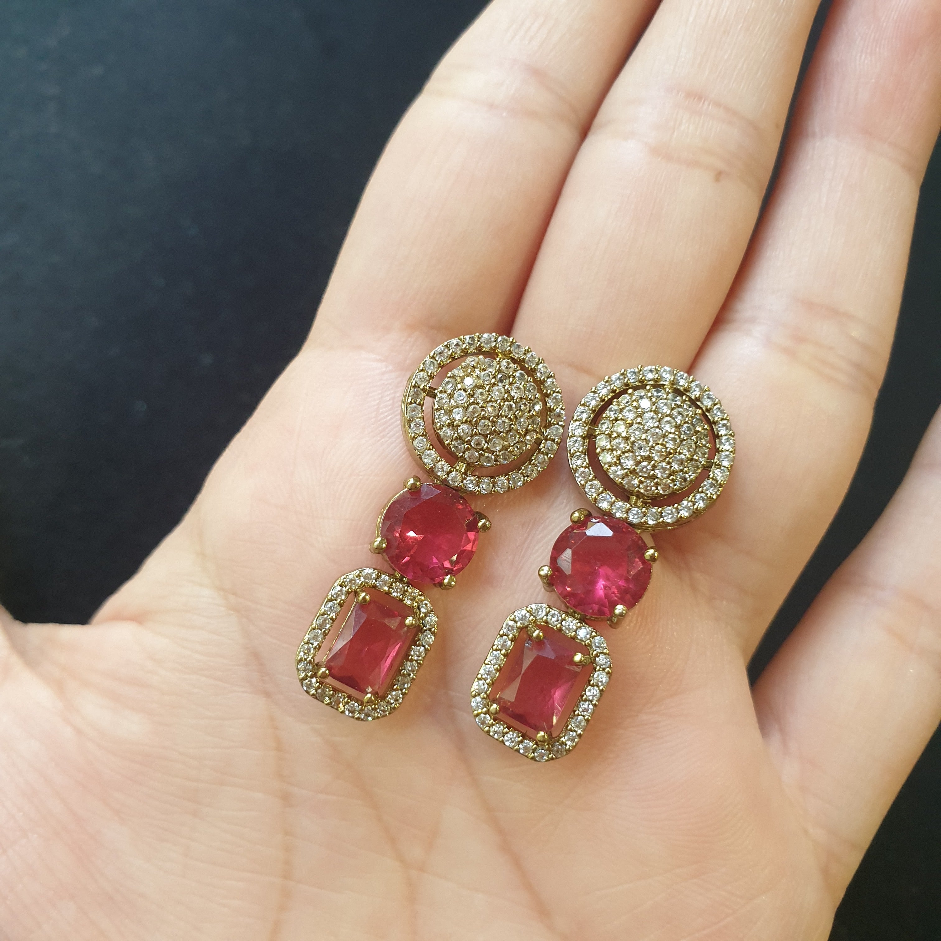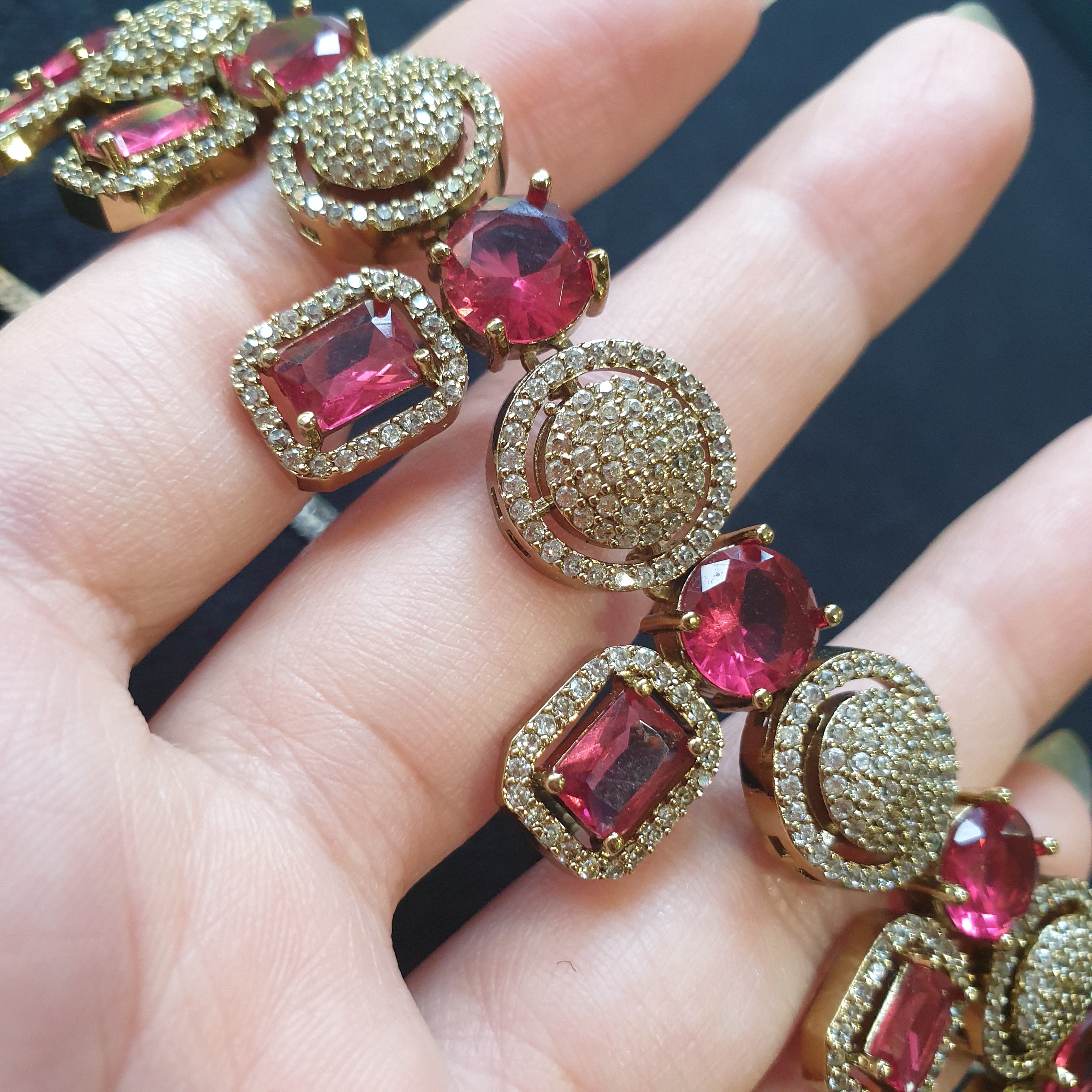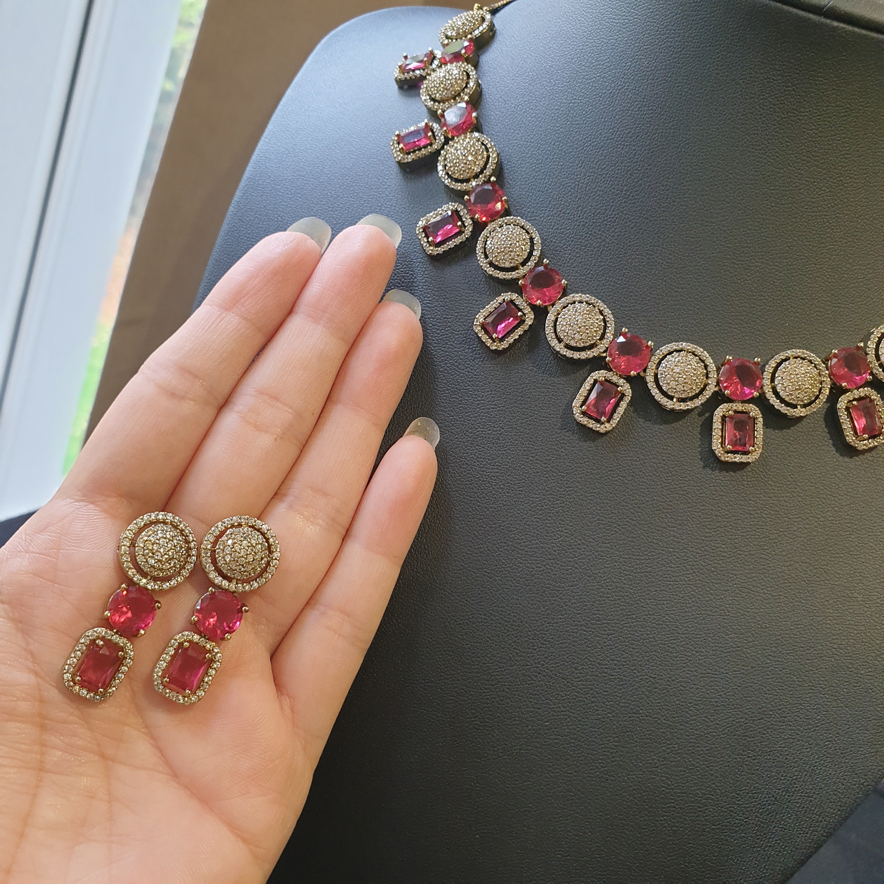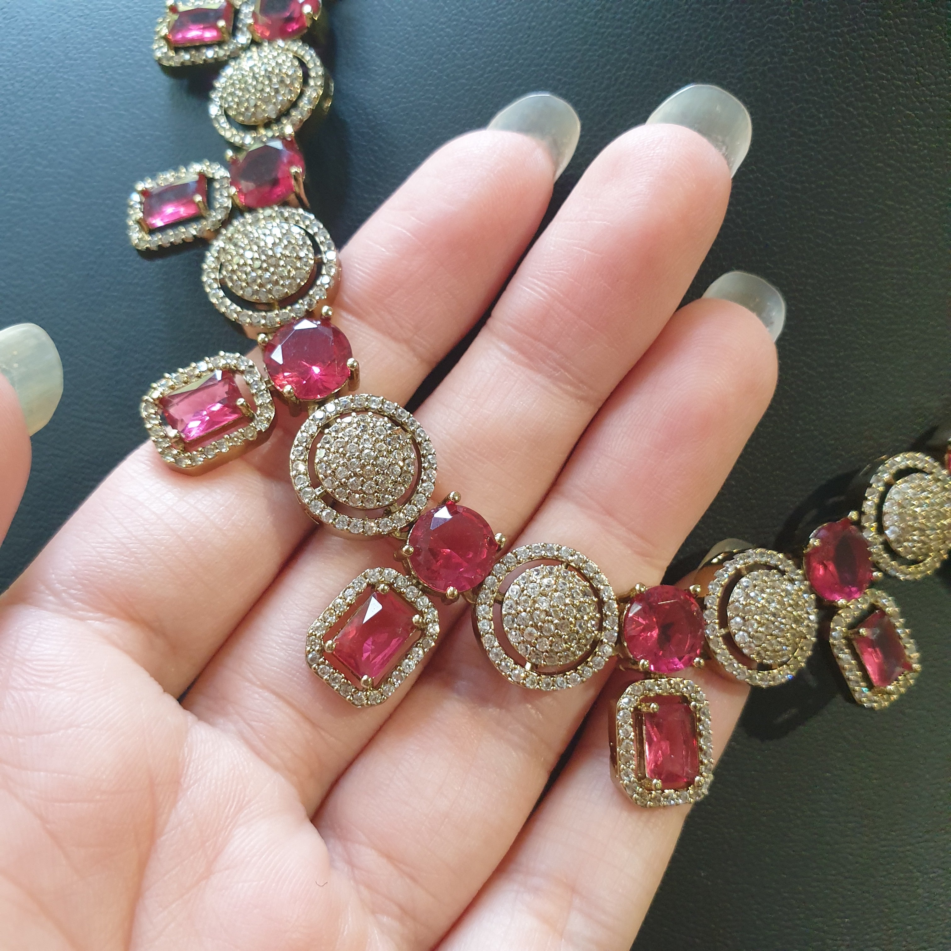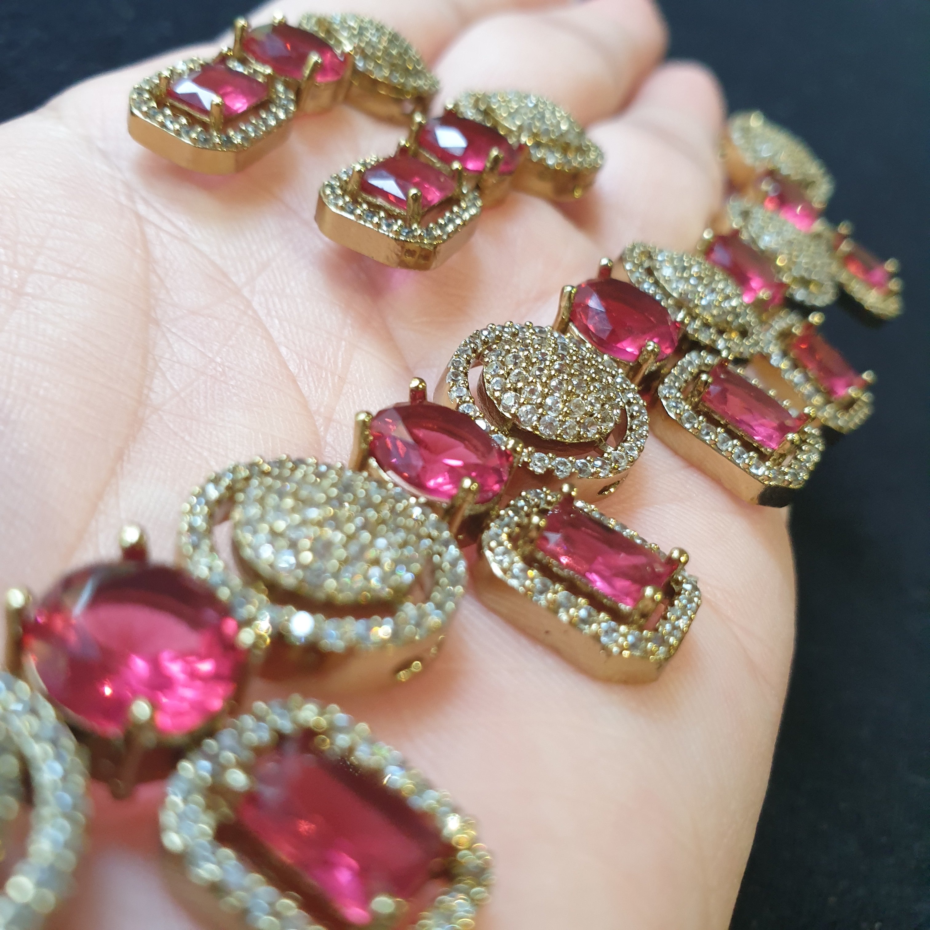 Make a bold and regal statement with this Garnet Necklace Set, featuring deep red garnet stones paired with shimmering cubic zirconia accents, all set in a graceful dull gold plated finish.