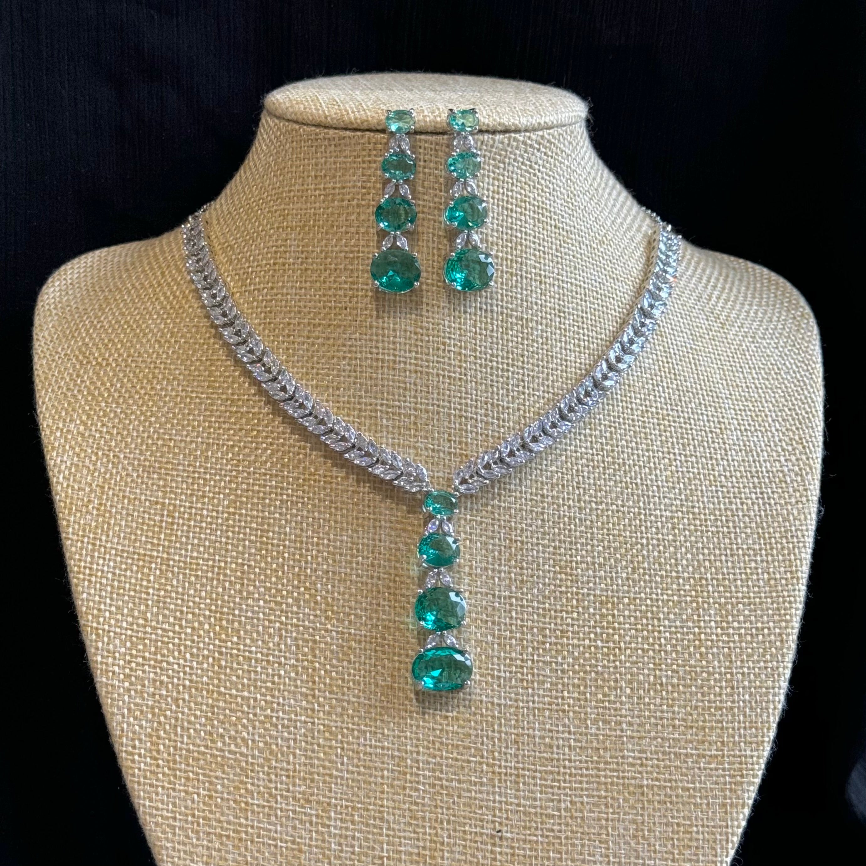 This cubic zirconia necklace set features a stunning array of intricately cut stones that shimmer like real diamonds. The necklace showcases a classic design, with a brilliant centerpiece surrounded by smaller, perfectly faceted cubic zirconia, creating a timeless look. Paired with matching earrings, the set is designed to complement both formal and casual attire. Crafted with high-quality materials for lasting shine and durability, the necklace is lightweight and comfortable for all-day wear. This elegant set is perfect for weddings, special occasions, or adding a touch of sparkle to everyday outfits.
