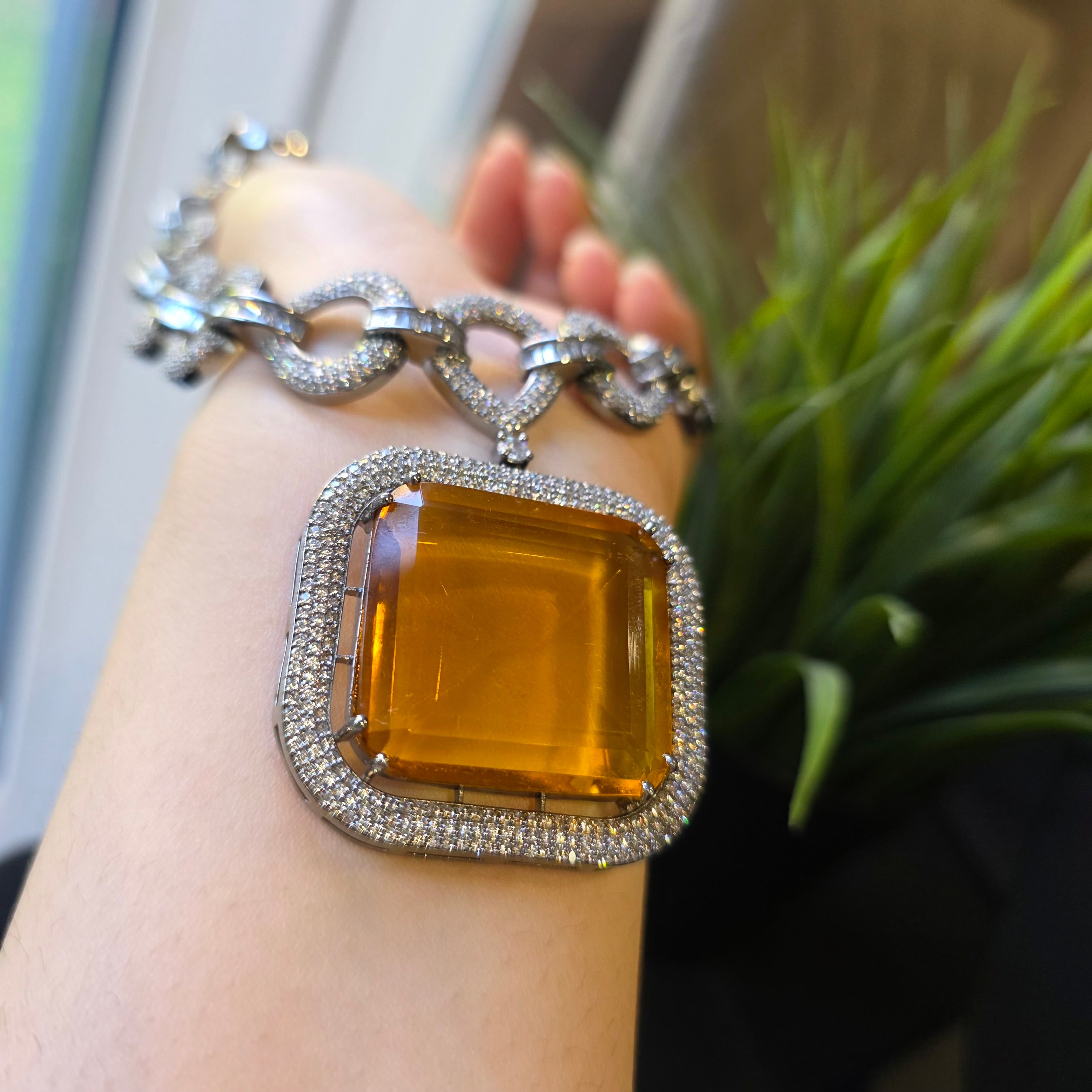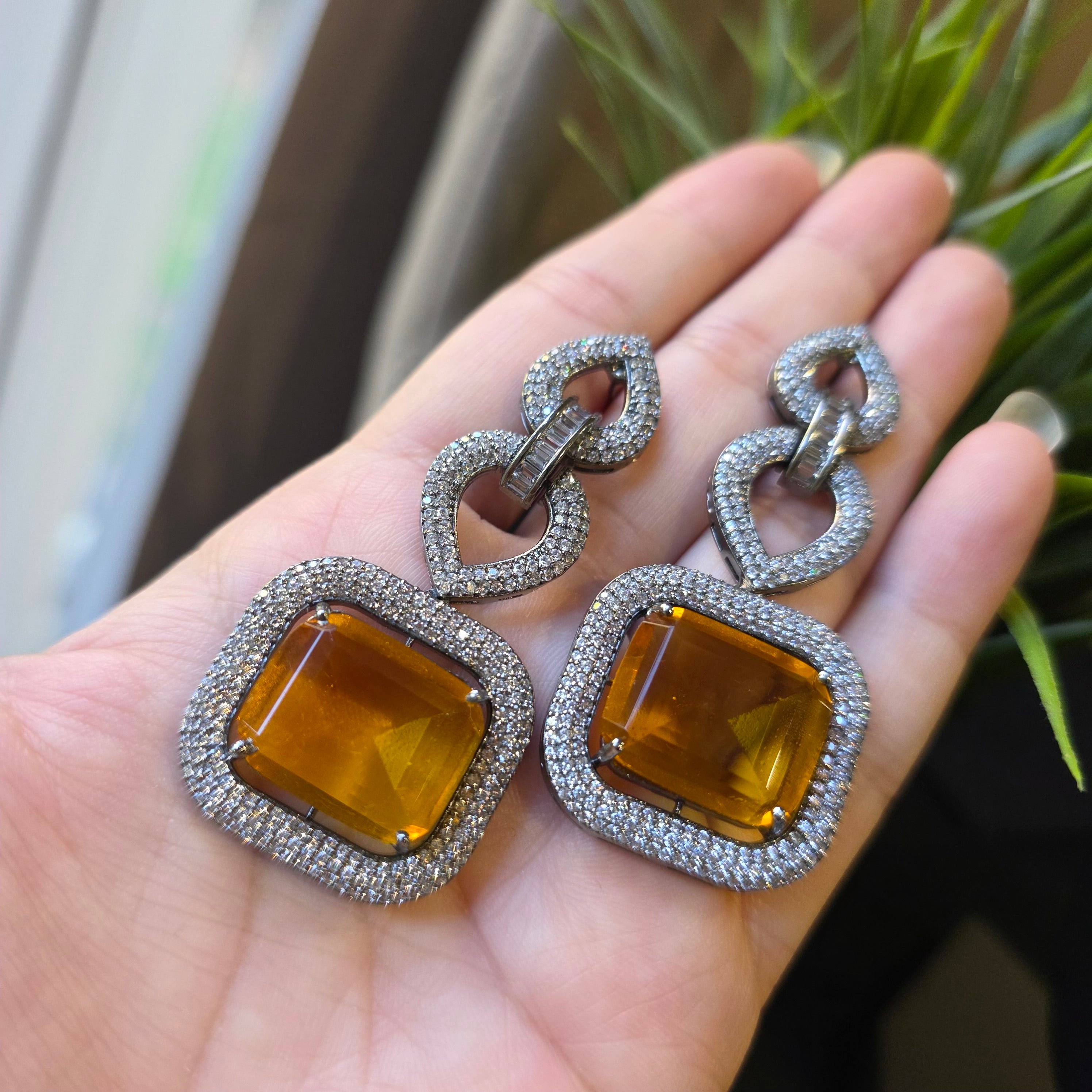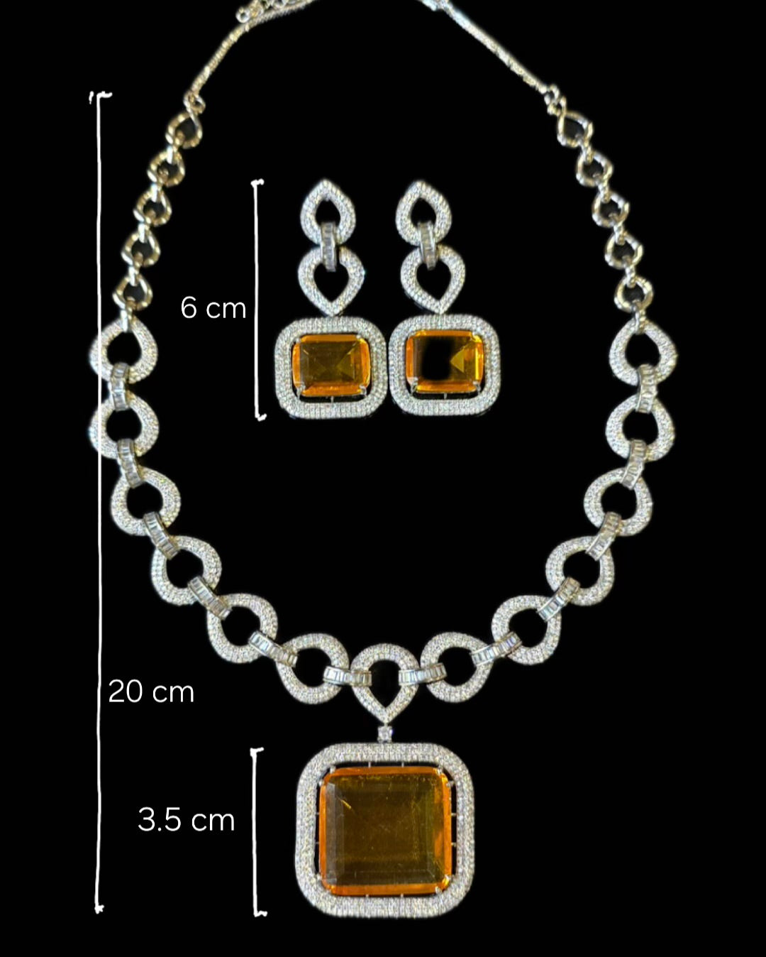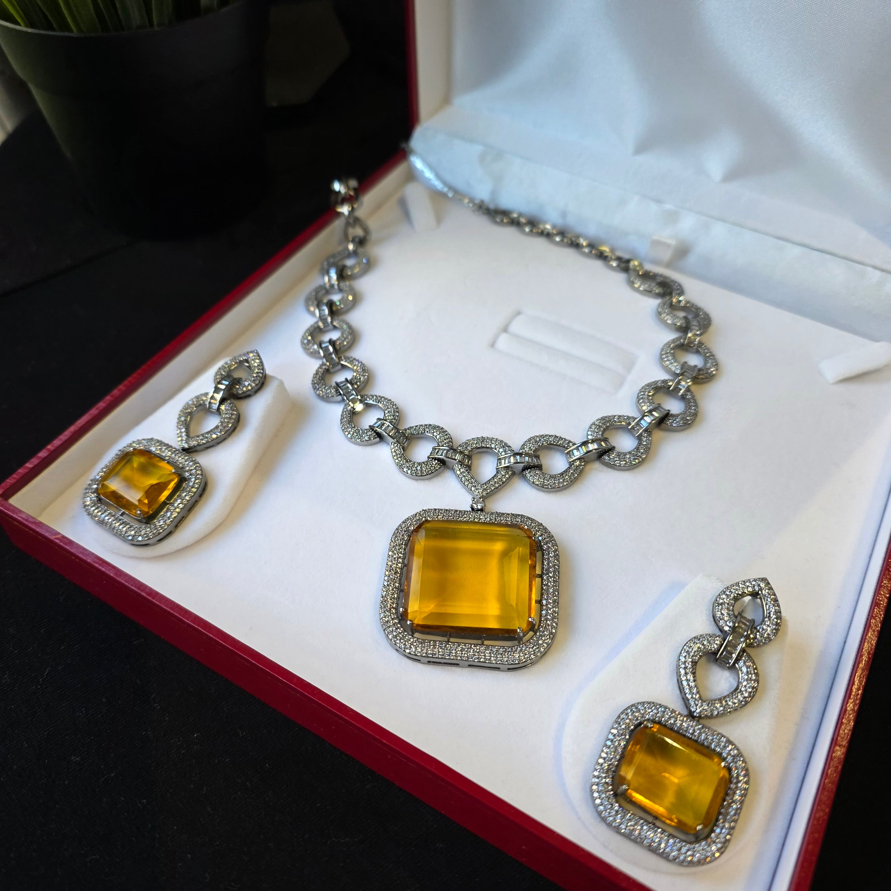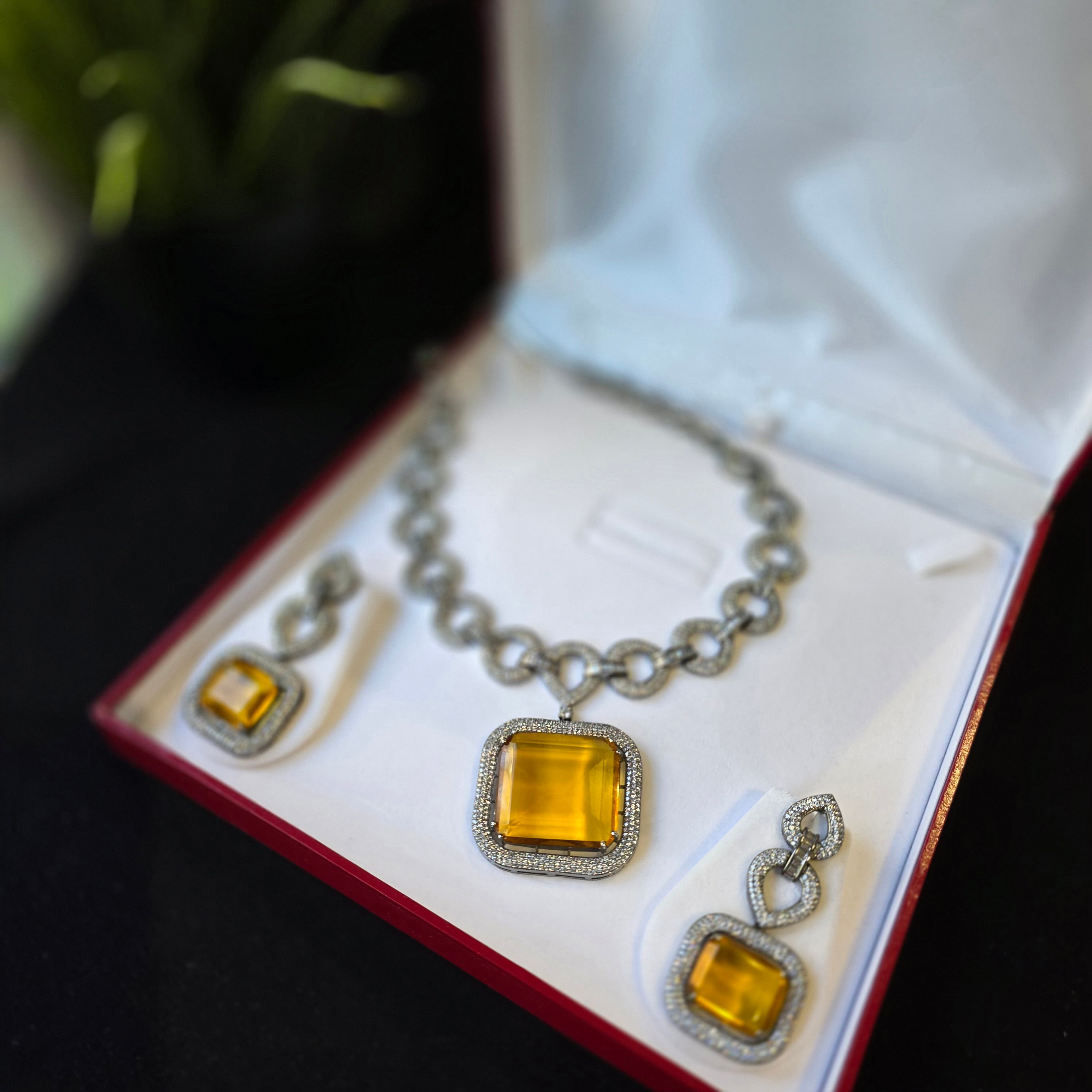 Bespoke piece featuring a fierce Yellow Citrine(lab-made) and Cubic Zirconia studded Necklace paired with matching Earrings.