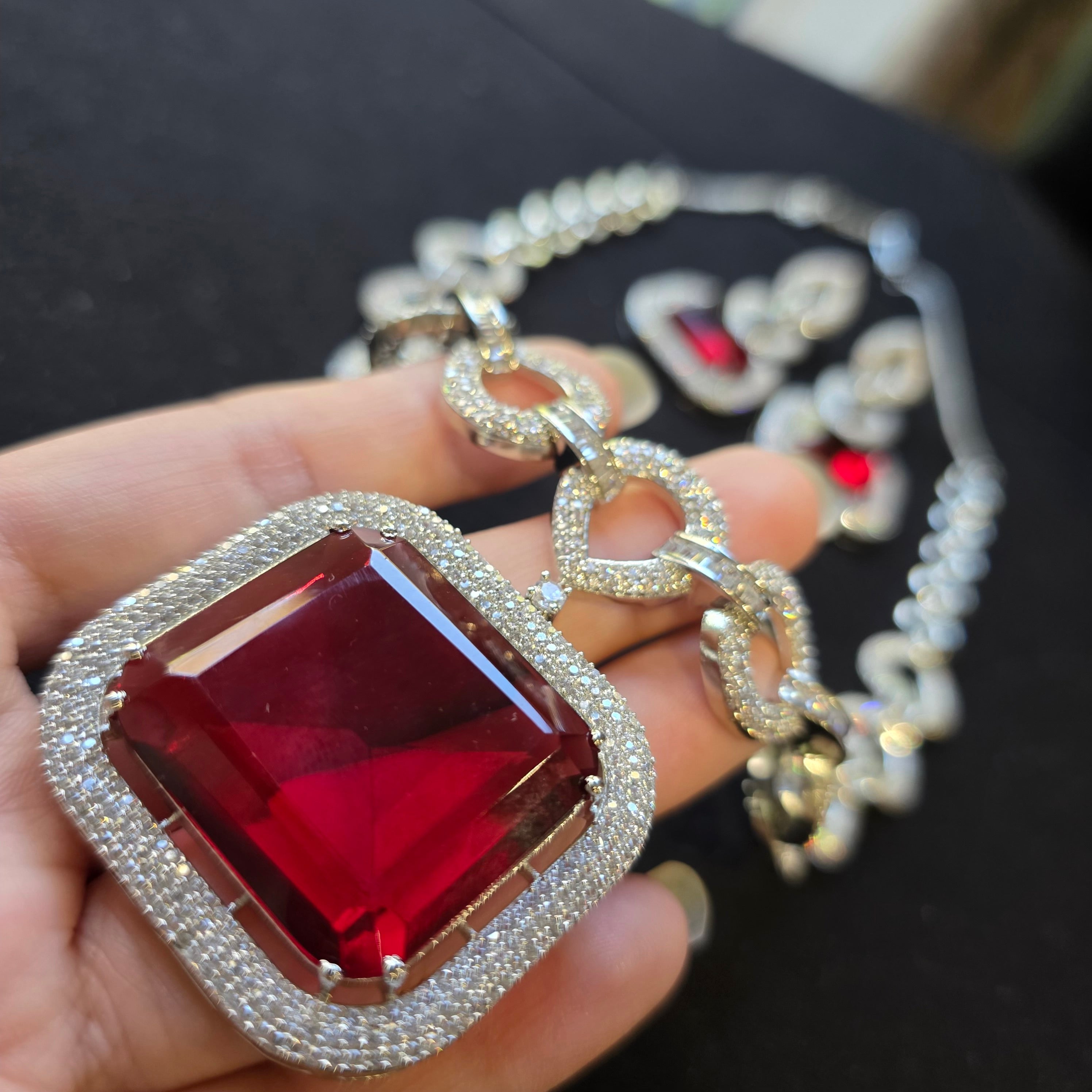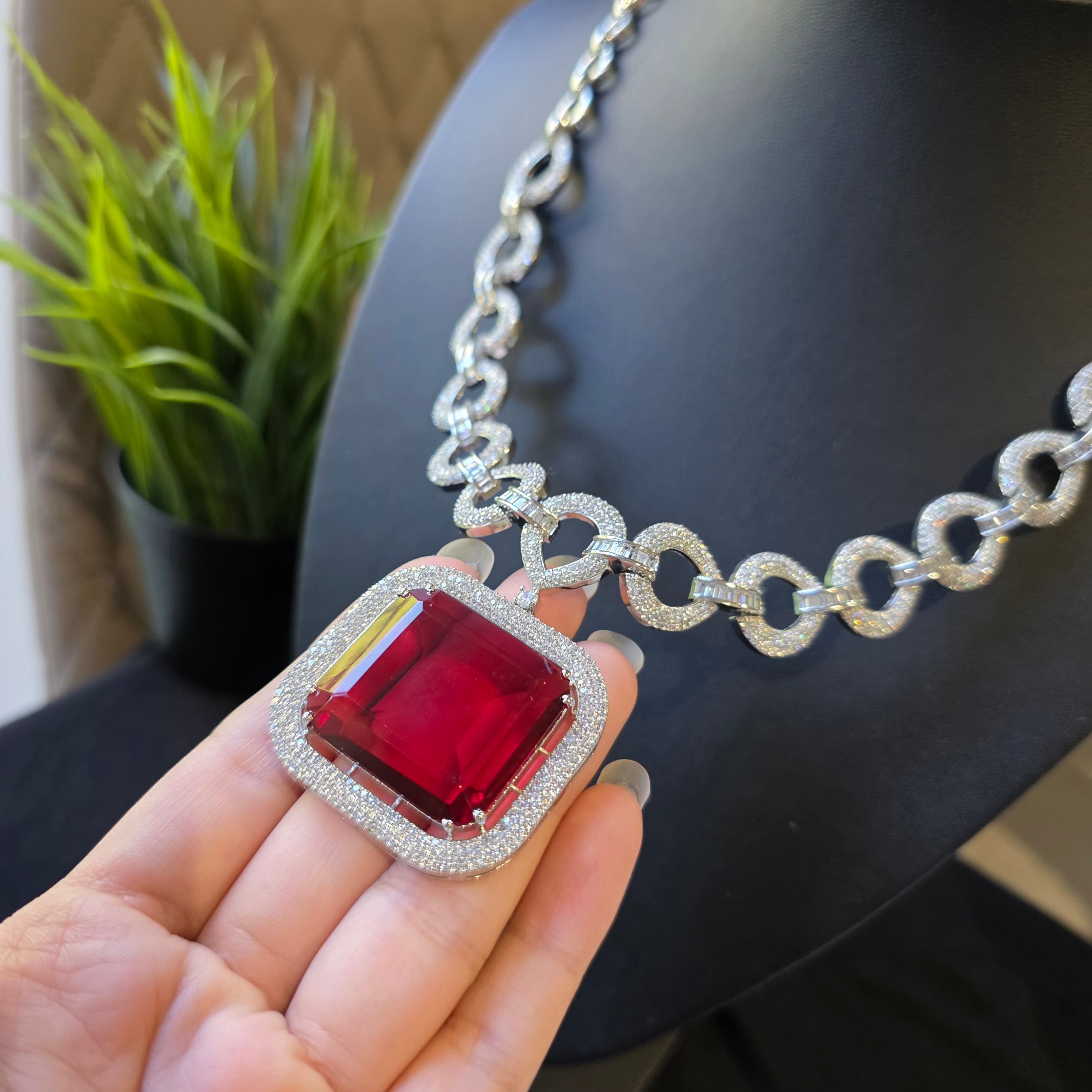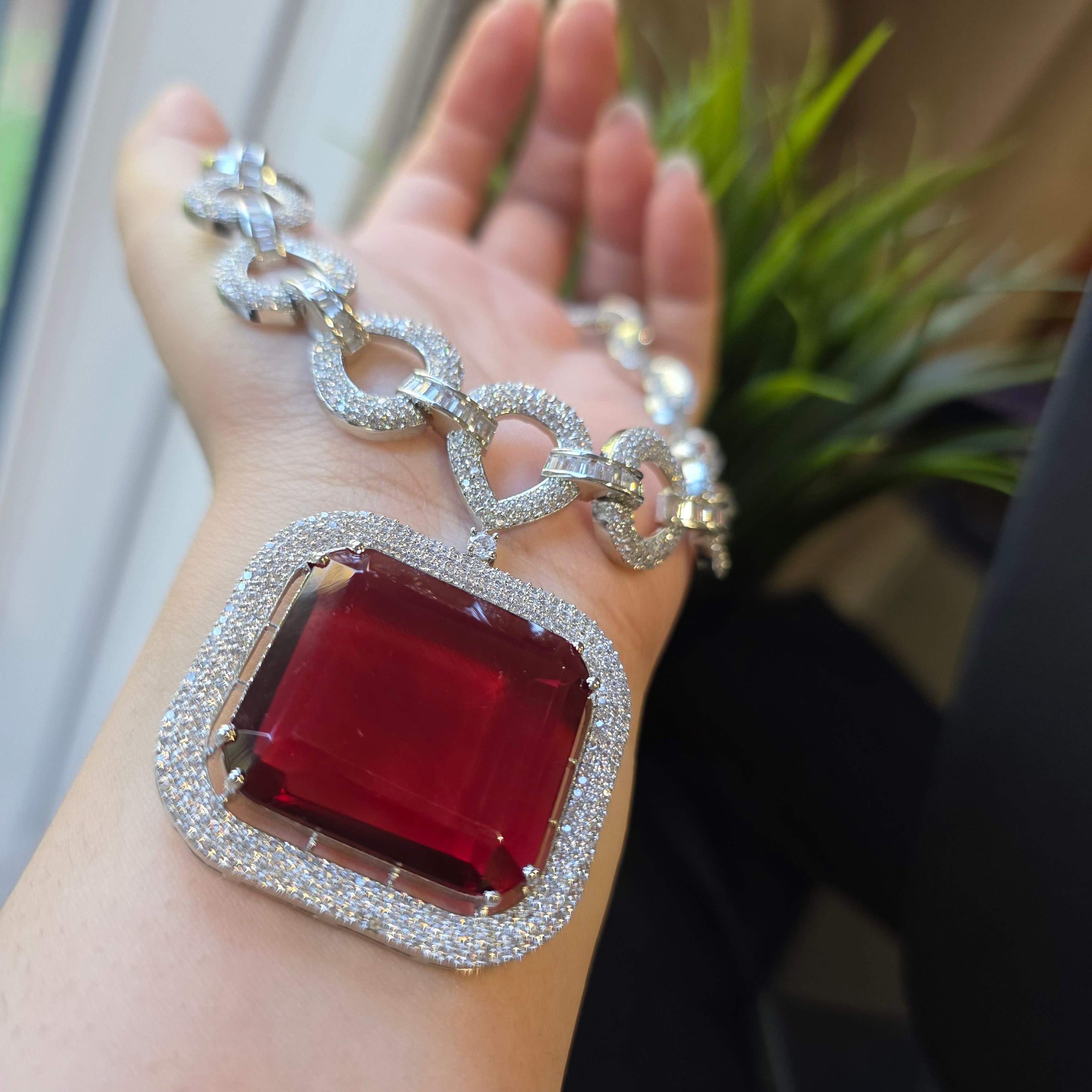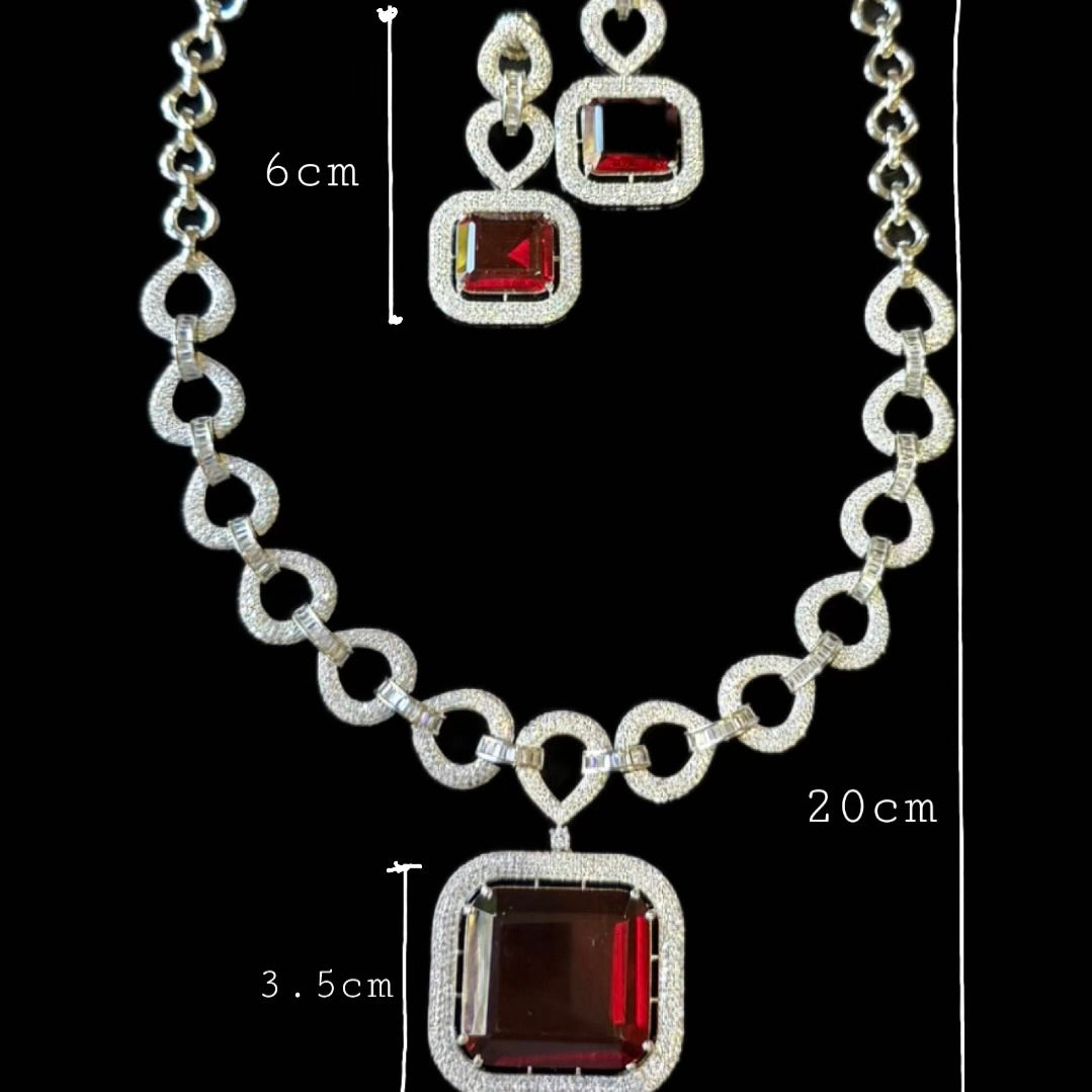 Bespoke piece featuring a fierce Red Ruby (lab-made) and Cubic Zirconia studded Necklace paired with matching Earrings.