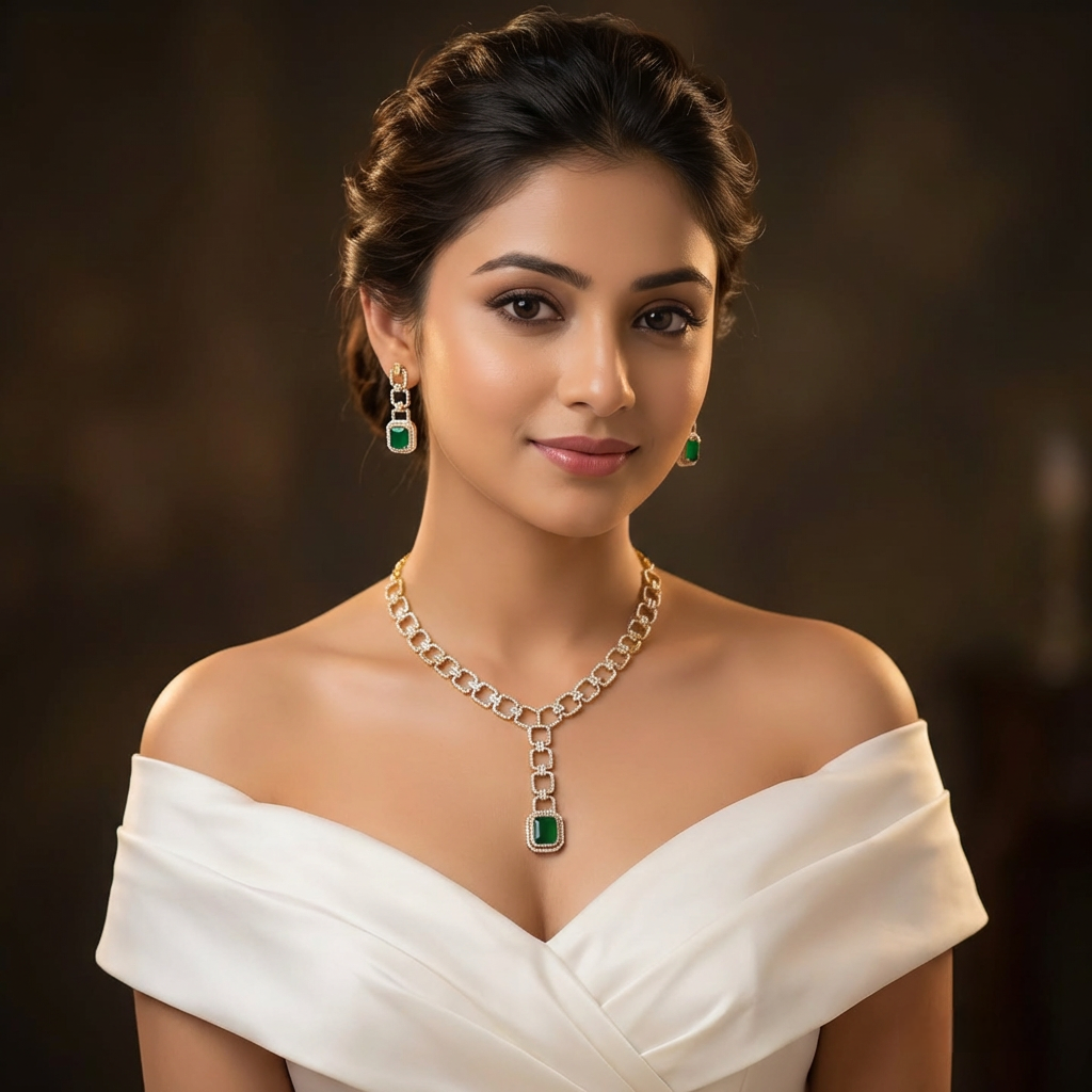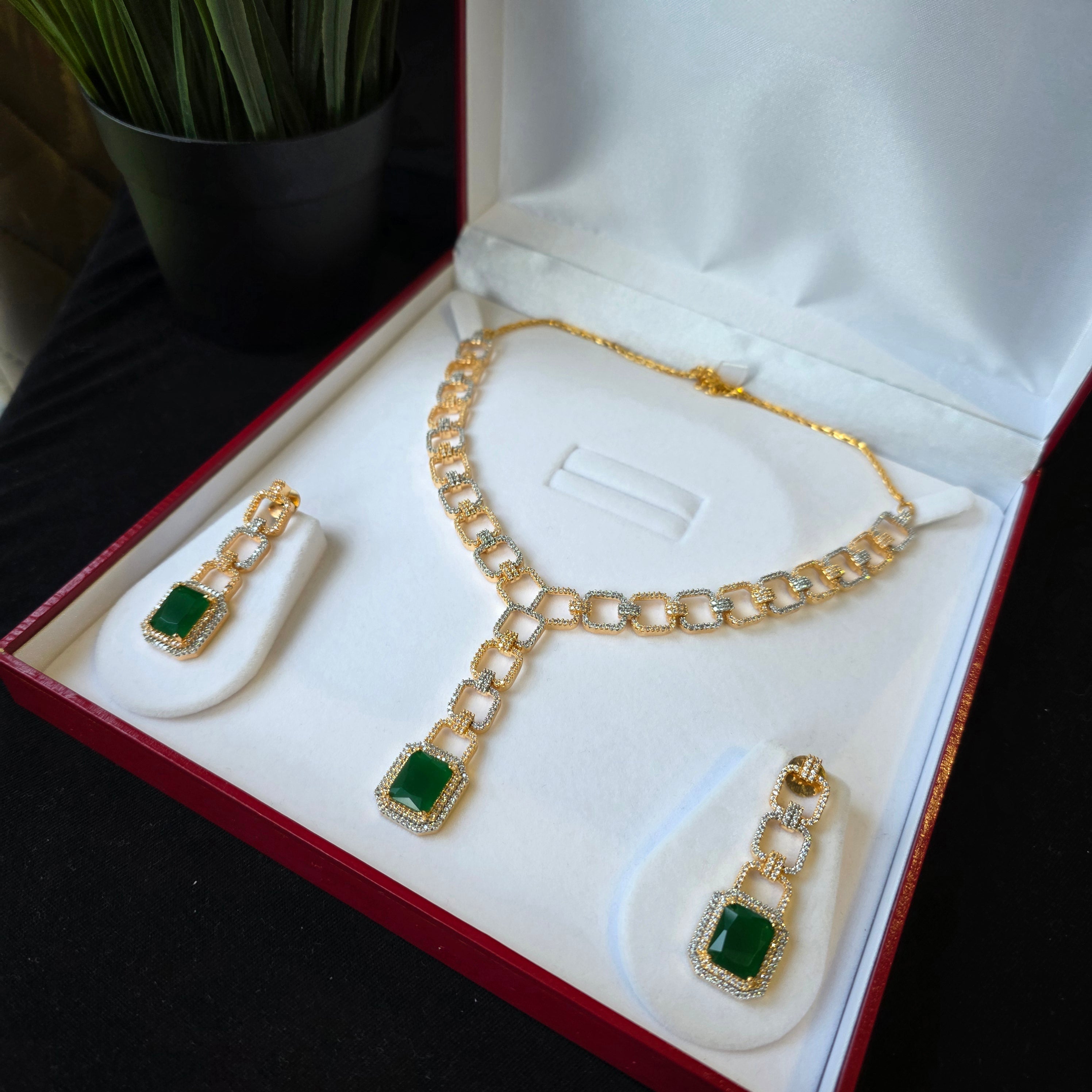 This breathtaking necklace set features lab-made emeralds that radiate a deep, captivating green, exuding timeless elegance. The luxurious design is adorned with sparkling cubic zirconia accents, enhancing the brilliance of the emerald stones with an added touch of glamour. Plated in gold, the set boasts a warm, opulent finish that perfectly complements the vibrant green tones. Ideal for formal occasions or as a statement accessory, this stunning necklace set is a perfect blend of sophistication, luxury, and modern craftsmanship.