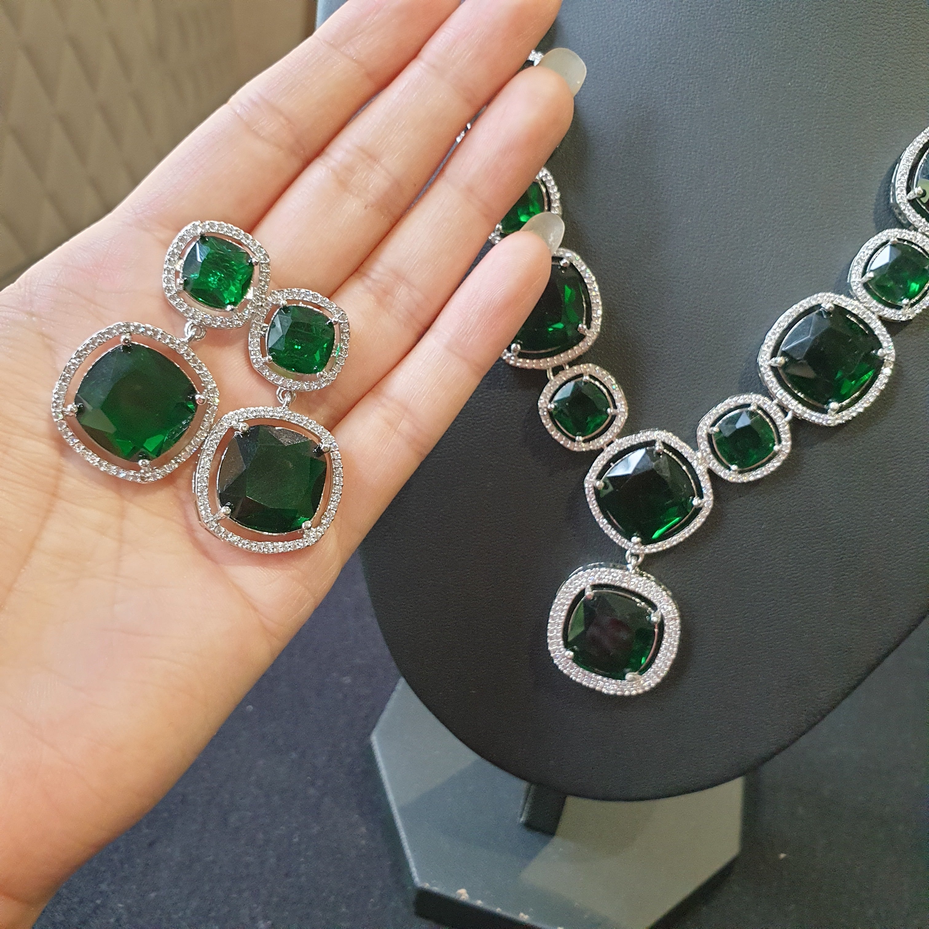 This luxurious necklace set features lab-made emeralds, renowned for their rich green color and exceptional brilliance. These stunning gemstones are perfectly complemented by sparkling cubic zirconia stones, creating a radiant and elegant design. Crafted with a white gold-plated finish, the set offers a timeless and sophisticated appeal.