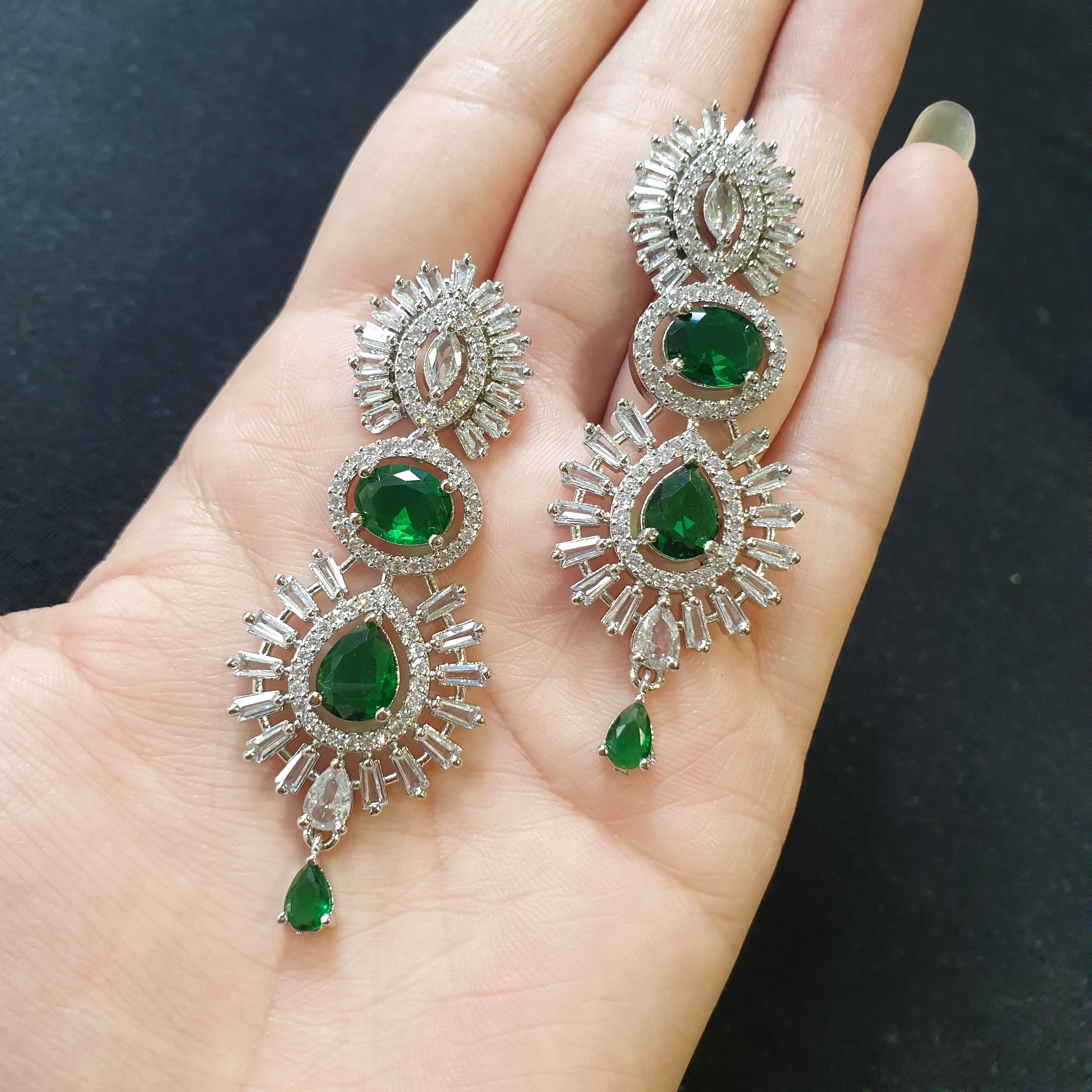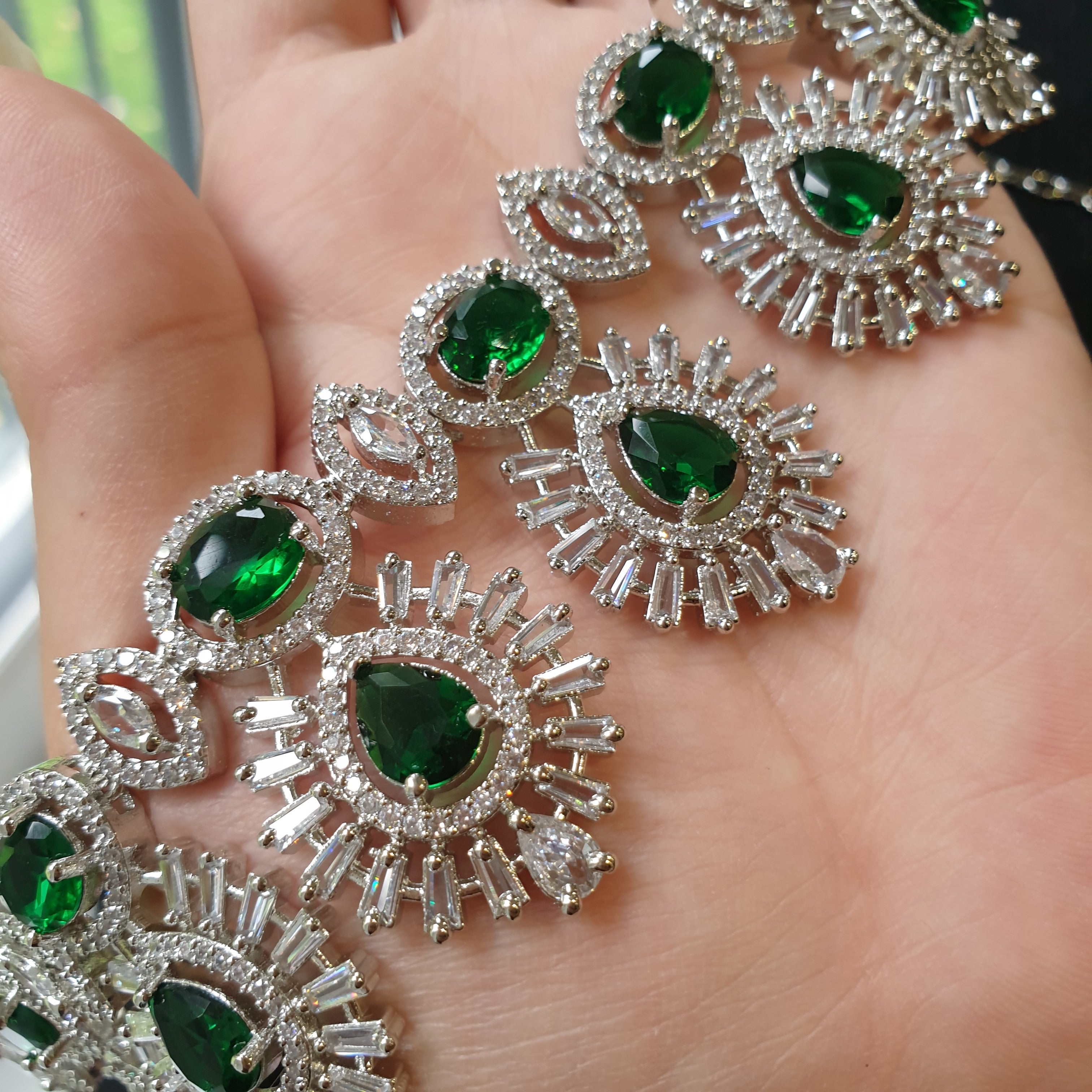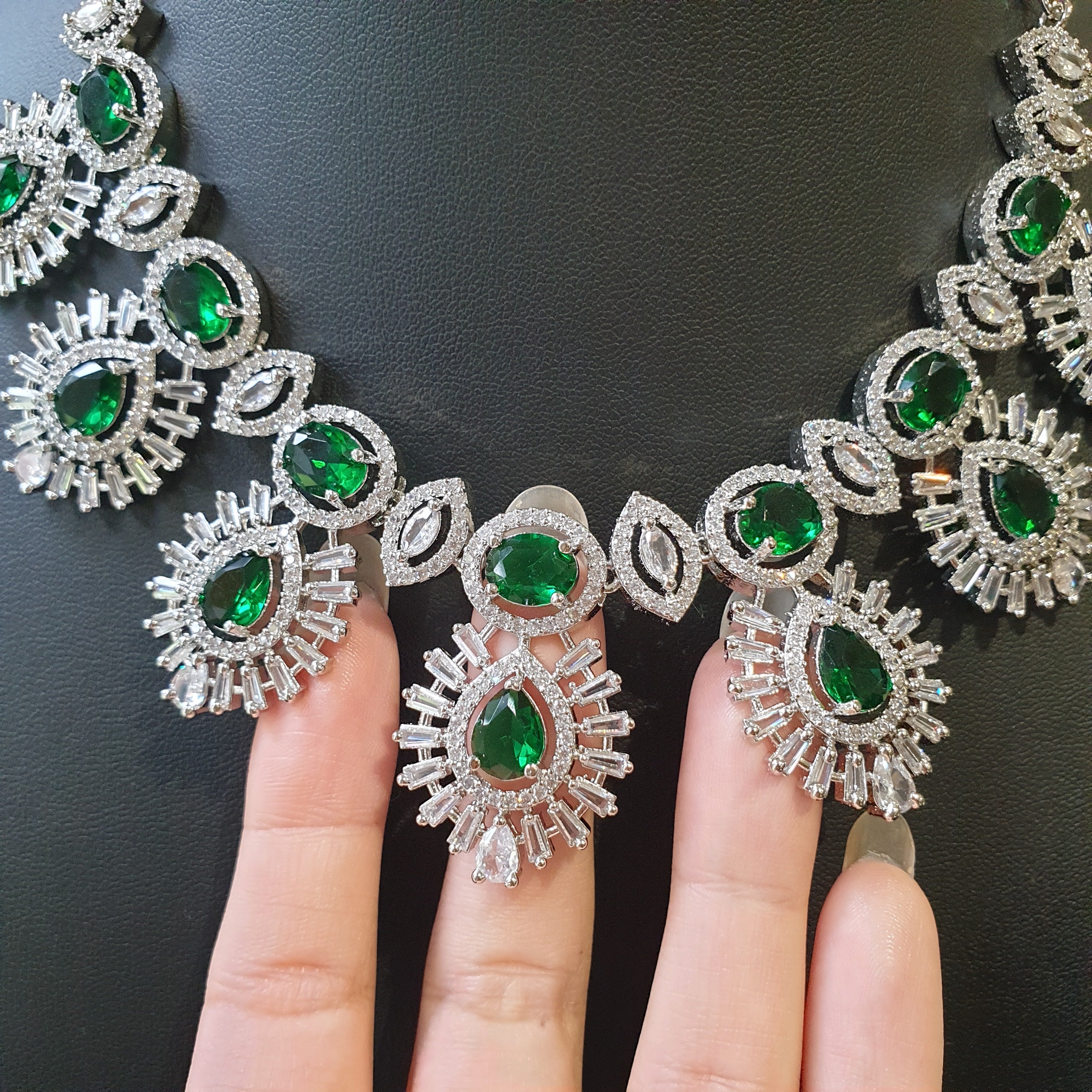 This exquisite necklace set features lab-created emeralds, radiating vibrant green hues that rival natural gemstones. The emeralds are complemented by a halo of sparkling cubic zirconia stones, meticulously arranged to enhance their brilliance.