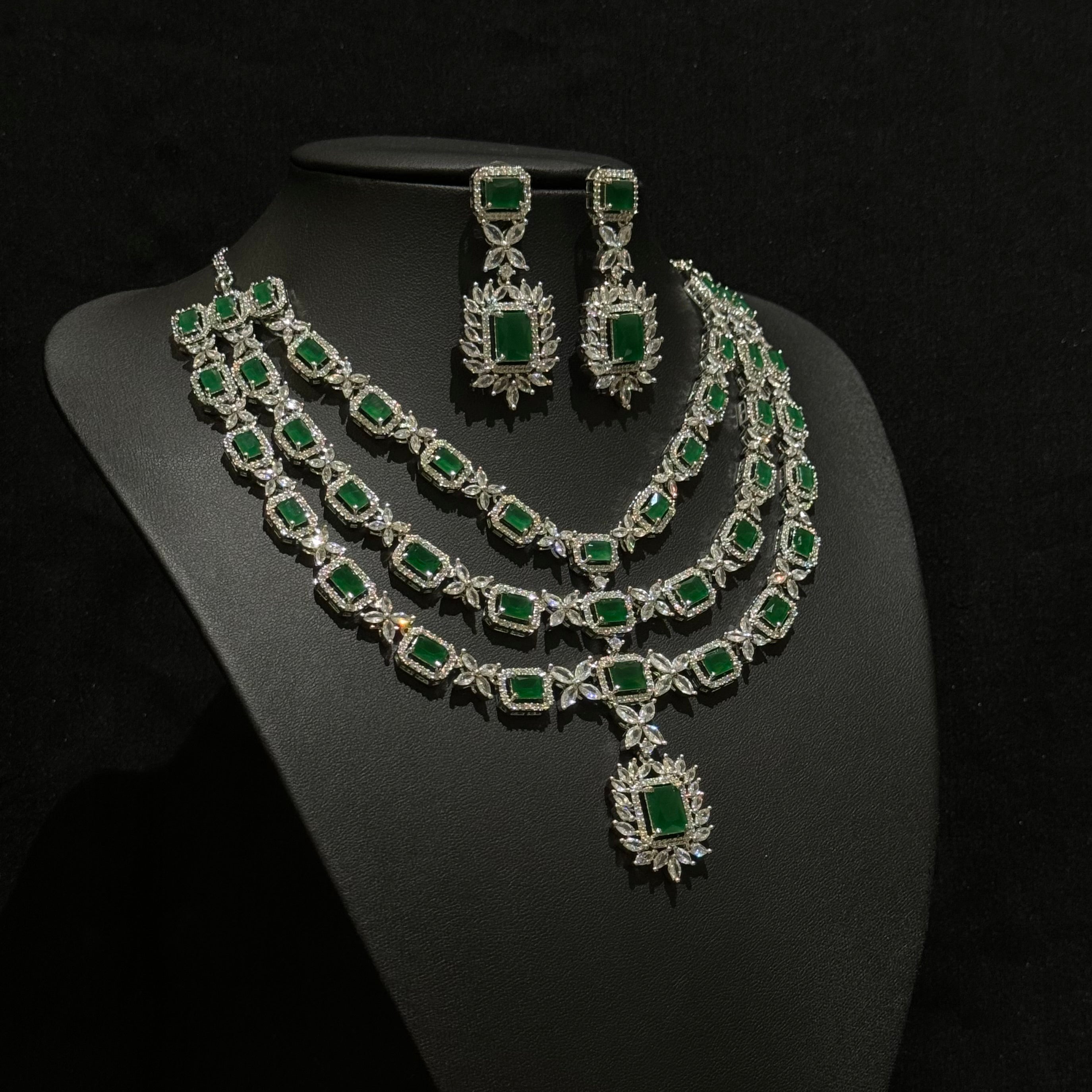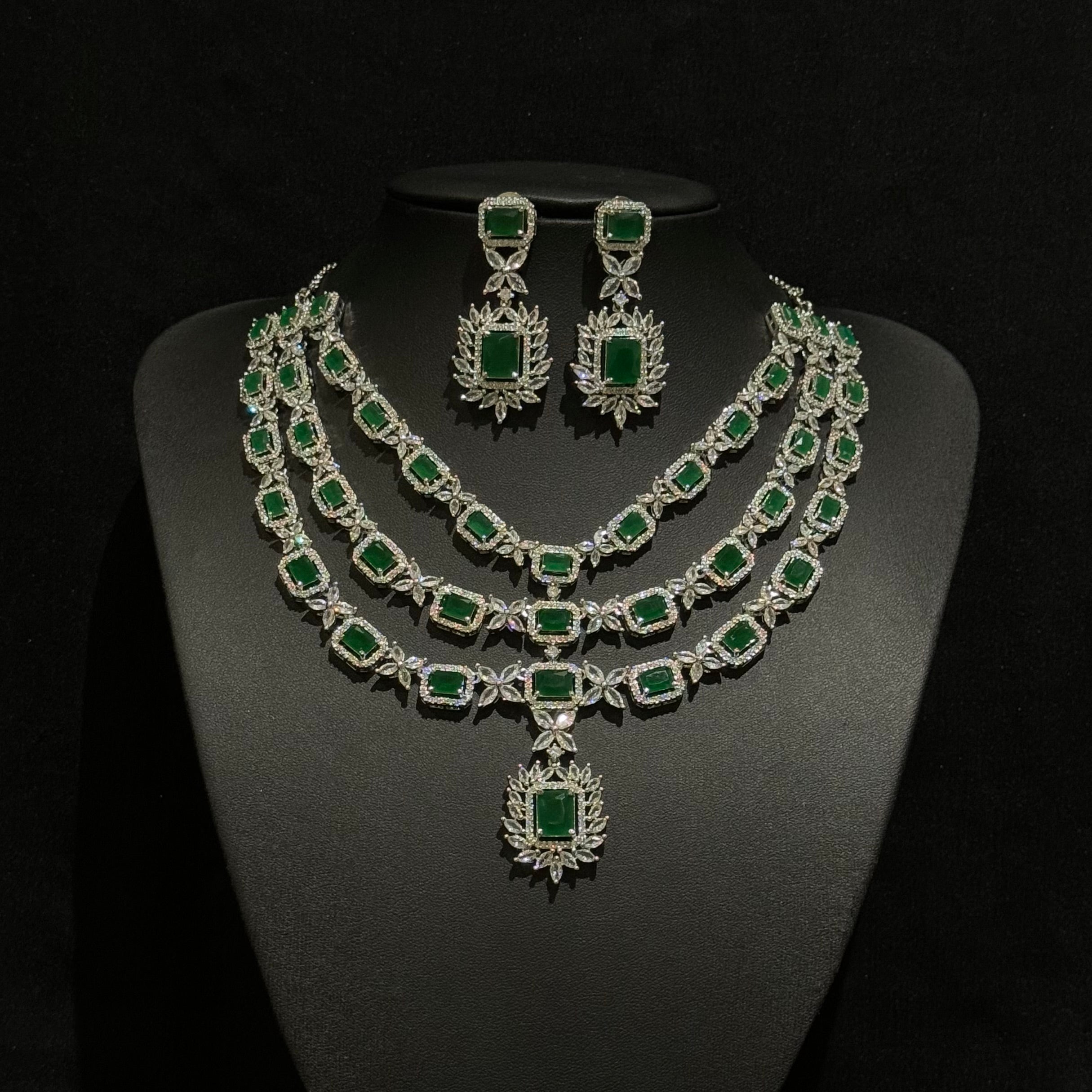 Make a statement with this breathtaking necklace set, featuring lab-created emeralds that radiate a deep, luxurious green. Each emerald is surrounded by brilliant cubic zirconia, adding a sparkling contrast that enhances the overall elegance. Designed with intricate craftsmanship, the matching earrings complete the set, making it an ideal choice for weddings, gala events, or formal occasions. This stunning combination of lab-grown gems and dazzling accents offers the perfect blend of timeless beauty and contemporary style.