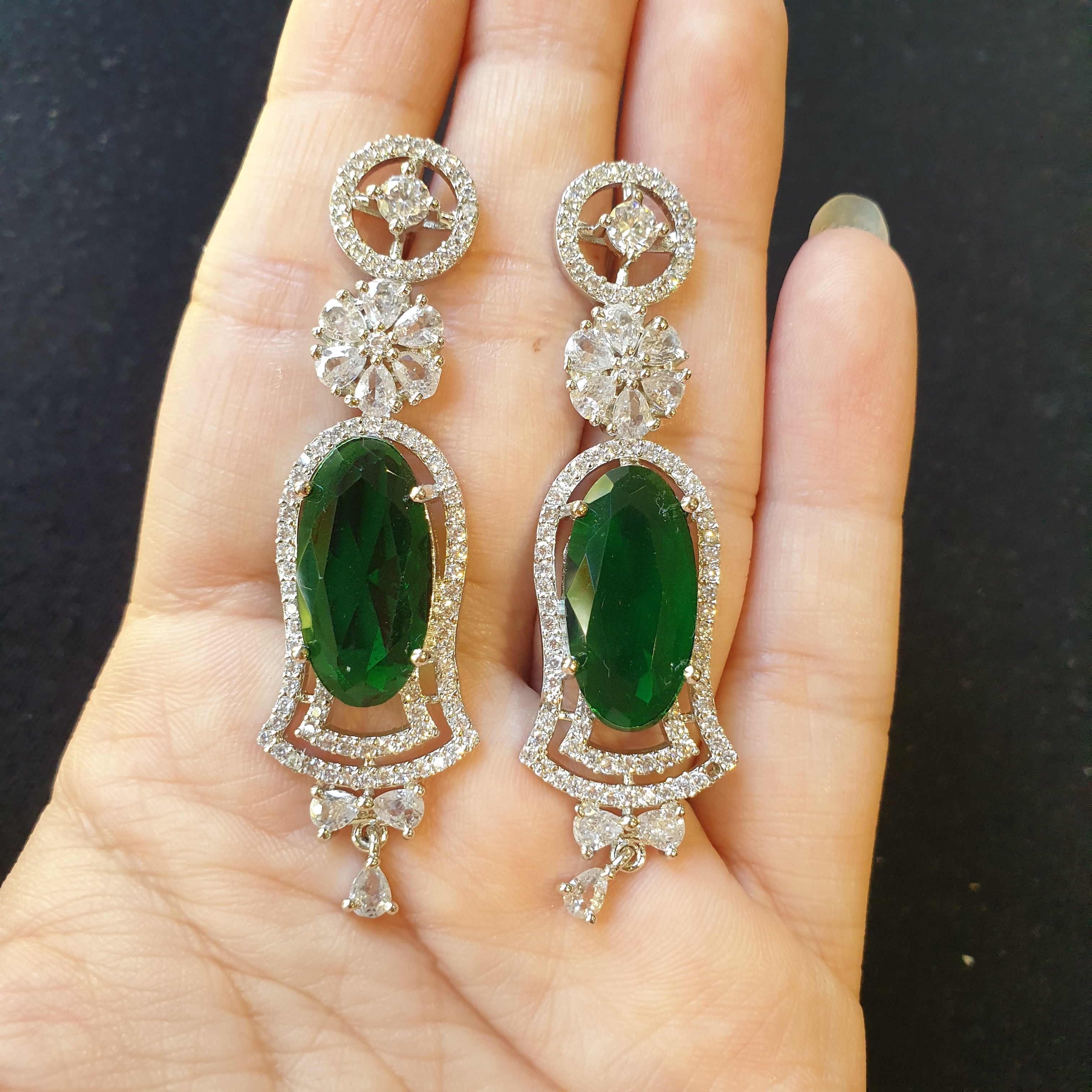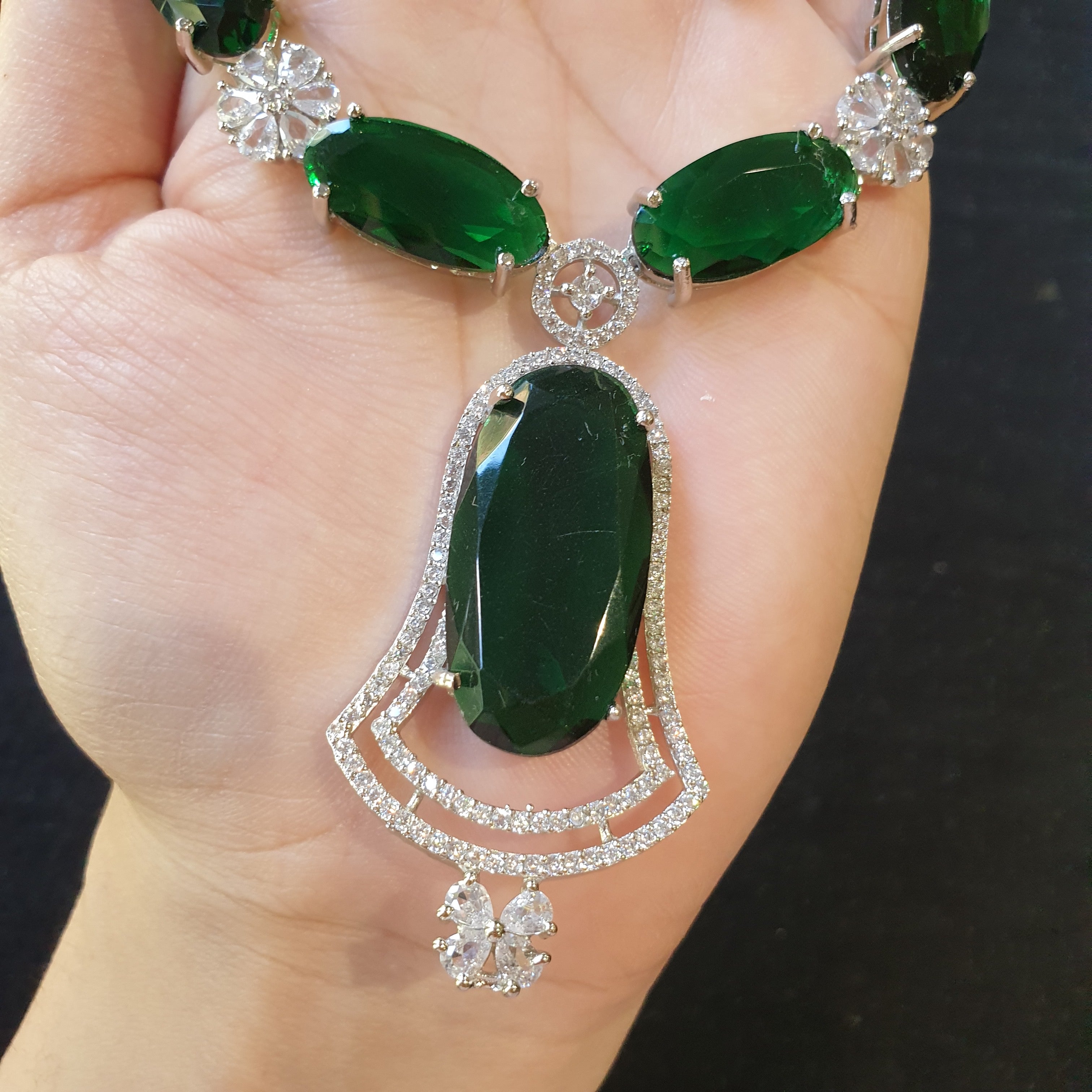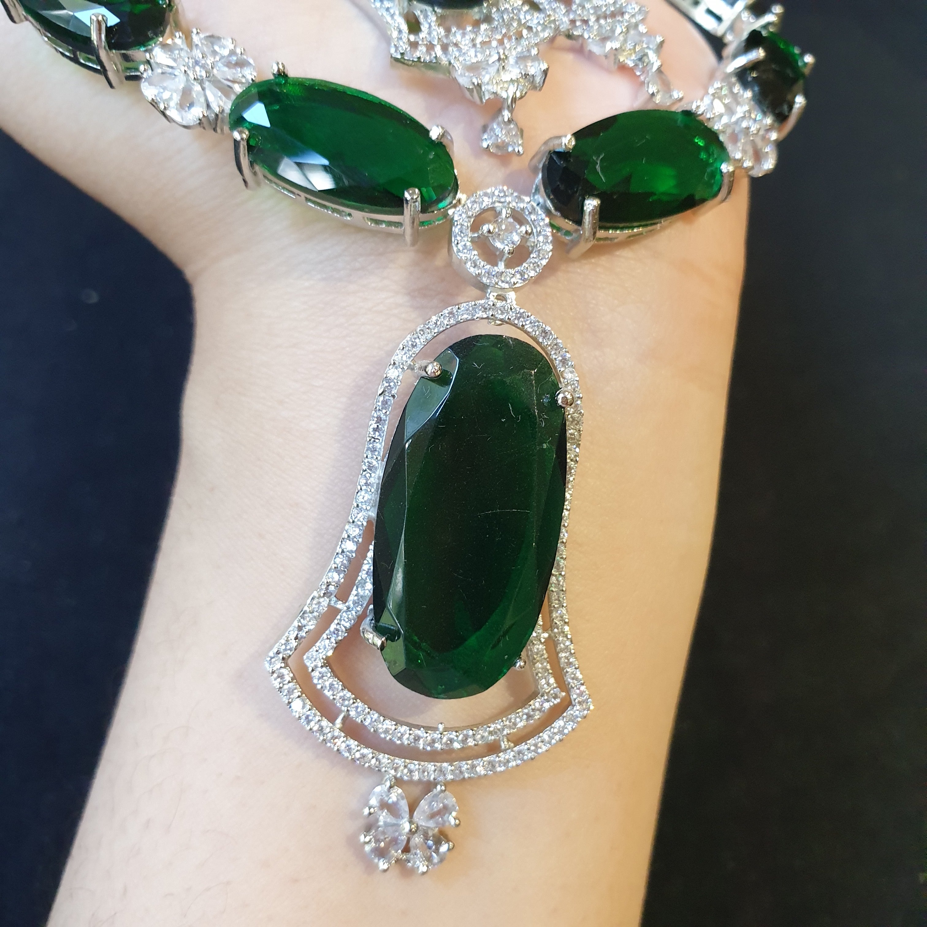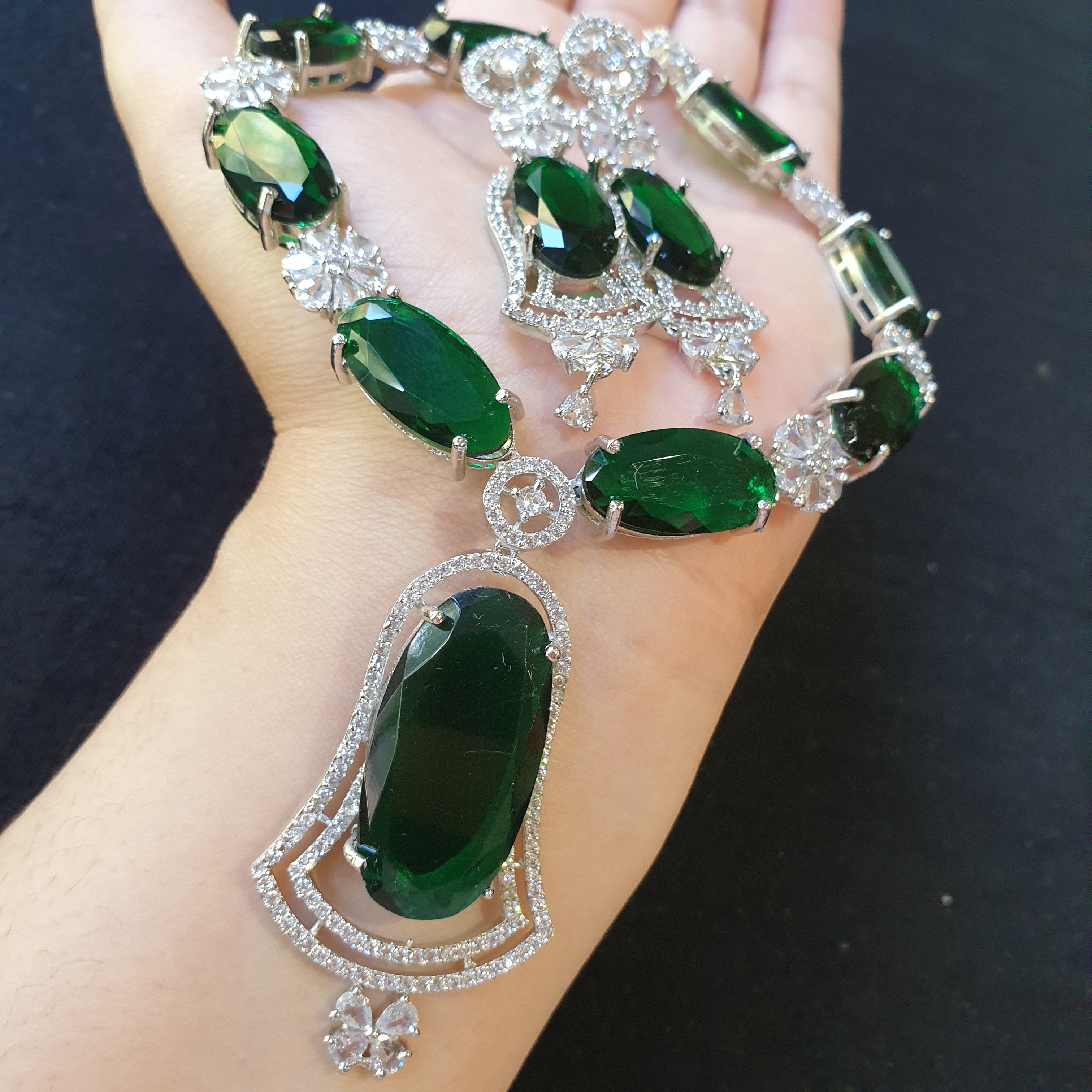 This elegant necklace set features lab-created emeralds beautifully accented with sparkling cubic zirconia stones. The stones are set in a white gold-plated base, offering a luxurious and radiant finish. The vivid green emeralds serve as the centerpiece, exuding sophistication, while the cubic zirconia adds brilliance and charm. Perfect for special occasions or as a timeless gift, this set combines elegance with affordability. The white gold plating ensures a polished look and added durability.