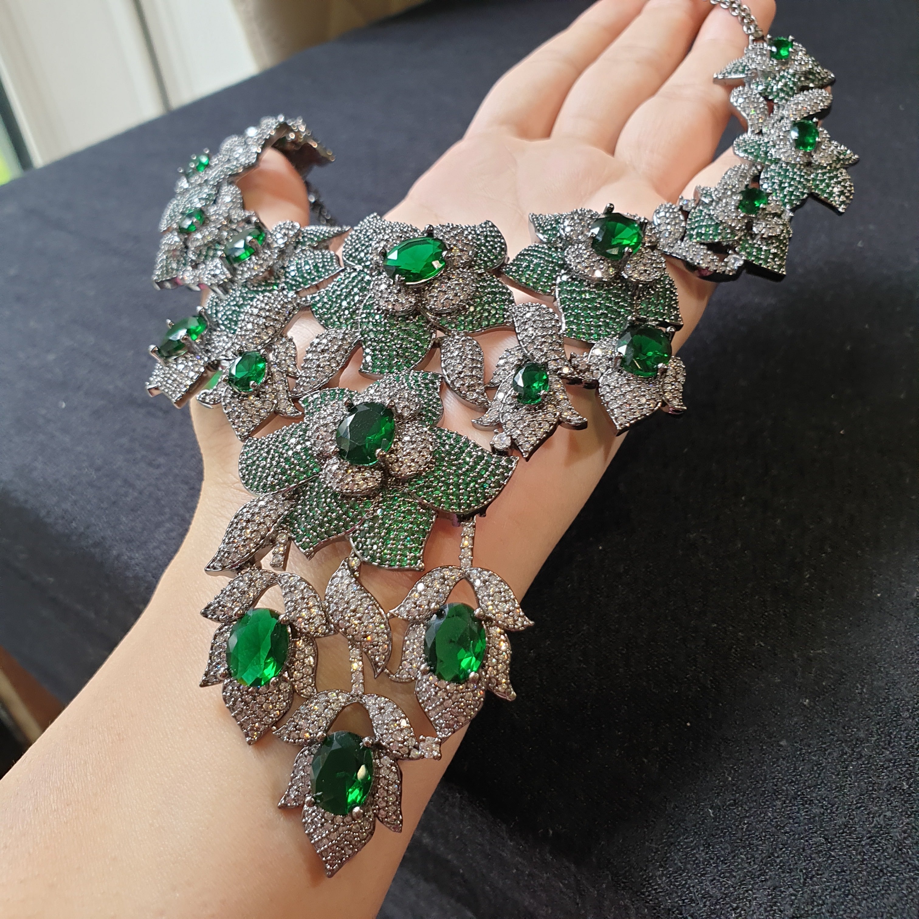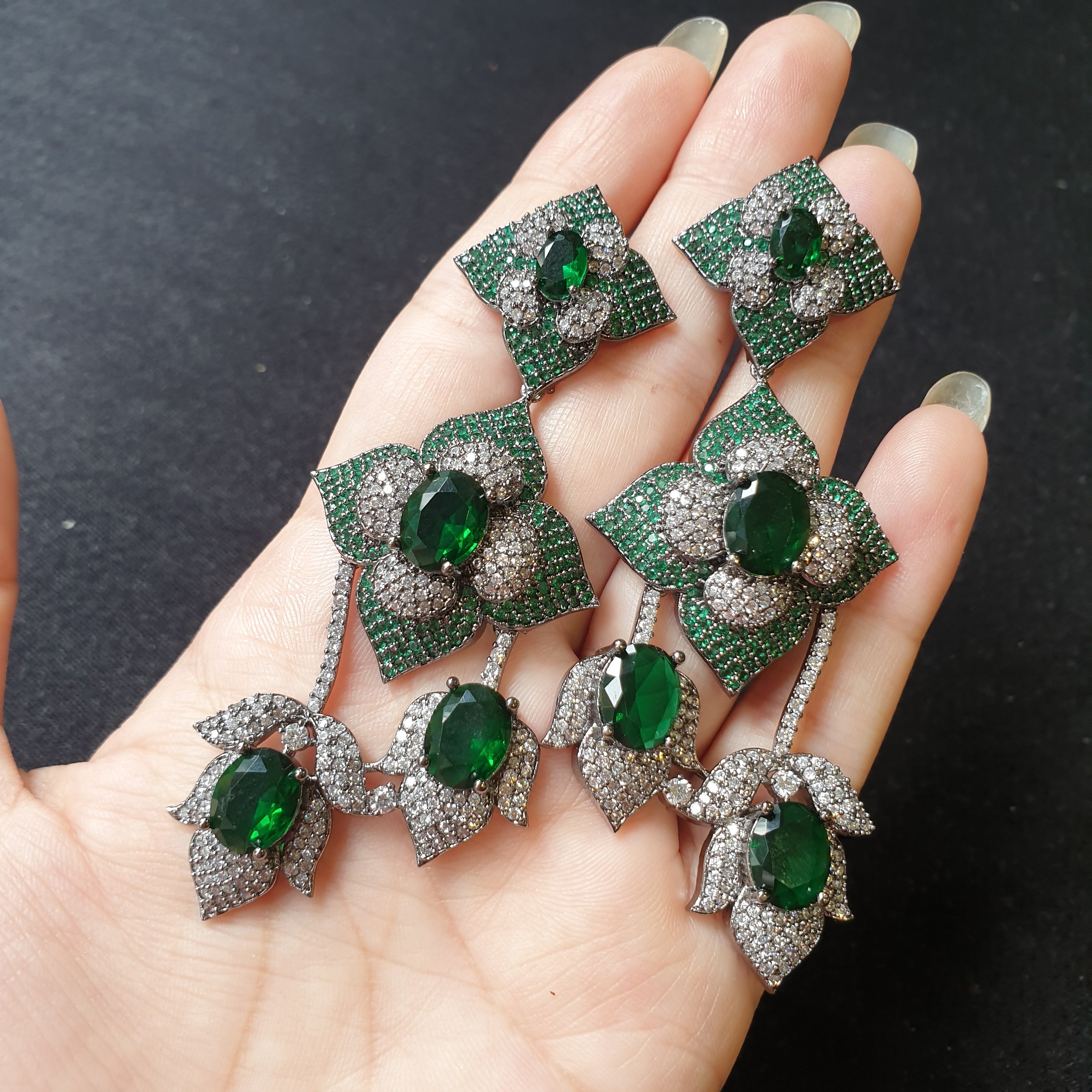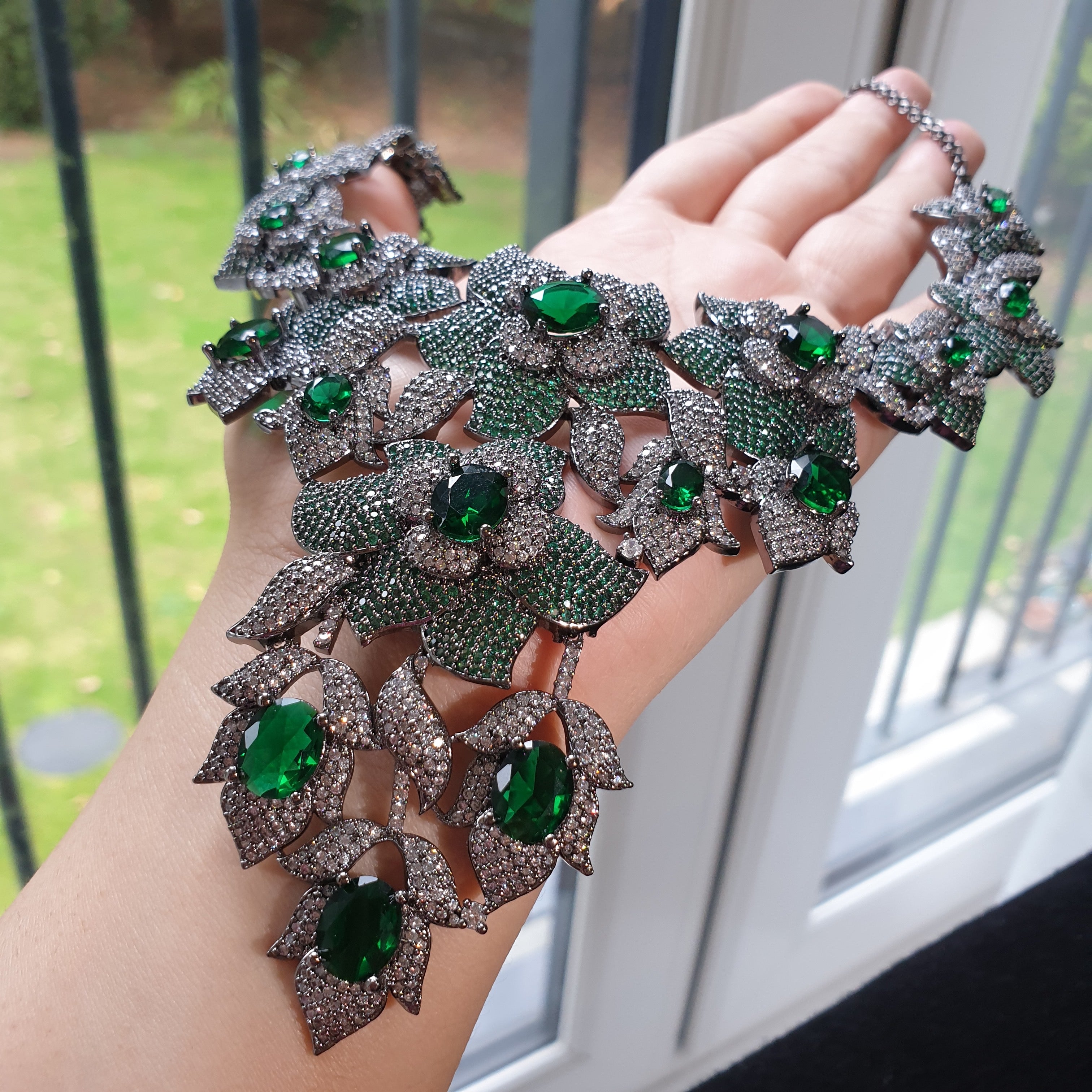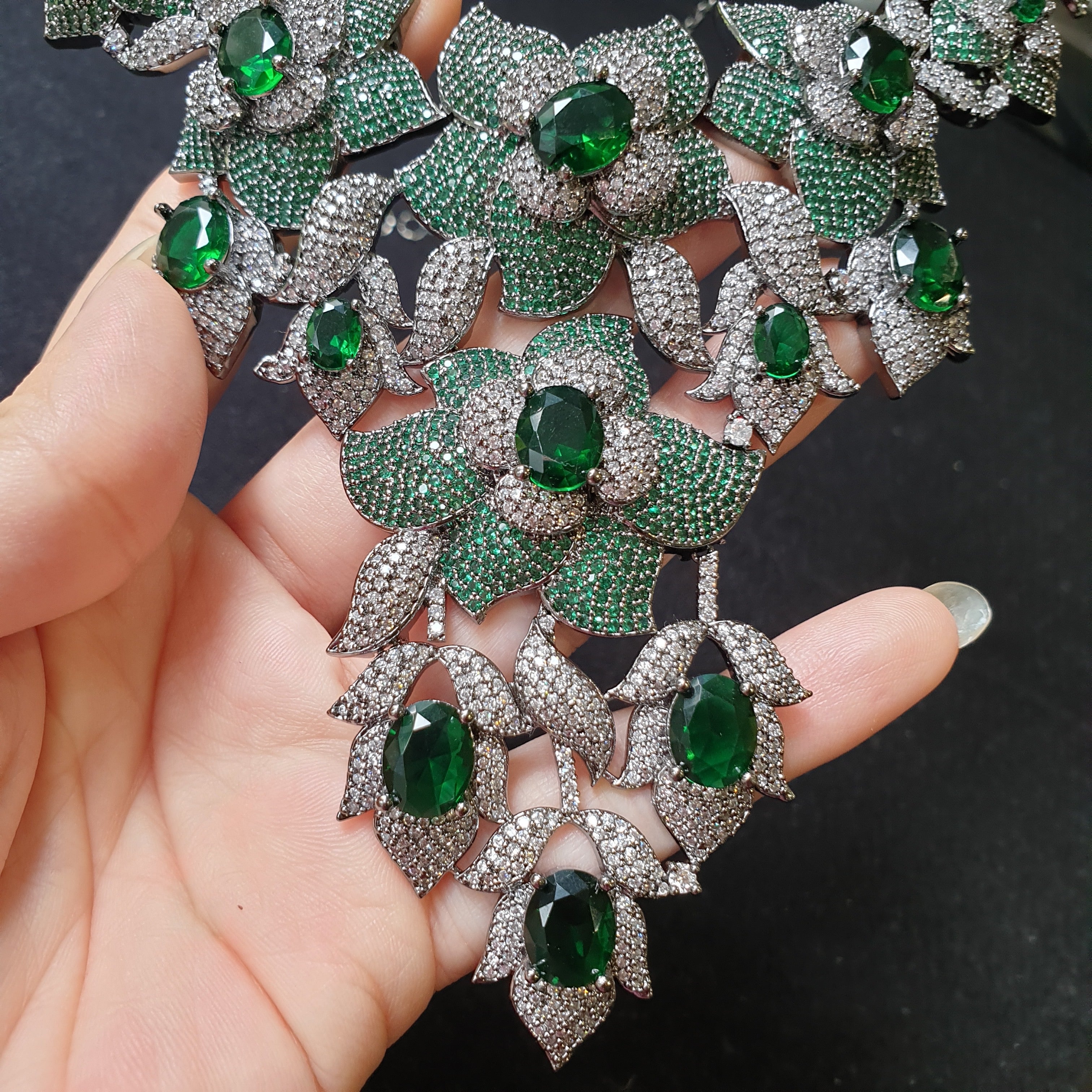 This stunning necklace set features lab-created emeralds, exhibiting a rich green hue with exceptional clarity and brilliance. These gemstones are meticulously cut to enhance their natural beauty, offering a luxurious yet sustainable alternative to natural emeralds.