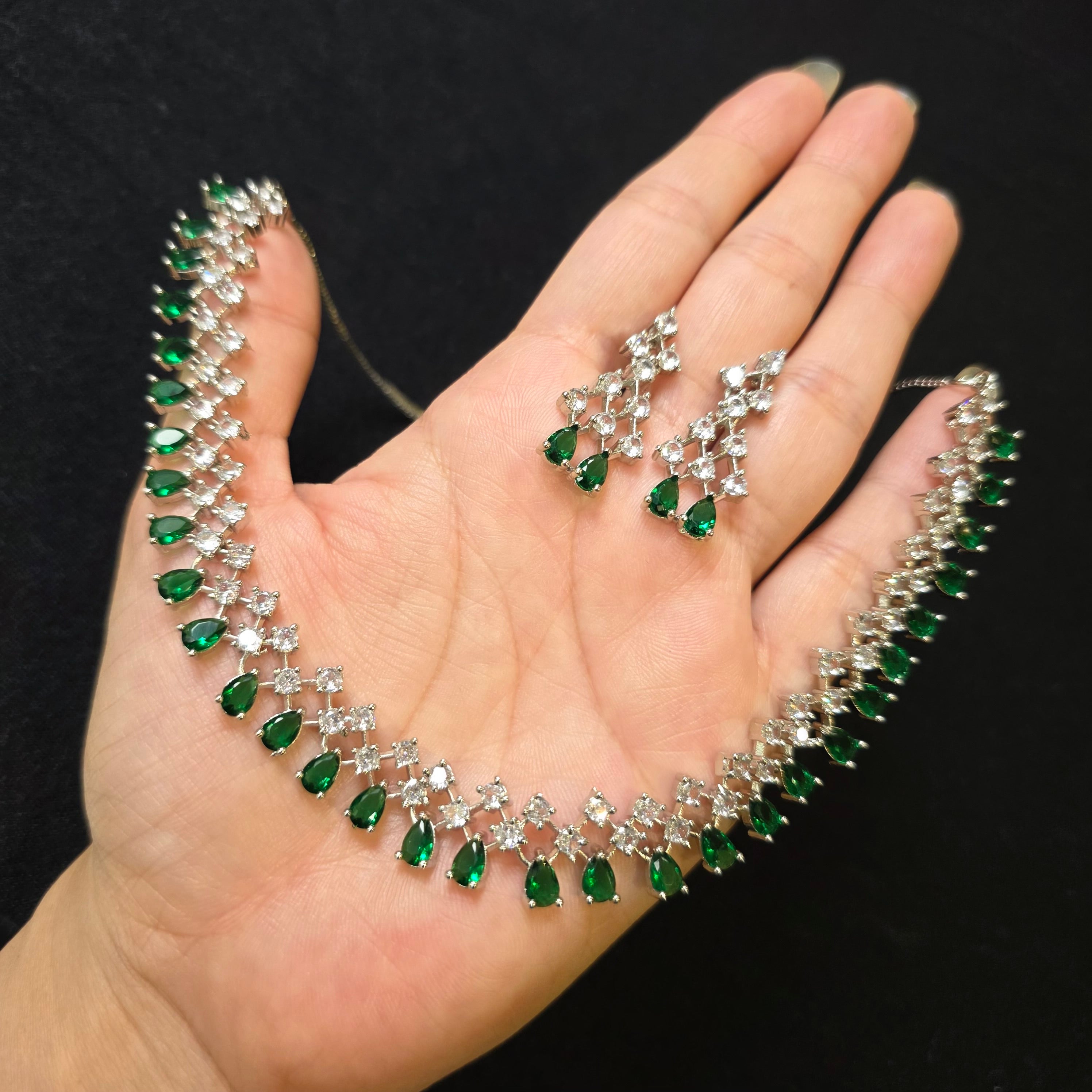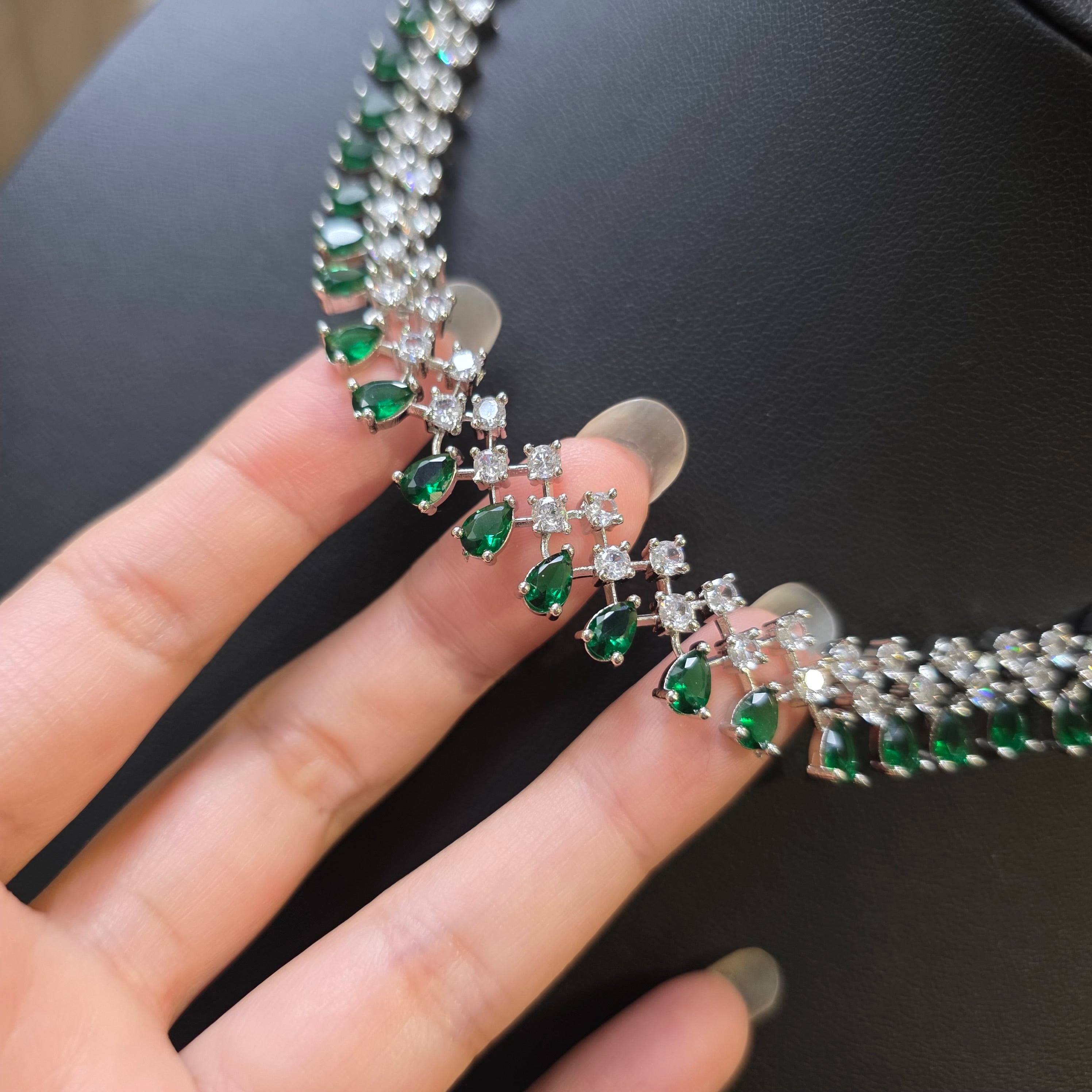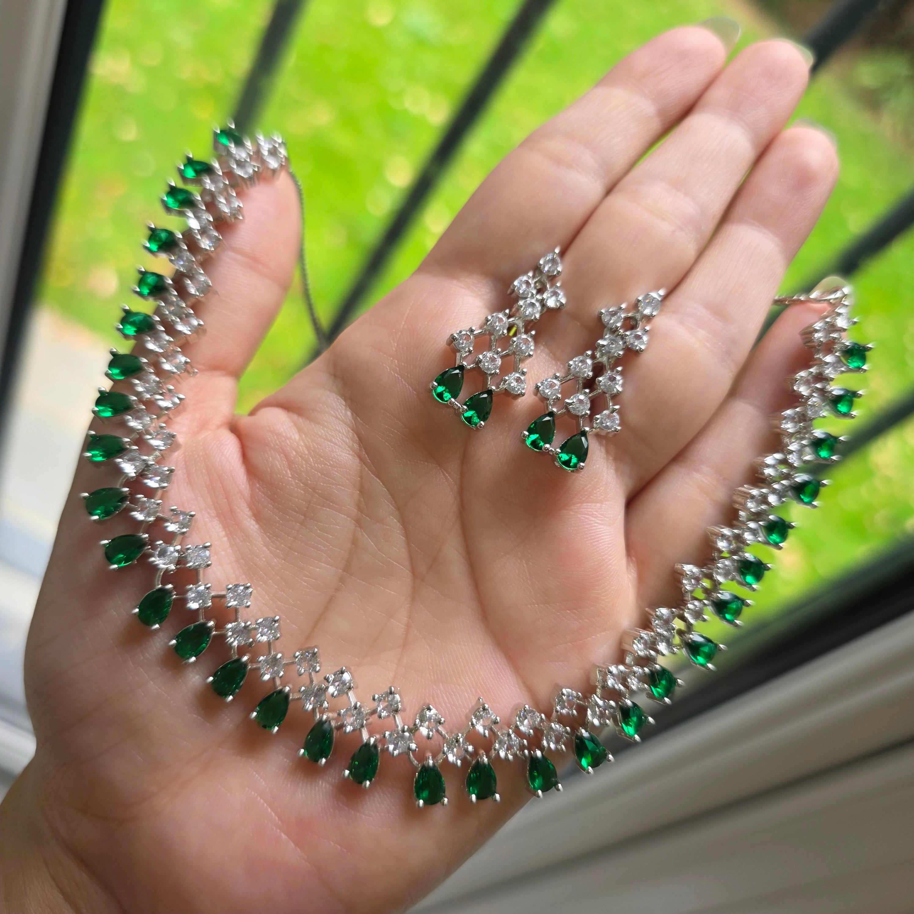 This elegant lab-made emeralds necklace set features vibrant green emerald gemstones, expertly crafted for exceptional brilliance and clarity. Accentuated with sparkling cubic zirconia stones, the design enhances its sophistication and charm. Plated in white gold, this set offers a luxurious shine and lasting durability. Perfect for special occasions or adding a touch of timeless beauty to any outfit, this set exudes elegance and refinement.