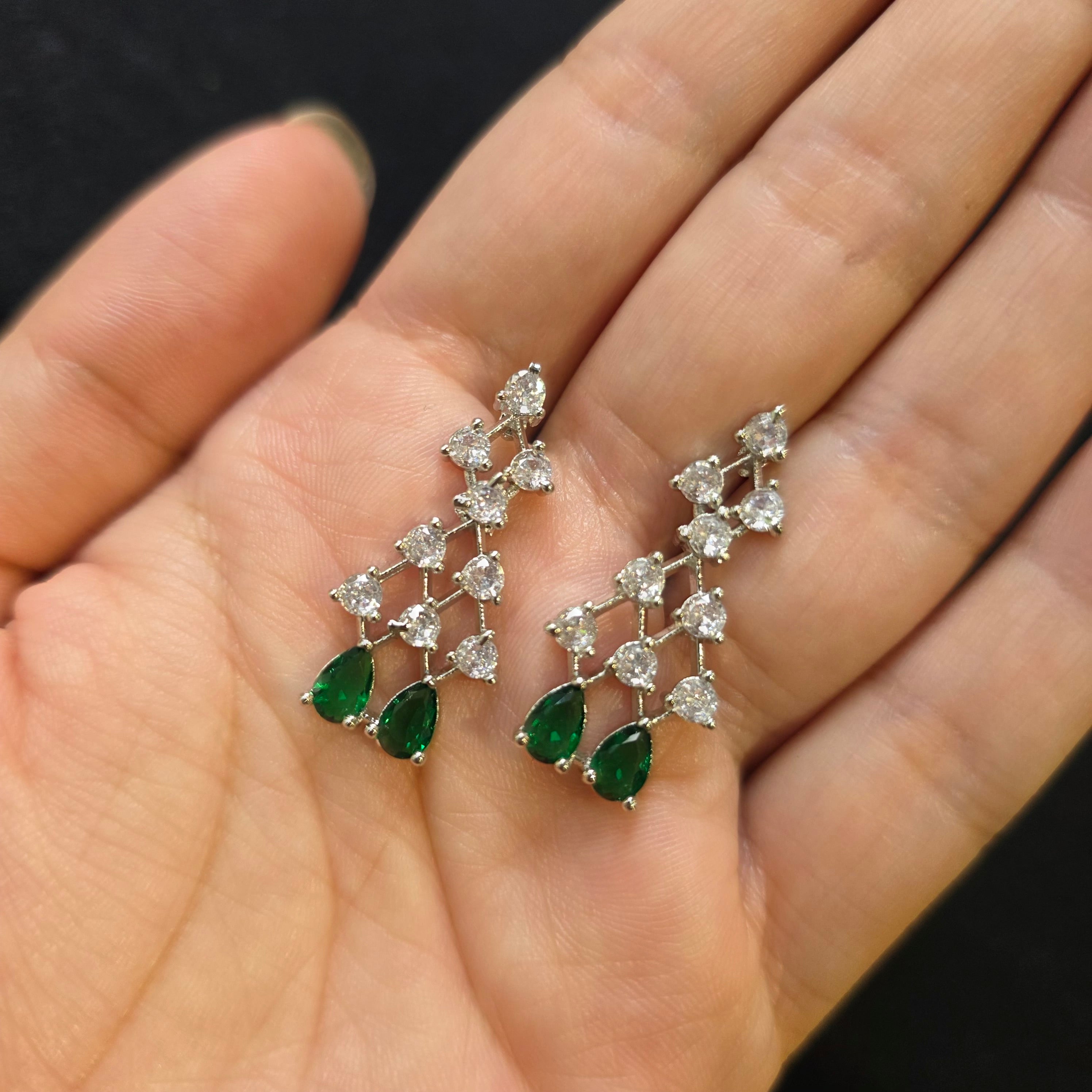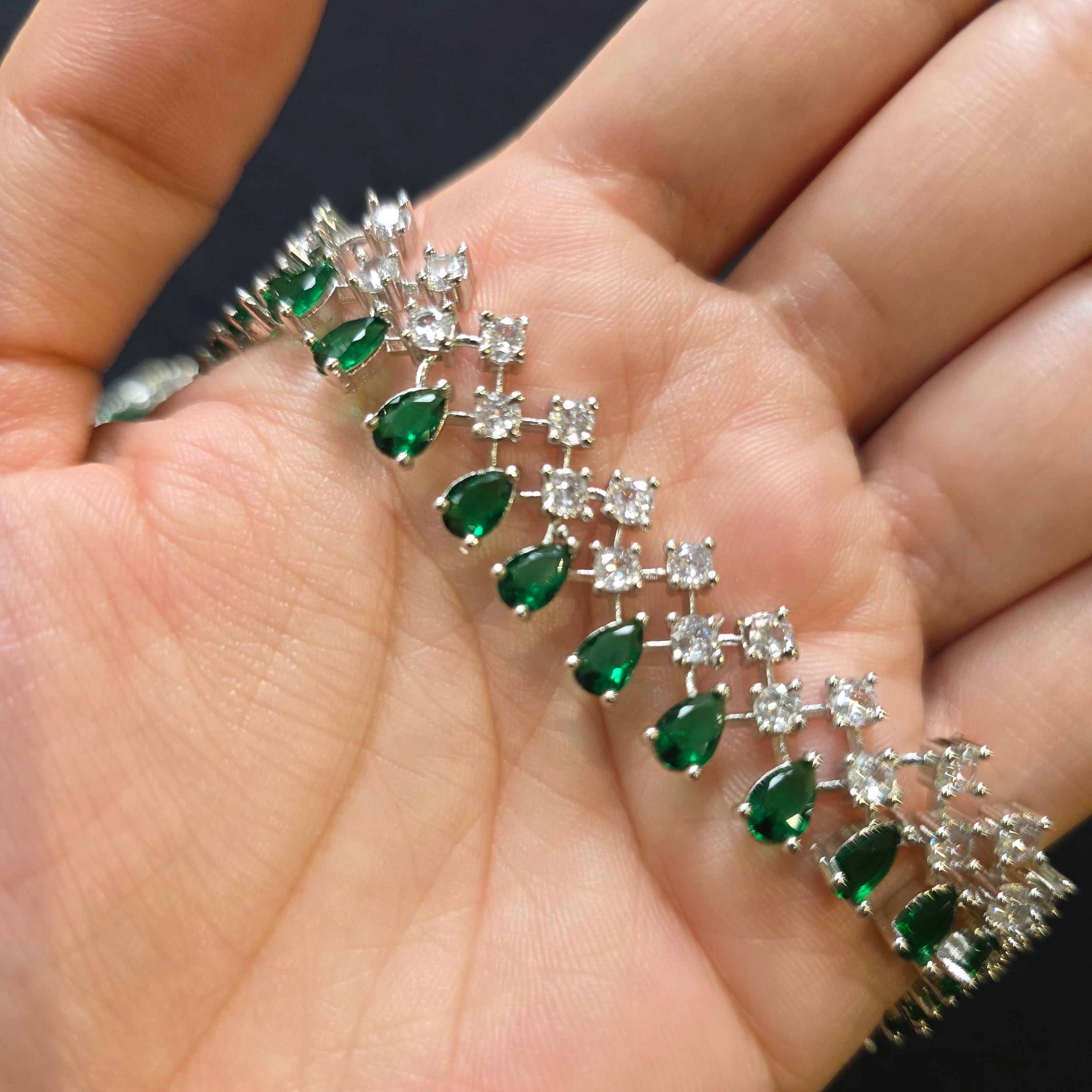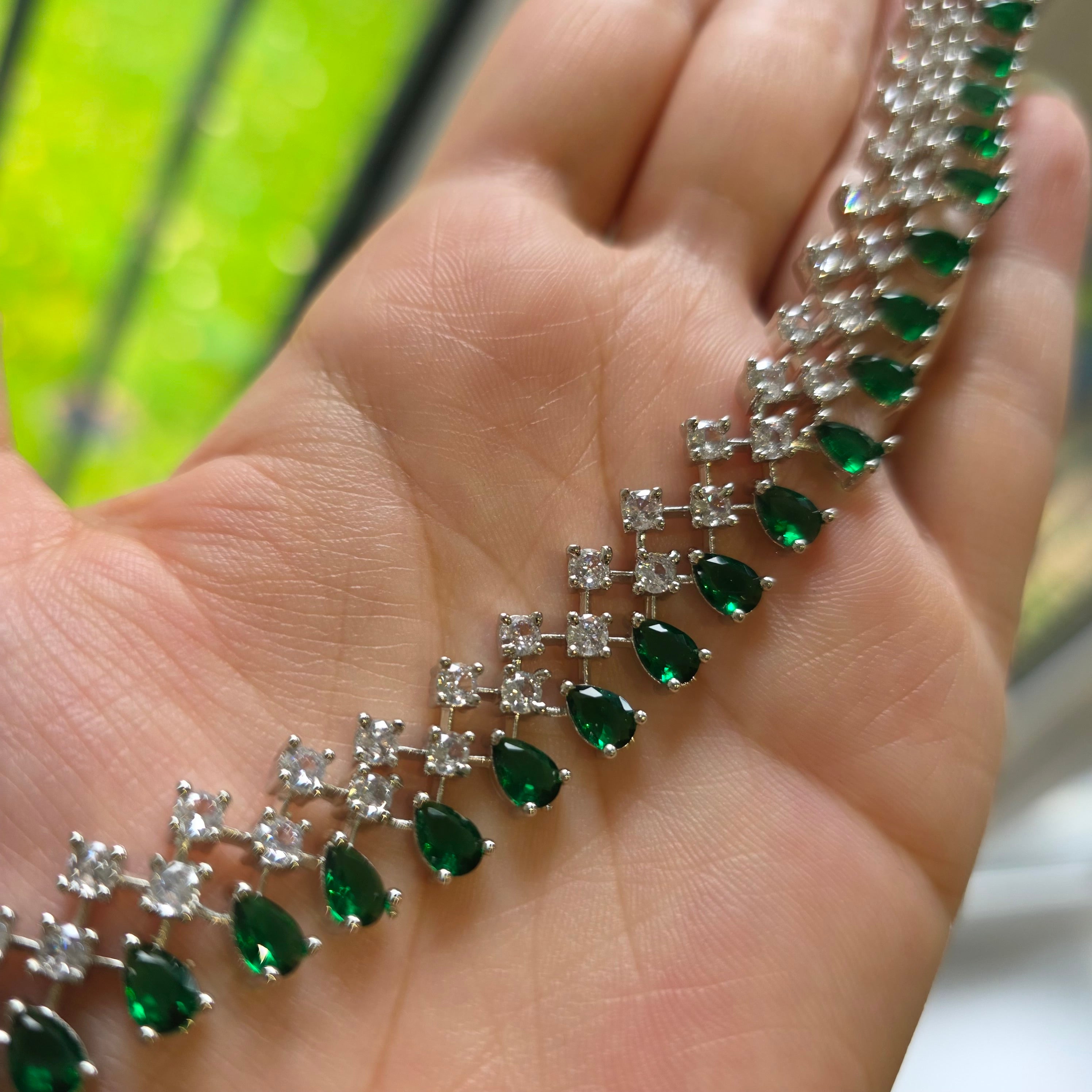 This elegant lab-made emeralds necklace set features vibrant green emerald gemstones, expertly crafted for exceptional brilliance and clarity. Accentuated with sparkling cubic zirconia stones, the design enhances its sophistication and charm. Plated in white gold, this set offers a luxurious shine and lasting durability. Perfect for special occasions or adding a touch of timeless beauty to any outfit, this set exudes elegance and refinement.