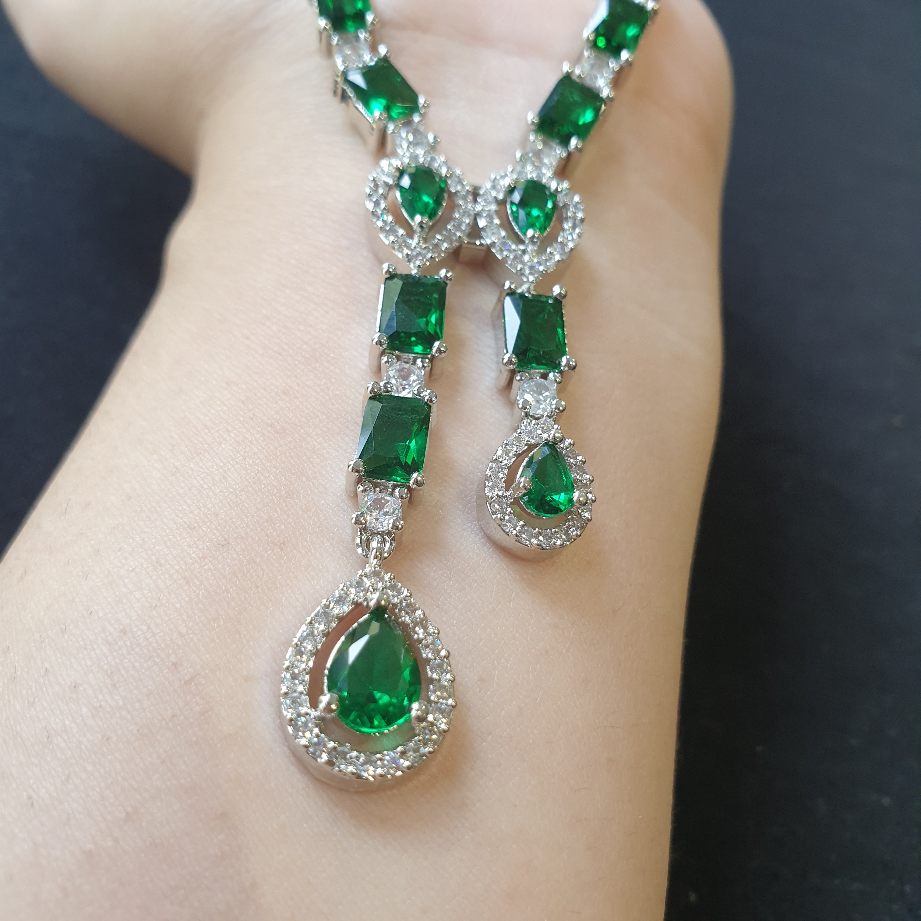 This elegant lab-made emeralds necklace set features vibrant green emerald gemstones, expertly crafted for exceptional clarity and brilliance. The emeralds are beautifully complemented by sparkling cubic zirconia accents, enhancing the set’s radiance and sophistication. Plated in white gold, the set provides a luxurious finish with lasting shine and durability. Perfect for special occasions or adding a touch of timeless beauty to any ensemble, this set exudes grace, elegance, and refined charm.