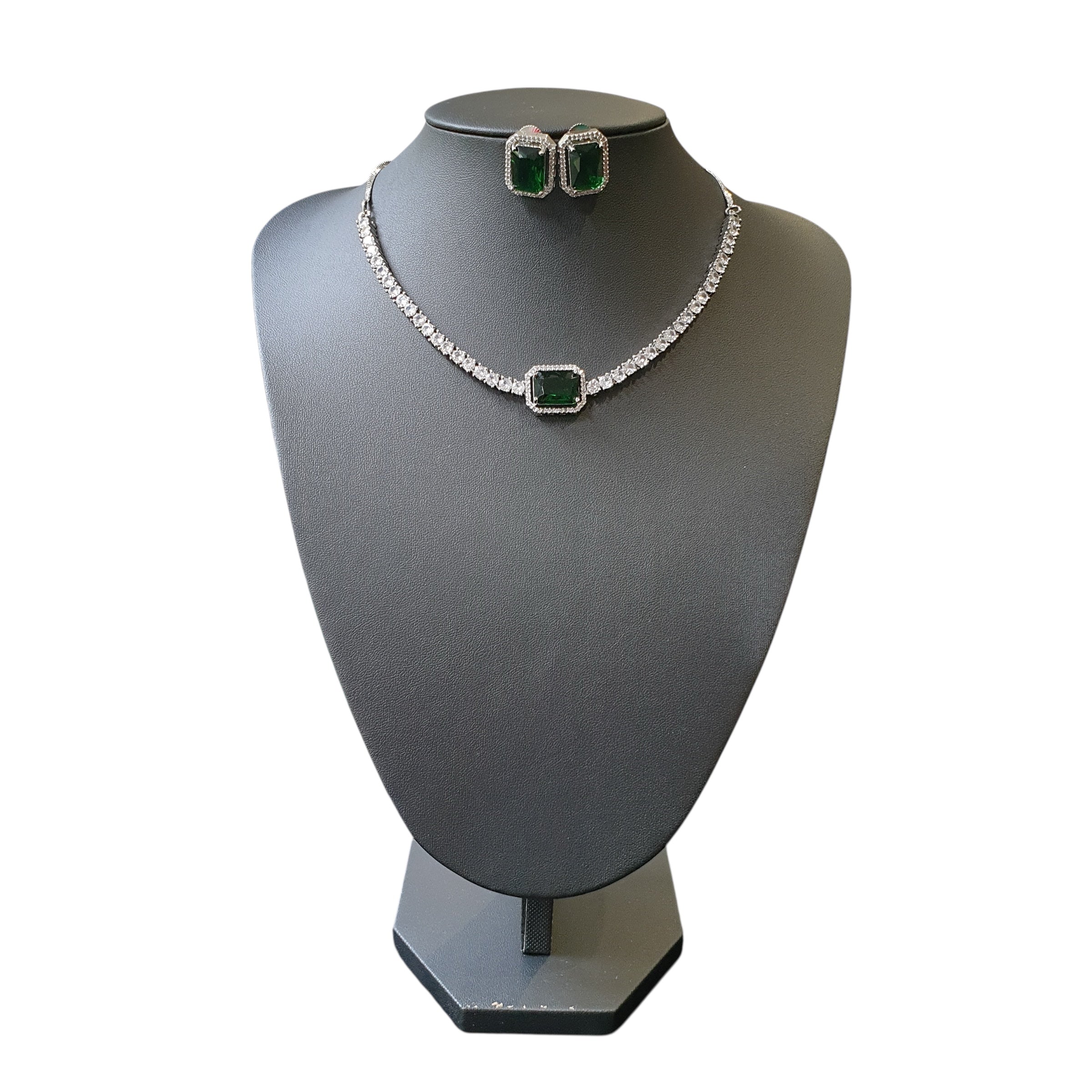 Radiate timeless elegance with this exquisite lab-grown emerald necklace set, crafted to capture the richness of classic emerald green. The vibrant lab-created emeralds are beautifully complemented by the brilliance of cubic zirconia, all set in a sleek white gold-plated finish that adds luxury and durability.