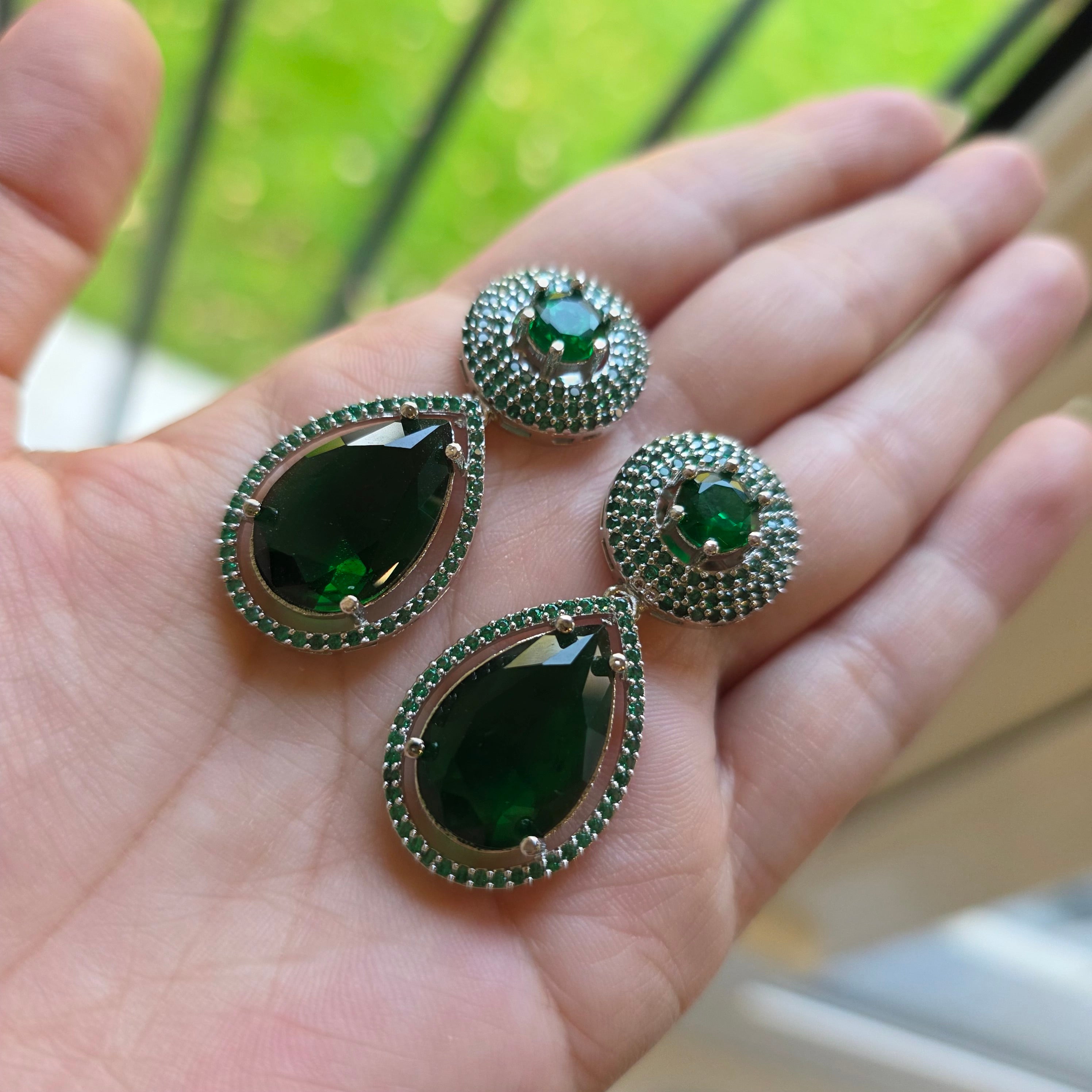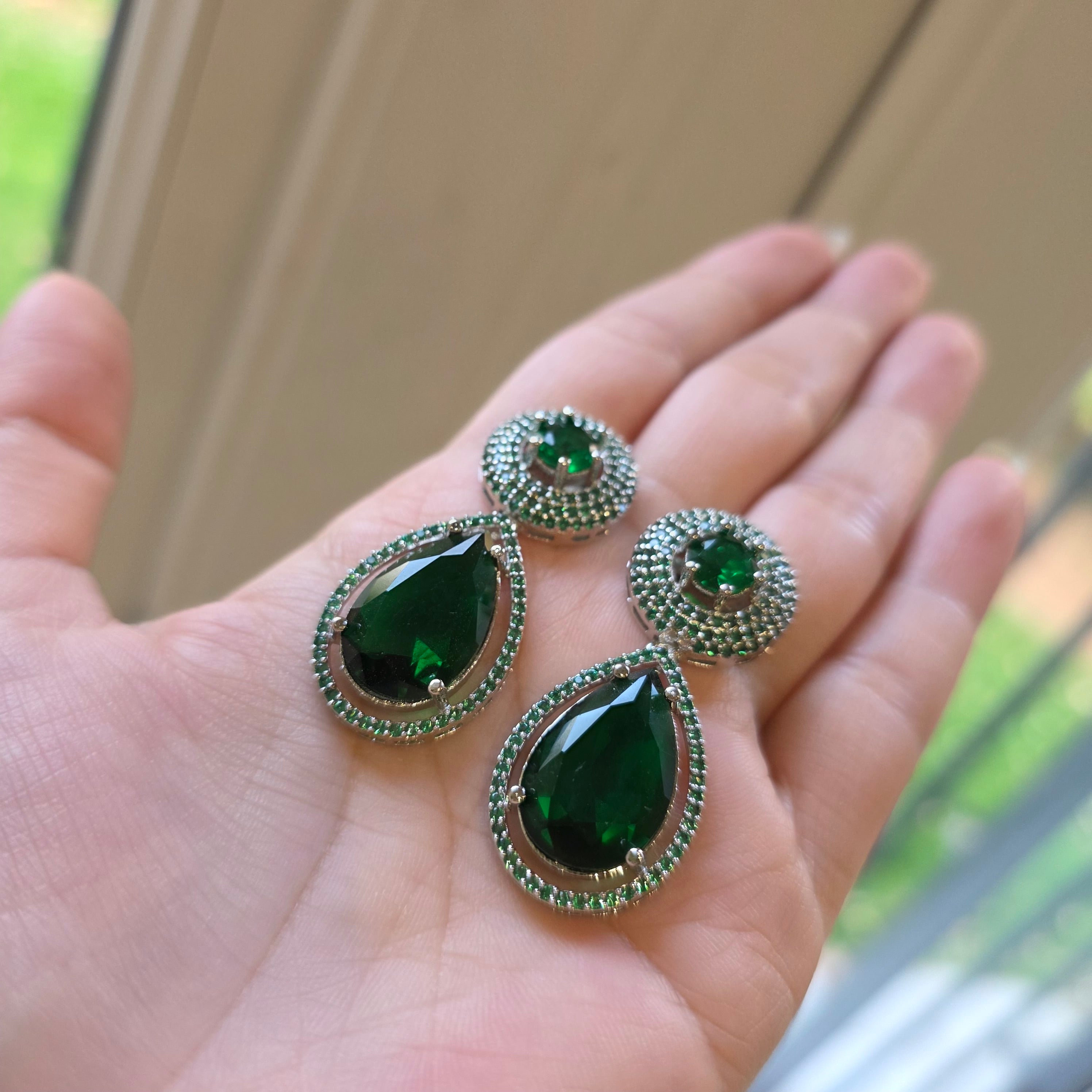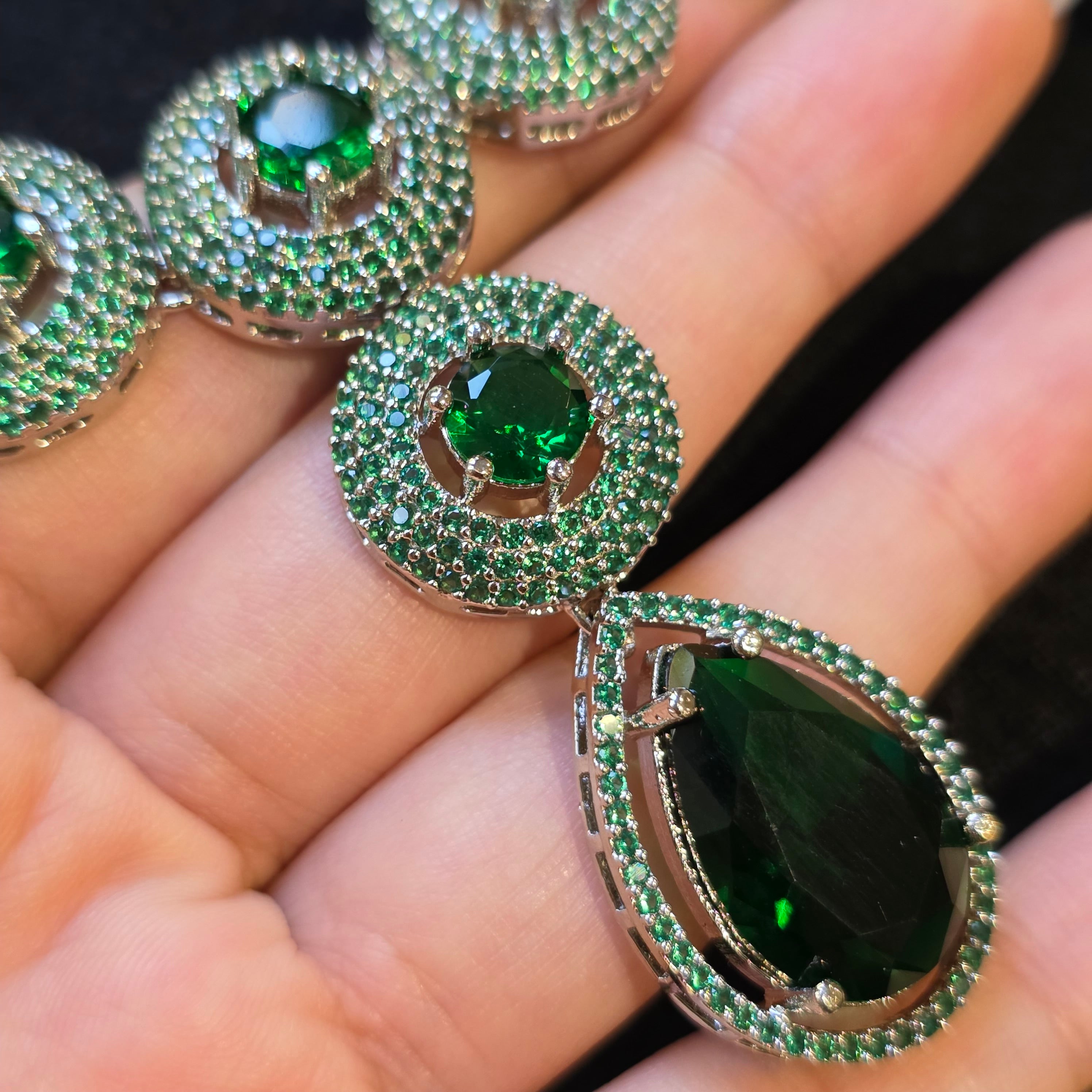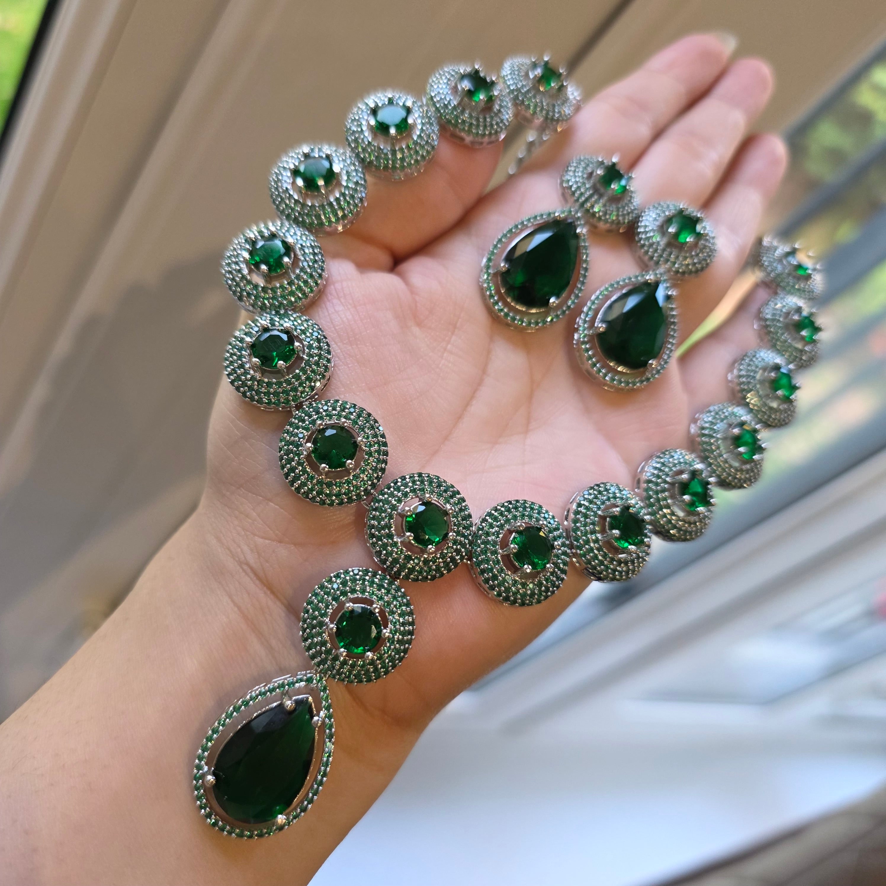 This elegant necklace set features a stunning combination of emerald green stones and white gold plating, paired with intricate details of antique emerald green plating. Crafted with sparkling cubic zirconia accents and lab-made emeralds, the design exudes sophistication and timeless charm. The white gold-plated base ensures a radiant finish, while the antique plating adds a vintage-inspired touch. Perfect for formal occasions or as a statement piece, this set effortlessly combines modern elegance with classic appeal.