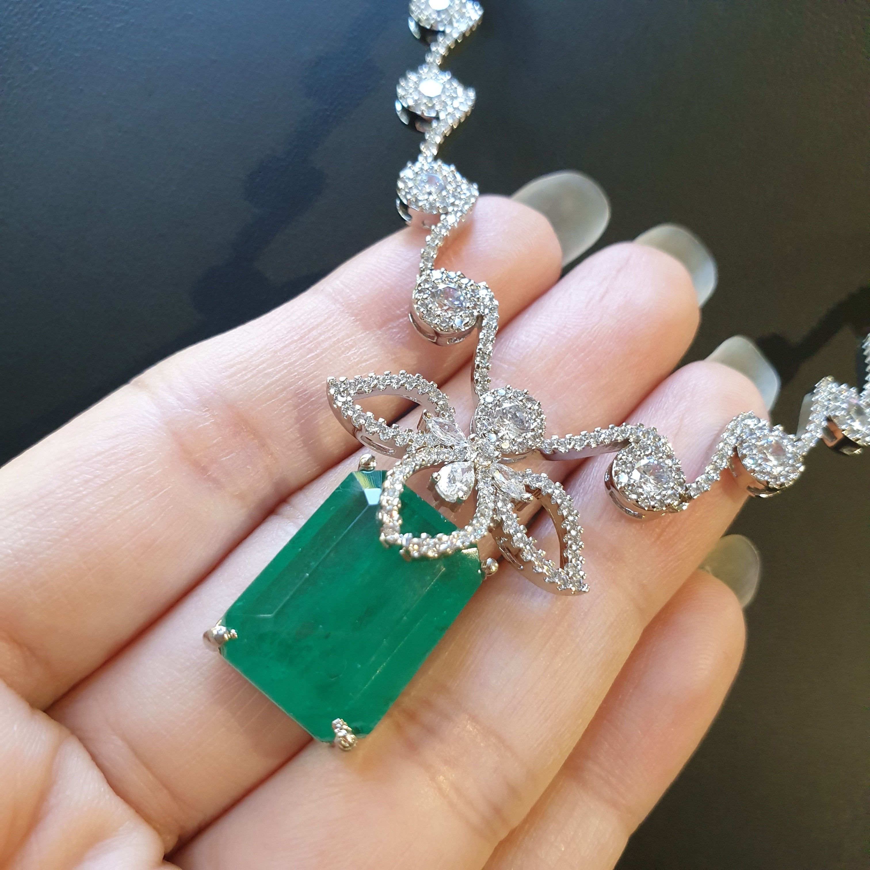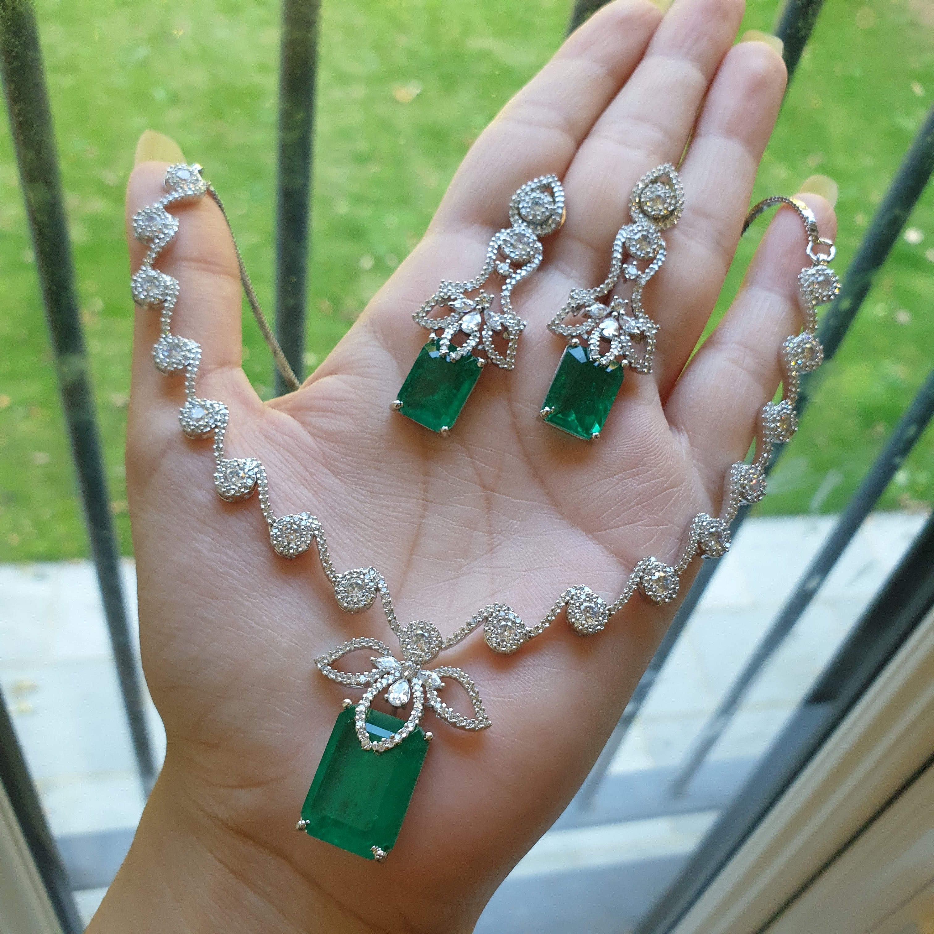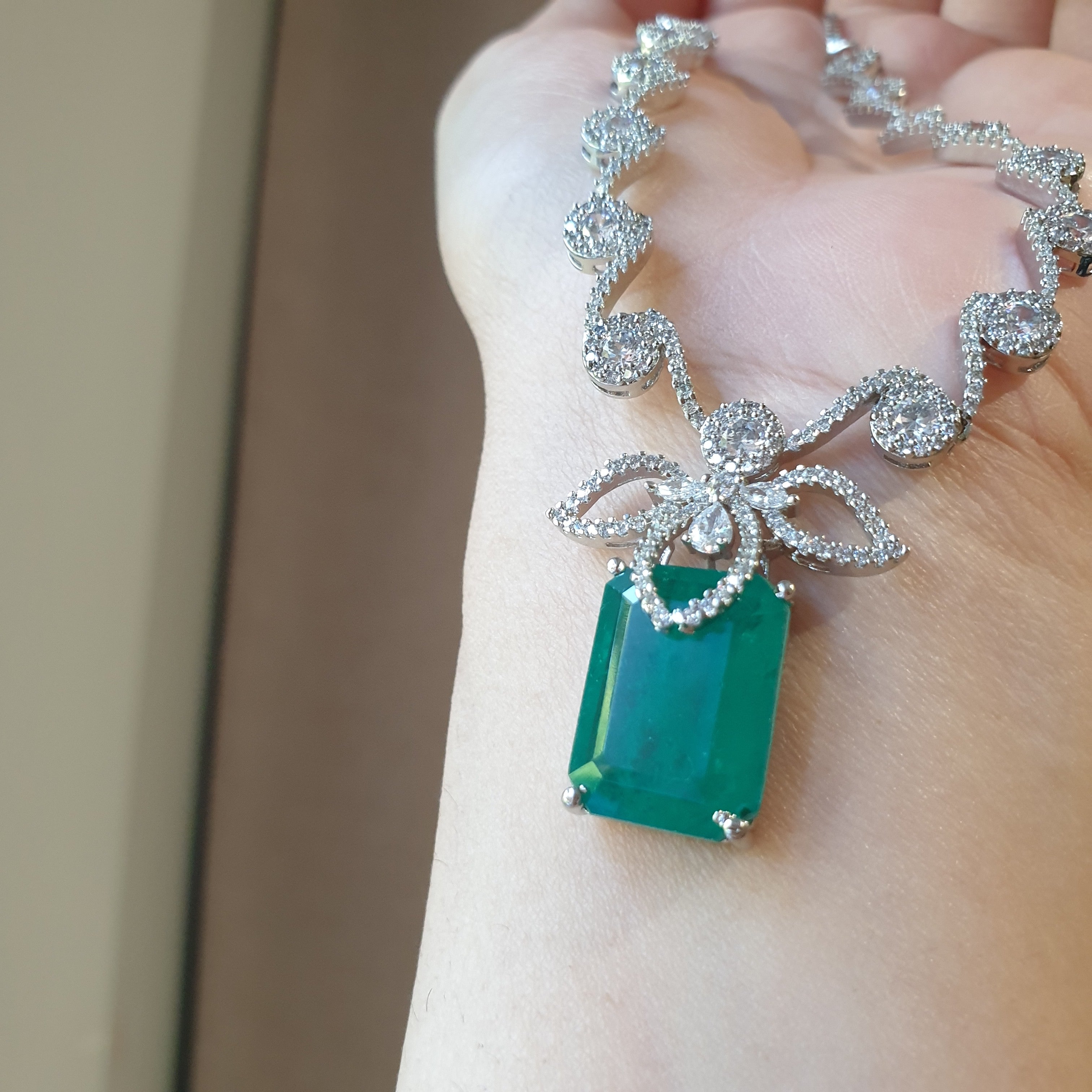 Make a bold and elegant statement with this stunning Emerald Green Necklace Set, designed to dazzle. Featuring a vivid emerald green center stone, each piece is beautifully accented with sparkling cubic zirconia and finished in sleek white gold plating for a timeless, high-end look.