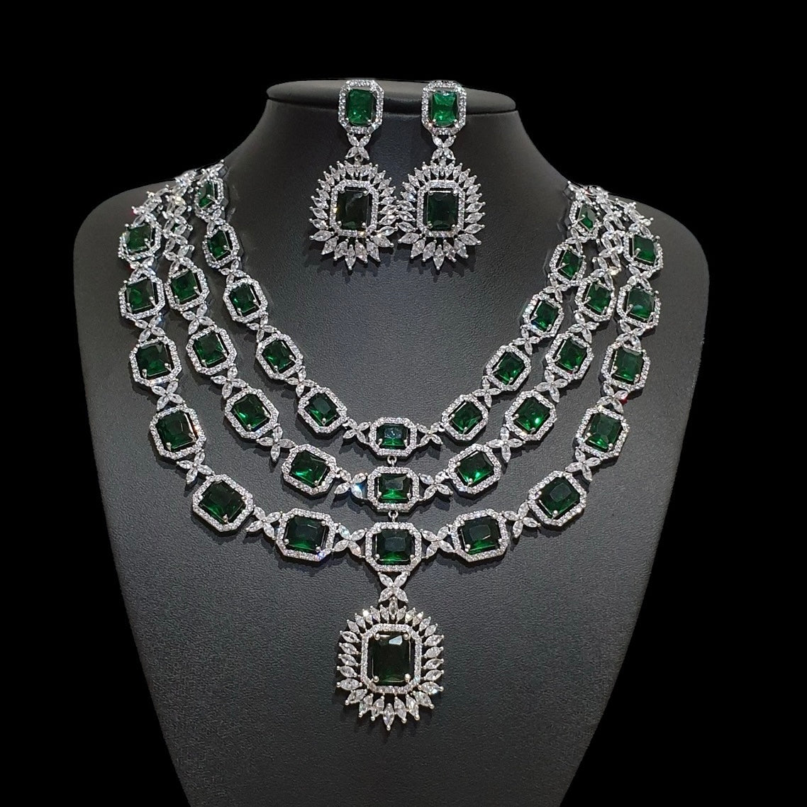 Make a bold yet refined statement with this exquisite emerald green necklace set, an embodiment of elegance and sophistication. The centerpiece of the necklace is a breathtaking emerald green stone, carefully cut to maximize its depth and brilliance. Surrounding the central gem are radiant cubic zirconia accents, artfully arranged to mimic the timeless beauty of diamonds, catching and reflecting light from every angle.