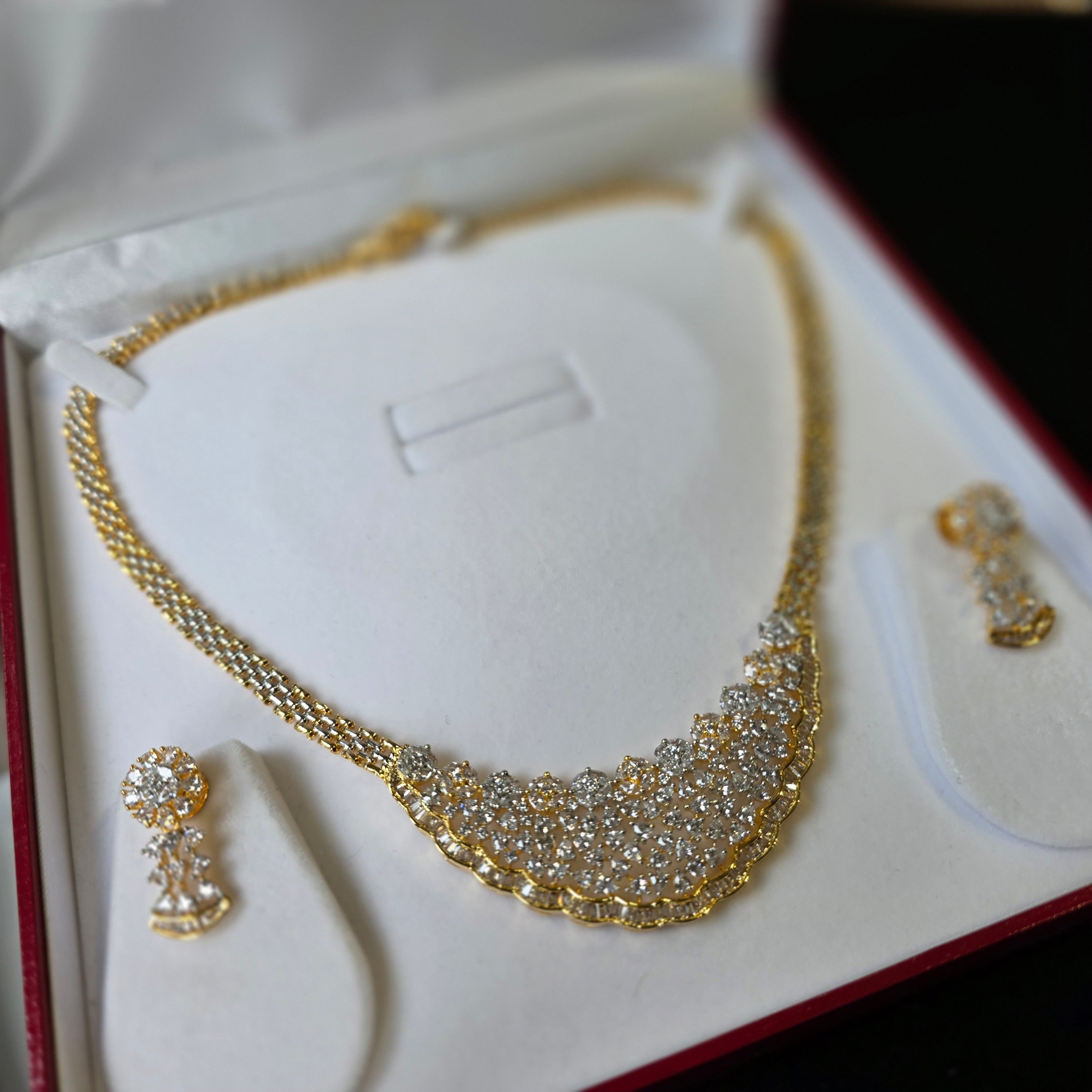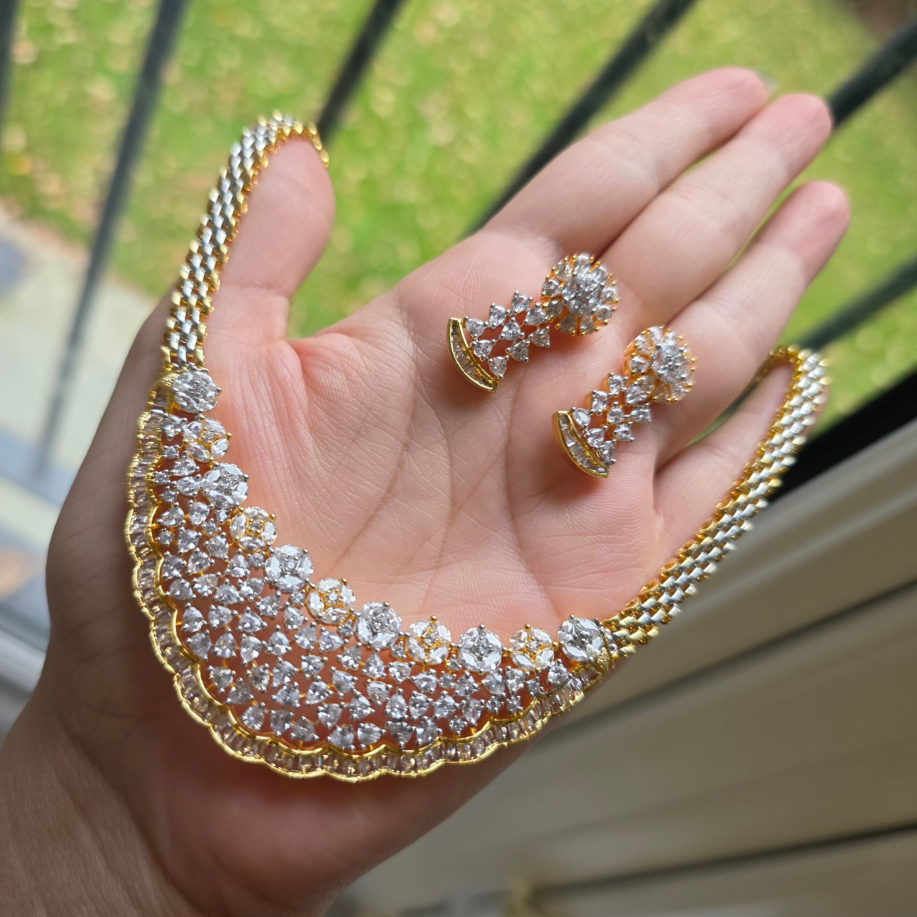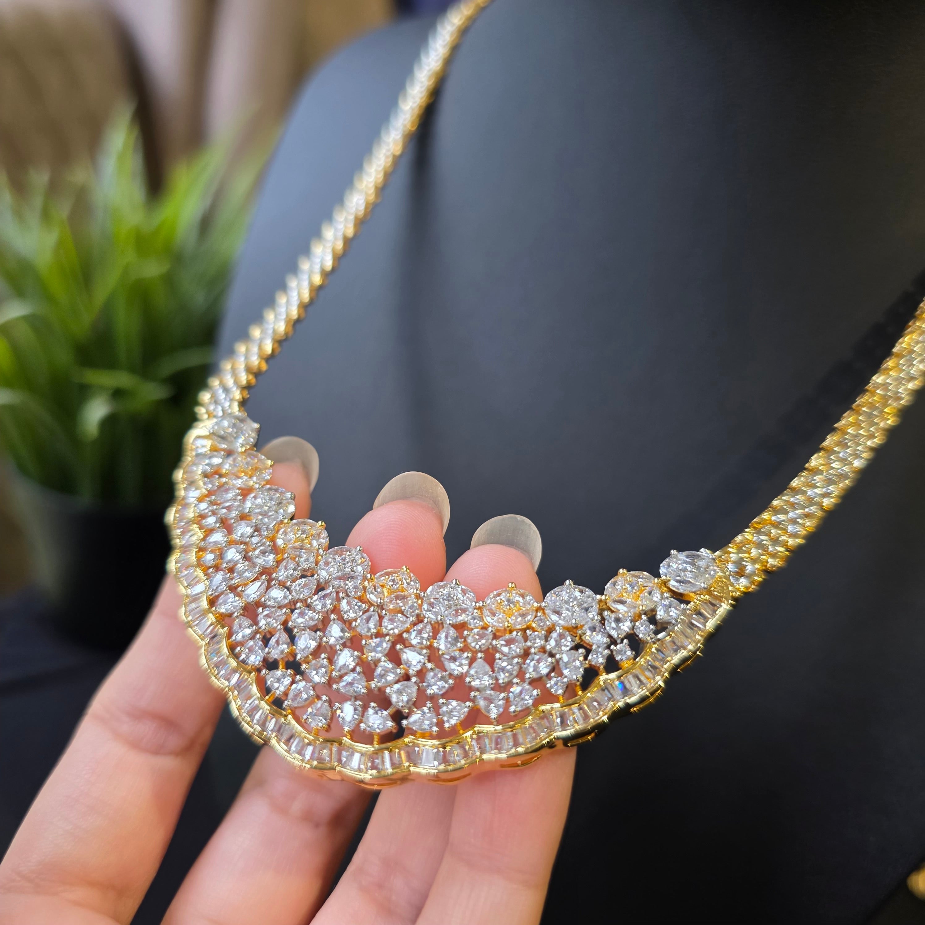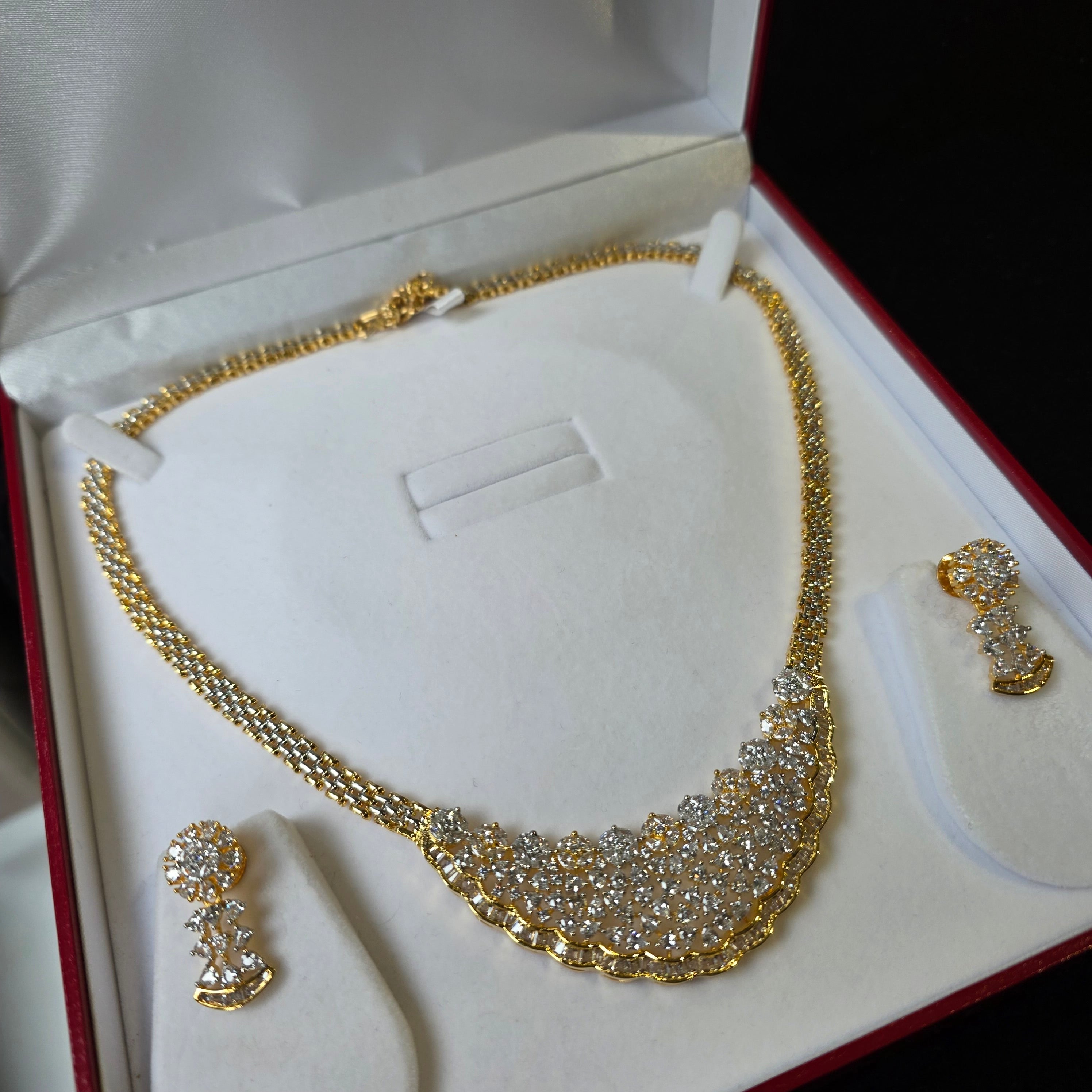 Dazzling piece featuring Finest Cubic Zirconia studded Necklace paired with matching Earrings.