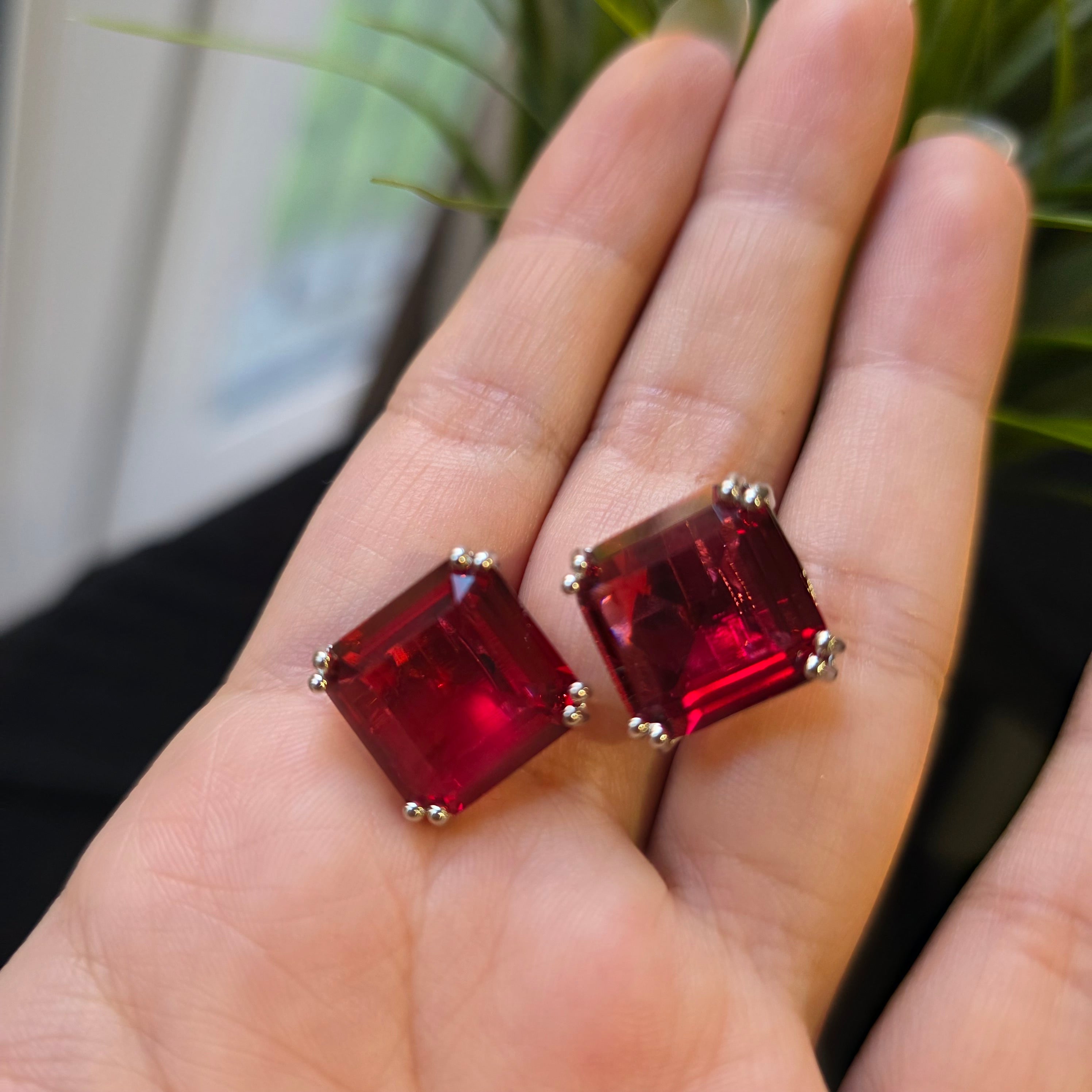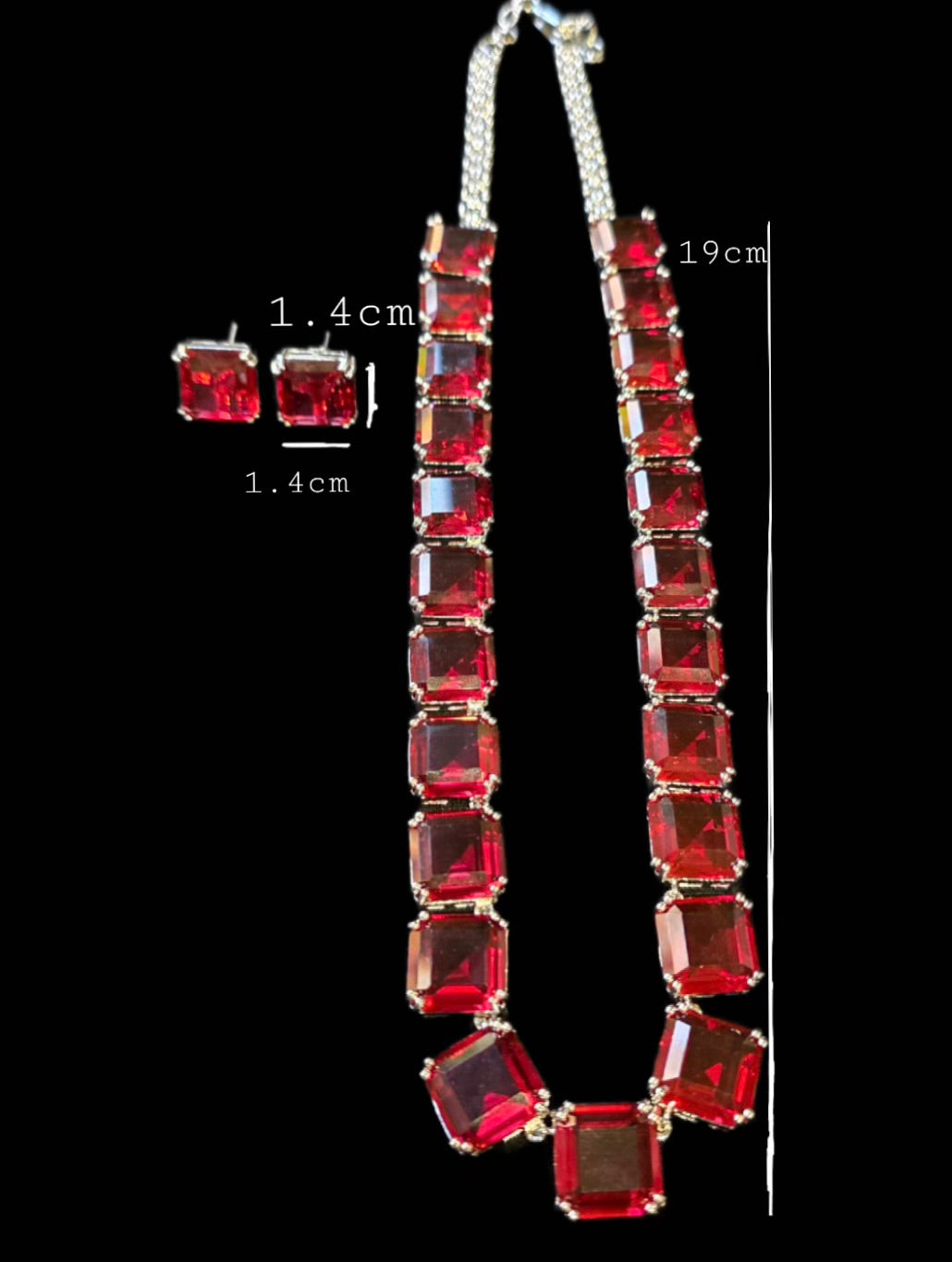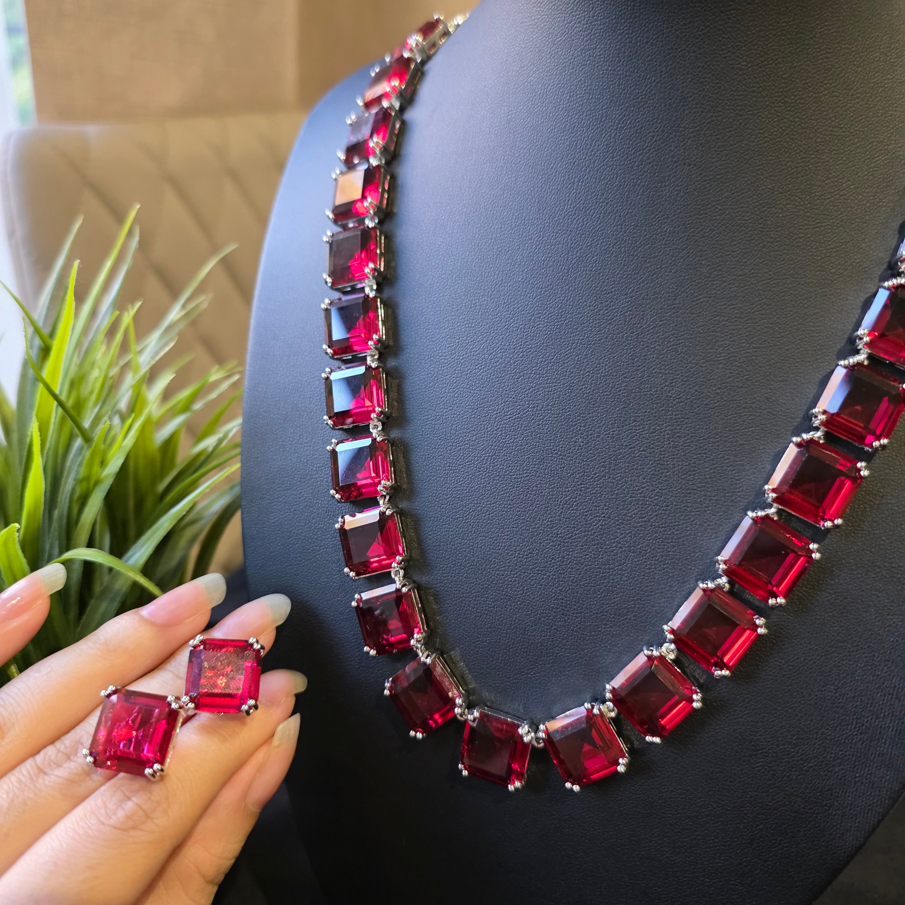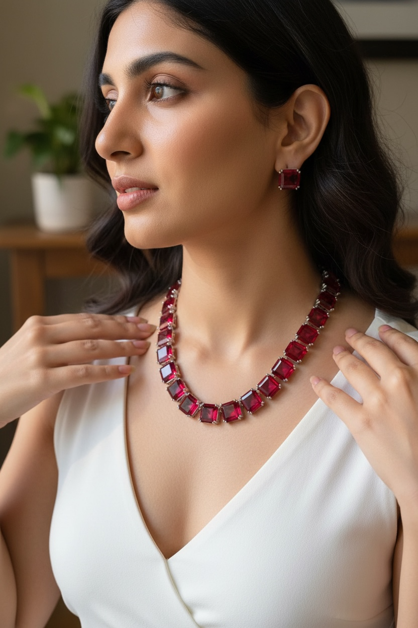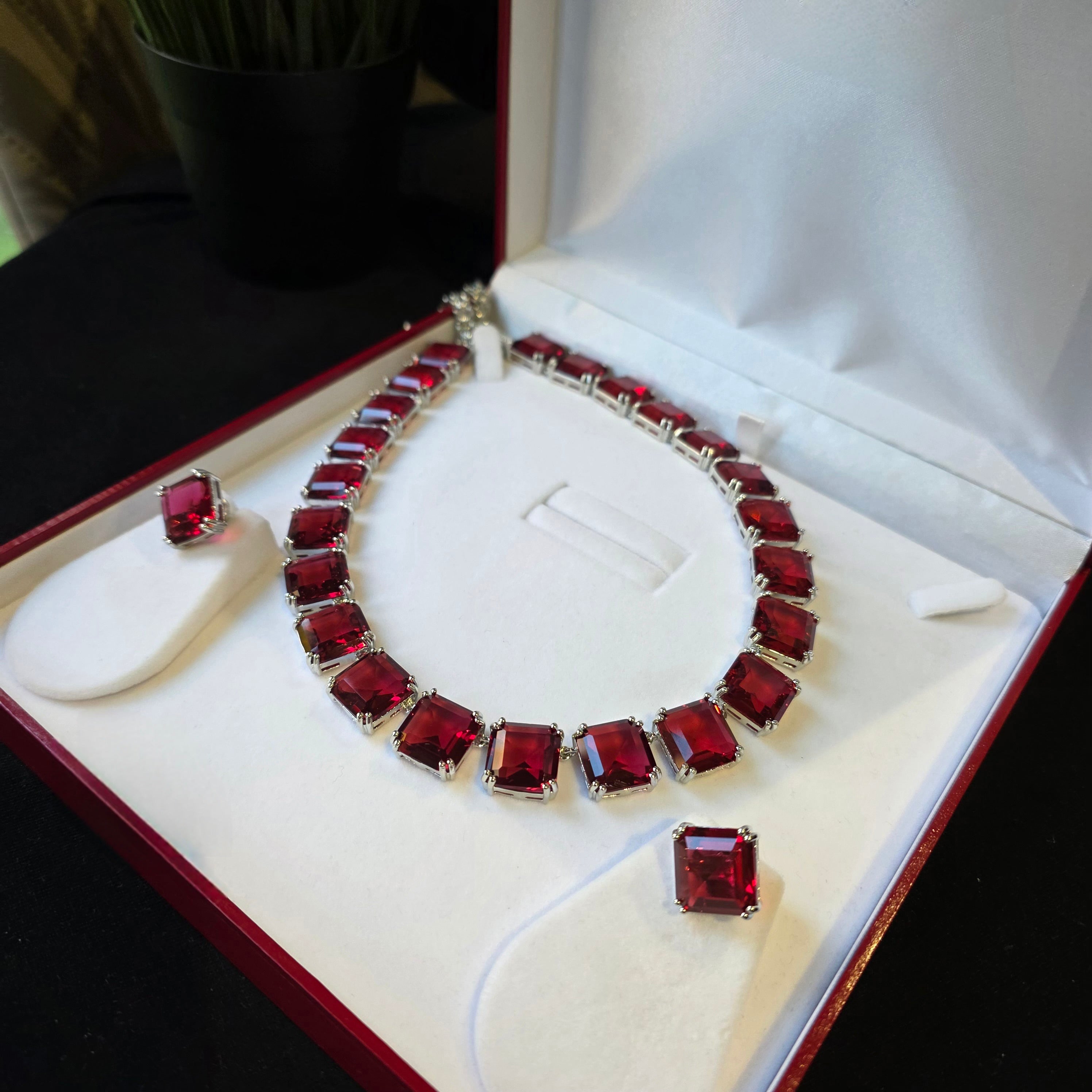 Introducing this exquisite piece featuring fiery Red Rubies (lab-made) Necklace paired with matching Earrings.