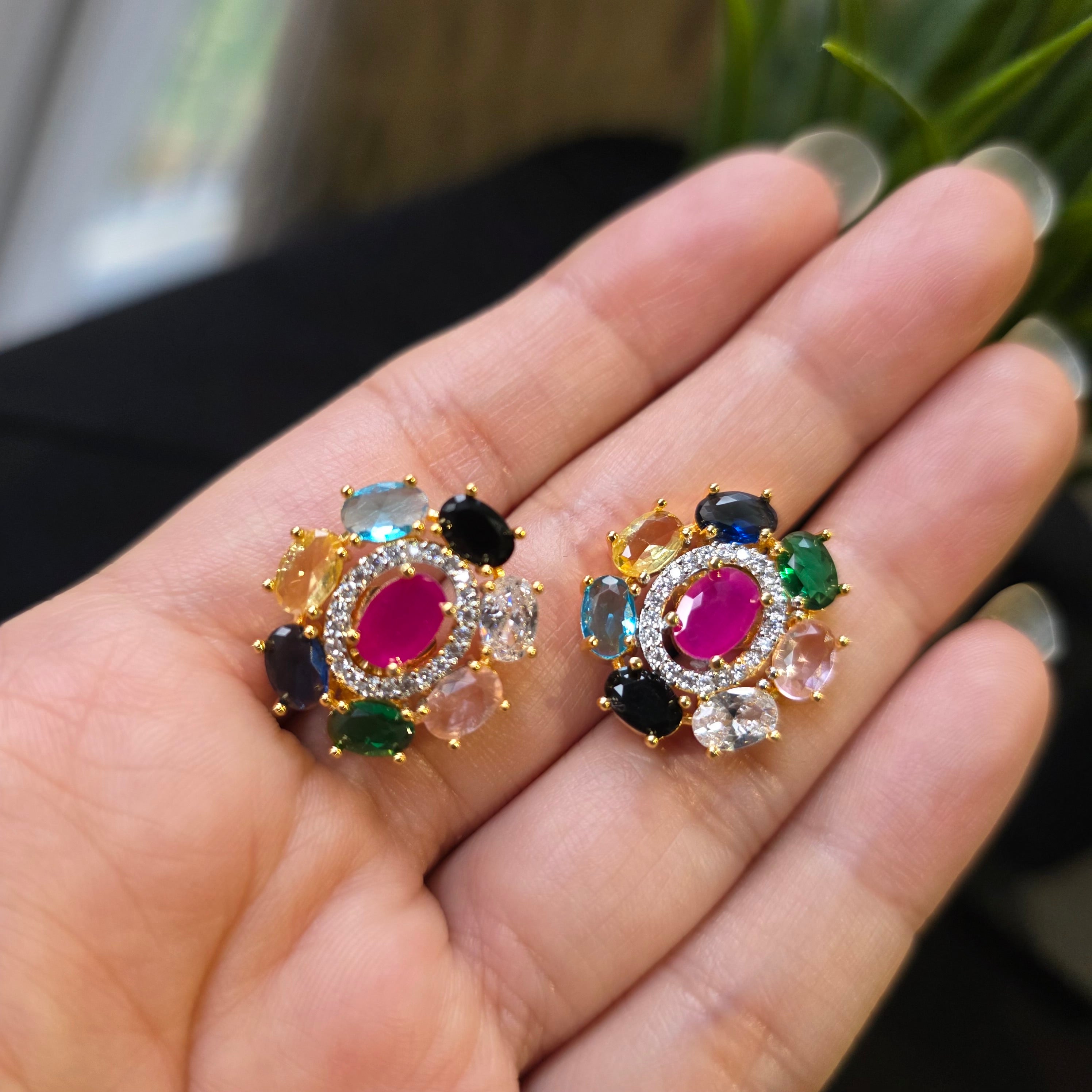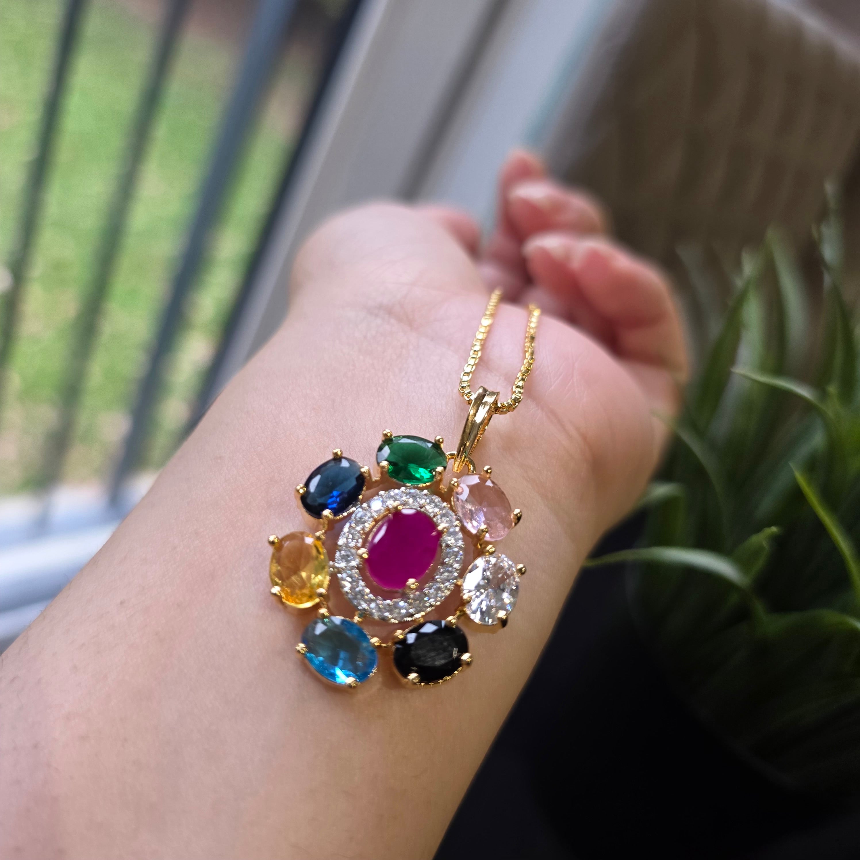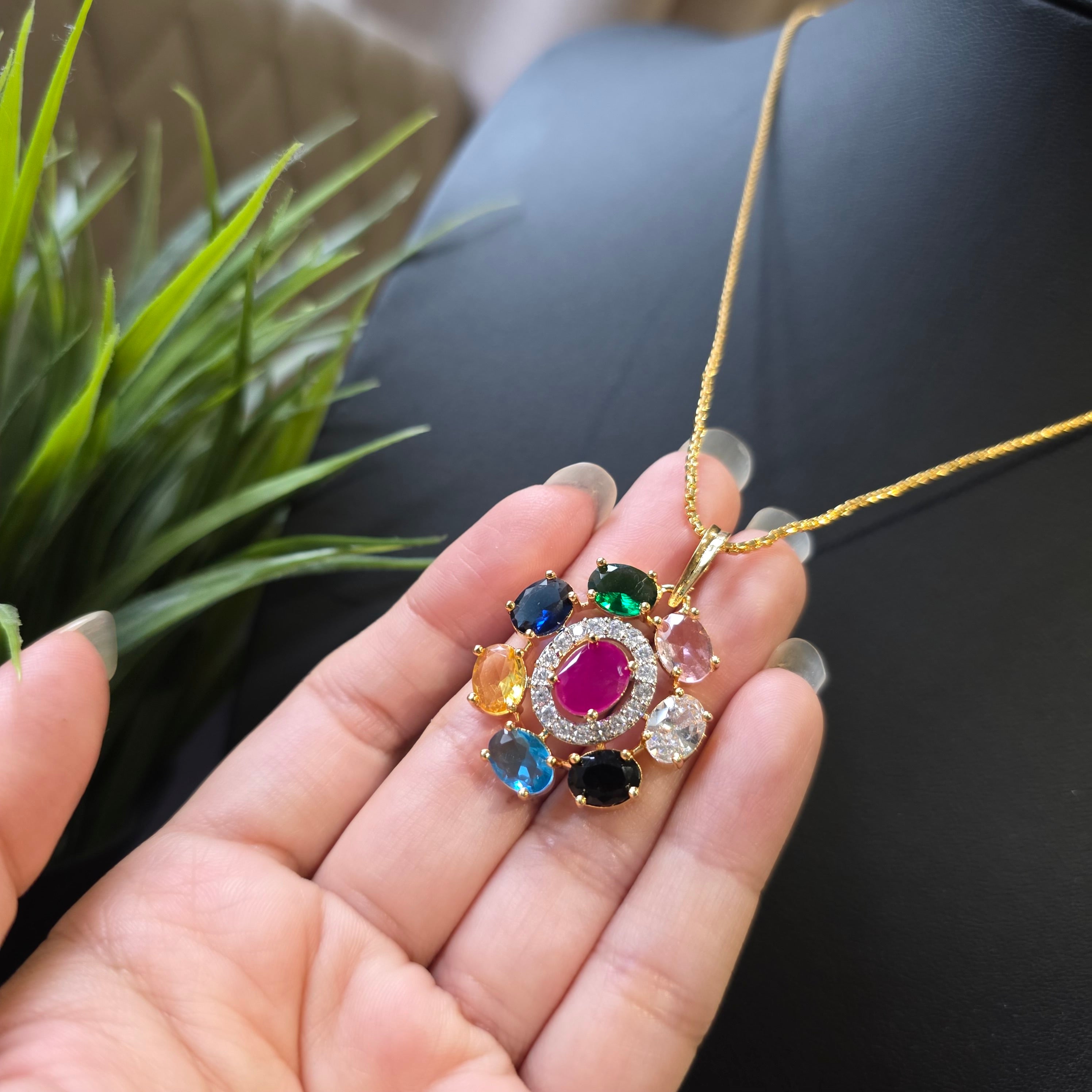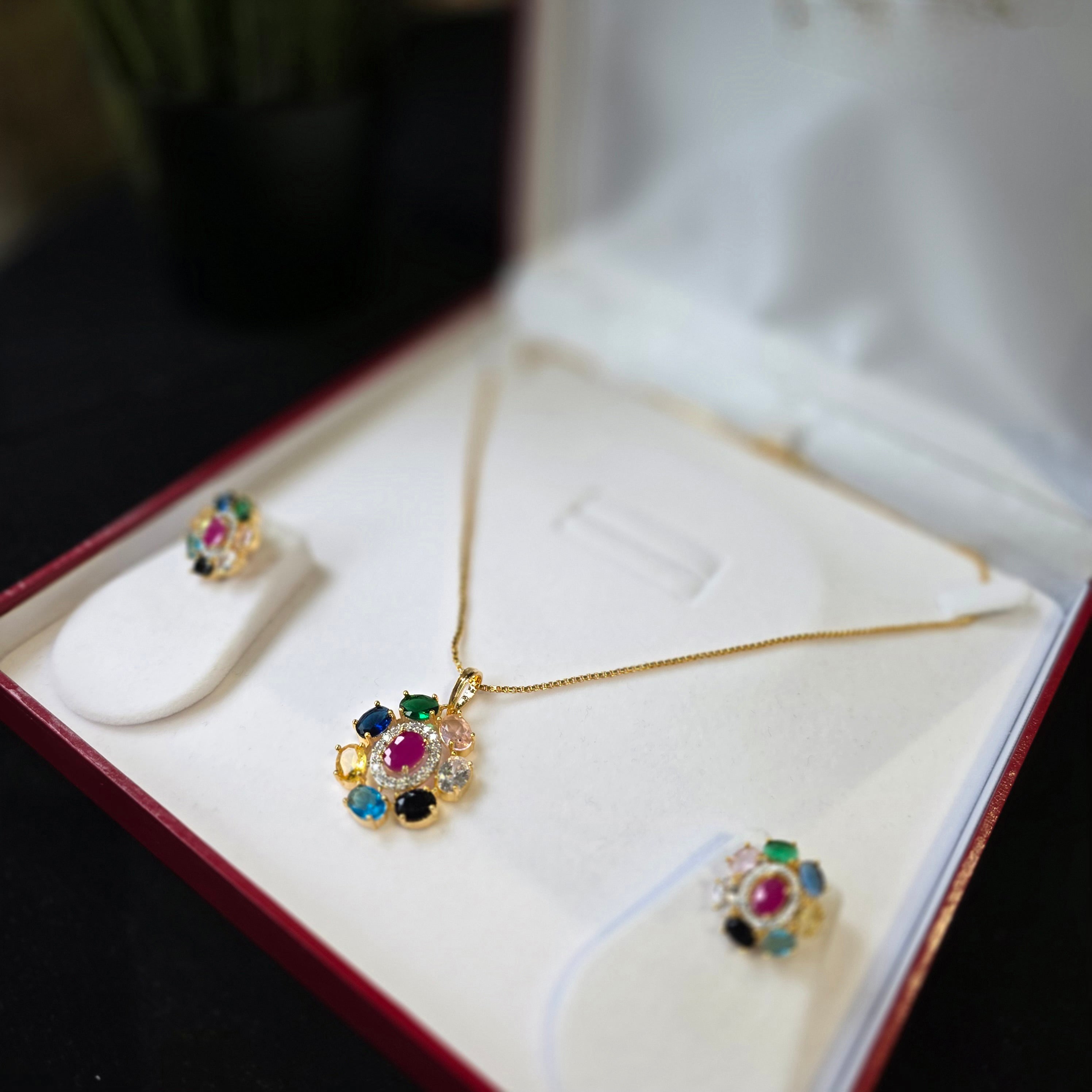 The Stunning piece featuring Multi Gemstones (lab-made) and Cubic Zirconia studded Pendant paired with matching Earrings.