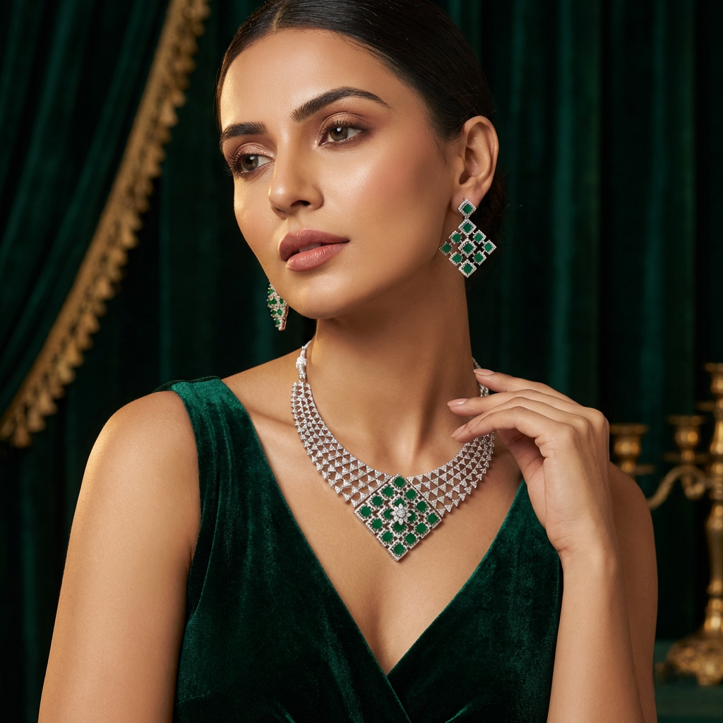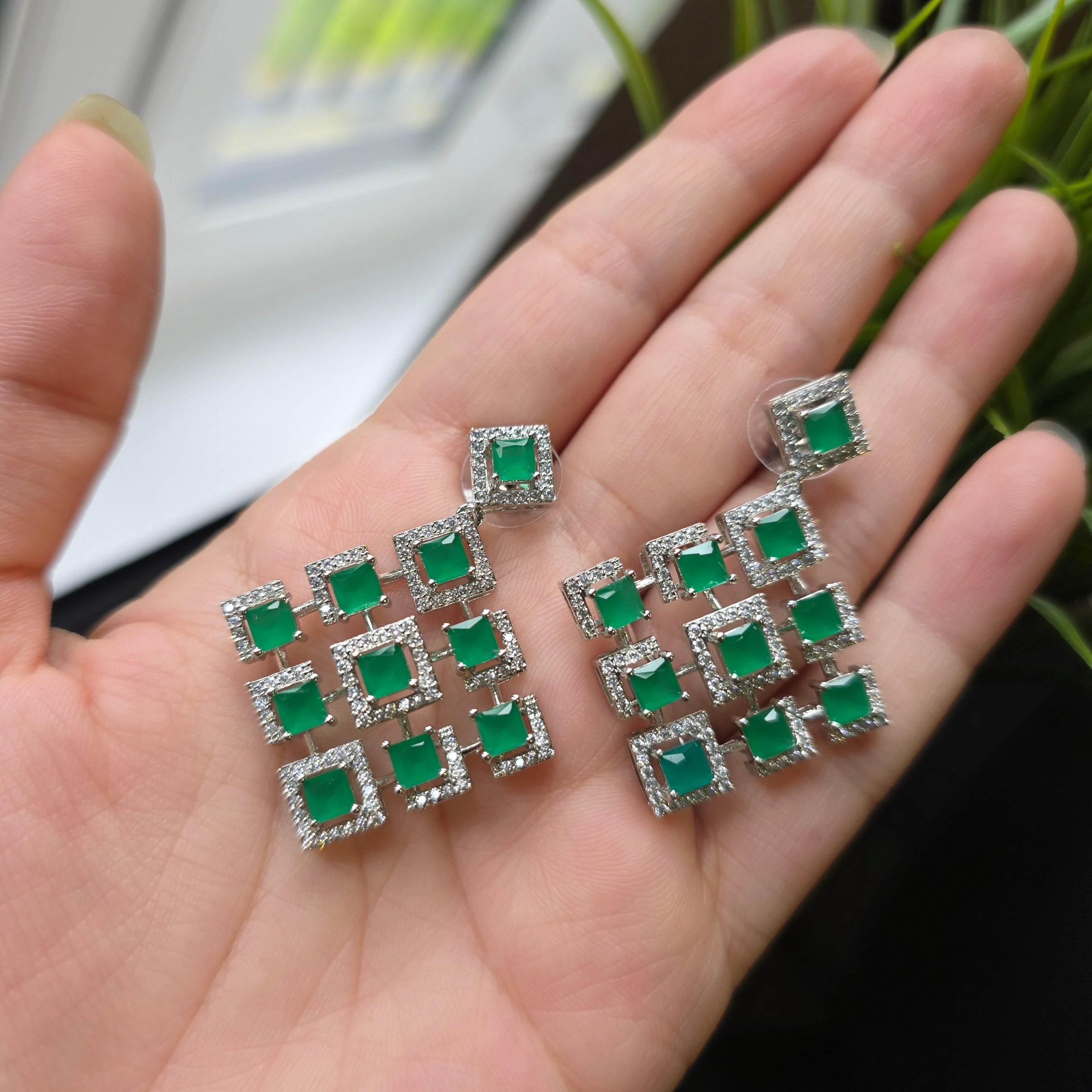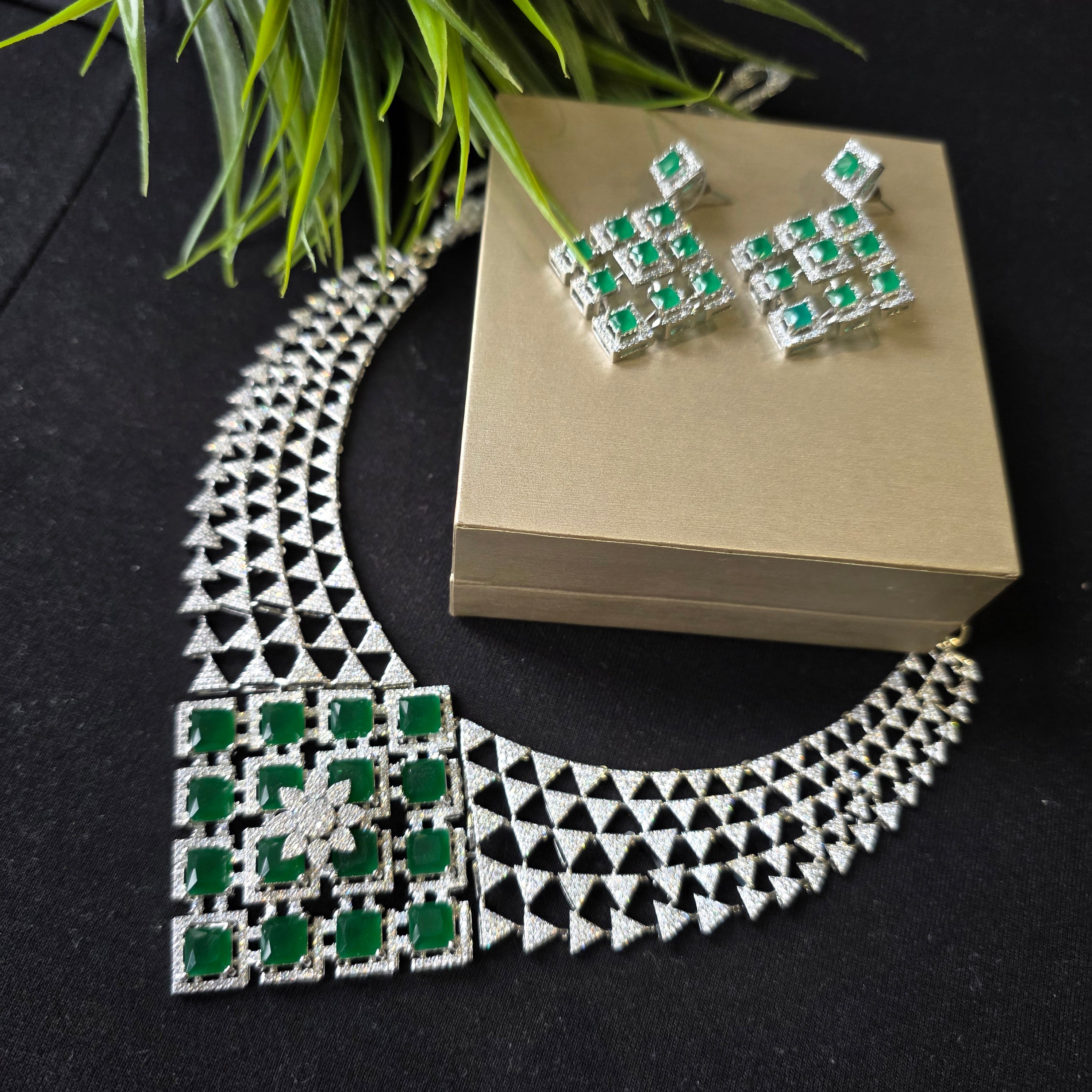 Introducing this exquisite piece that boasts stunning Green Emeralds (lab-made) and Cubic Zirconia complemented by matching Earrings. Add a touch of elegance and sparkle to your look, perfect accessory to elevate any outfit!