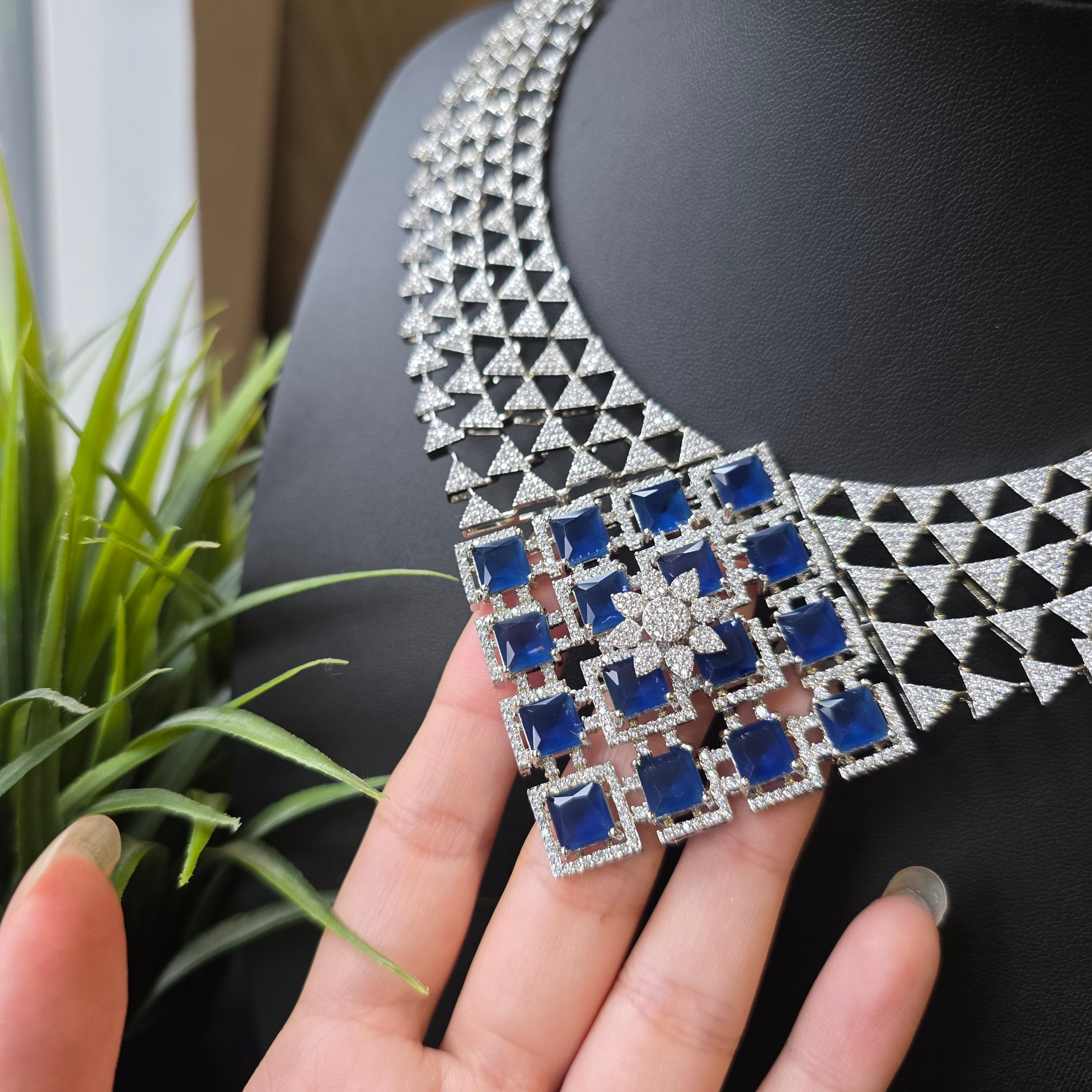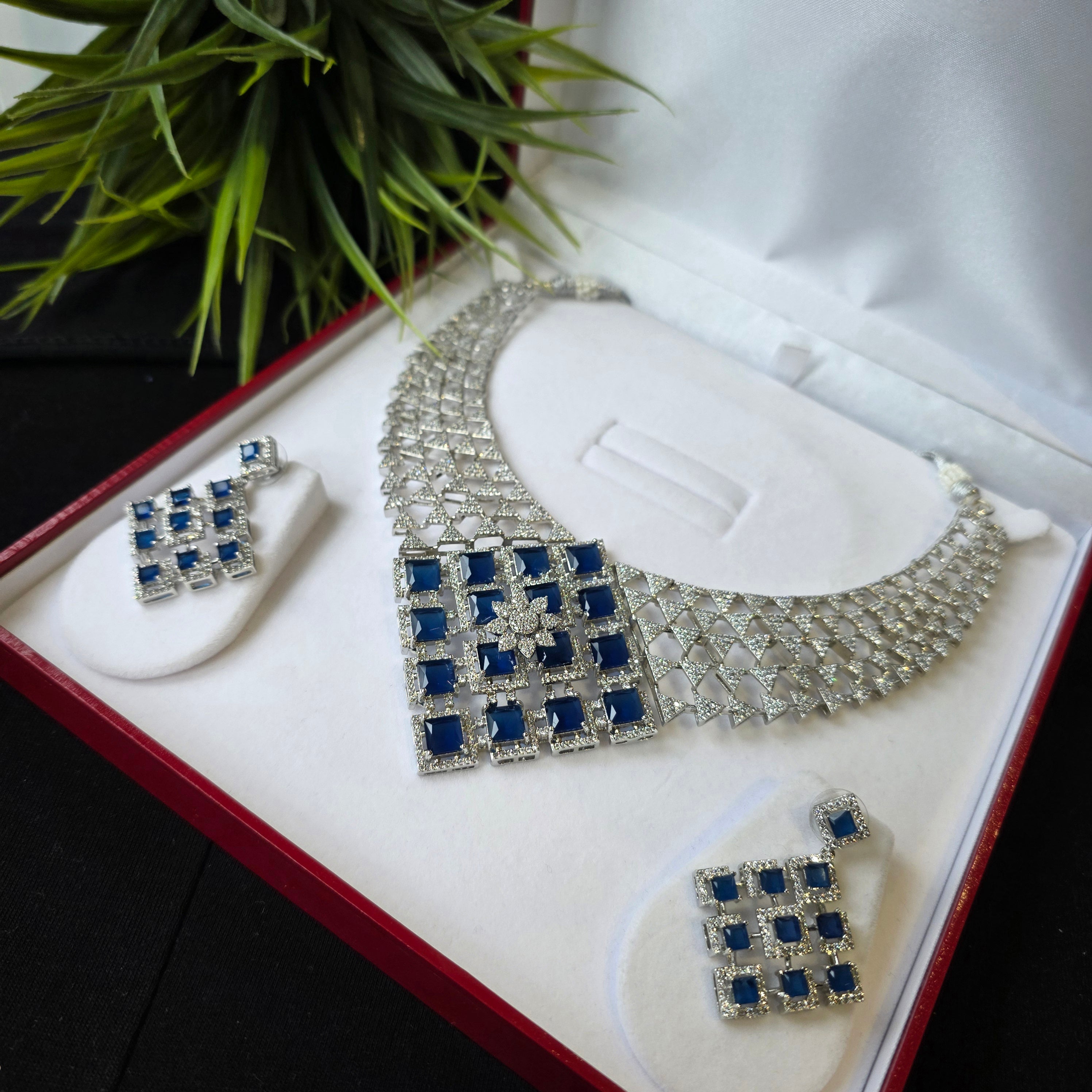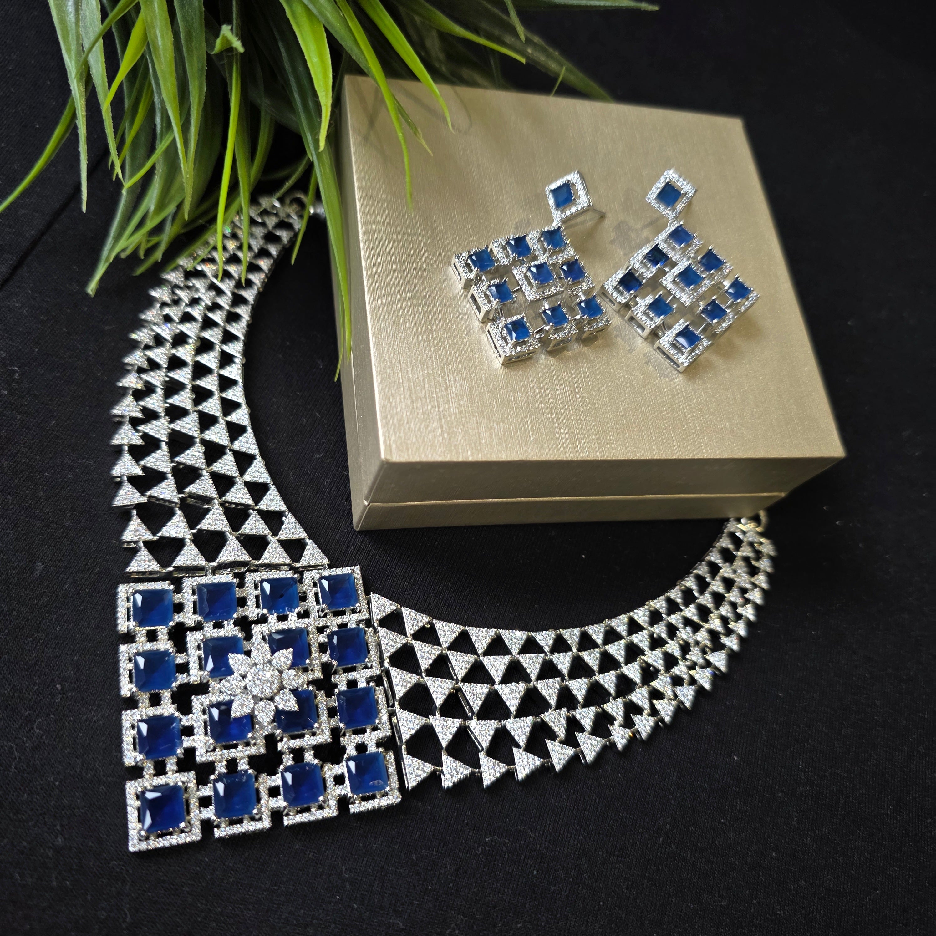 Introducing this exquisite piece that boasts stunning Blue Sapphires (lab-made) and Cubic Zirconia complemented by matching Earrings. Add a touch of elegance and sparkle to your look, perfect accessory to elevate any outfit!