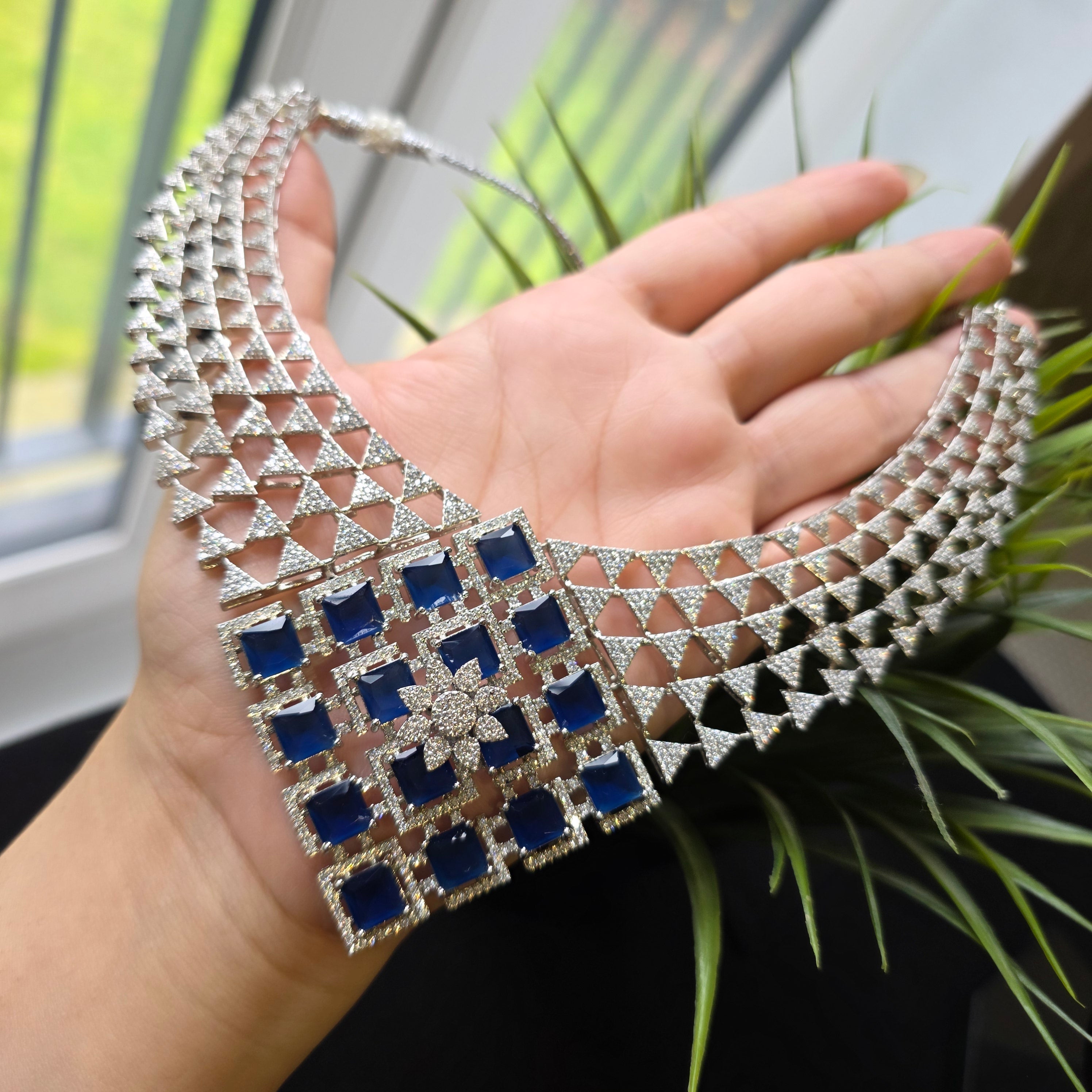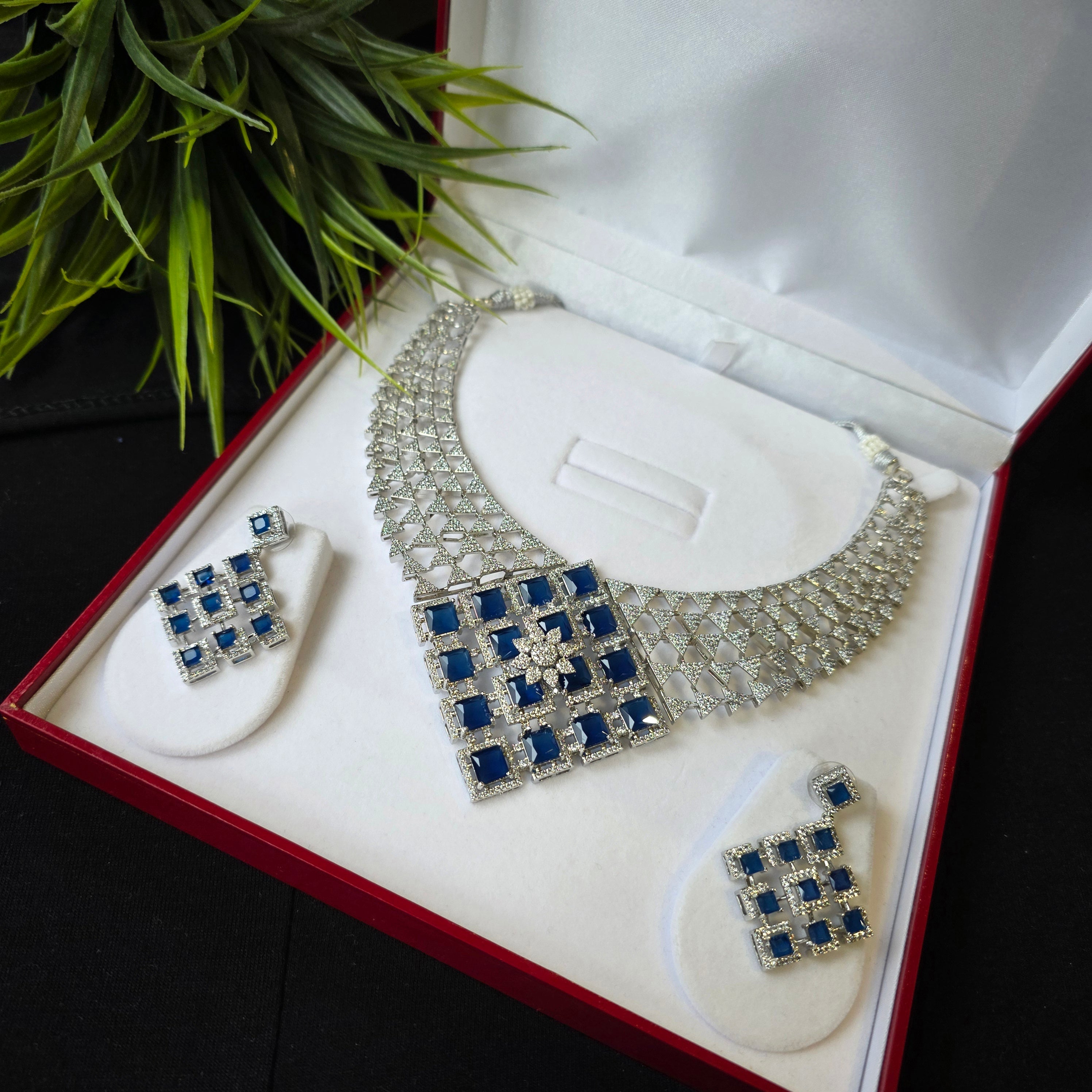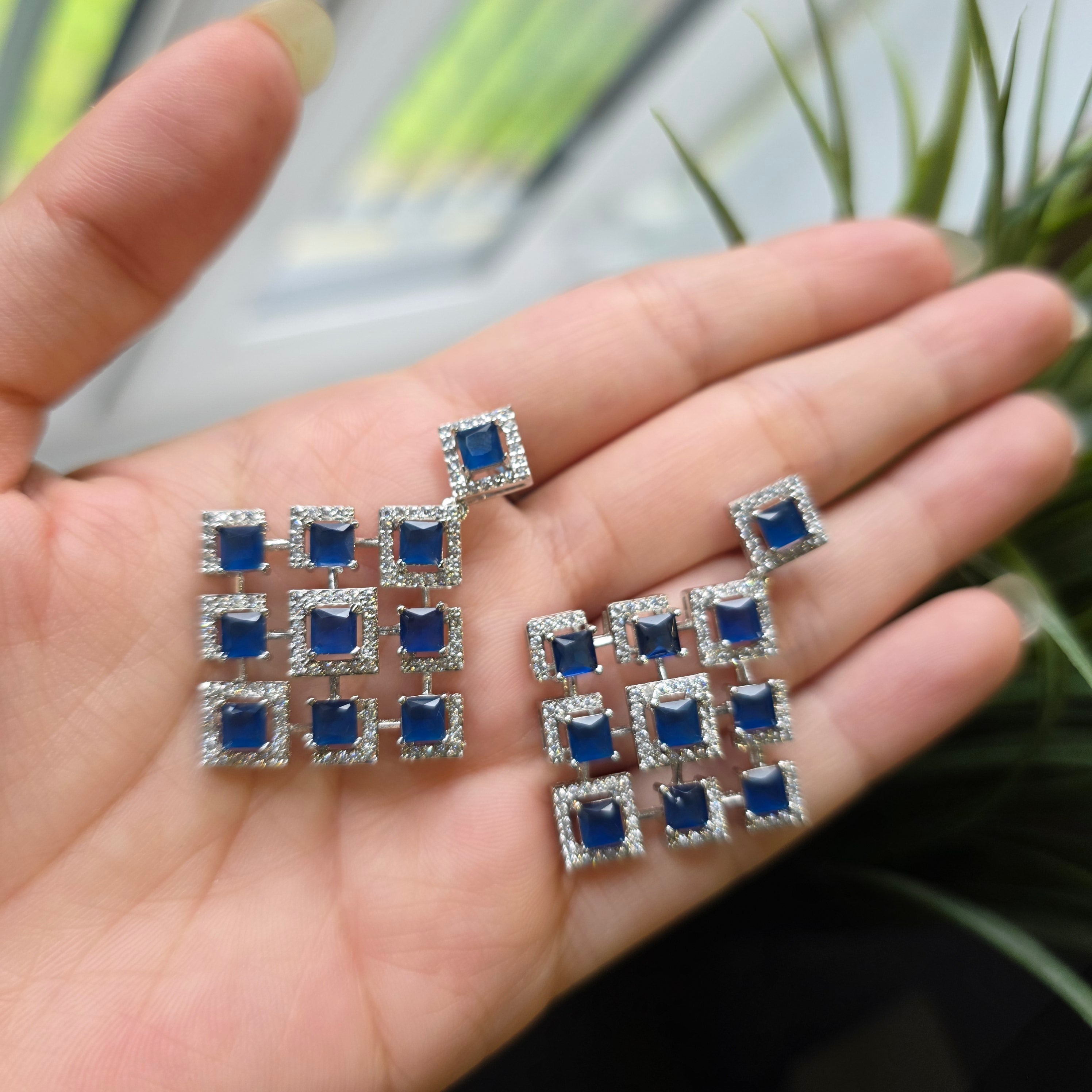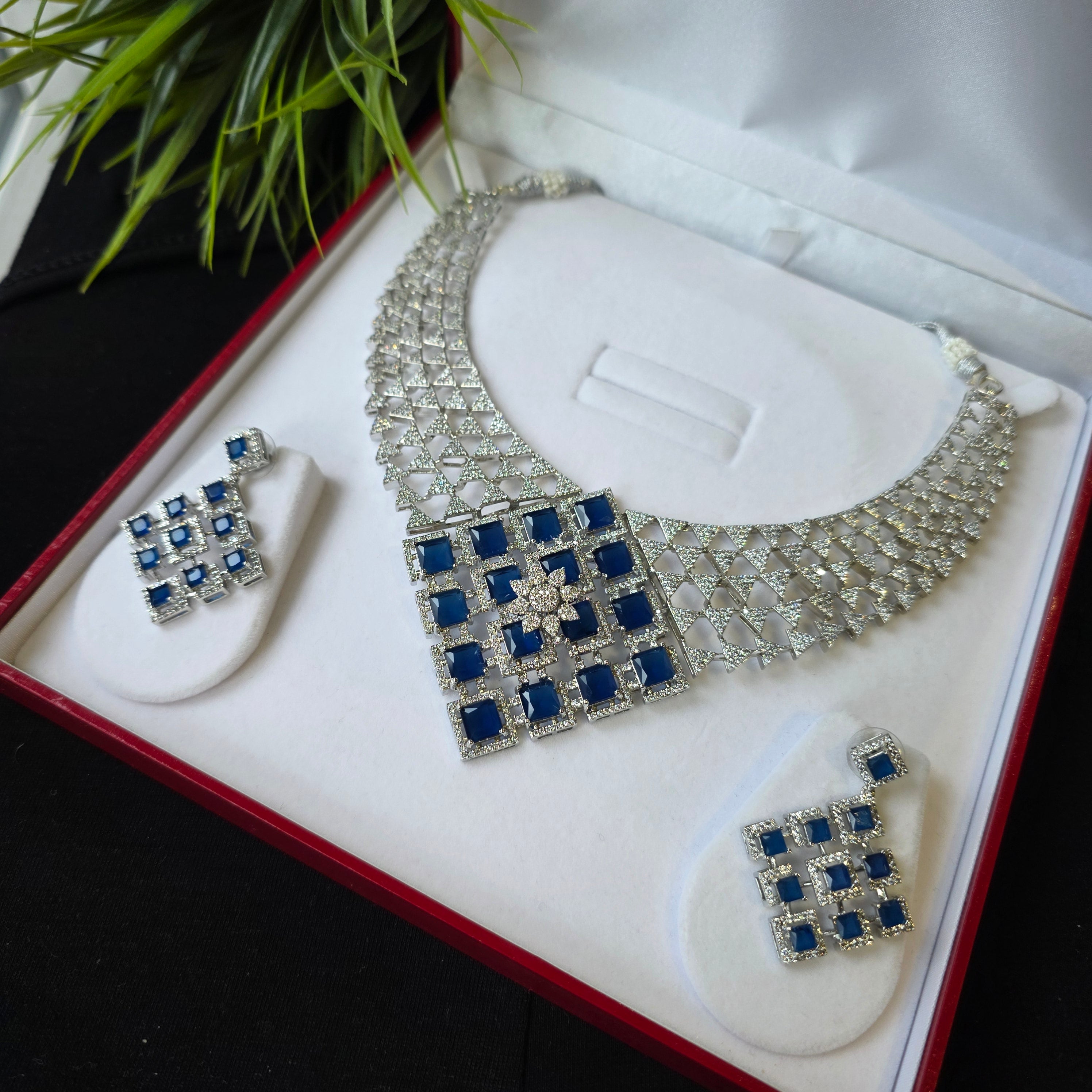 Introducing this exquisite piece that boasts stunning Blue Sapphires (lab-made) and Cubic Zirconia complemented by matching Earrings. Add a touch of elegance and sparkle to your look, perfect accessory to elevate any outfit!