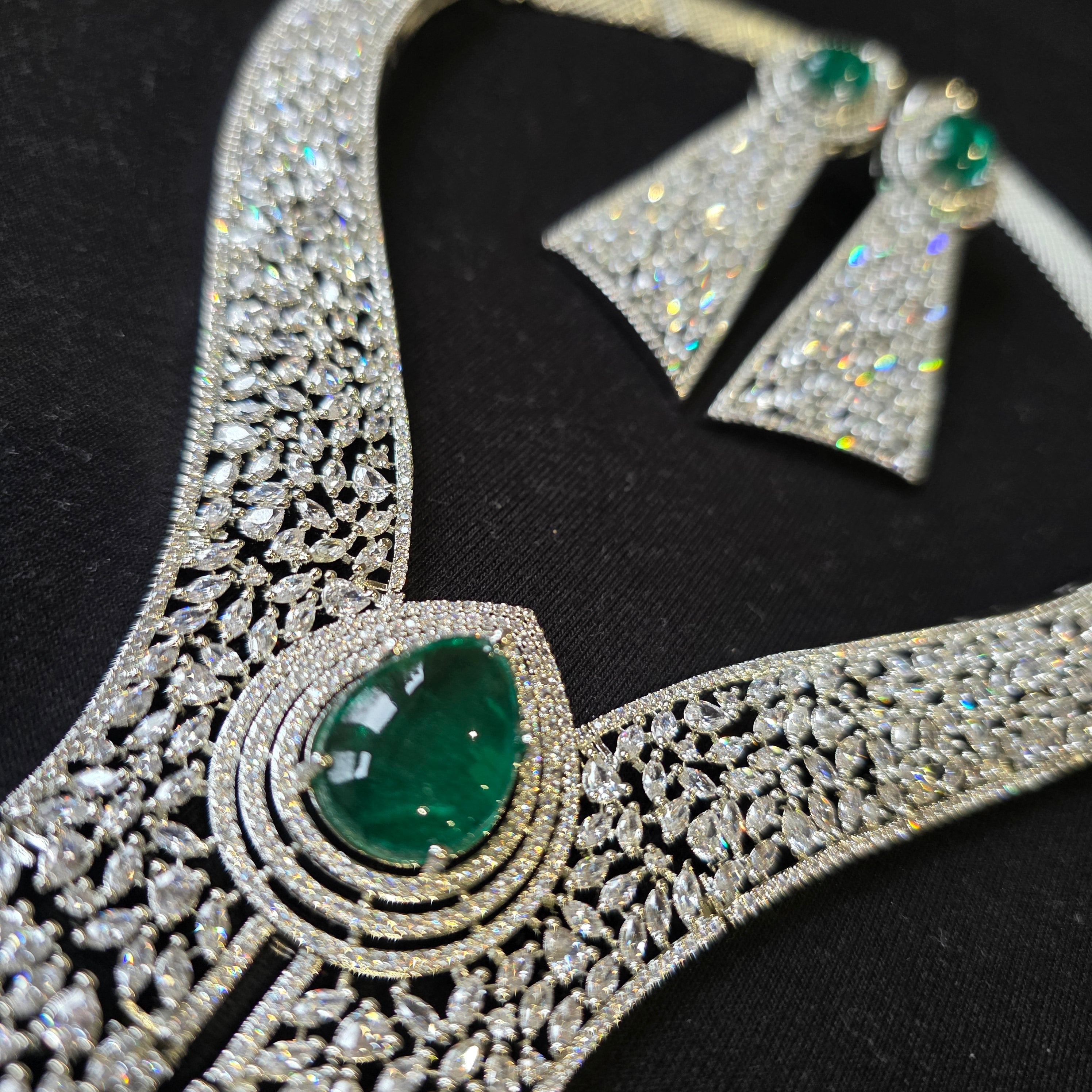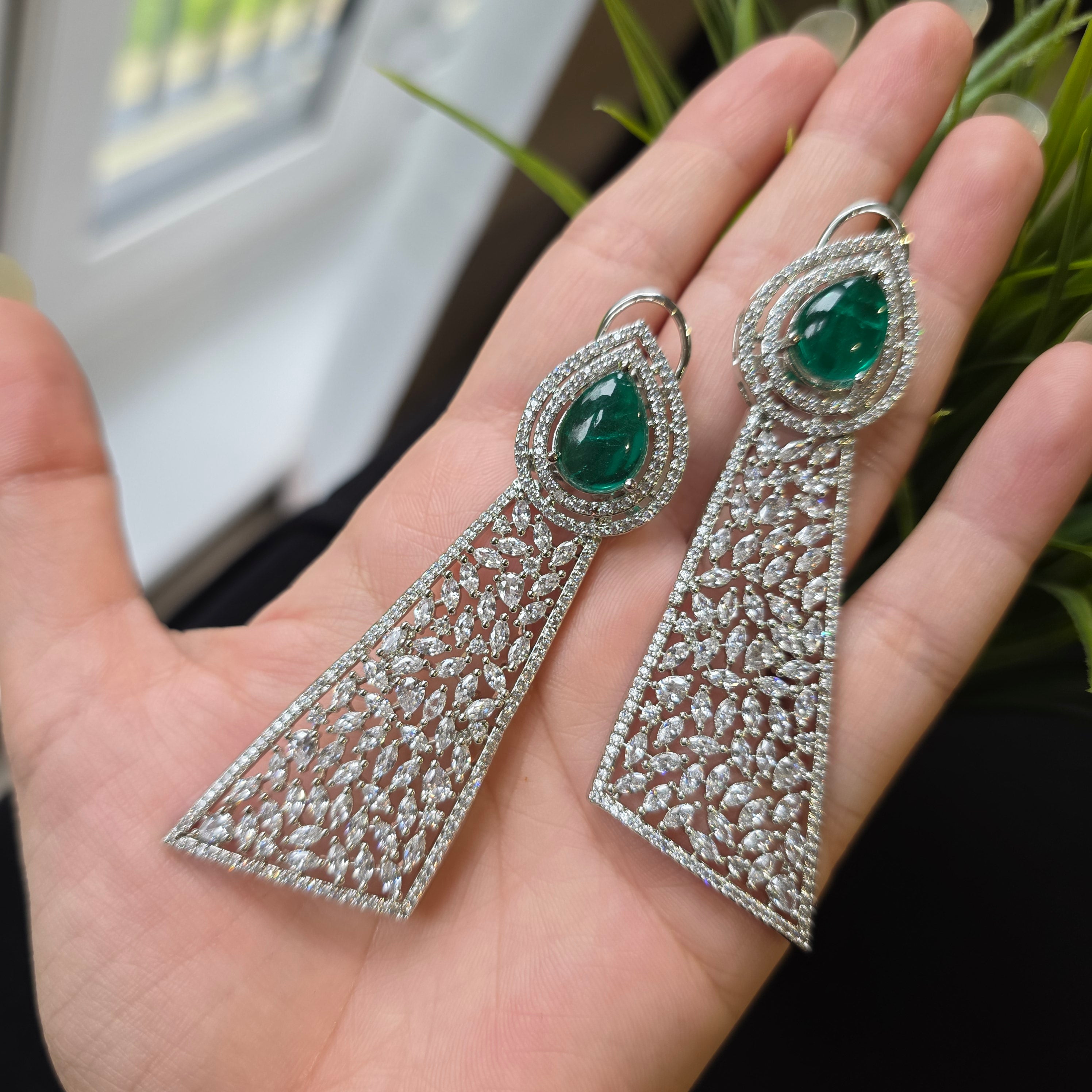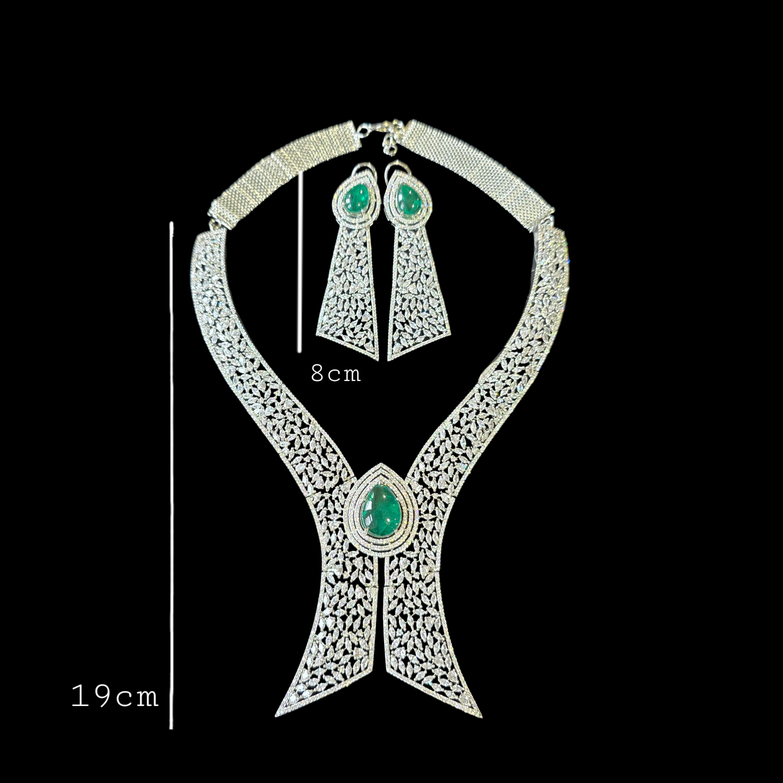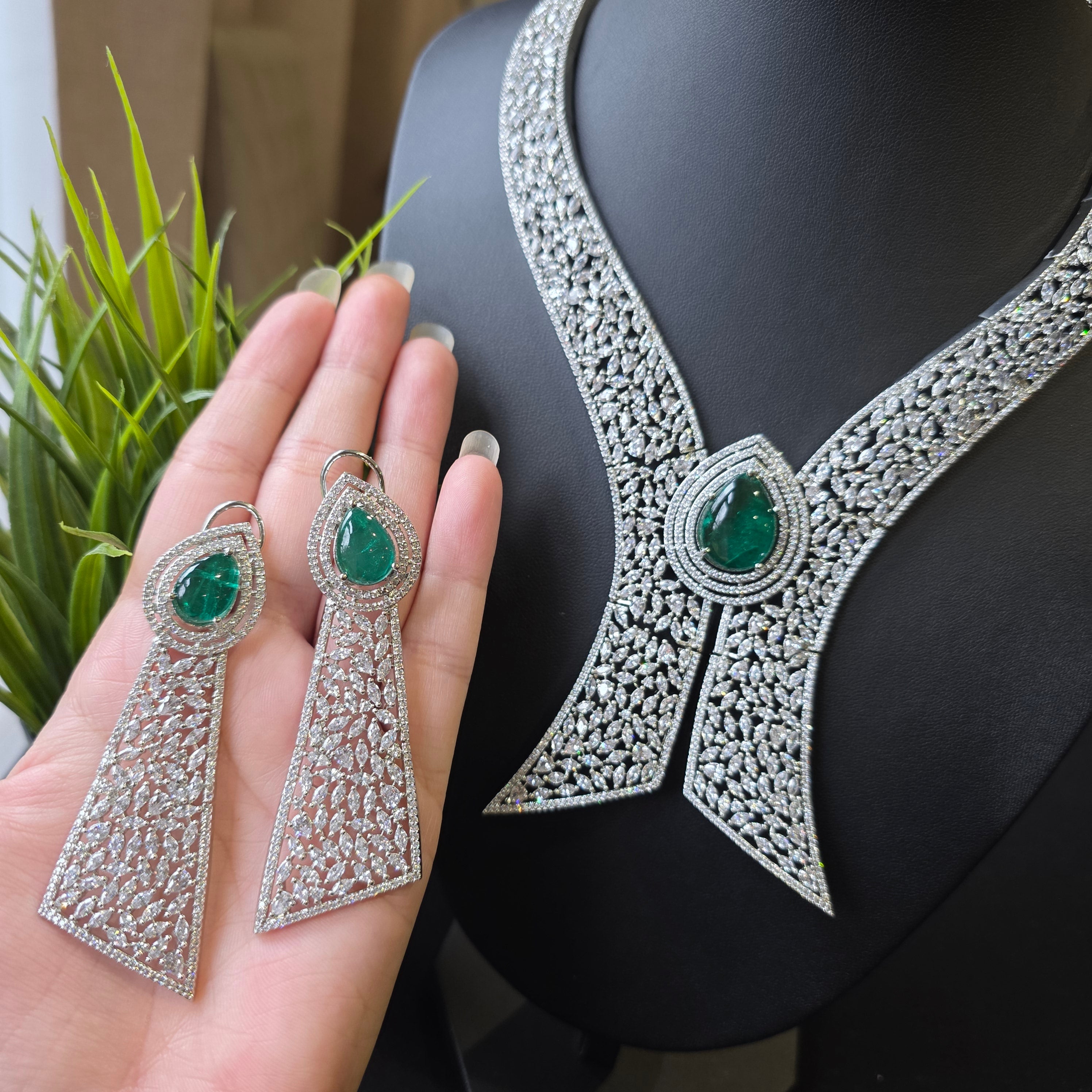 Introducing this Statement piece that boasts Green Emerald (lab made) & AAAA CZ complemented by matching Earrings. Add a touch of elegance and sparkle to your look, perfect accessory to elevate any outfit!